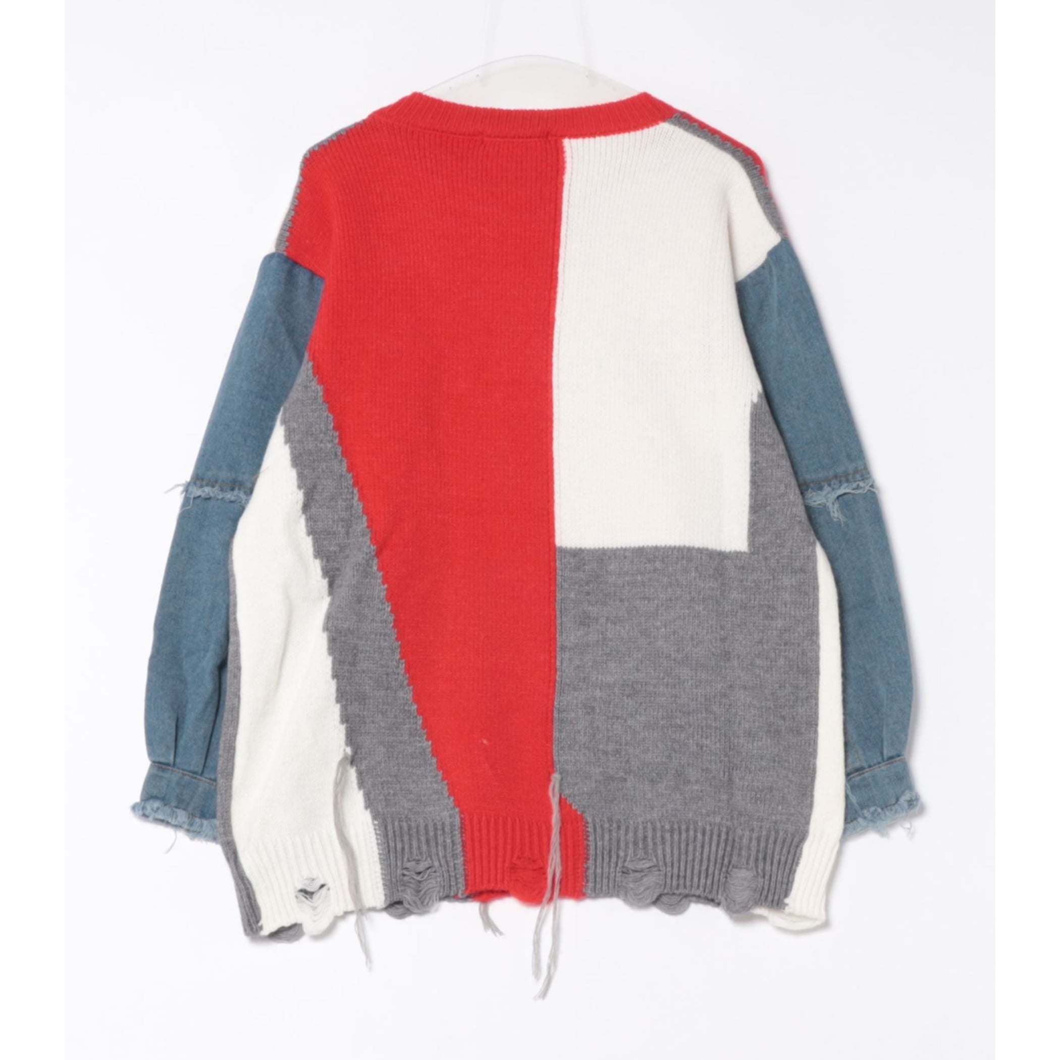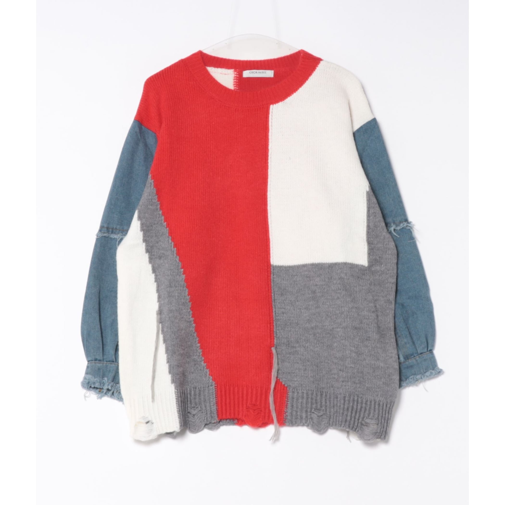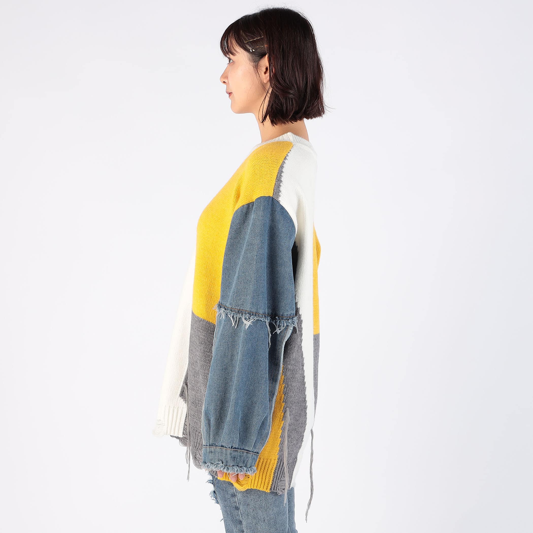 ニットとデニム素材の切替が特徴的なプルオーバー。生地の配色でパッチワークのようなデザインに。デニム袖の生地が切りっぱなしもポイント。個性的なデザインは人と被らず、印象に残る1枚です◎程よくゆとりのあるサイズ感で、パンツはもちろんスカート合わせでもバランスよく着こなせます!