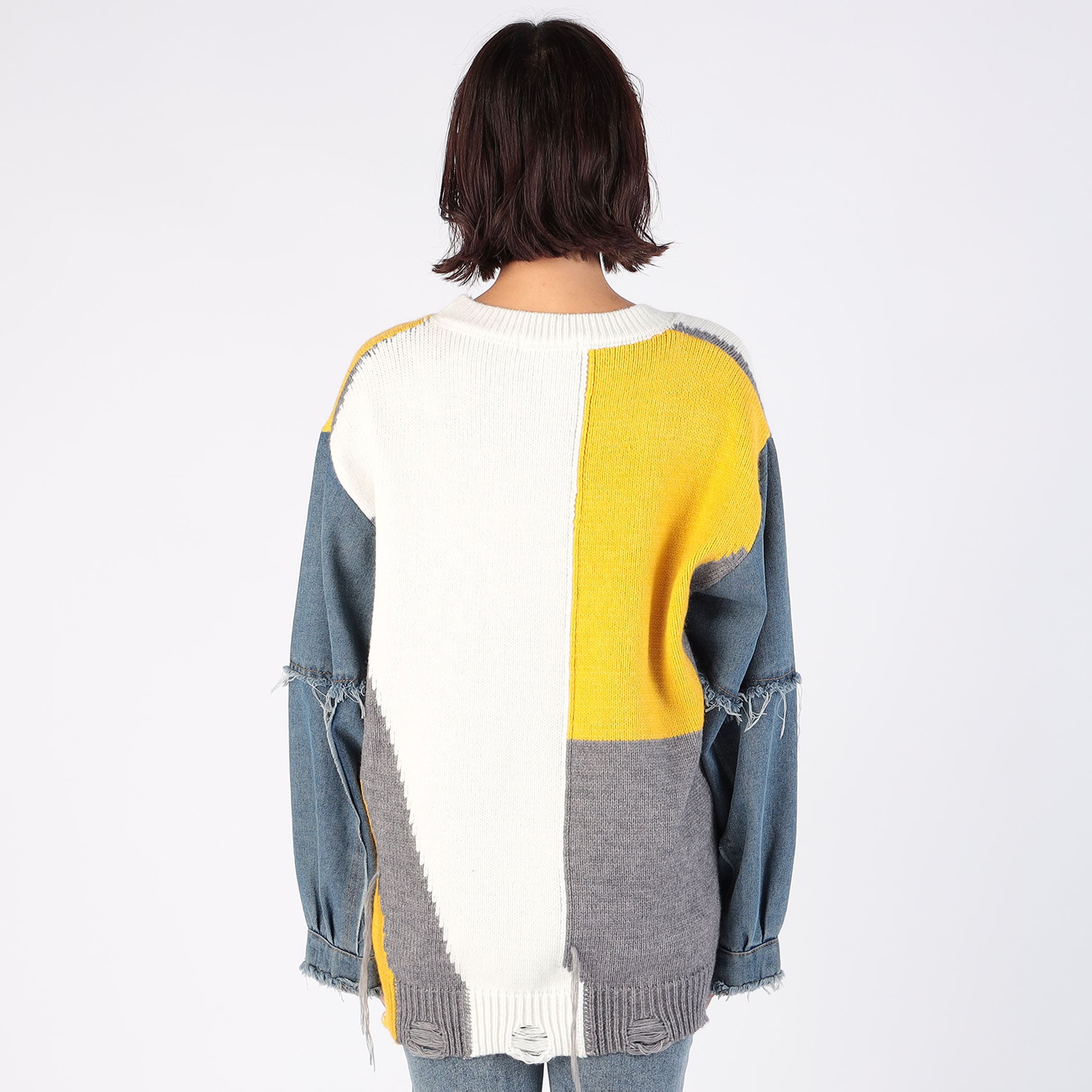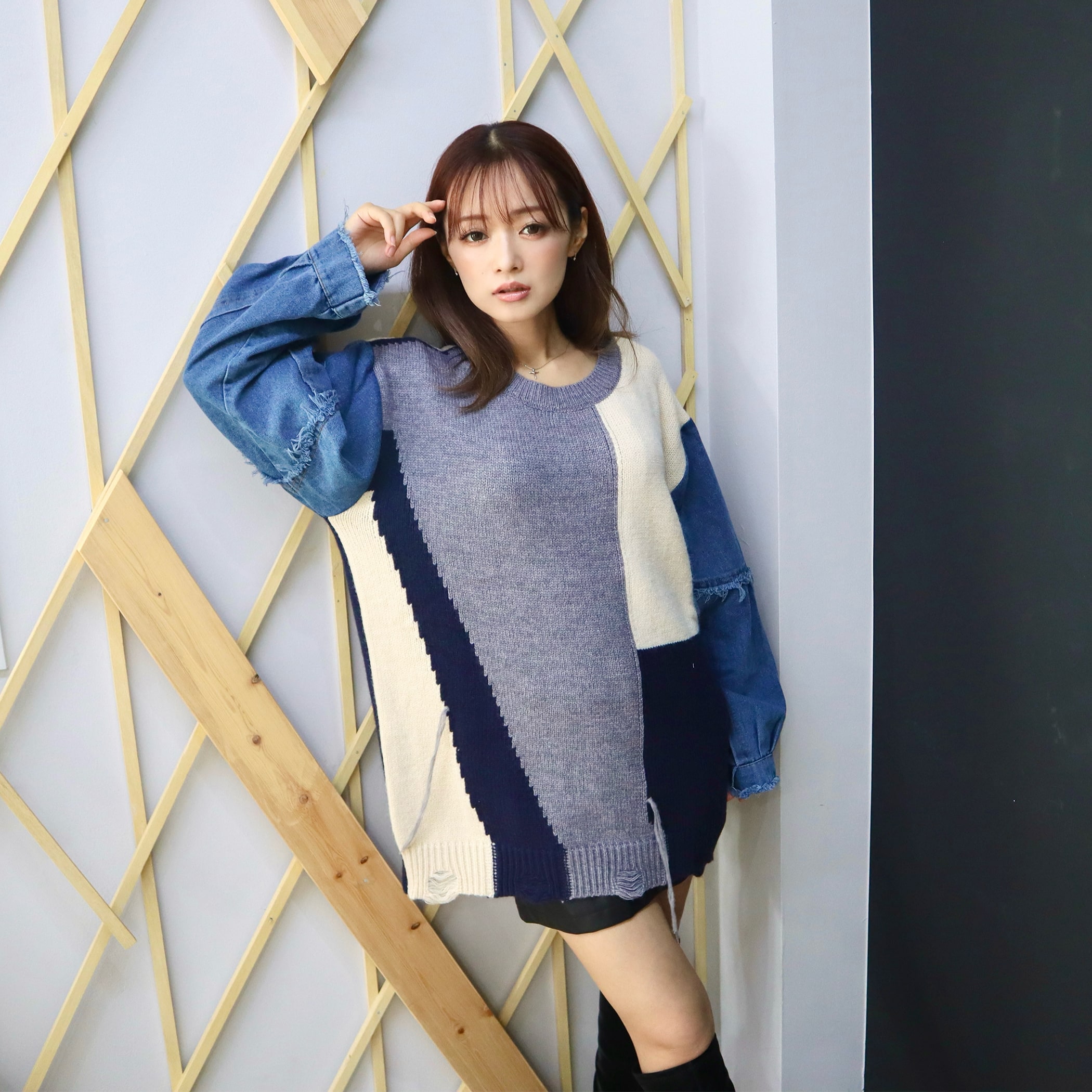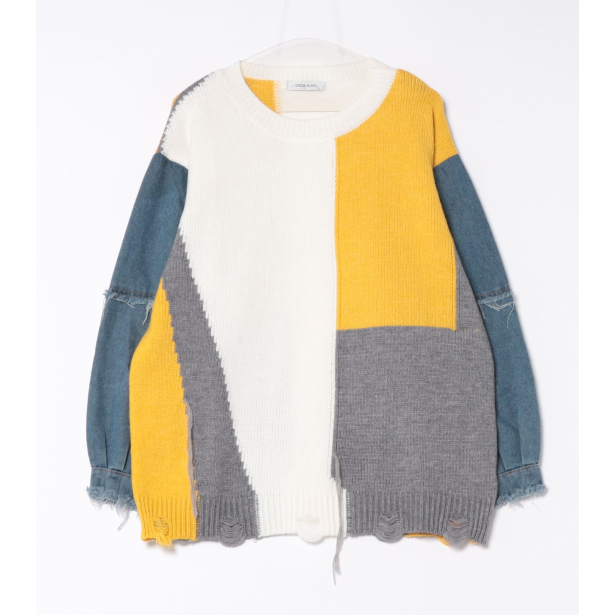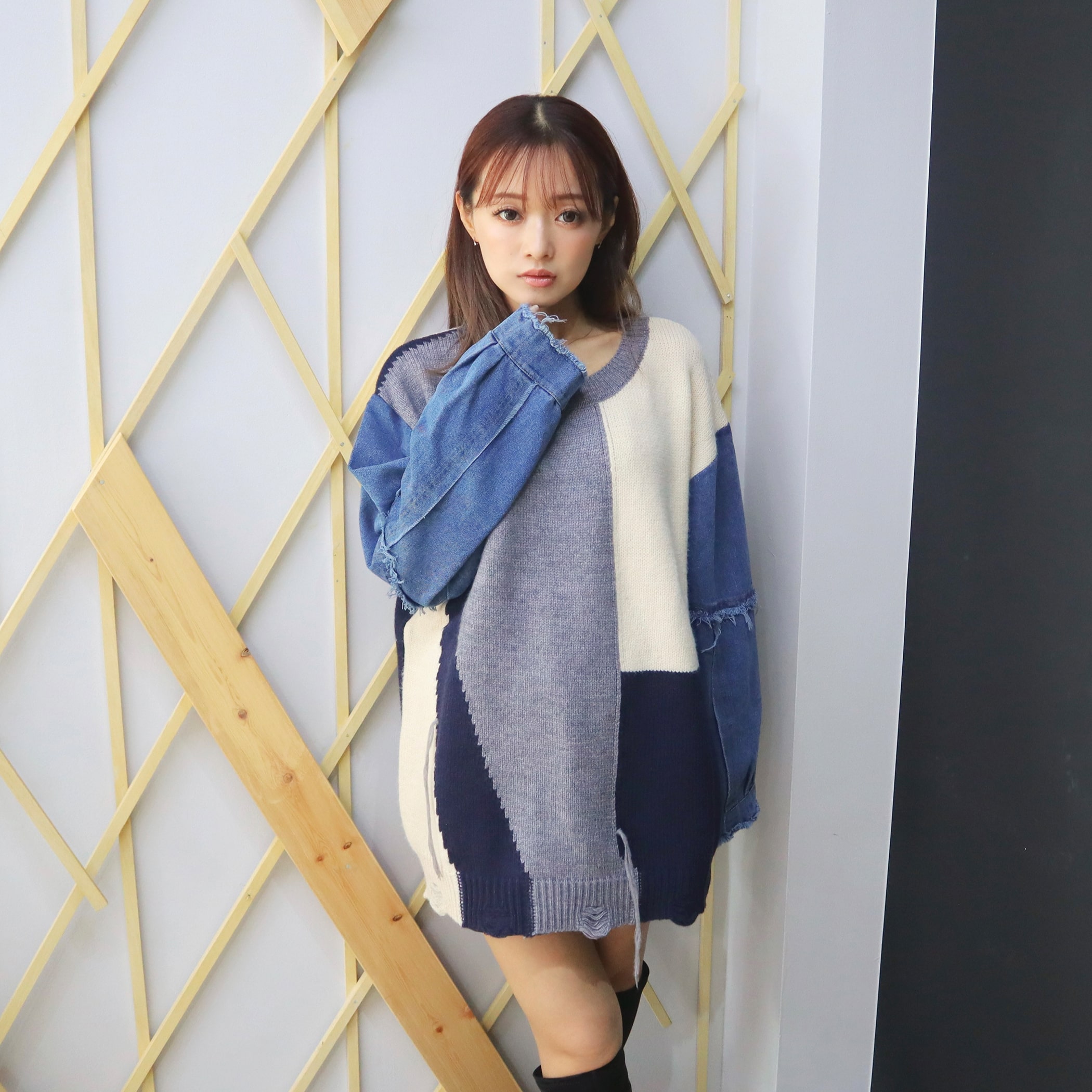ニットとデニム素材の切替が特徴的なプルオーバー。生地の配色でパッチワークのようなデザインに。デニム袖の生地が切りっぱなしもポイント。個性的なデザインは人と被らず、印象に残る1枚です◎程よくゆとりのあるサイズ感で、パンツはもちろんスカート合わせでもバランスよく着こなせます!