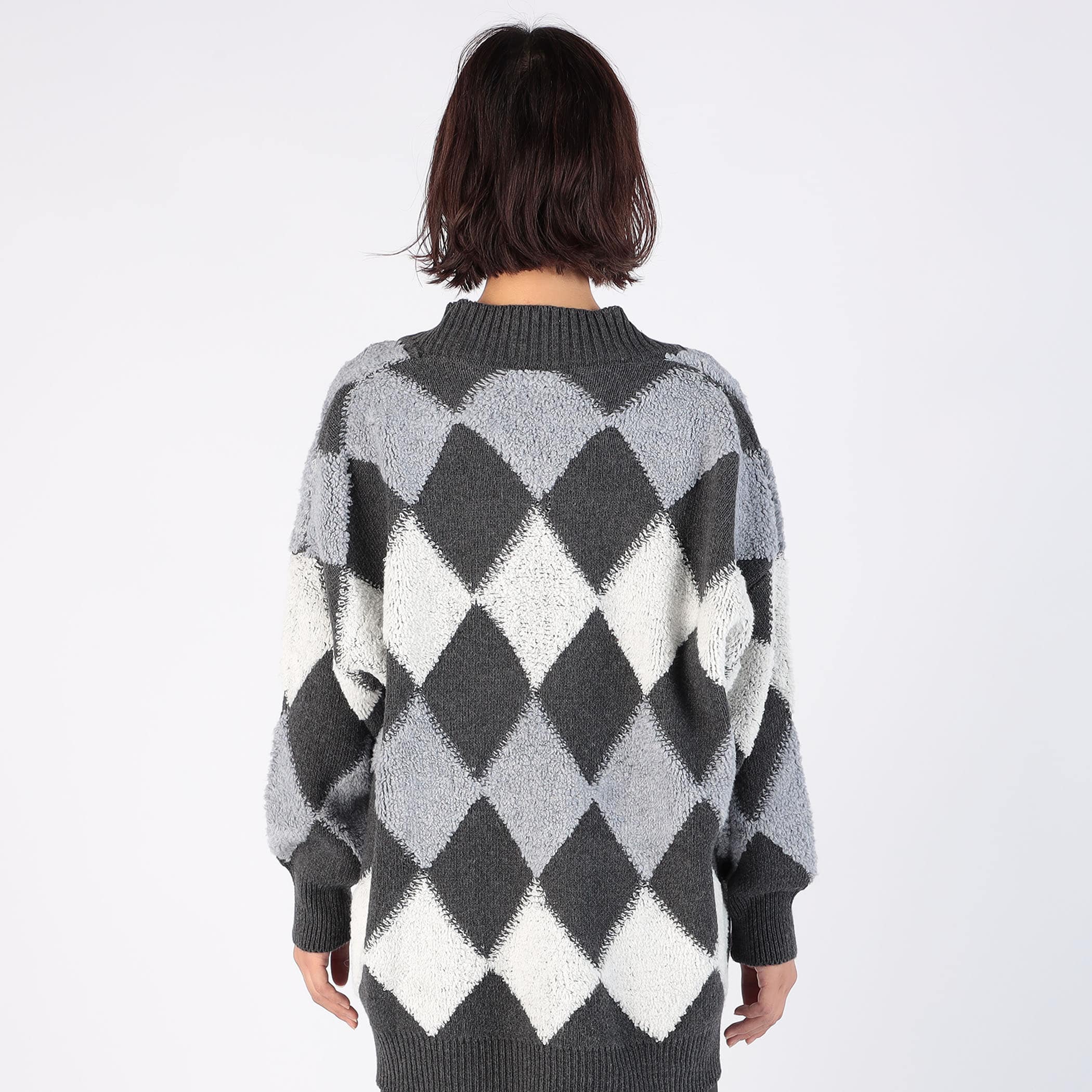 これからのシーズンにぴったりなアーガイル柄のニットカーデの登場!編み方を変えたニットのコンビネーションがコーデに立体感を持たせてくれます。ざっくりとした丸みのあるシルエットでこなれ感を演出できる1枚。ボトムはあえてシンプルにしてカーデを主役にするコーデがおすすめです。