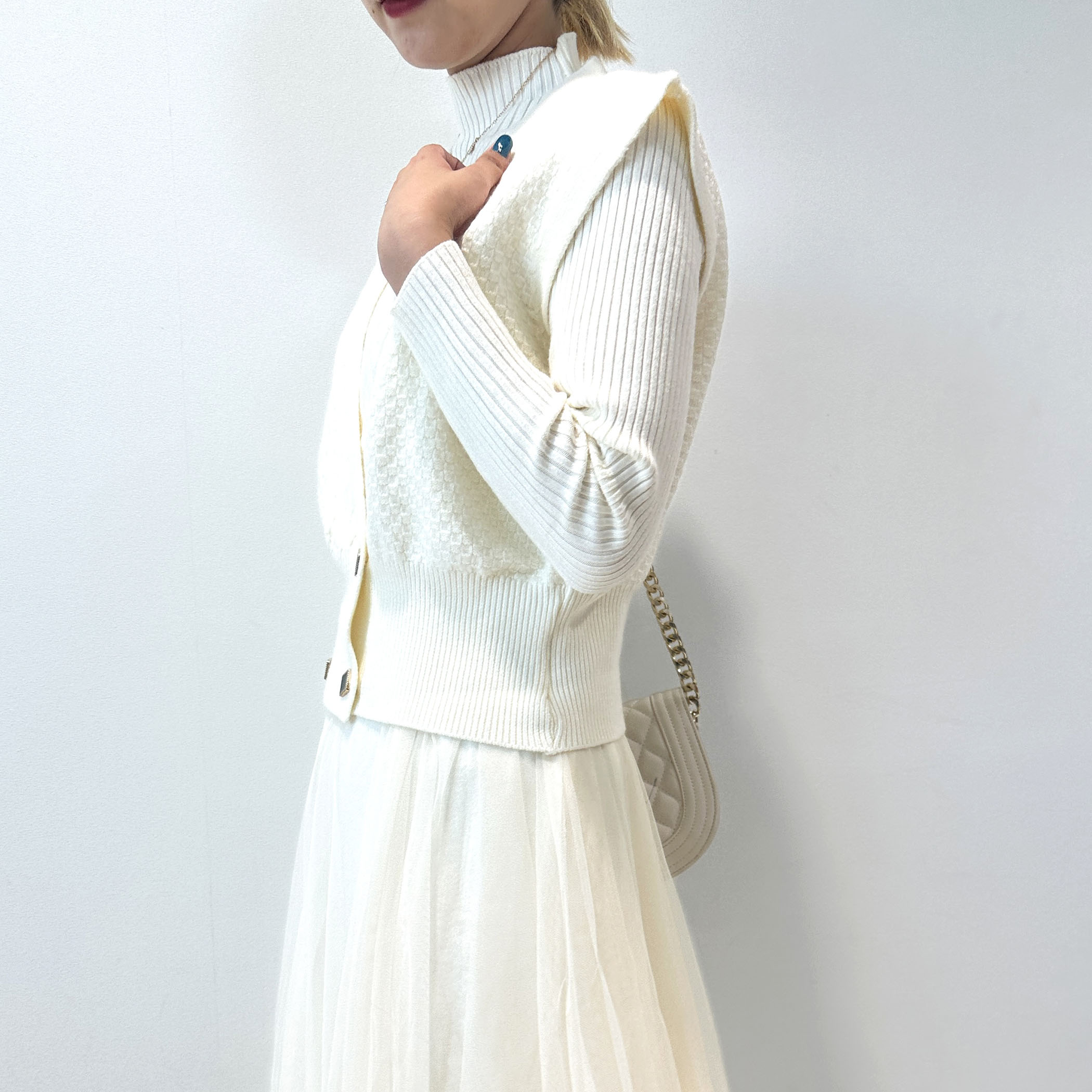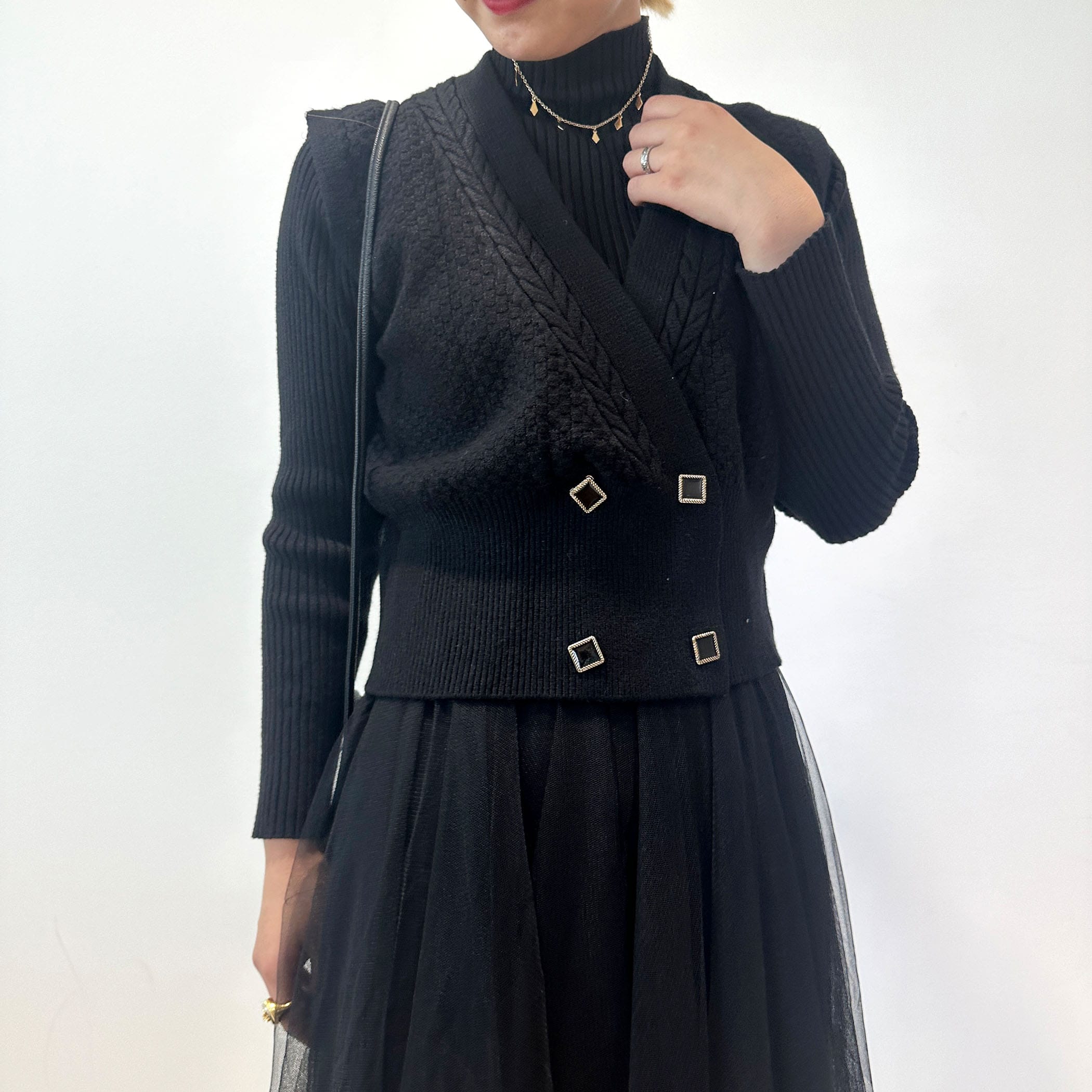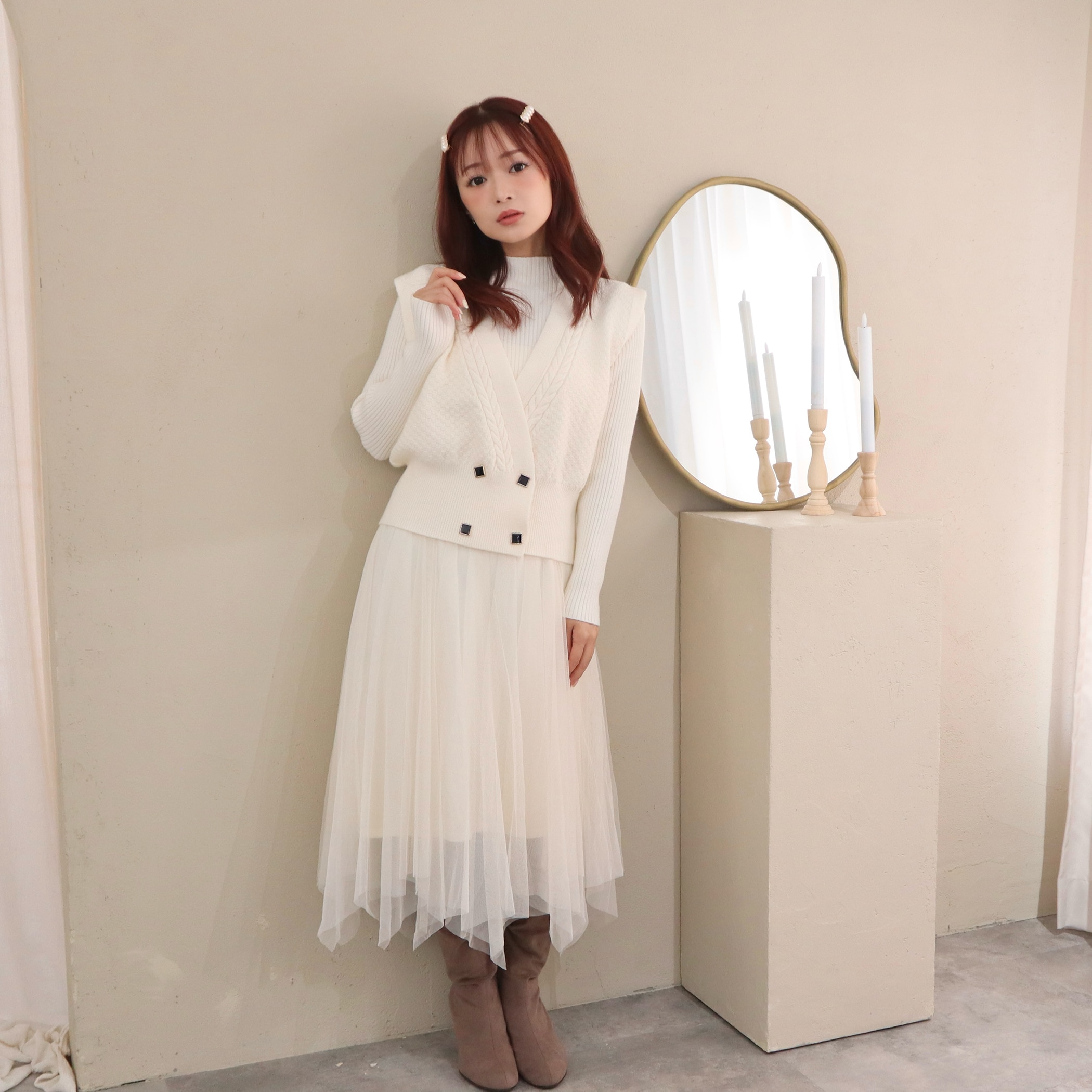 ふんわりチュールスカートが可愛いニットワンピース。歩く度にふんわりと揺れるチュールスカートはロマンティックムードを演出してくれます。ベストはセパレート出来るので、コーデの幅が広がる1着です。ベストのボタン飾りも上品なアクセントをプラス。深めのVネックもポイントです。