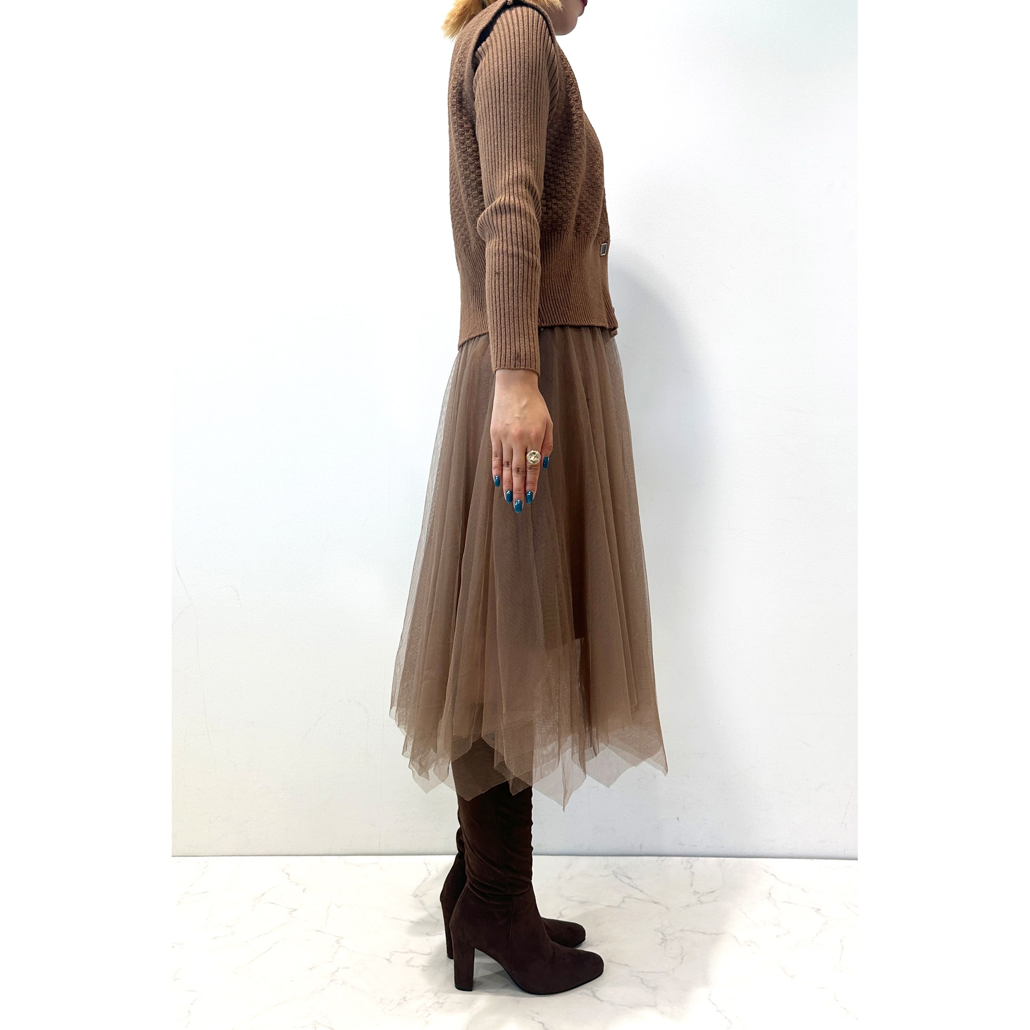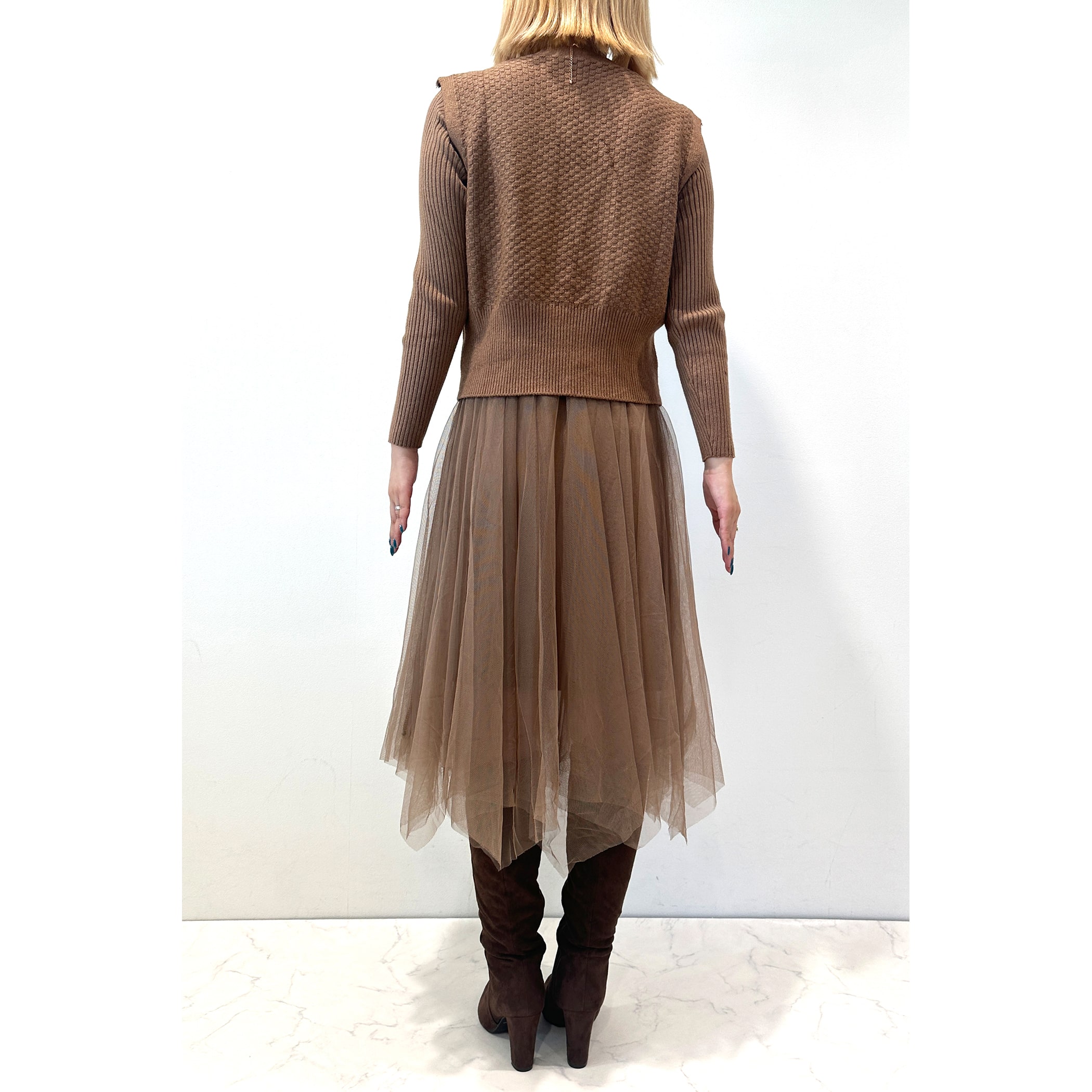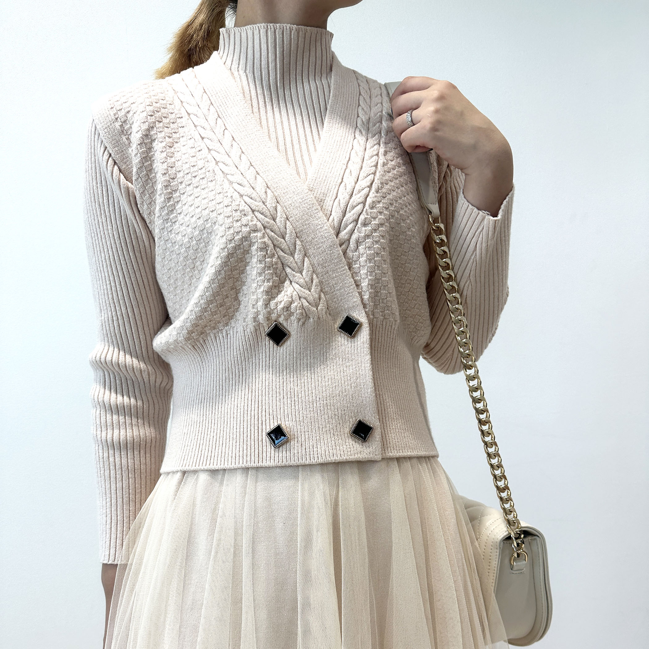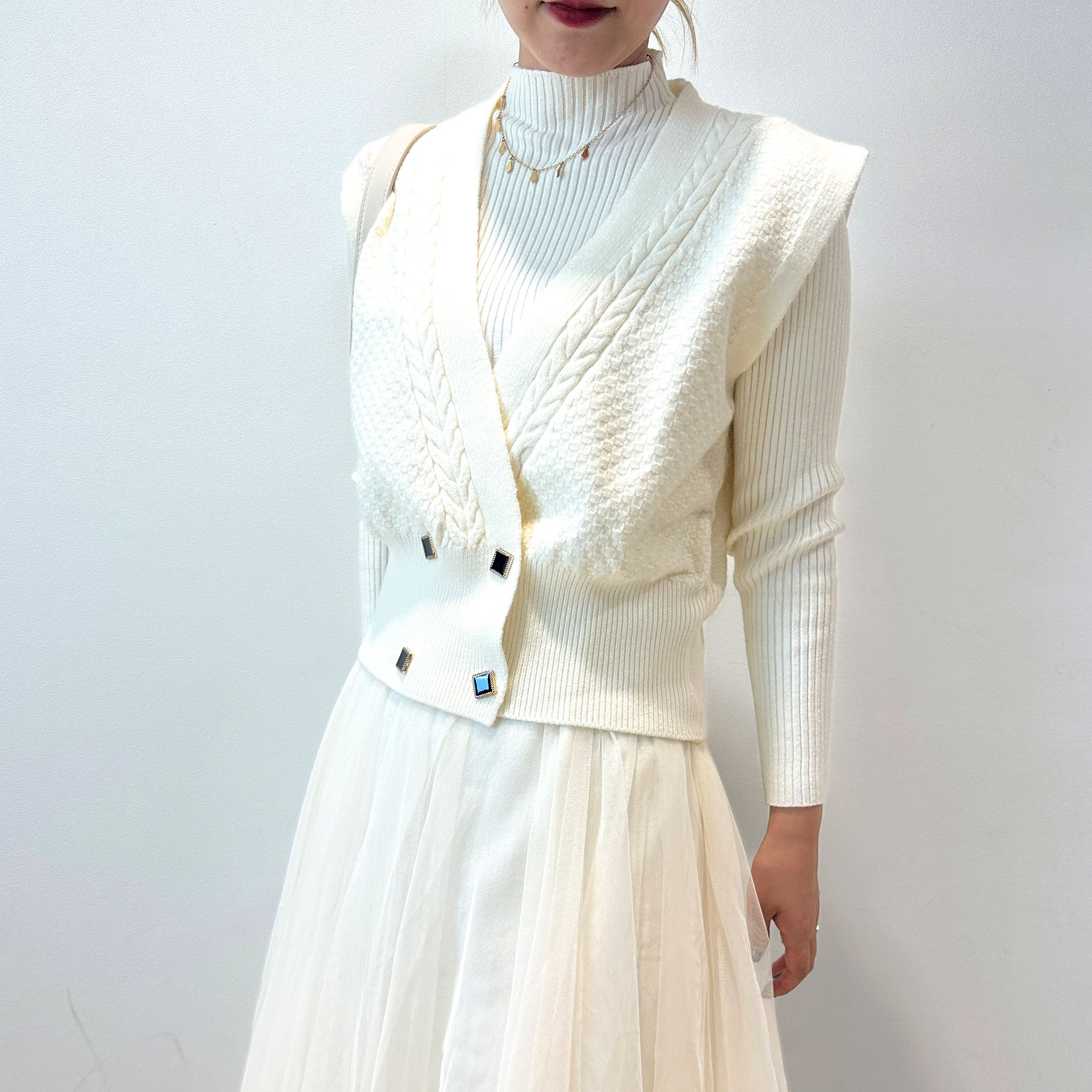 ふんわりチュールスカートが可愛いニットワンピース。歩く度にふんわりと揺れるチュールスカートはロマンティックムードを演出してくれます。ベストはセパレート出来るので、コーデの幅が広がる1着です。ベストのボタン飾りも上品なアクセントをプラス。深めのVネックもポイントです。