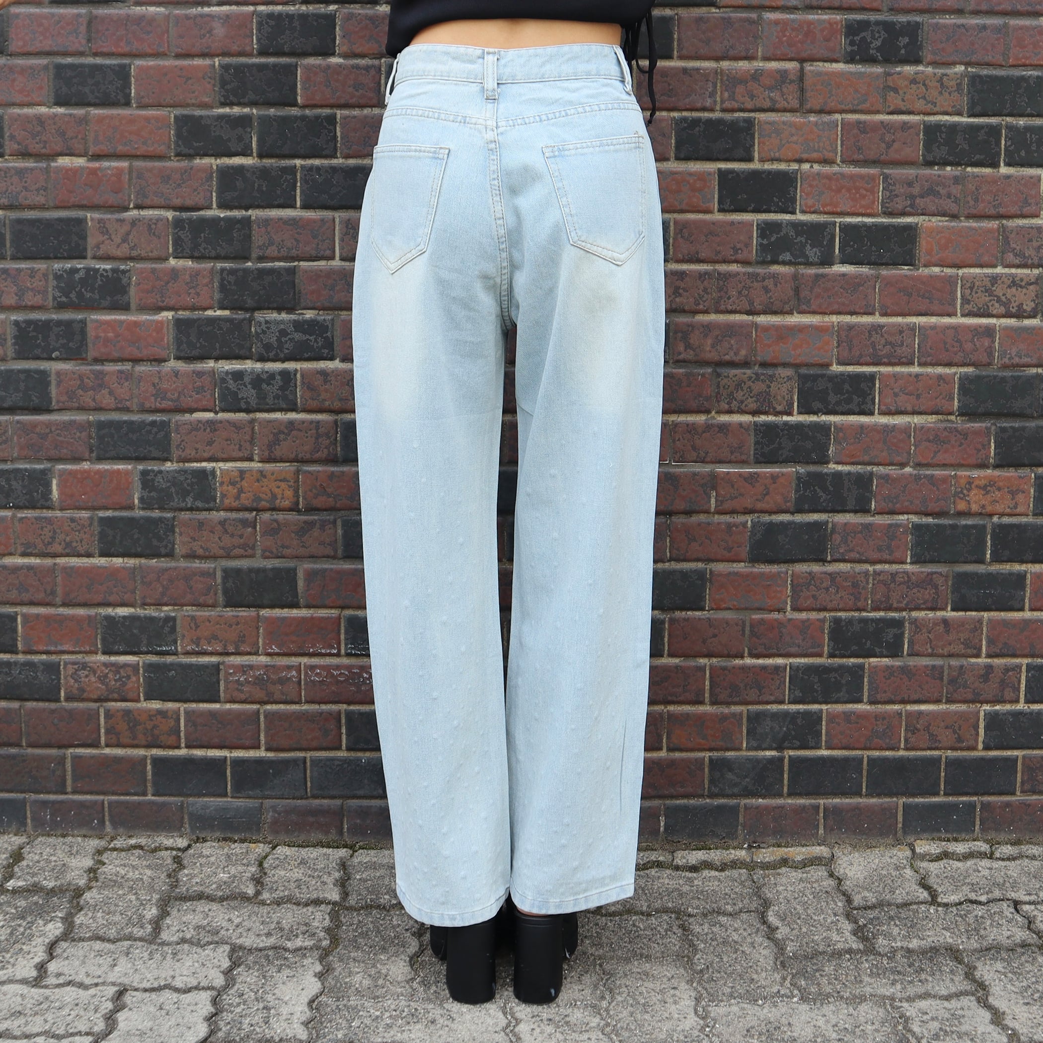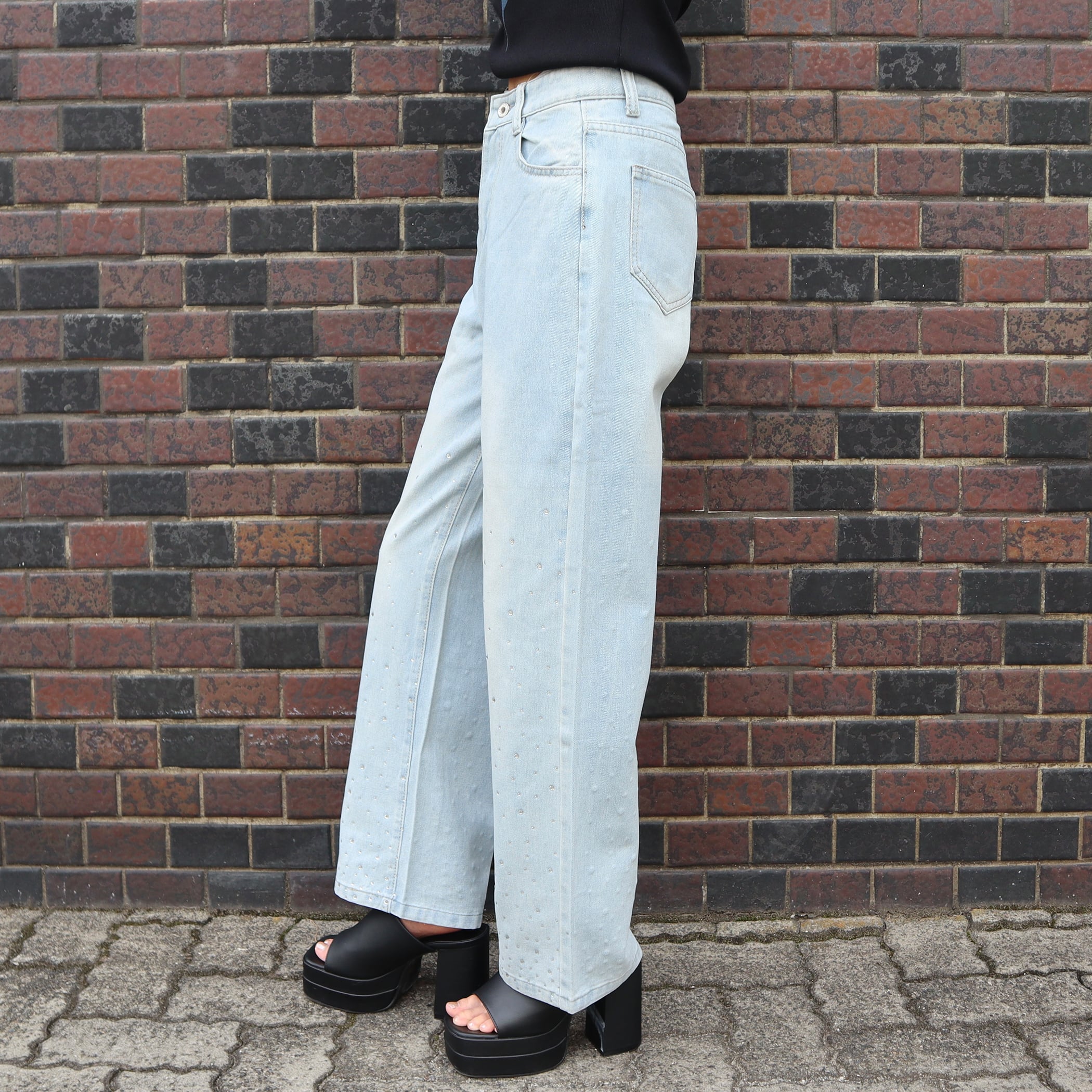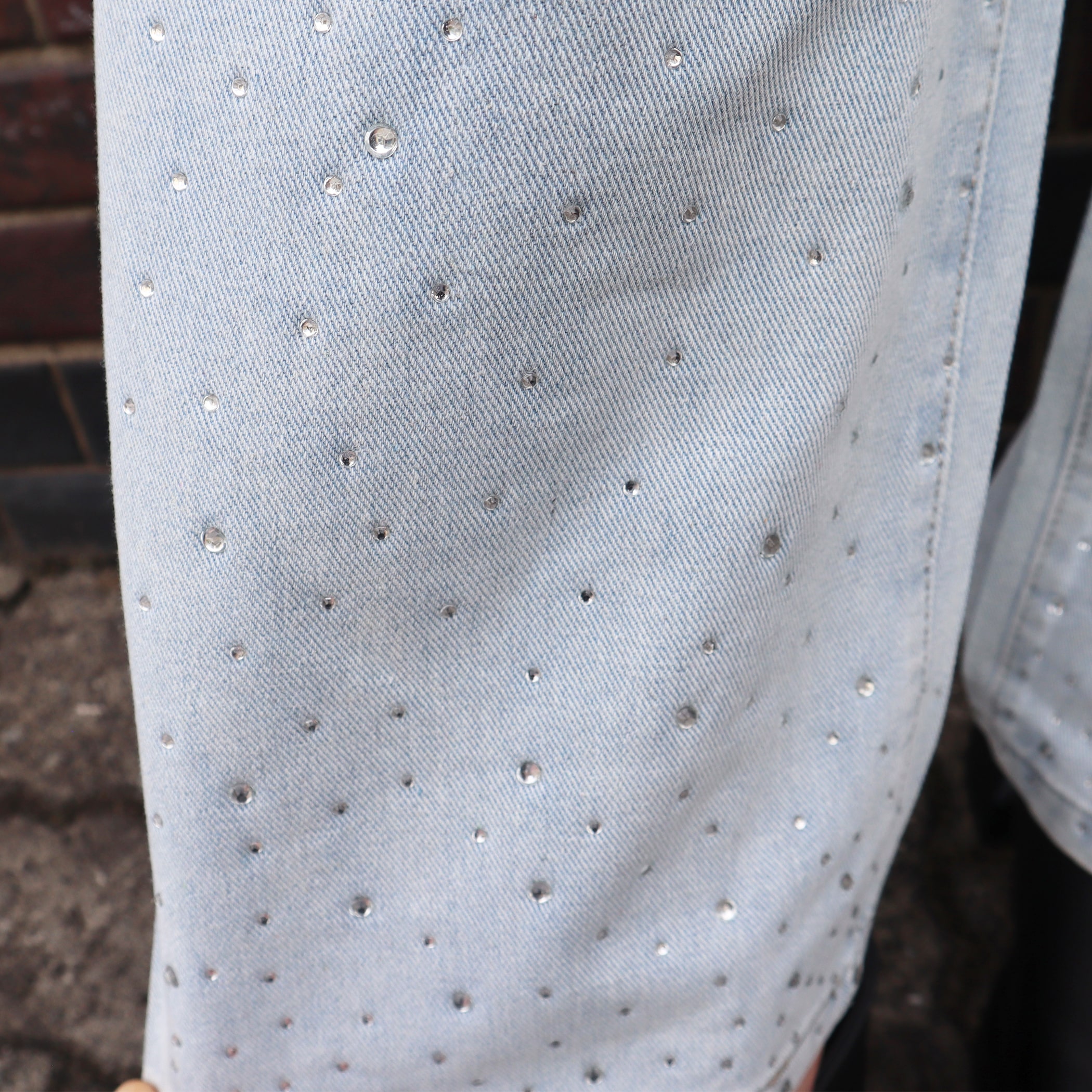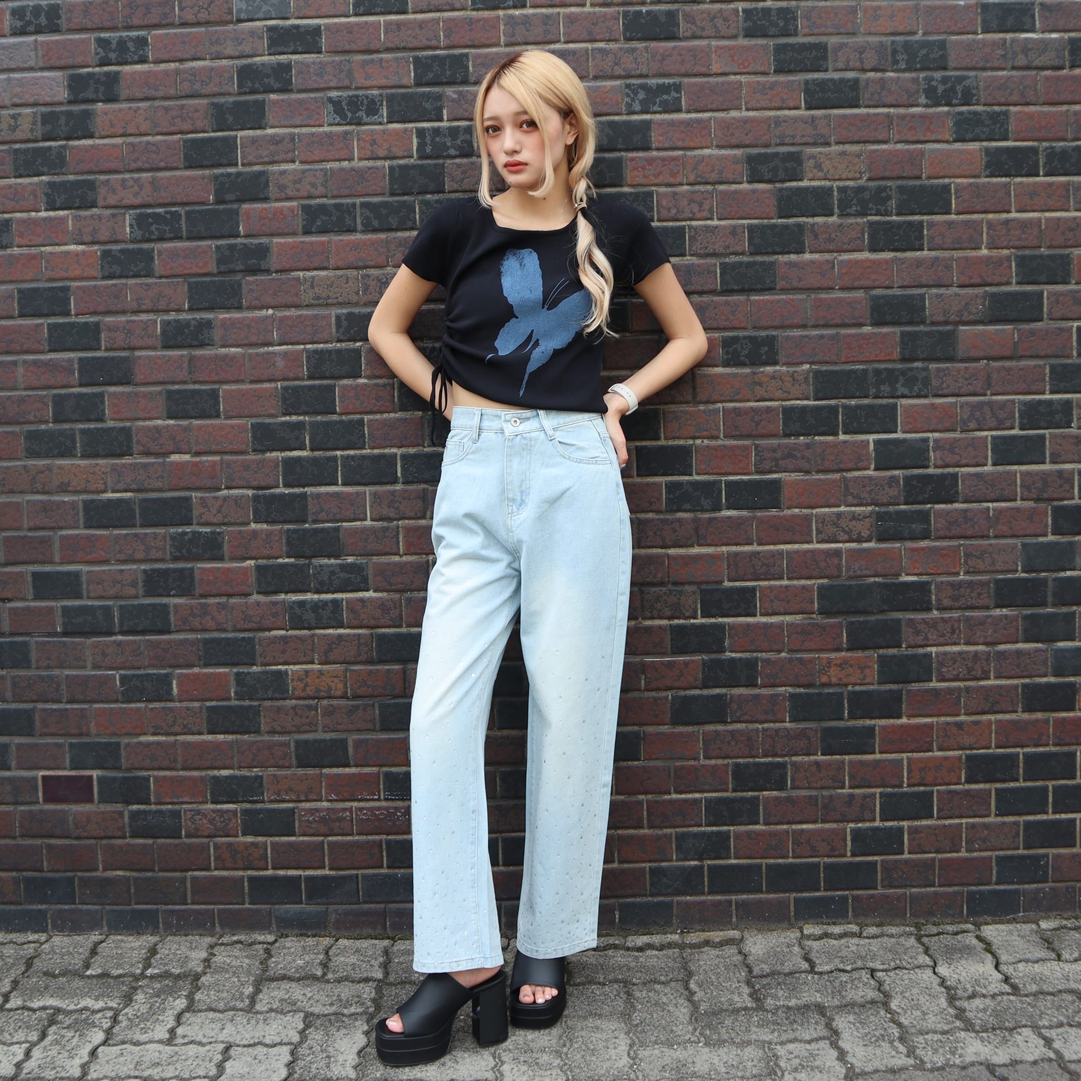 年中着用できる定番のデニムにラインストーンがついた大人かわいいパンツ。1枚でサマになるデザインですが、ゆったりとした履き心地で使いやすいカラーなので着回し抜群のアイテム!いつものスタイリングにアクセントをプラスしてくれる1枚持っておいて損はないパンツです。デニムでも女性らしい印象で着て頂けます。カジュアルなトップスやキャップと合わせたカジュアルコーデやフリルブラウスと合わせた甘めなコーデもおすすめです。
