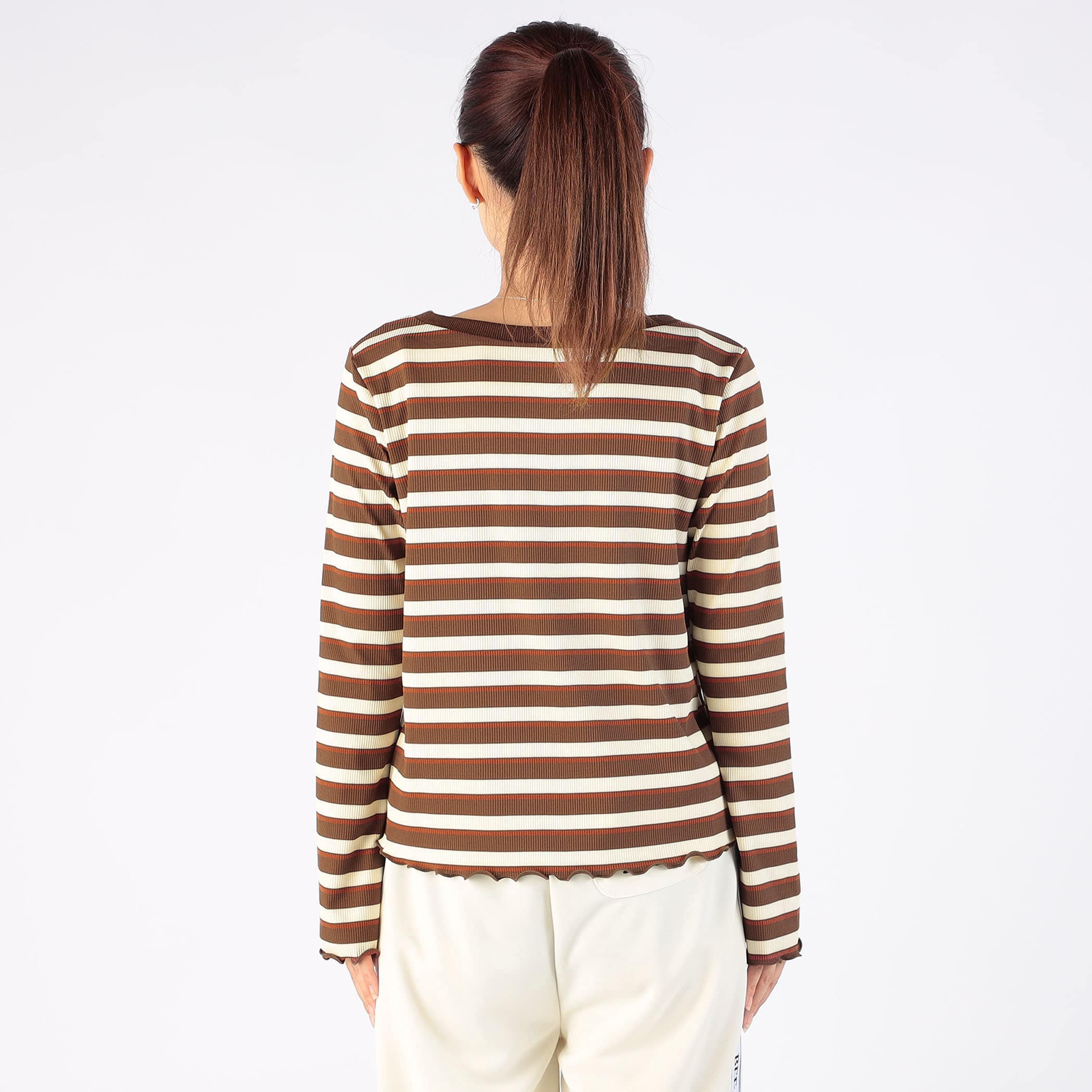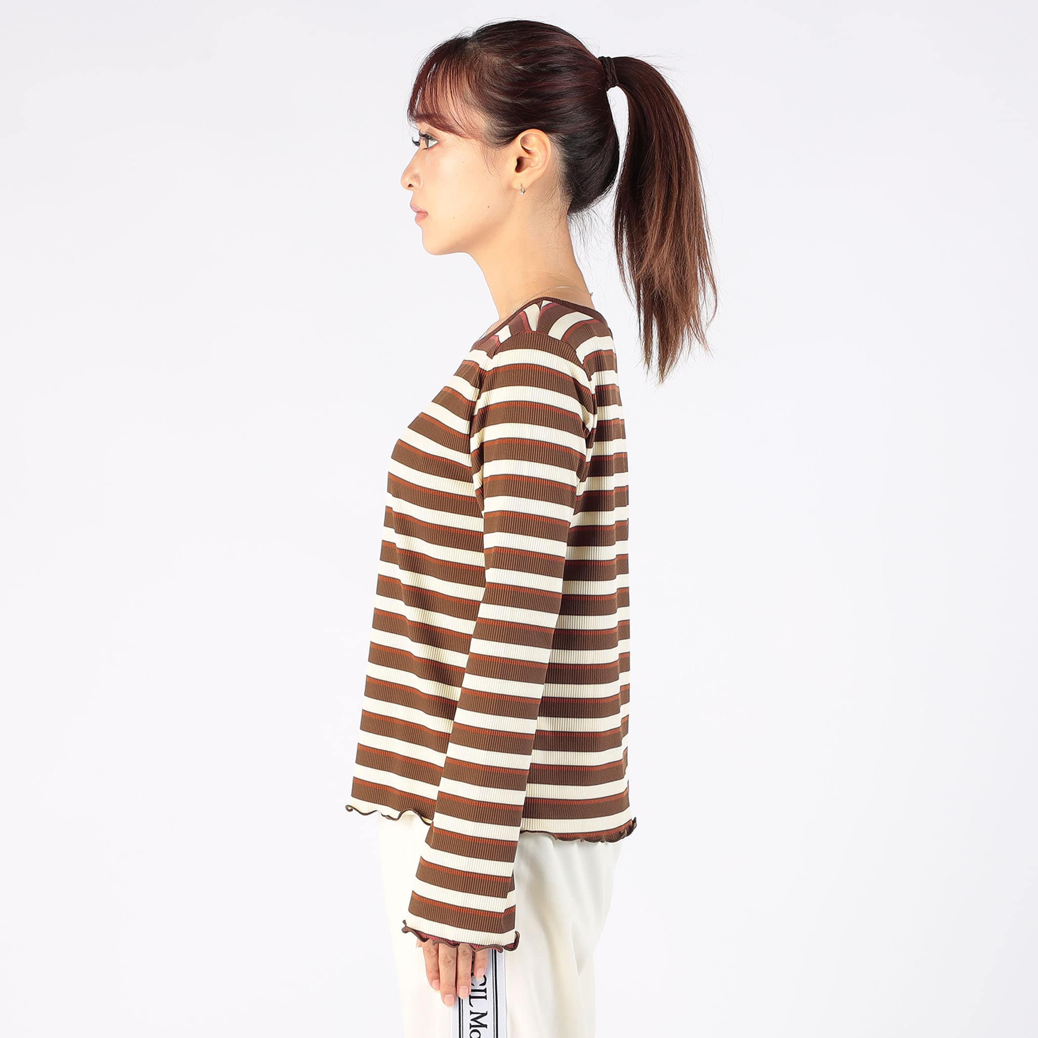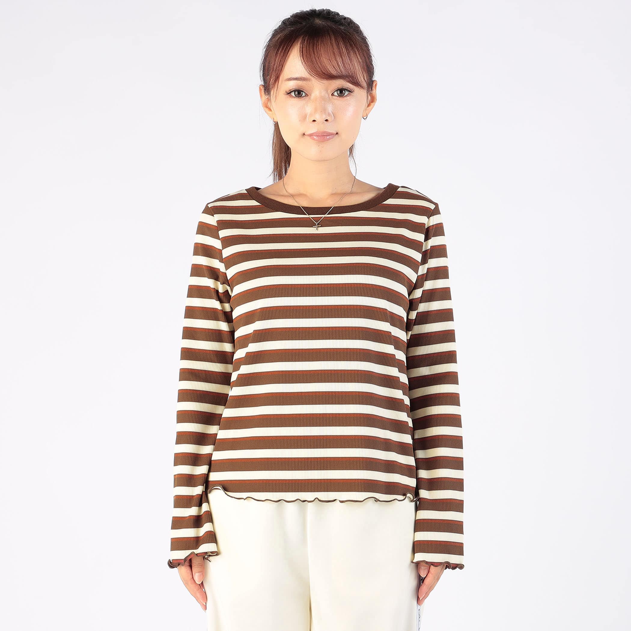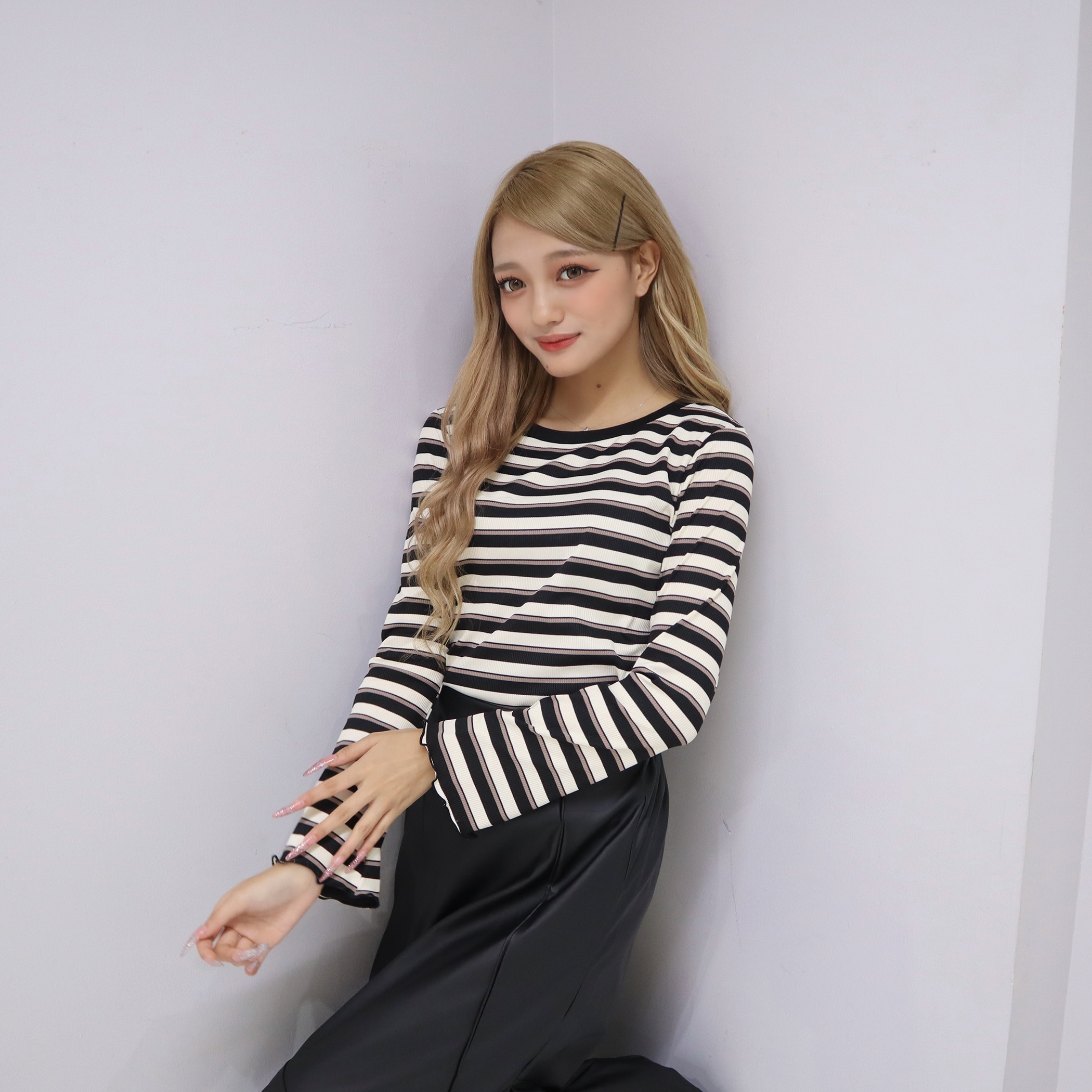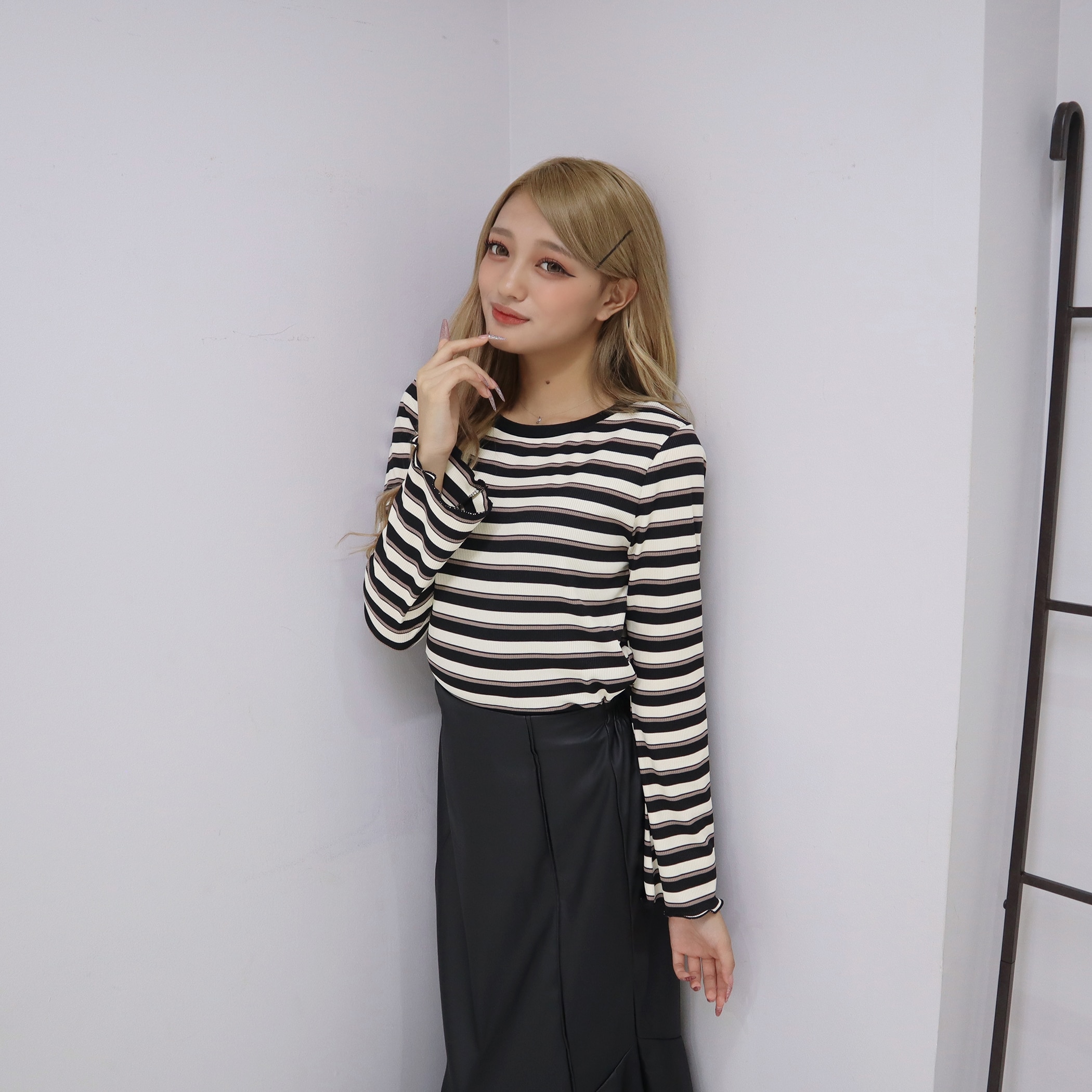 マルチボーダーとメローデザインがカジュアルかつガーリーで可愛いリブトップス。デコルテと程よくフィットするボートネックで、シルエットもきれいに見せてくれるのが◎。コンパクトすぎないサイズ感で、ボトムを選ばす一枚でもレイヤードでも合わせやすいアイテムです。