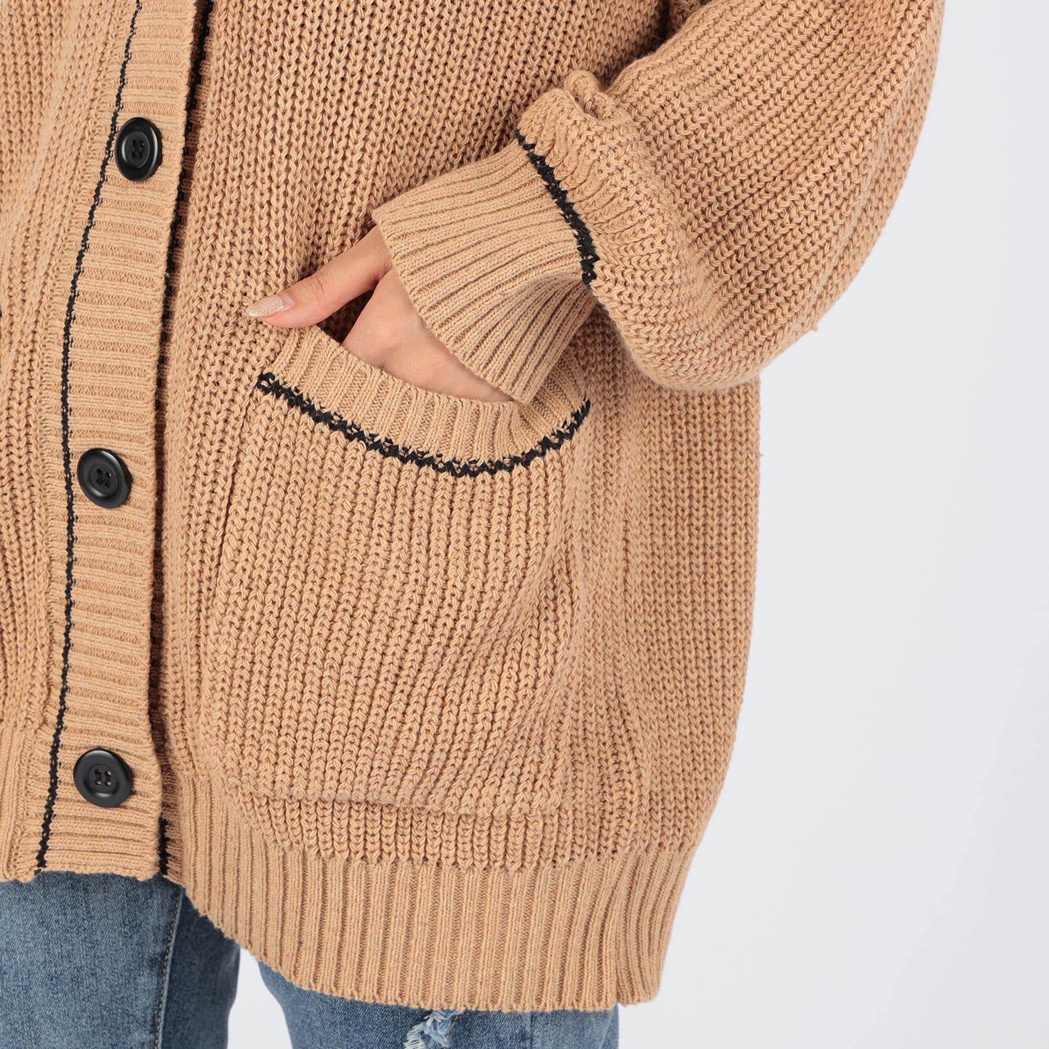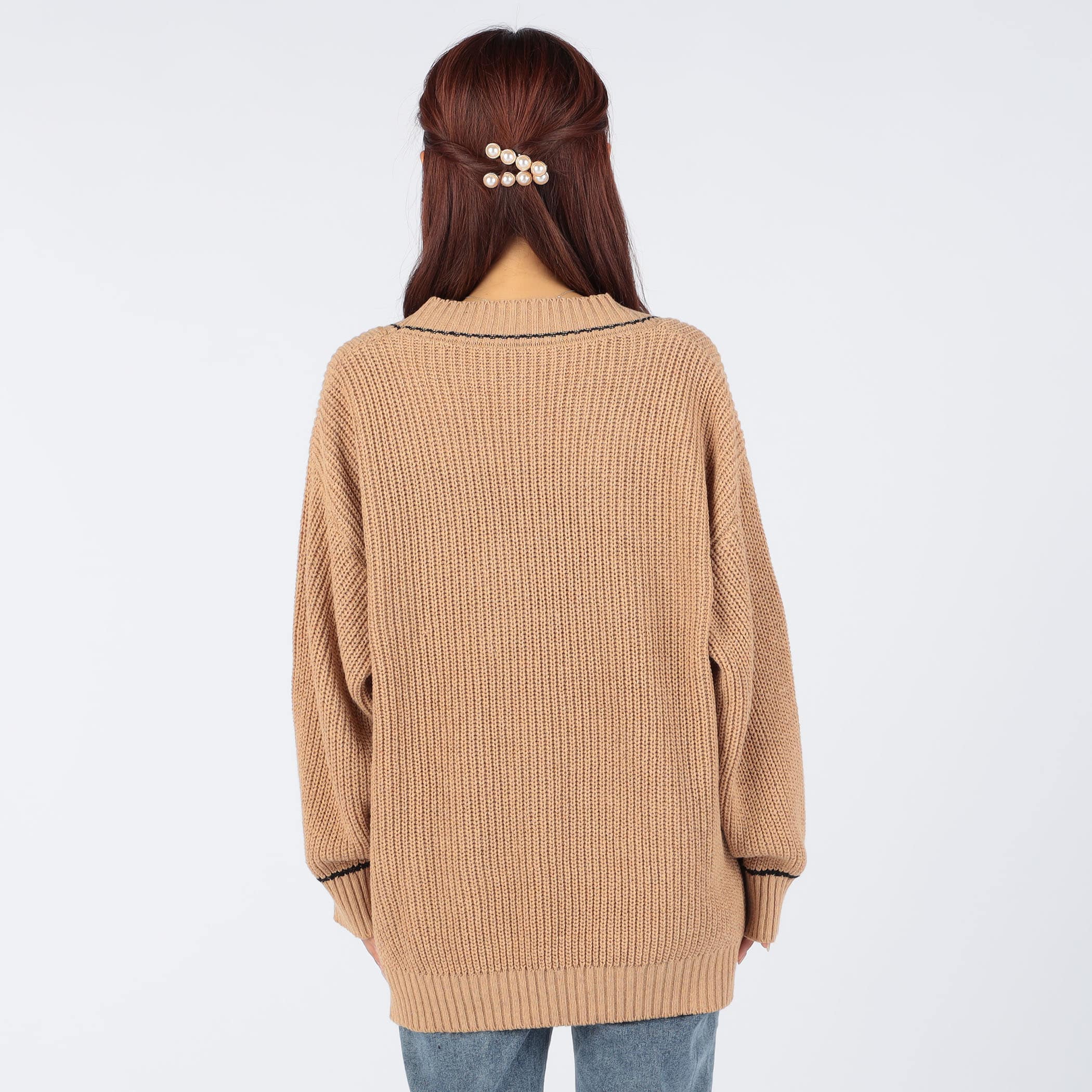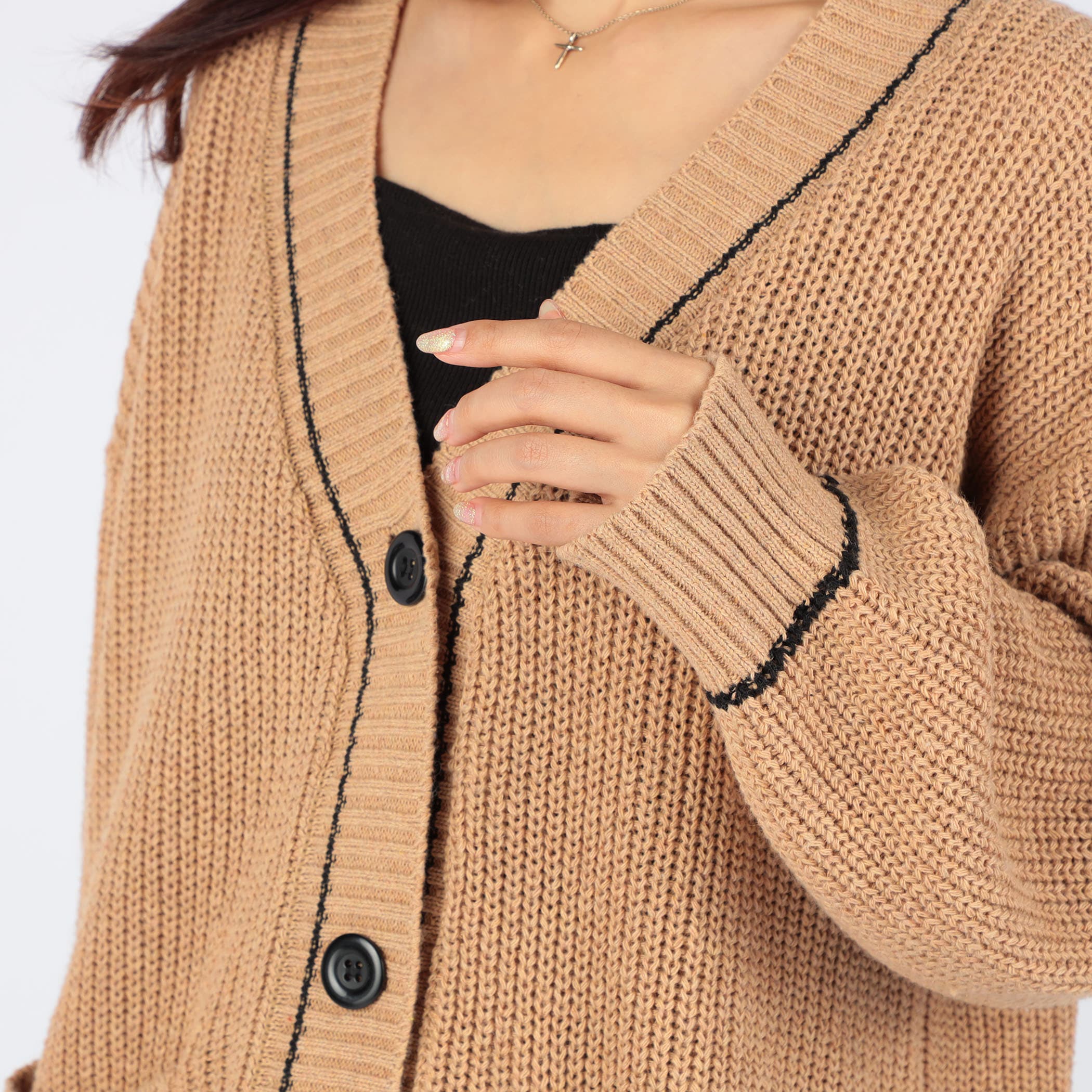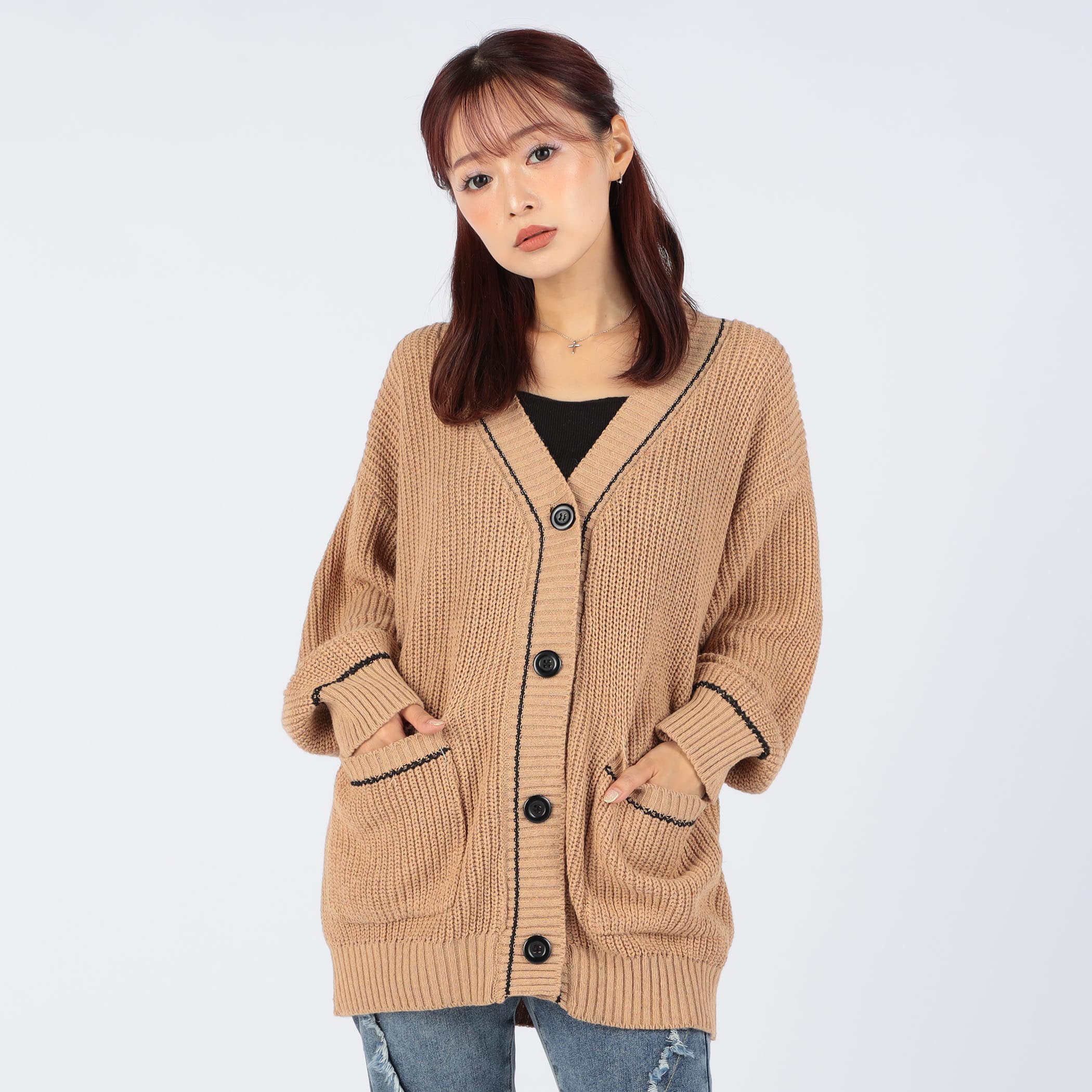 配色ラインがアクセントになったVネックデザインのカーディガン。しっかりとした肉感であたたかく着用することができます。深めのVネックデザインとゆとりのあるオーバーシルエットで、華奢な印象を与えてくれます。シンプルなデザインで着回しもしやすく、様々なスタイリングにも活躍してくれるアイテムです◎