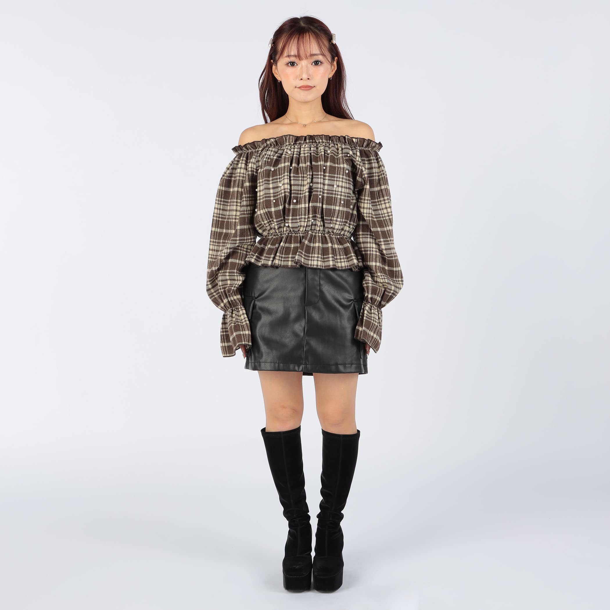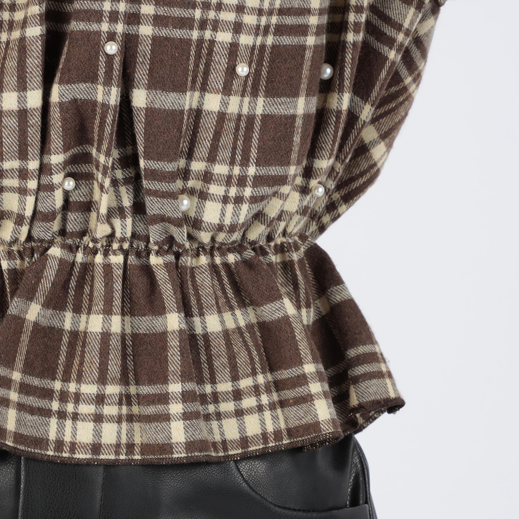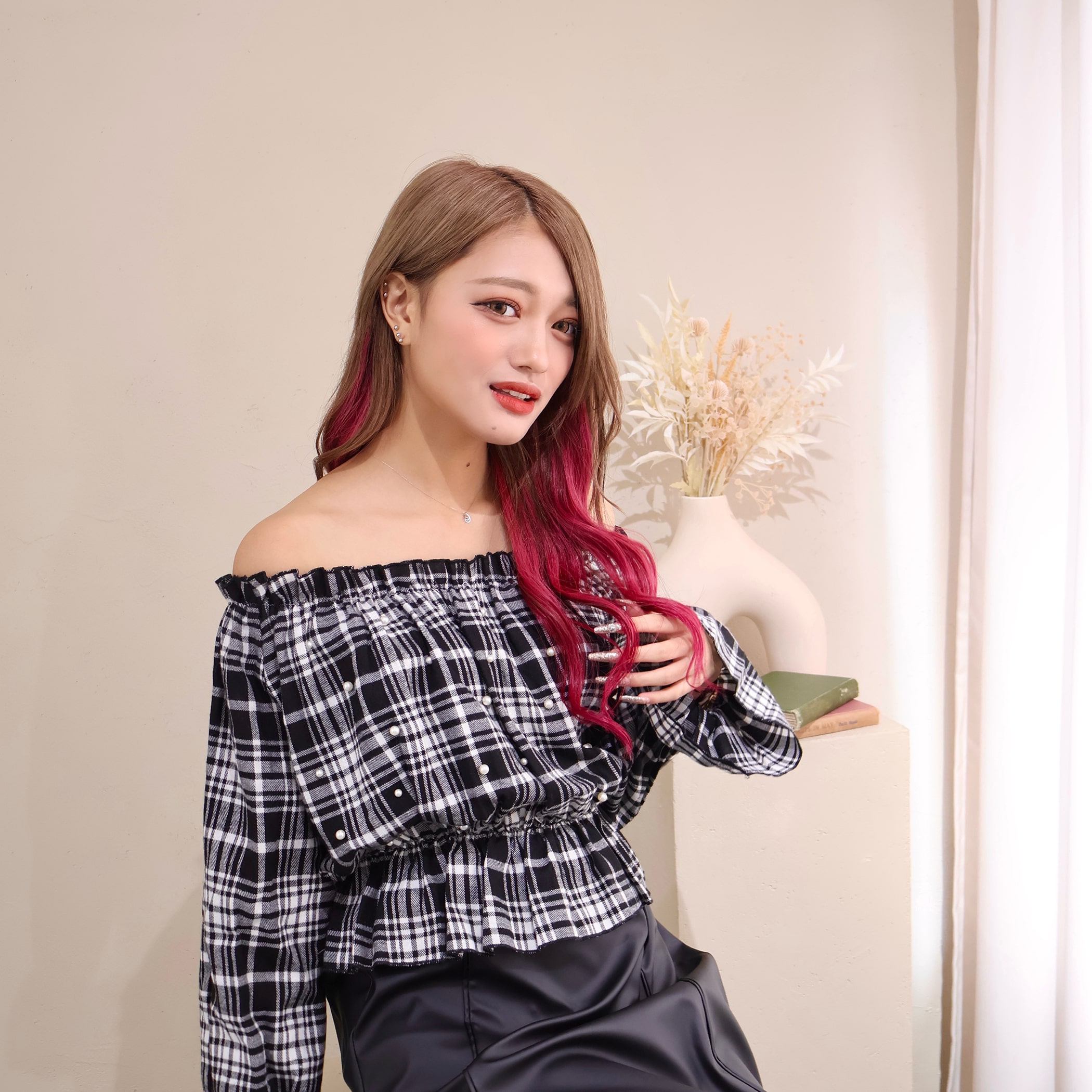 パールをちりばめたギャザーブラウス。トレンドのビジュー使いでパールをちりばめたチェック柄のブラウスです。襟回りにはゴム入り仕様にしてオフショルスタイルでも着用出来る2WAYデザインです。華奢魅せ出来るキャンディースリーブは可愛らしい印象に。甘くなりがちなギャザーデザインでもチェック柄生地を使用することによって、デニム合わせでカジュアルな着こなしにも◎ミニ丈のボトムを合わせると人気の韓国ファッションな着こなしも楽しめ、リボンアイテムと合わせてガーリーなコーデもオススメです。秋服冬服コーデにONすればシーズンムードをぐっと高めてくれます。