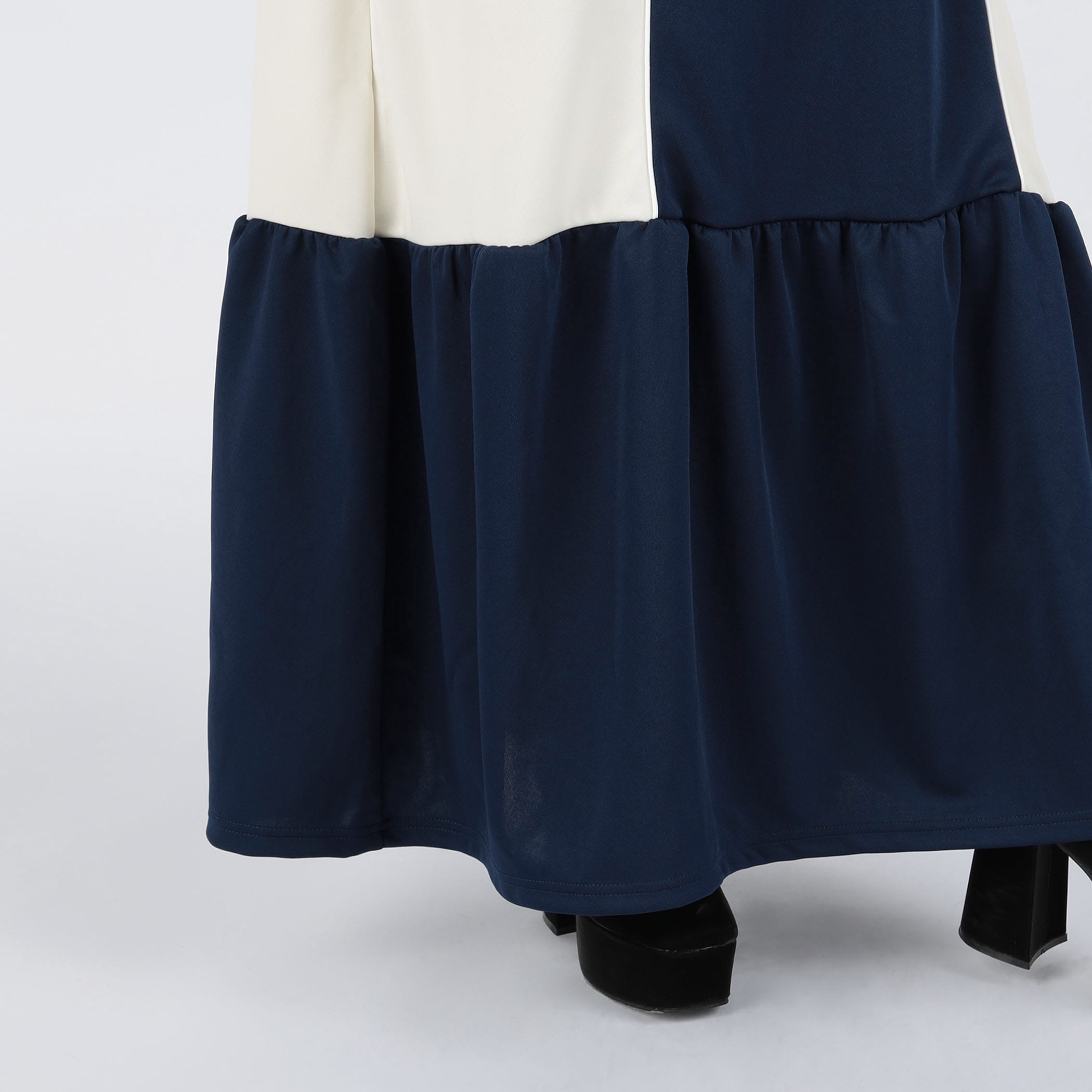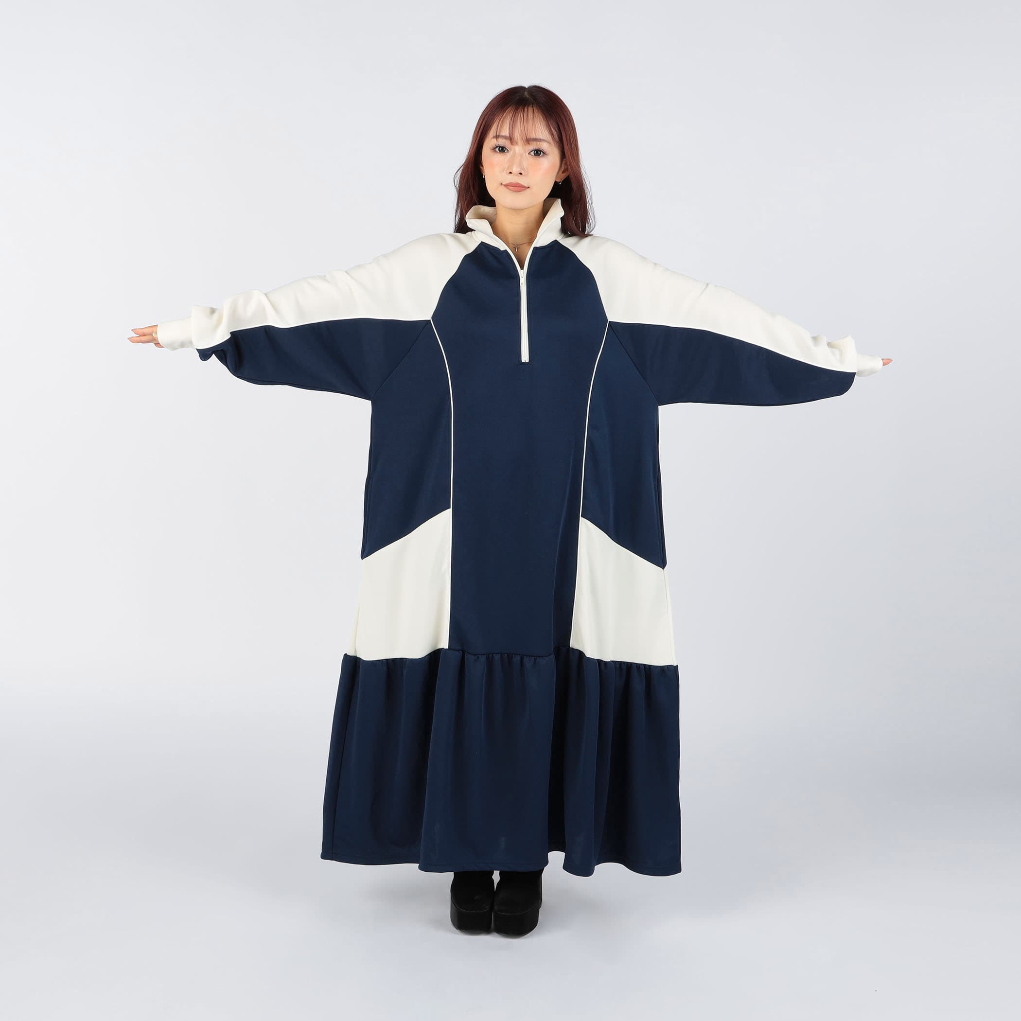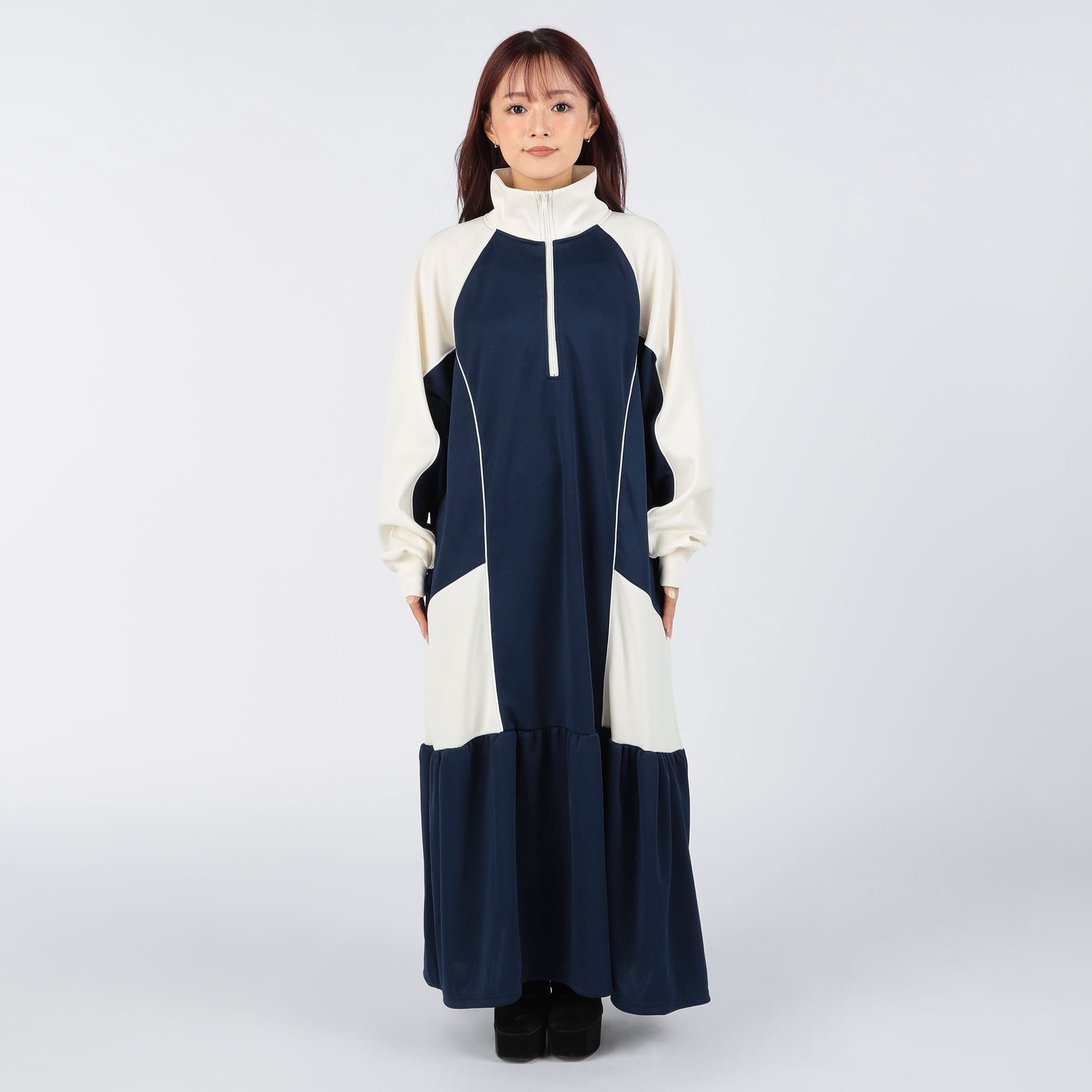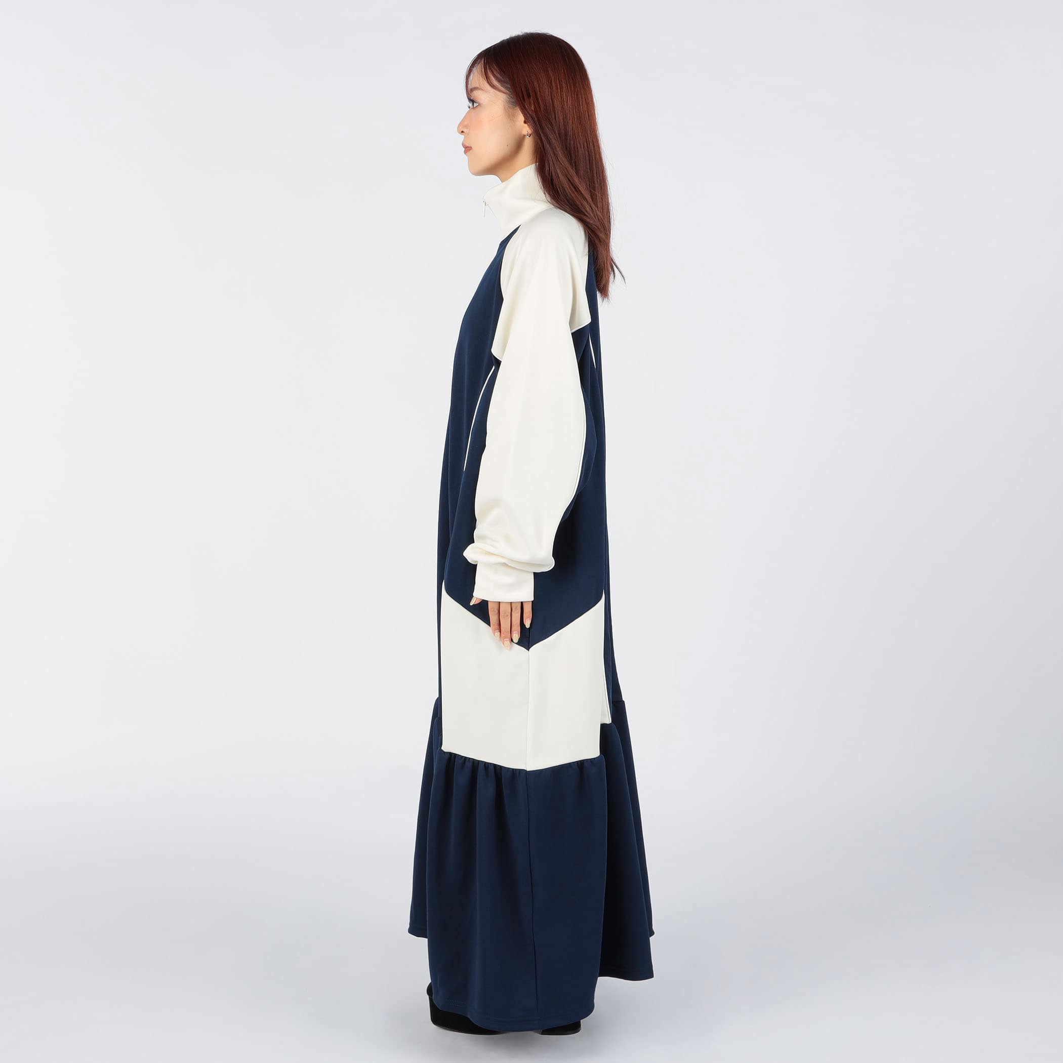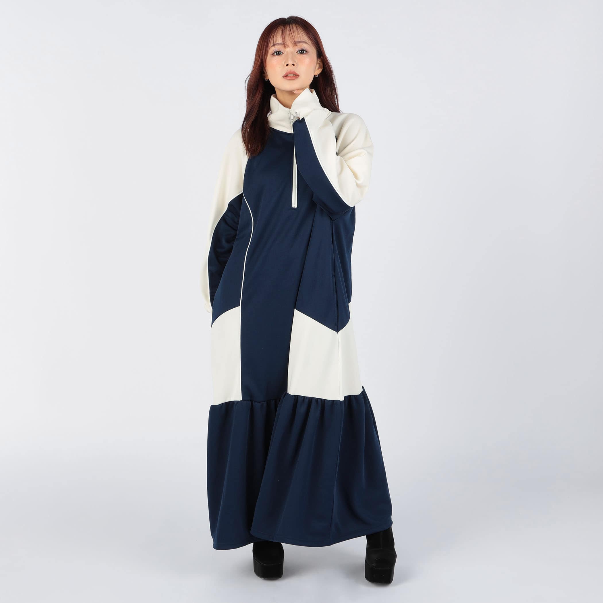 ハーフジップデザインとカラー配色がスポーティかつ目を引くロングジャージワンピース。裾のティアード切り替えにギャザー入れ、ふんわりと広がる立体的なシルエットに。足元にカラーソックスやスニーカーなどアイテムを合わせれば、とびっきり旬なスタイリングに。一枚でコーディネートが完成するトレンドアイテムです。