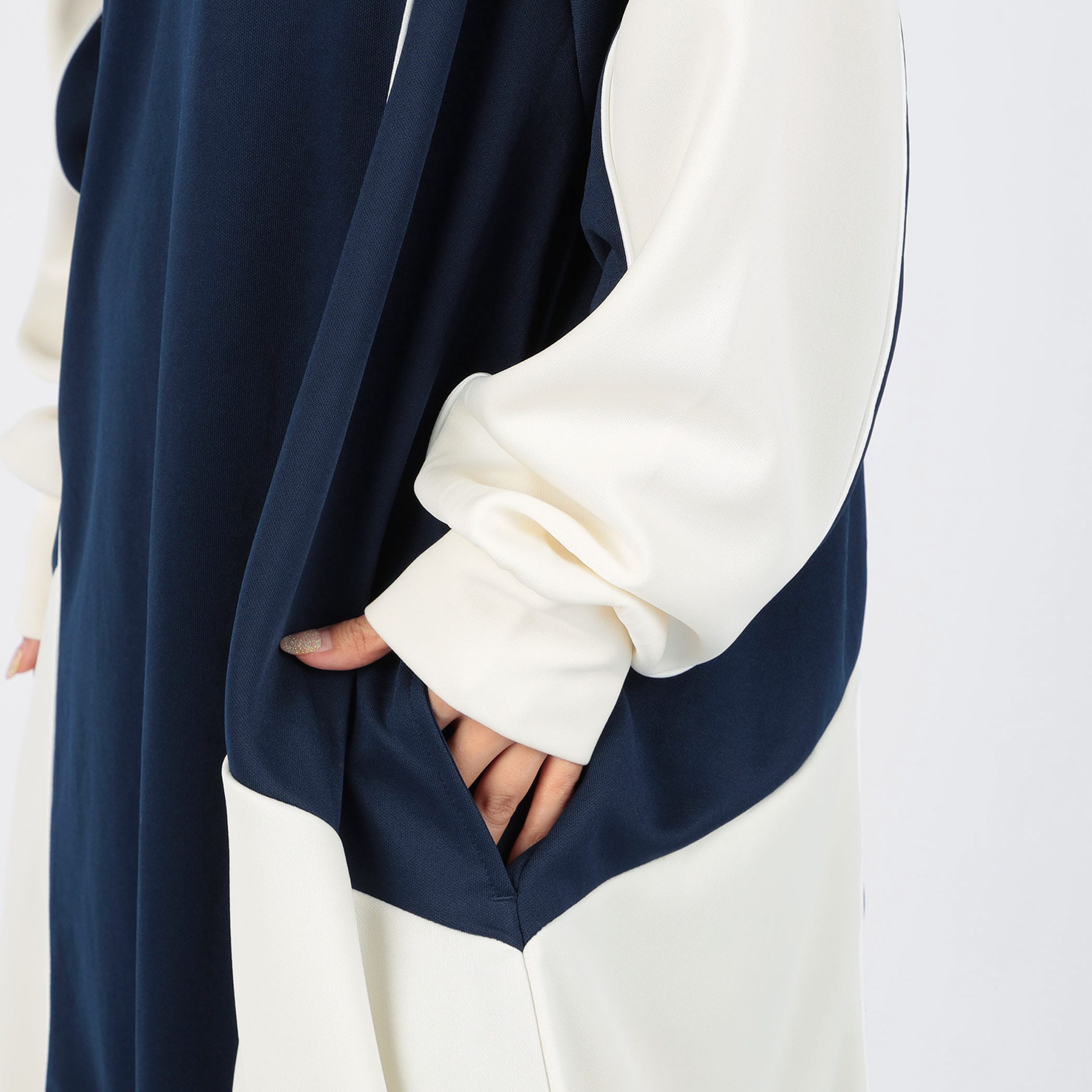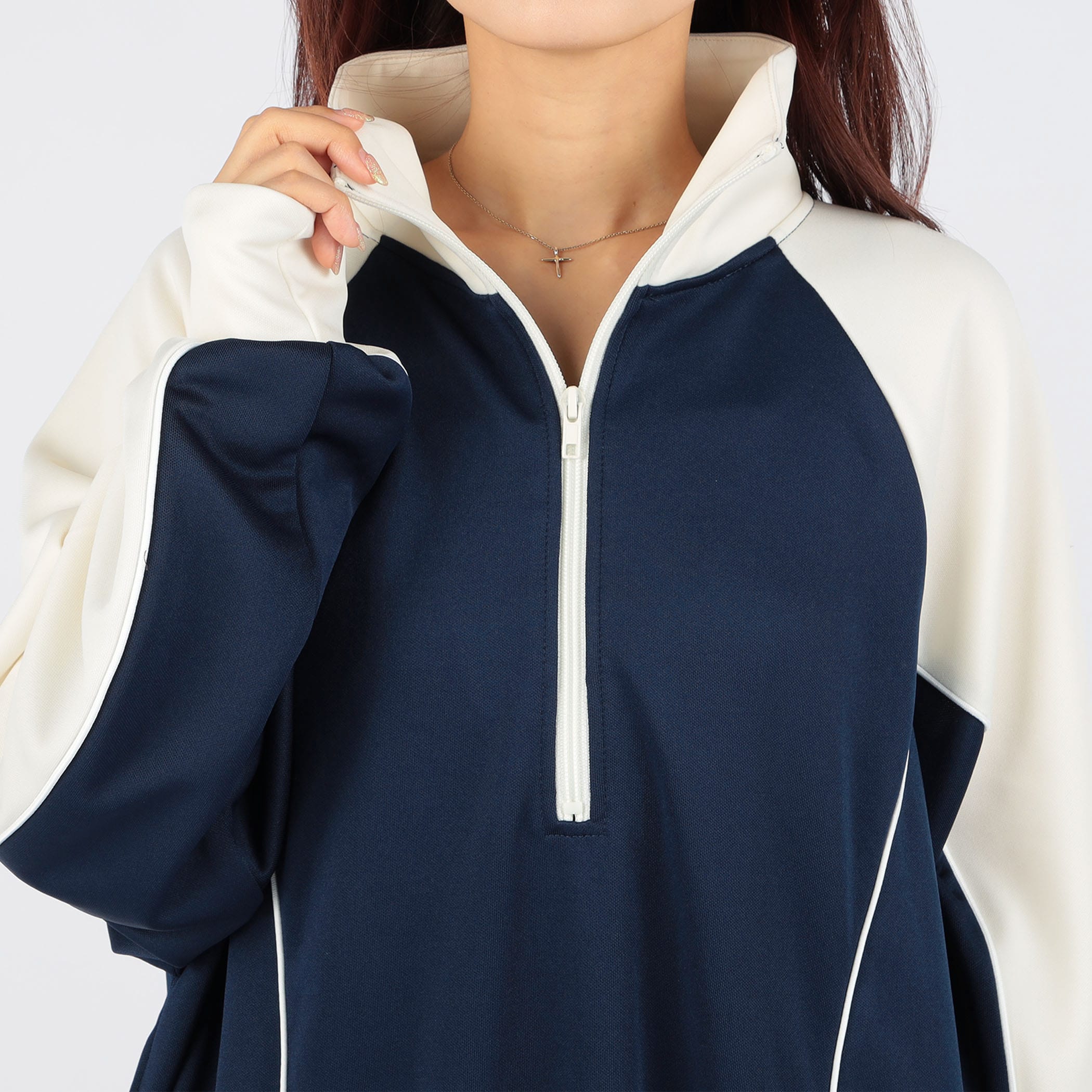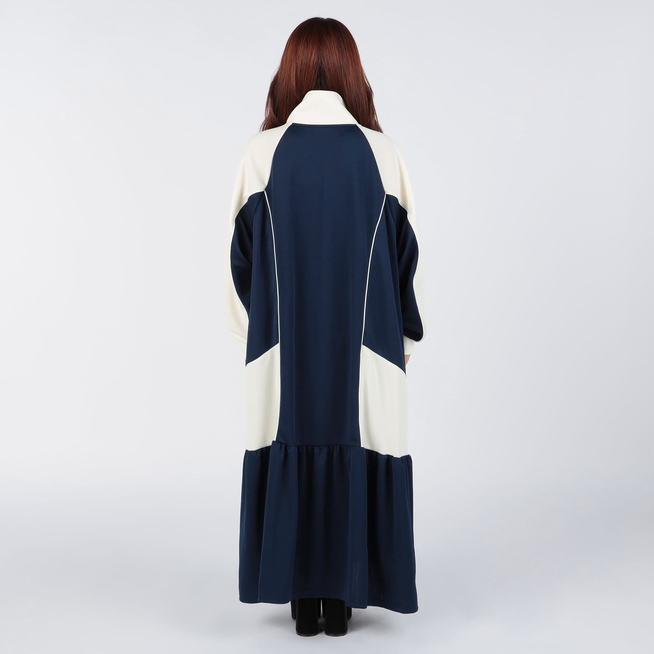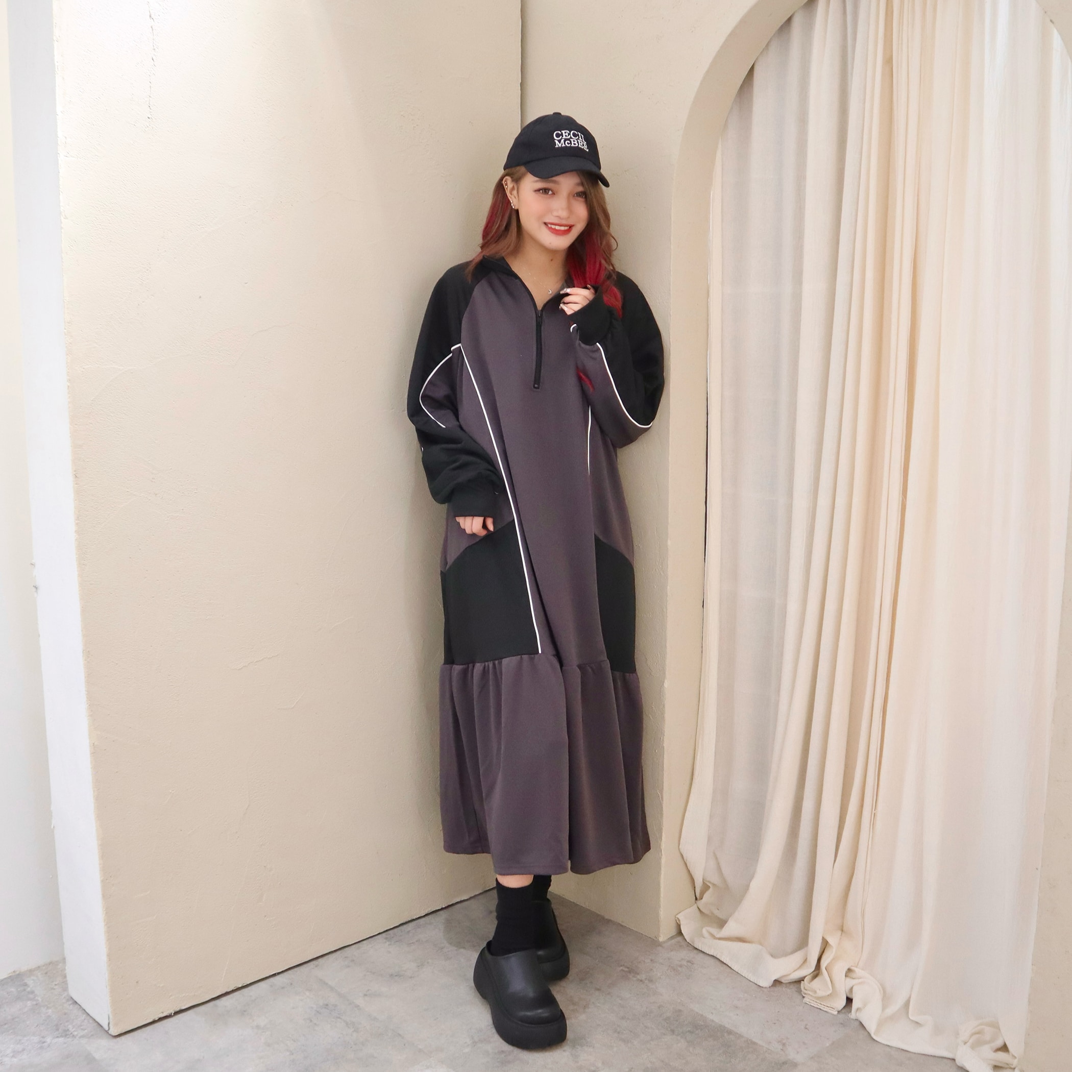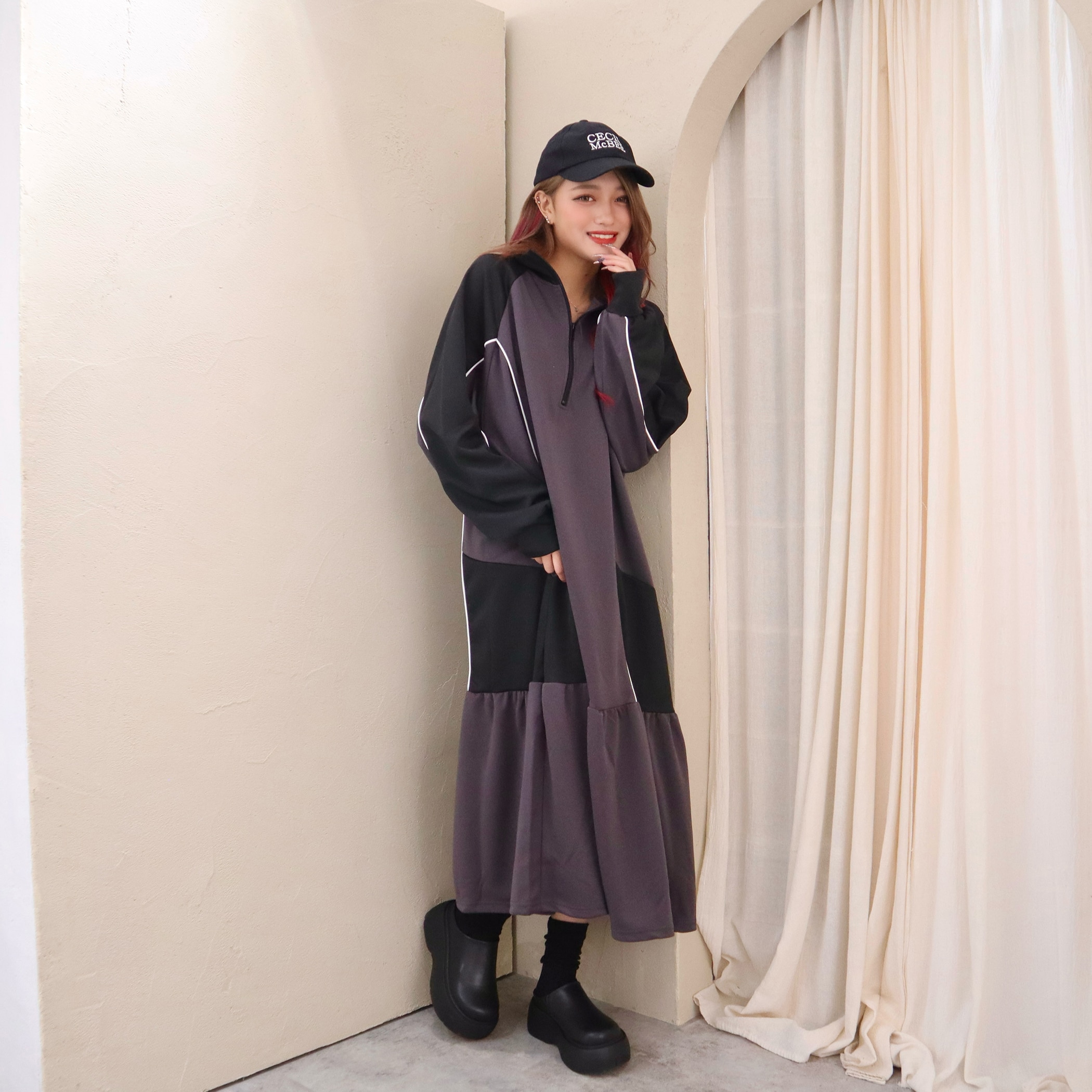 ハーフジップデザインとカラー配色がスポーティかつ目を引くロングジャージワンピース。裾のティアード切り替えにギャザー入れ、ふんわりと広がる立体的なシルエットに。足元にカラーソックスやスニーカーなどアイテムを合わせれば、とびっきり旬なスタイリングに。一枚でコーディネートが完成するトレンドアイテムです。