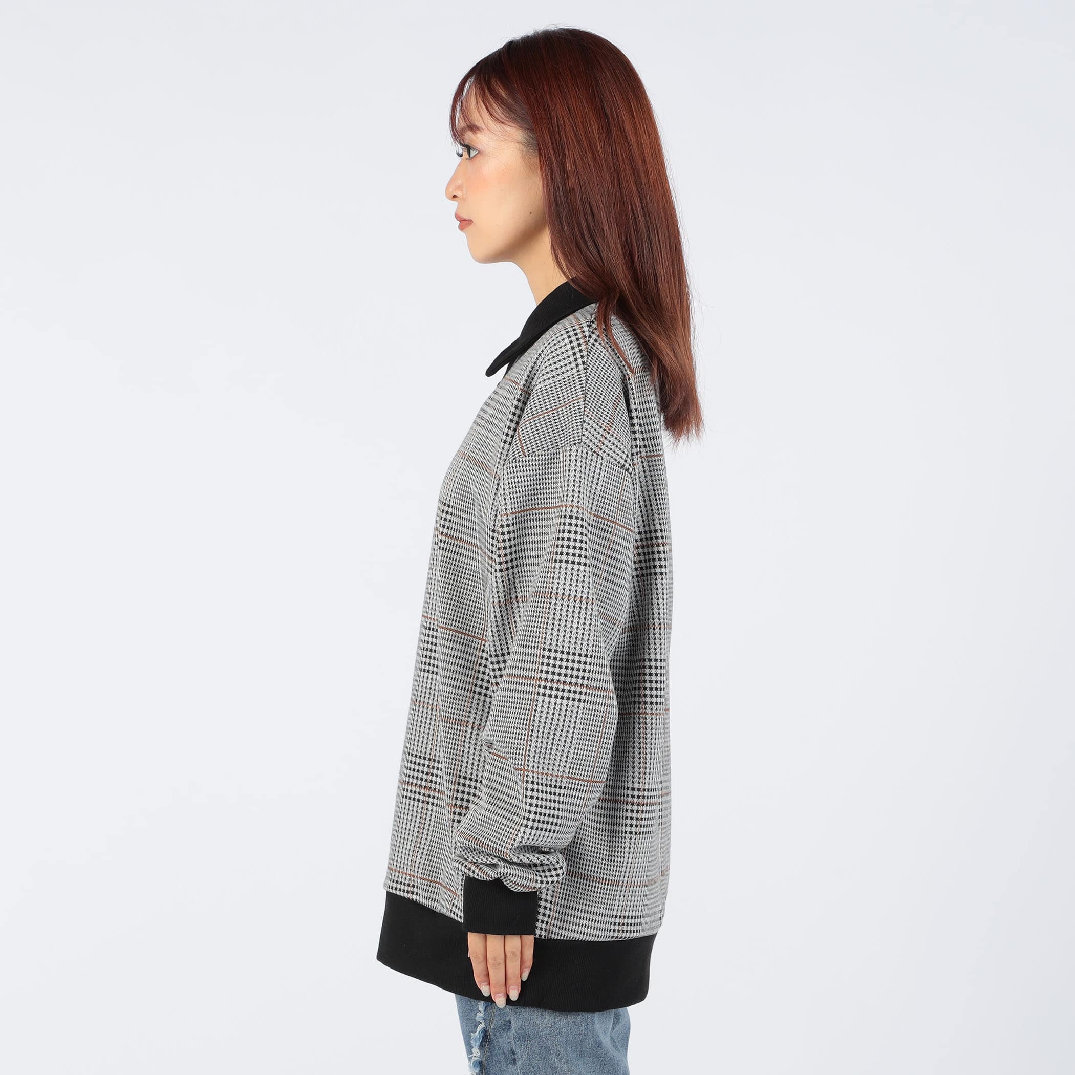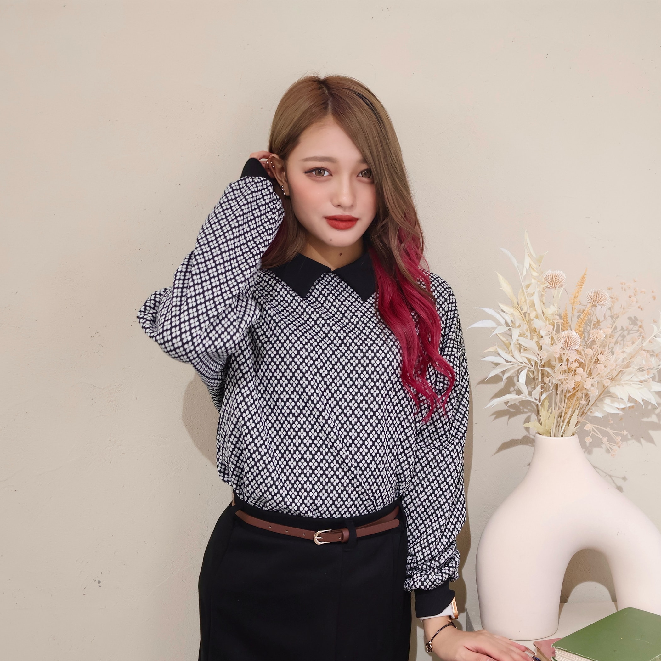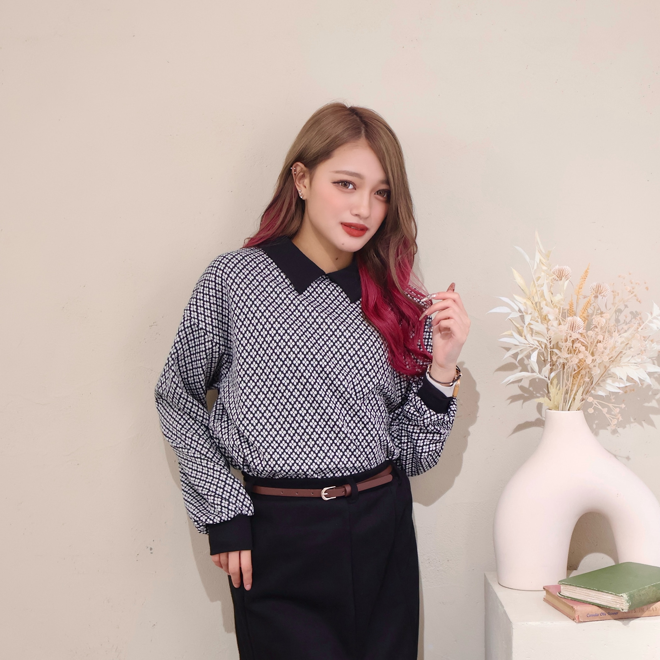 ドロップショルダーで抜け感のあるサイズ感が着用しやすいカジュアルな印象の衿付きジャガードトップス。体のラインを拾わない華奢見えさせてくれるサイズ感で、落ち着いたトーンのカラー展開なのでボトムを選ばず、お手持ちのアイテムにも合わせやすい一枚です。