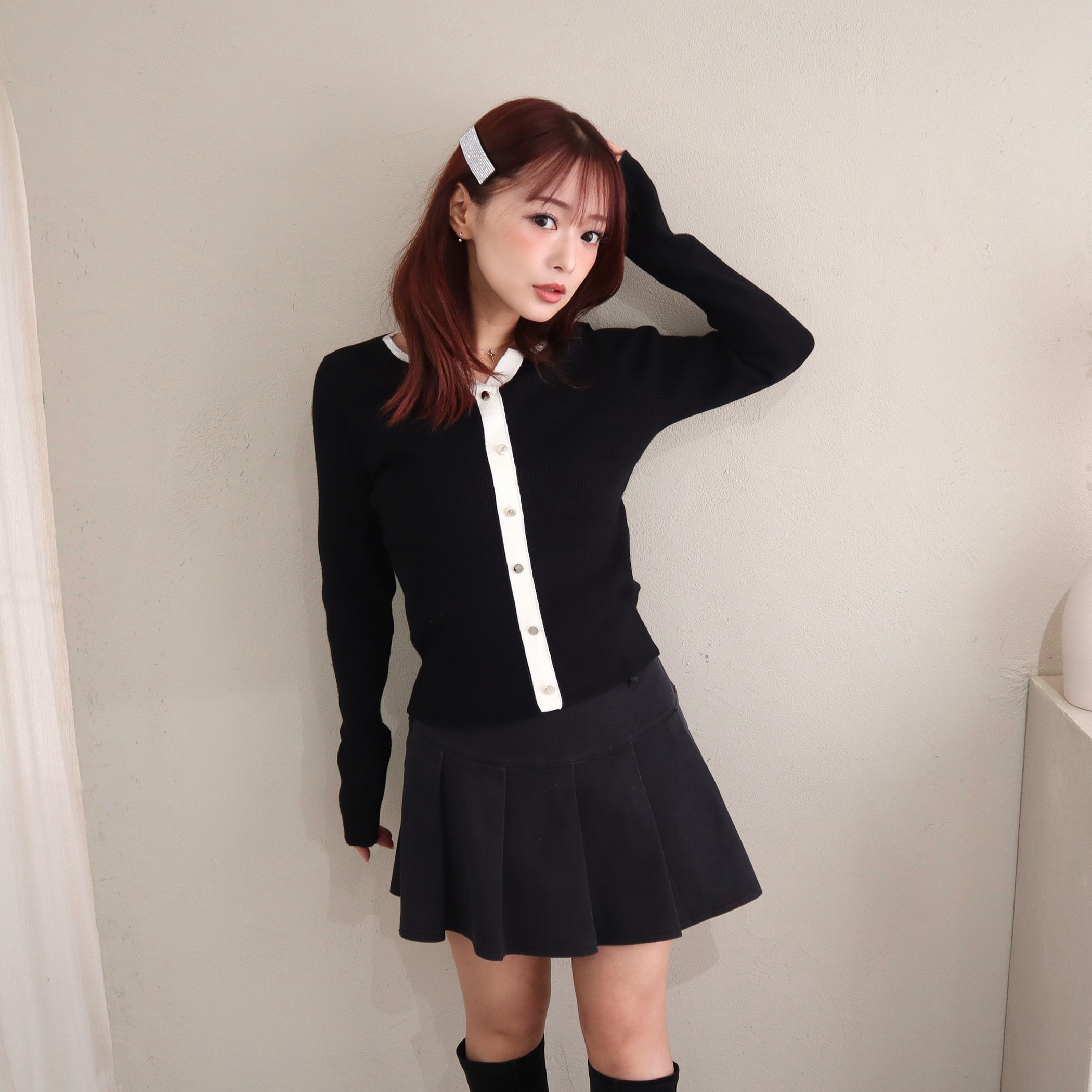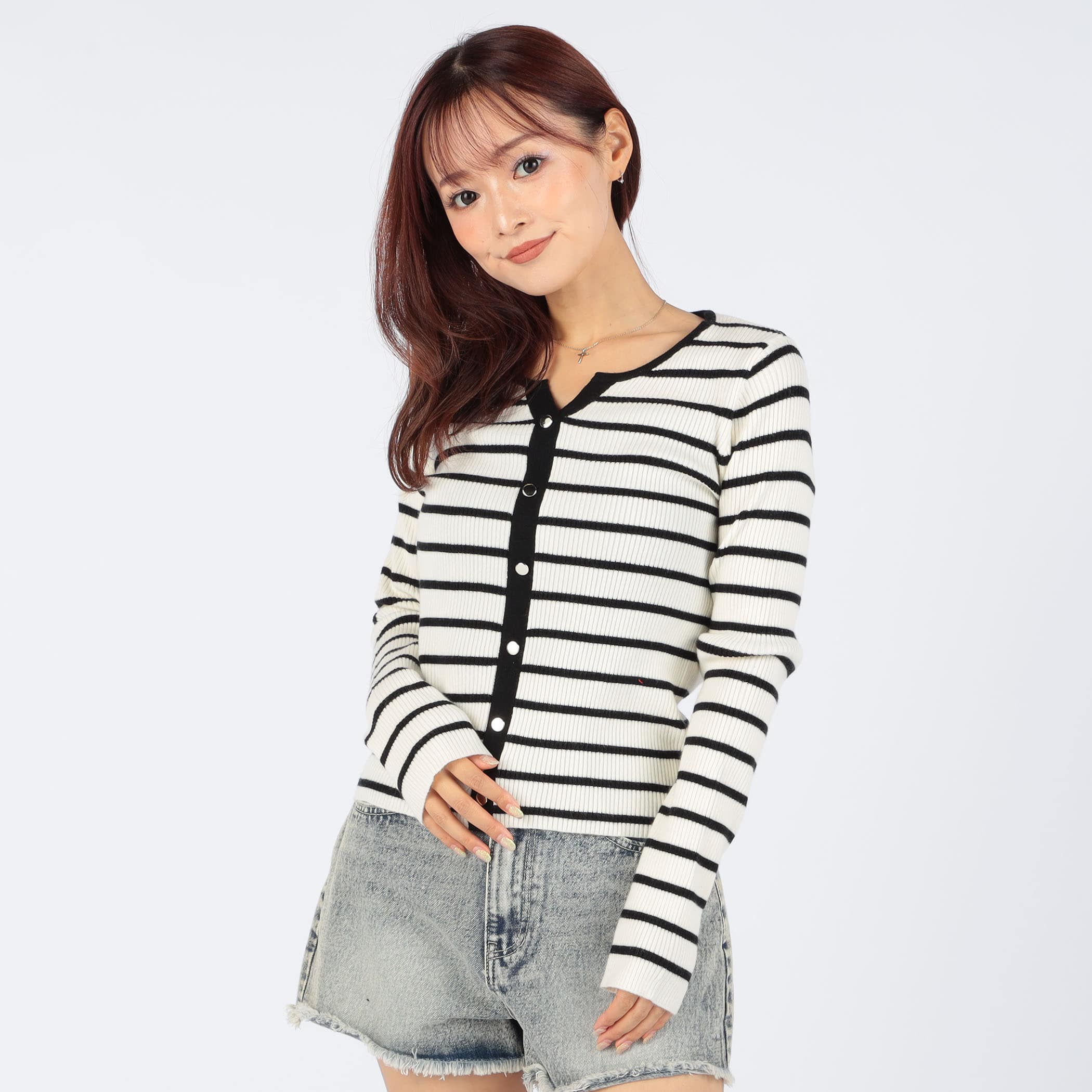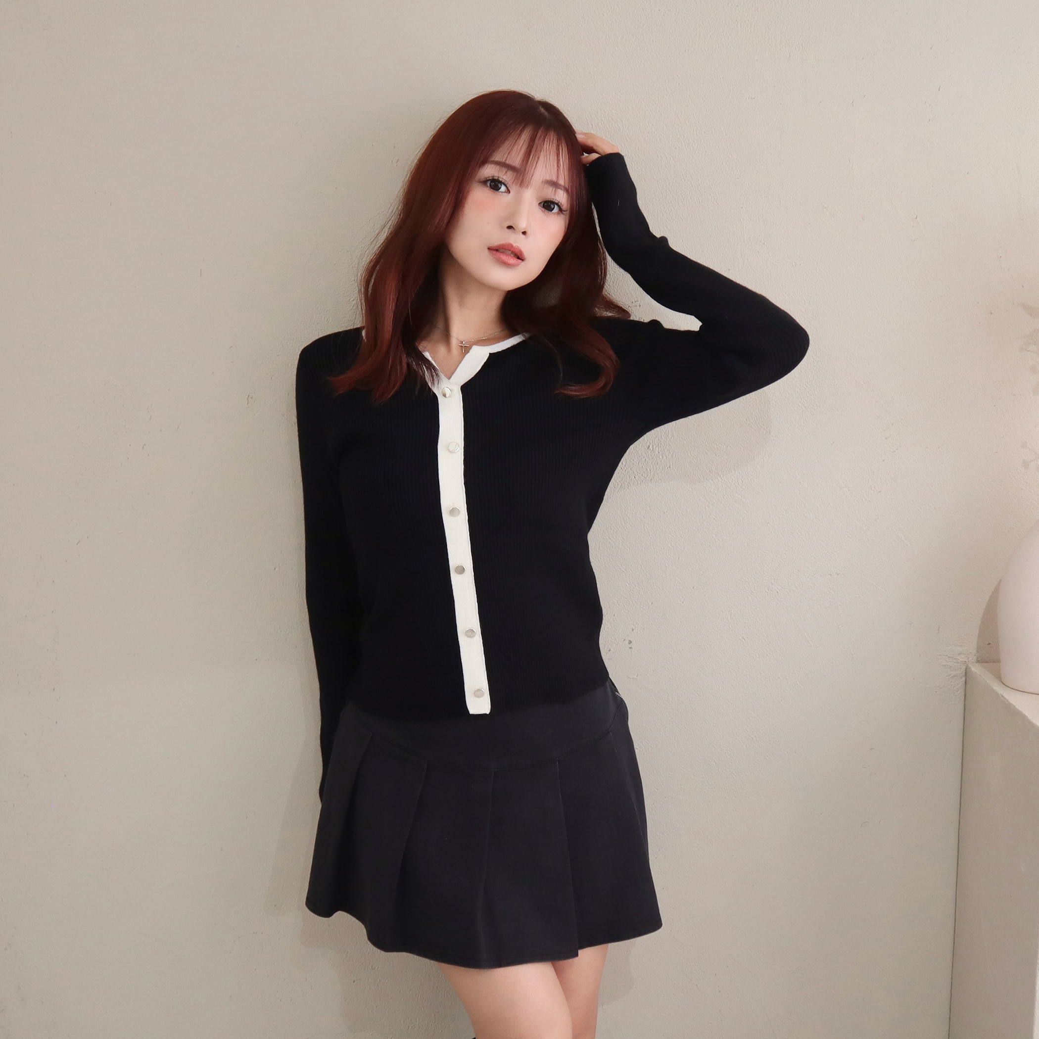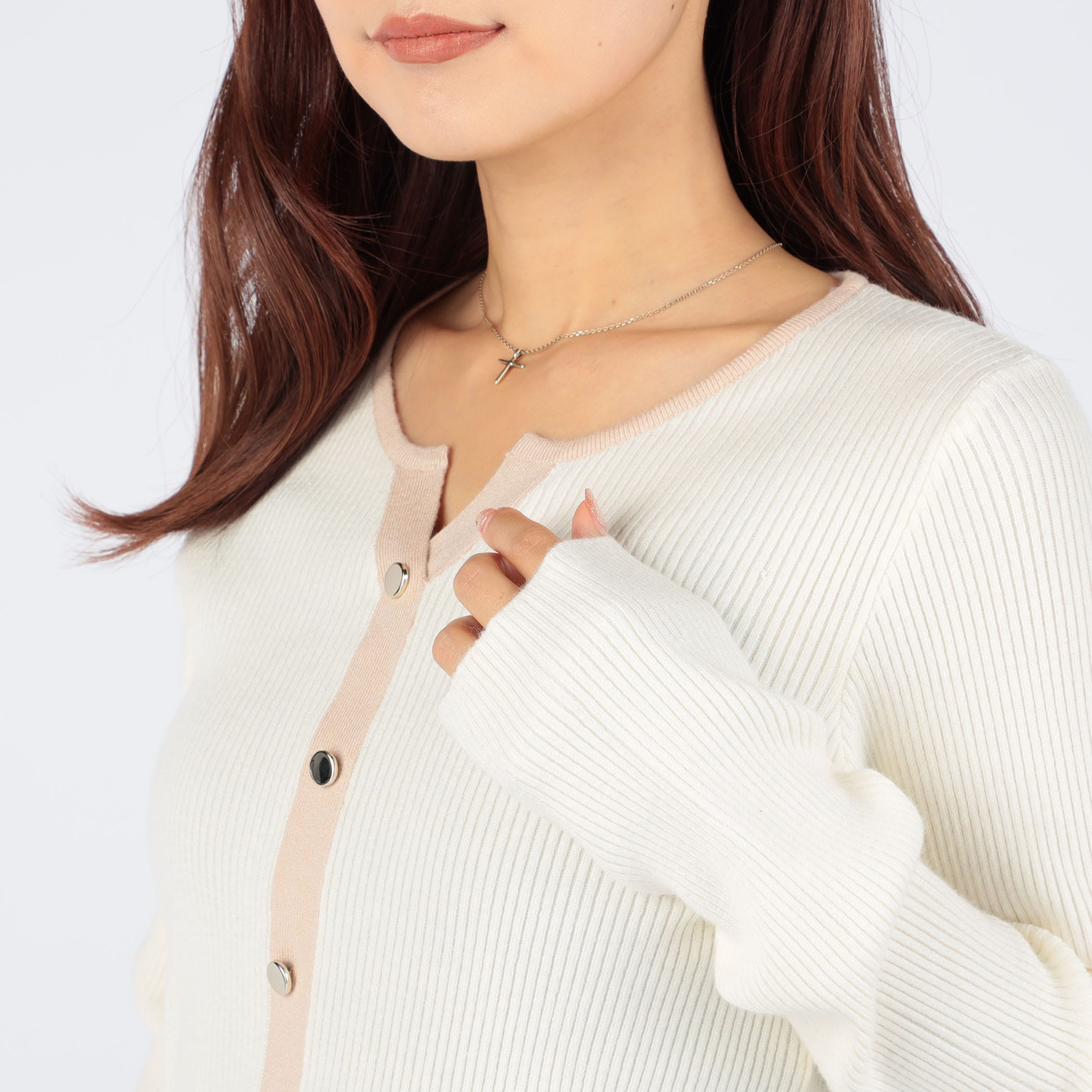 シックに触れる美人見えプルオーバー。センターに飾り釦をあしらった今までにない新鮮デザインがお洒落。ネックラインとセンターに配色ラインを入れてメリハリのあるシックな仕上がりに。シンプルなので柄物アイテムとも無地アイテムとも合う、万能なディティールで使いやすい1枚です。
