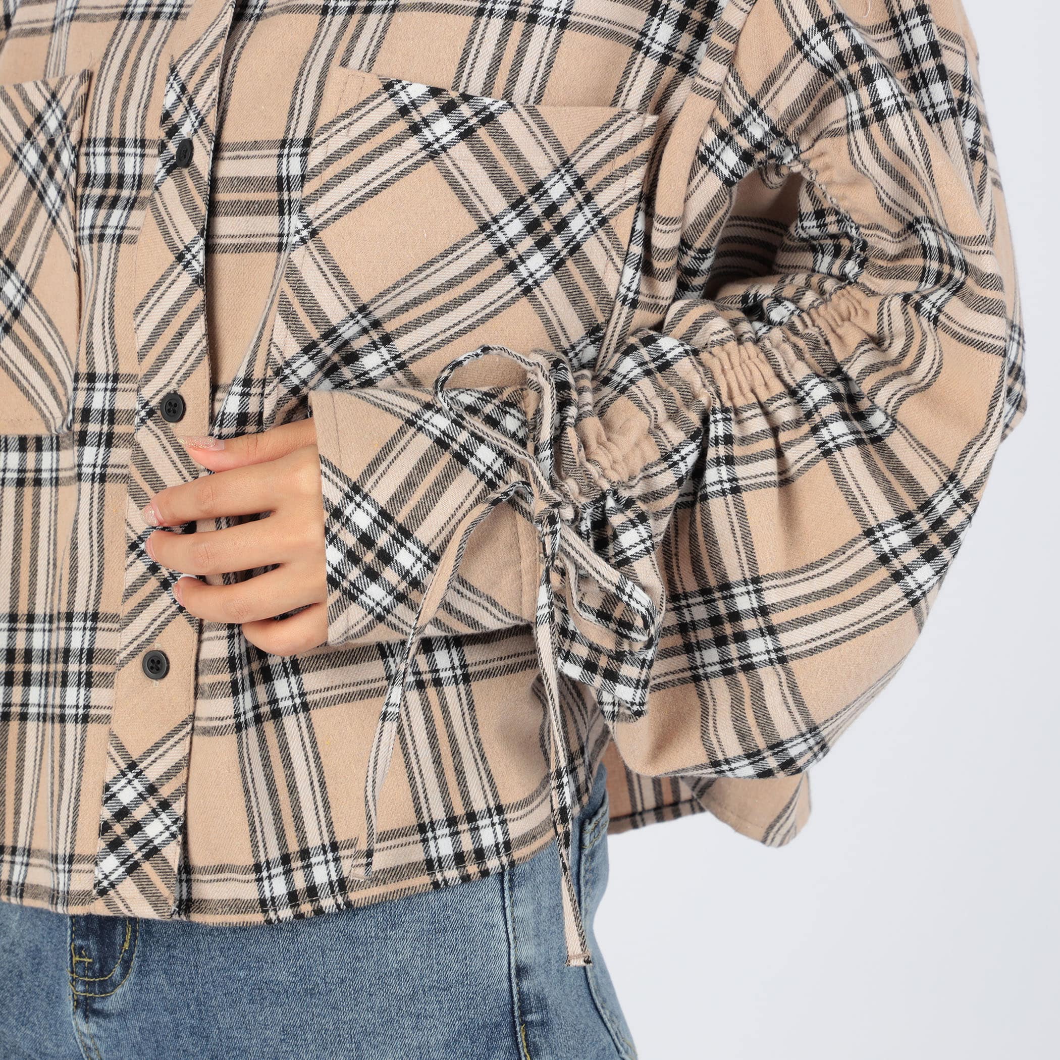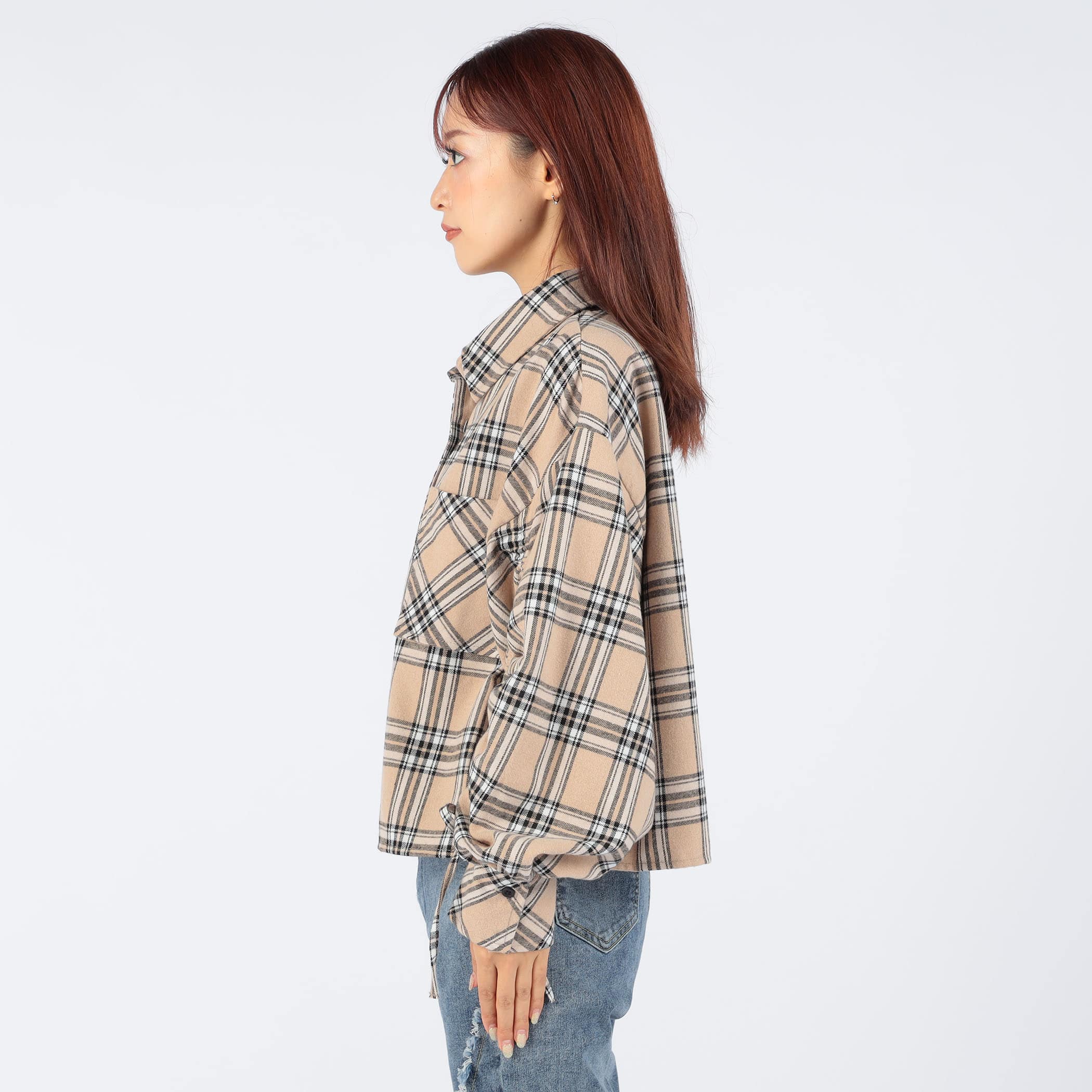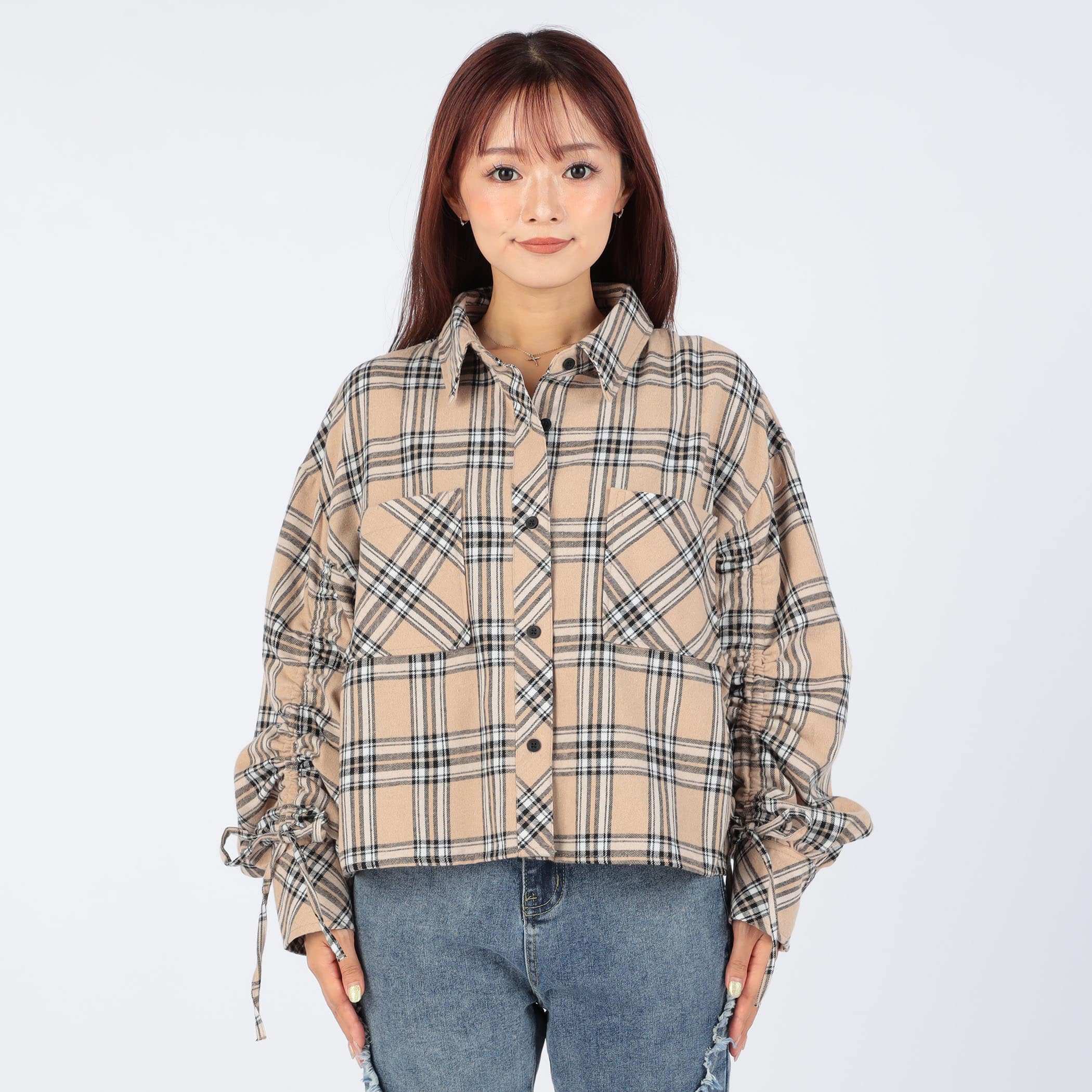 スタイルアップを叶えるクロップド丈のチェックシャツに、ドロストデザインをプラスしたトレンドライクなアイテム。袖のギャザーが華やかな印象を持たせてくれて、コーディネートの主役になる一枚です。ゆったりした身幅も今っぽく、カジュアルにデニムと合わせるのはもちろん、ショートパンツやミニスカートを合わせた韓国風スタイルもオススメです。