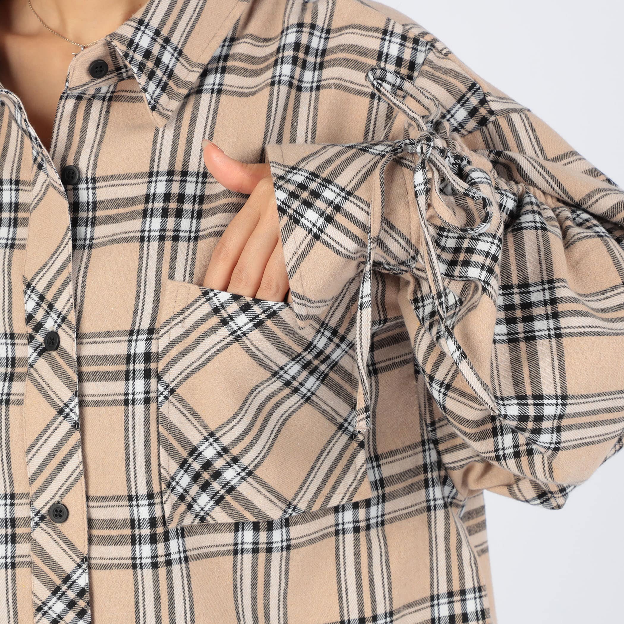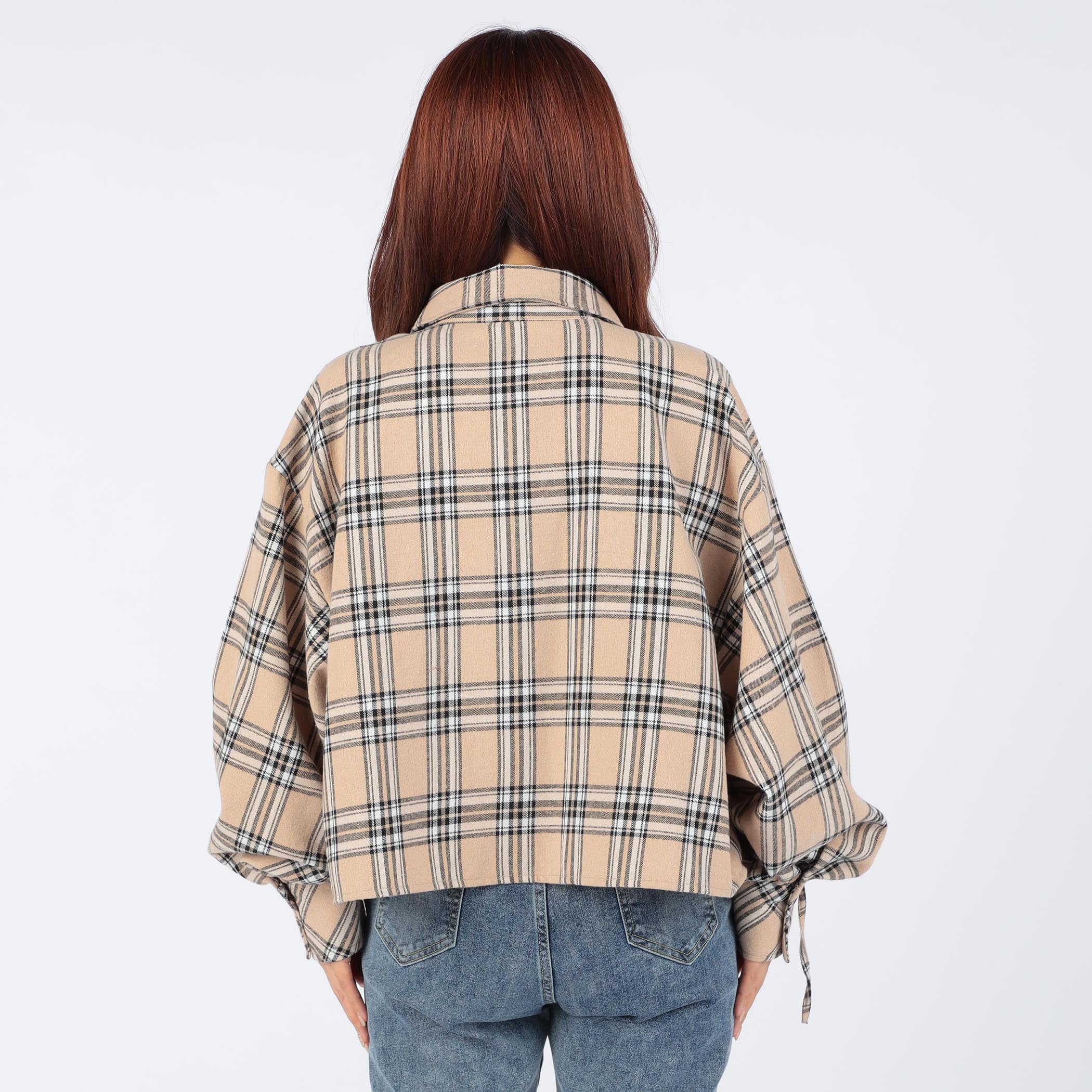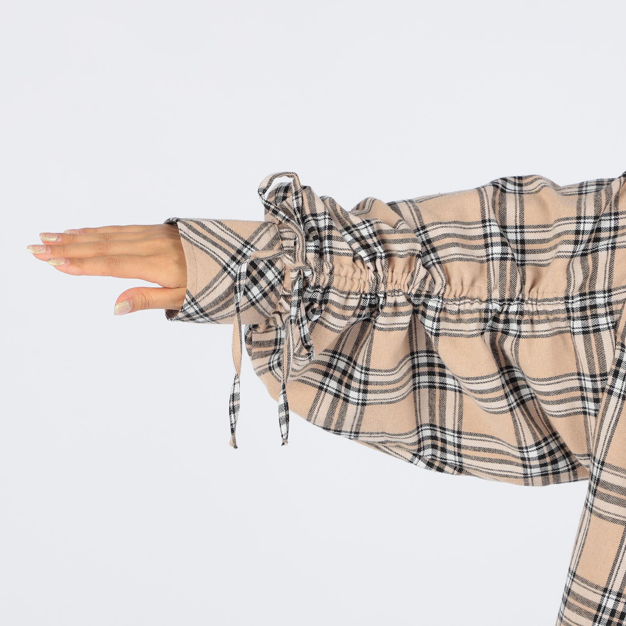 スタイルアップを叶えるクロップド丈のチェックシャツに、ドロストデザインをプラスしたトレンドライクなアイテム。袖のギャザーが華やかな印象を持たせてくれて、コーディネートの主役になる一枚です。ゆったりした身幅も今っぽく、カジュアルにデニムと合わせるのはもちろん、ショートパンツやミニスカートを合わせた韓国風スタイルもオススメです。