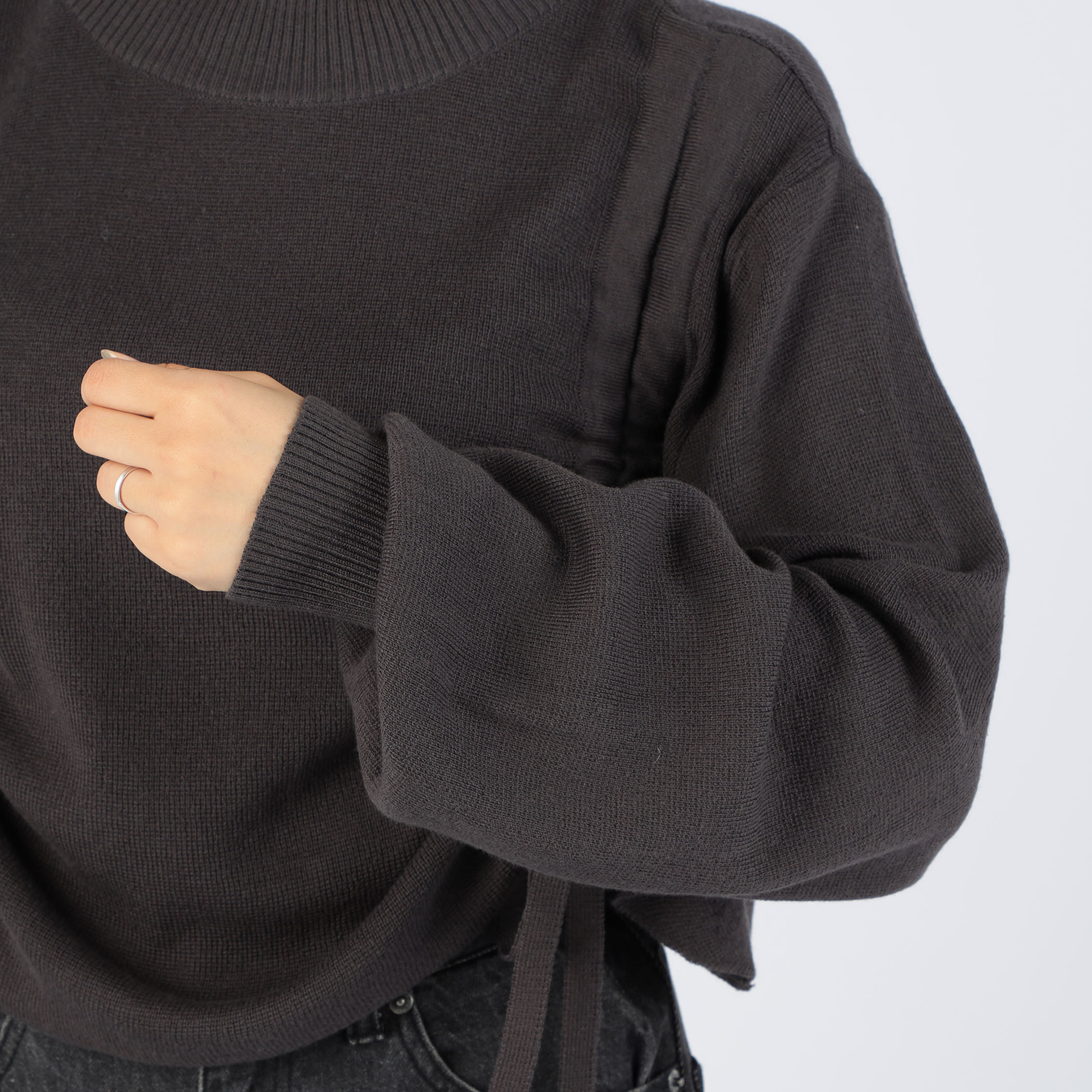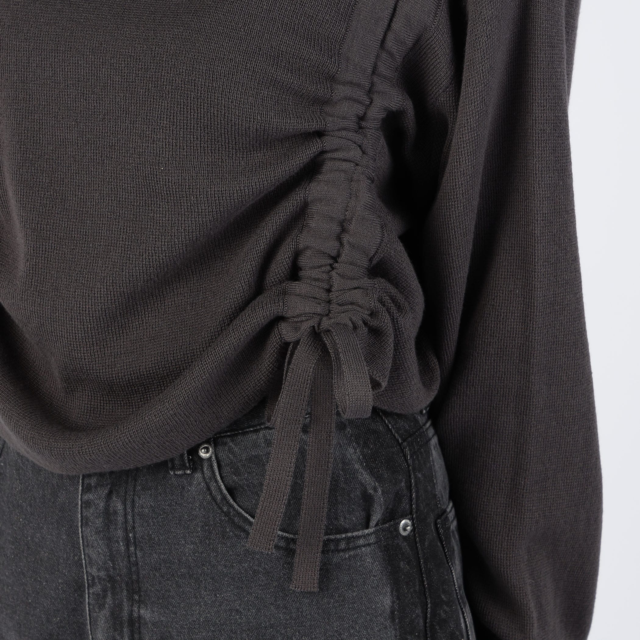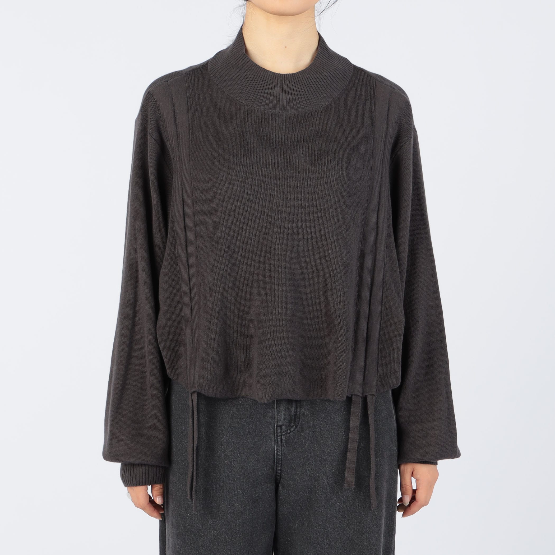 様々なコーデに合わせられる万能なニット。ドロストの紐を調整すれば長さやボリュームのアレンジができます。ボトムスも選ばずカジュアルでもモードでもテイスト問わず使えるアイテムなので、ワードローブに加えたい1着です。