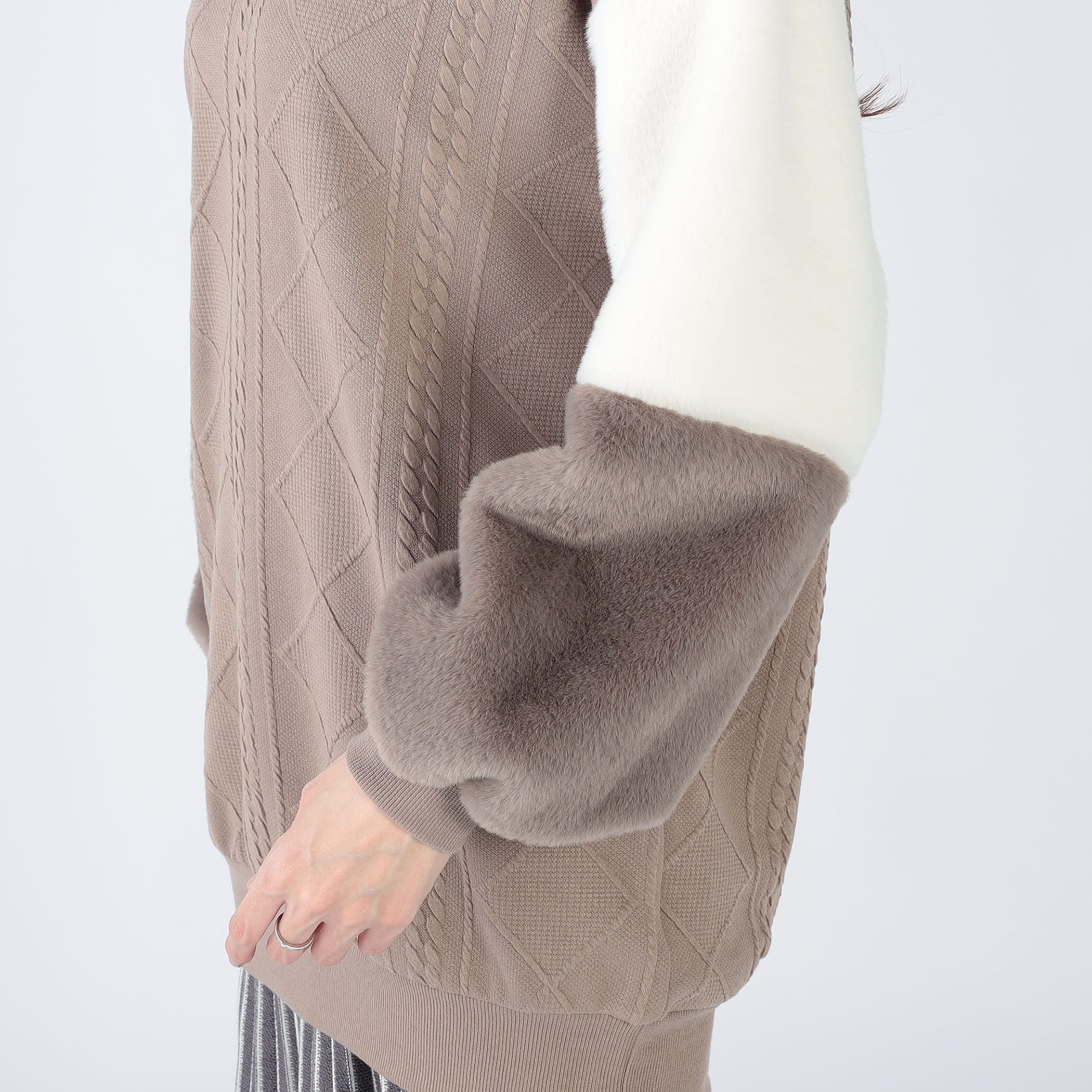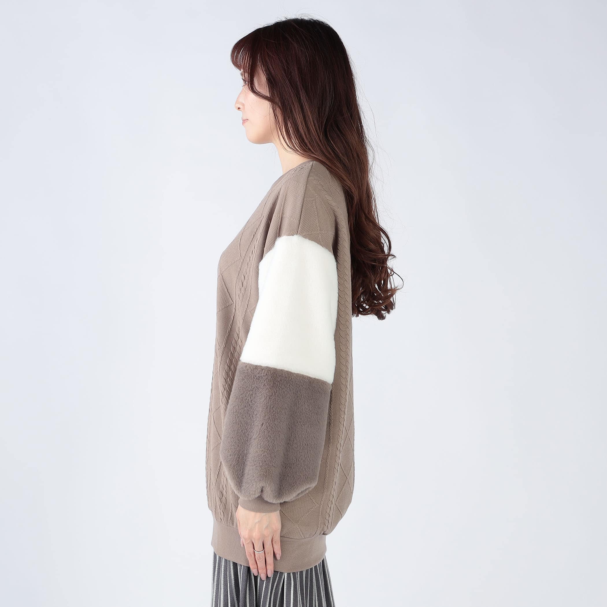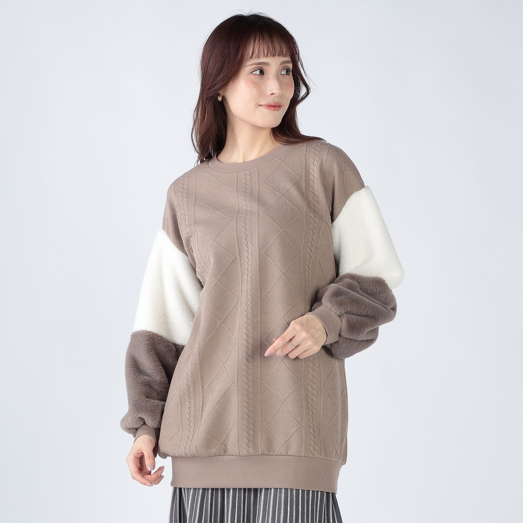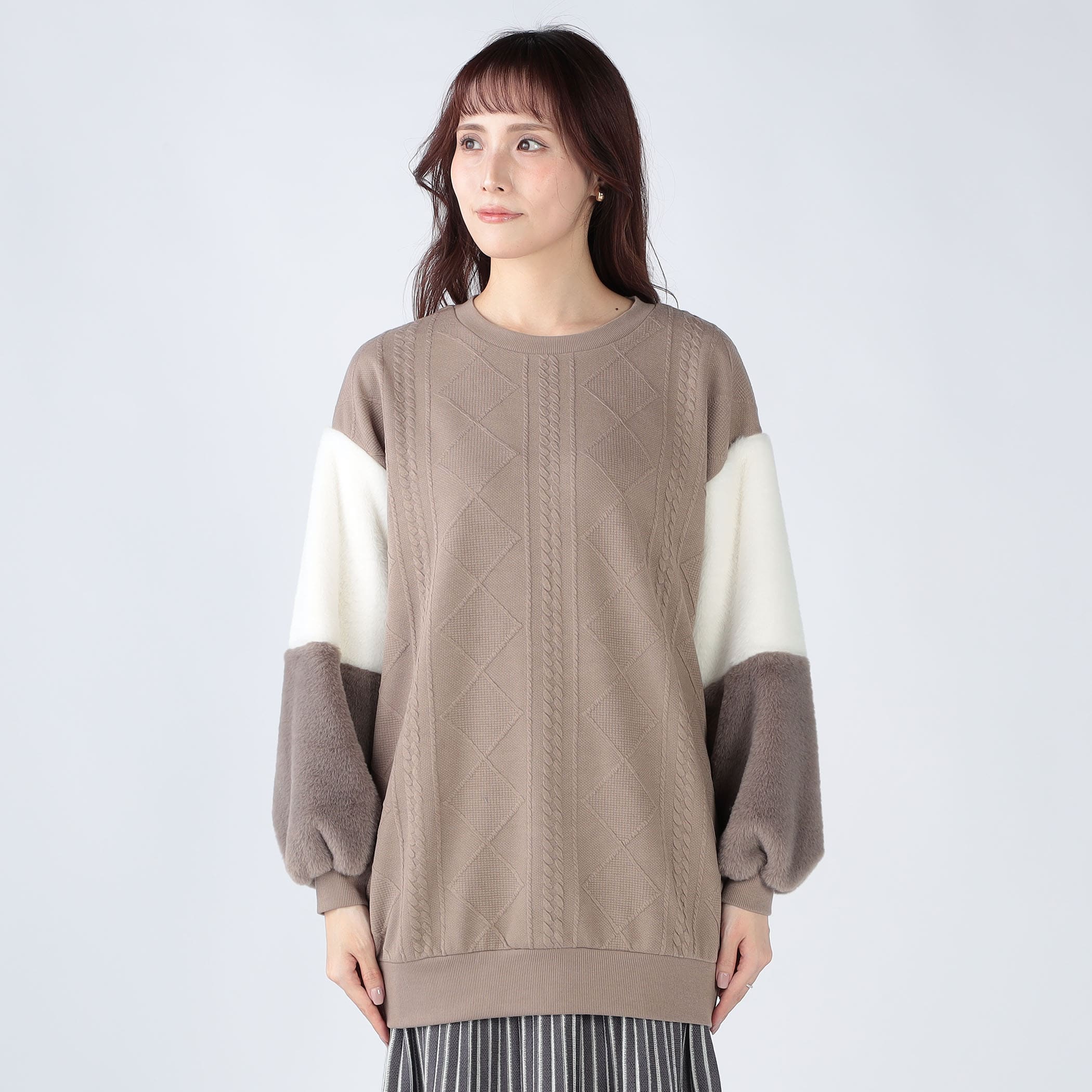 ボリューム感ある袖ファー切り替えが可愛い、裾リブプルオーバー。身頃部分がさりげなくケーブル柄になっており見た目にも暖かみのある1着です。おしりの隠れる丈感で体形カバー効果も◎