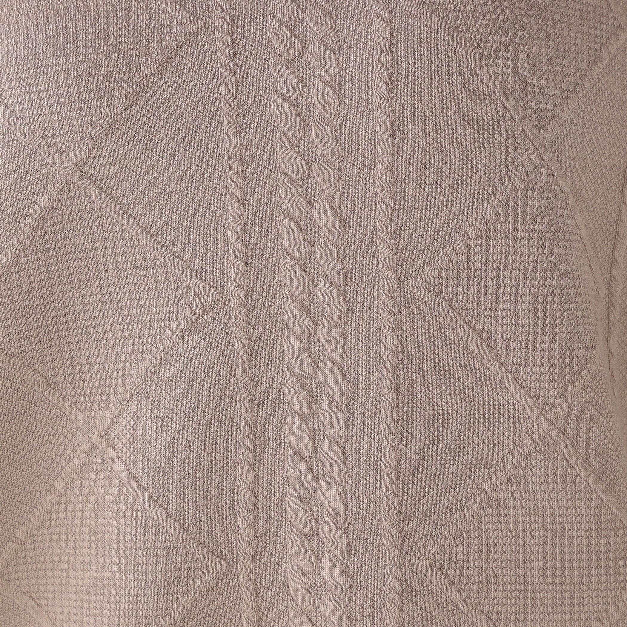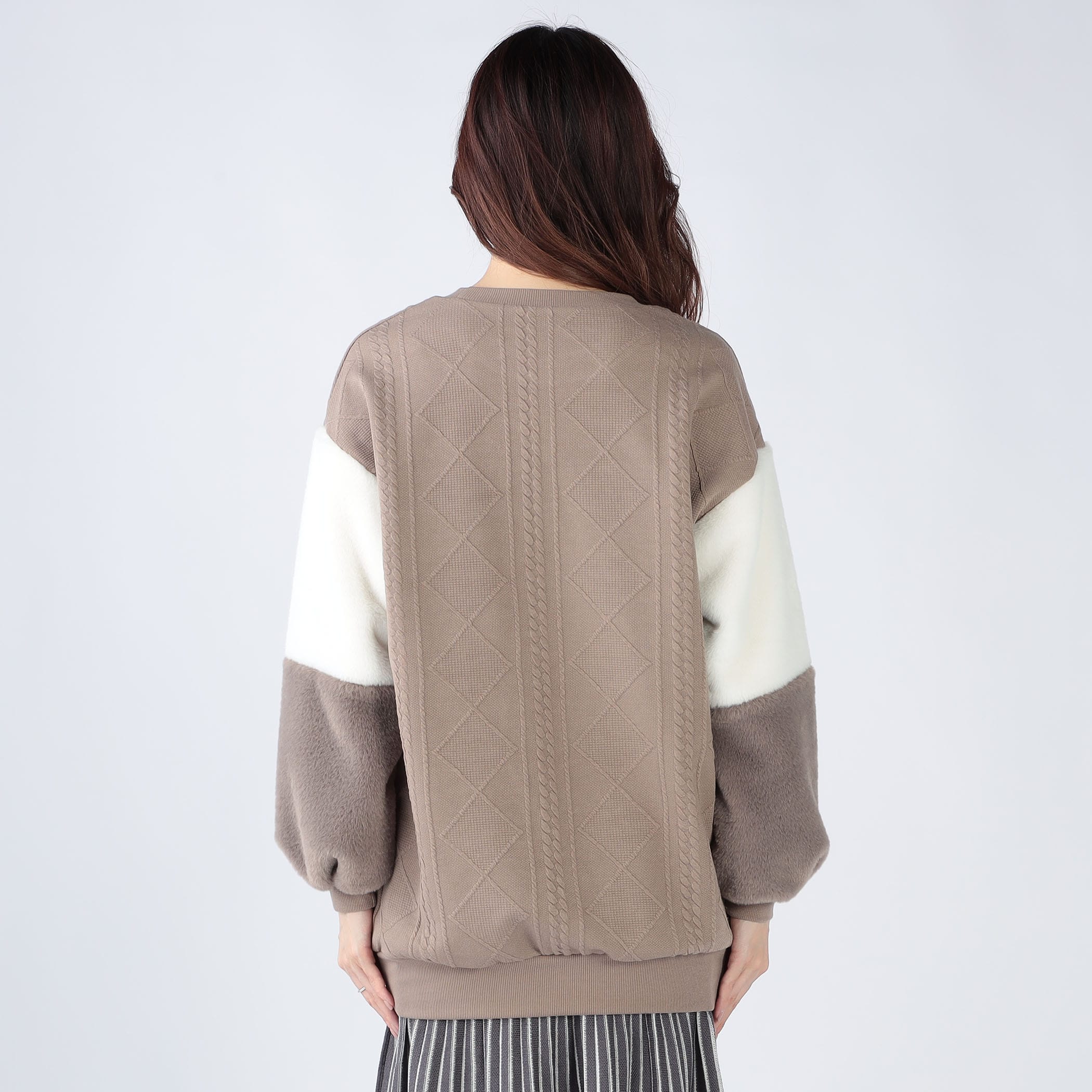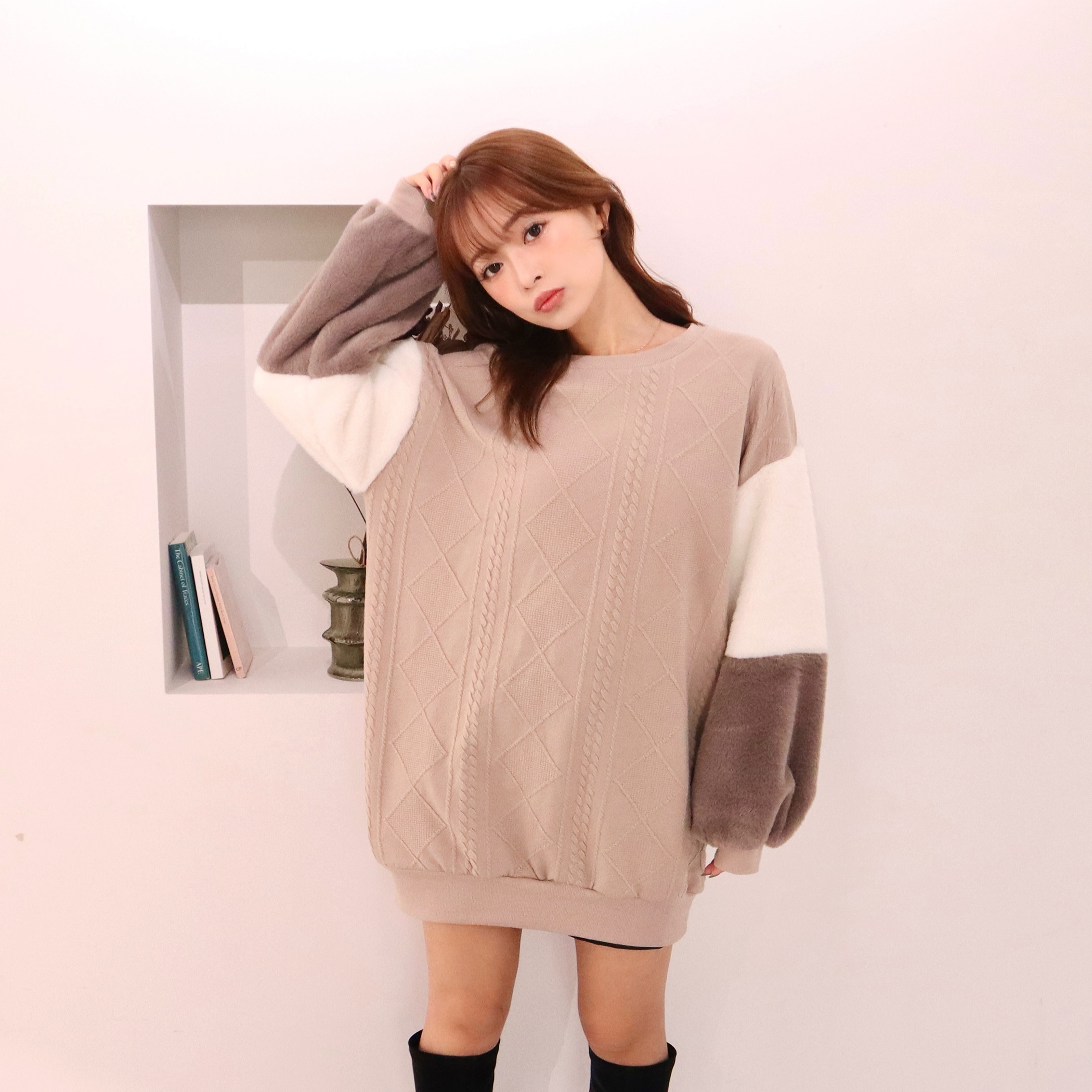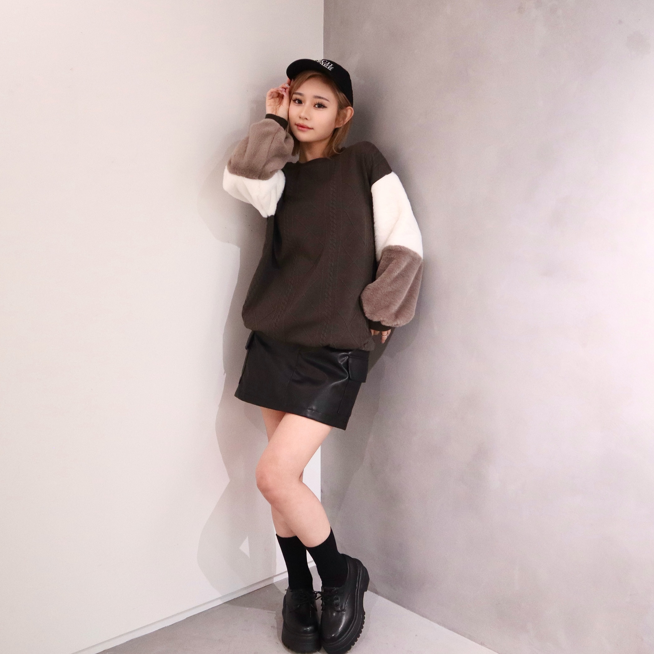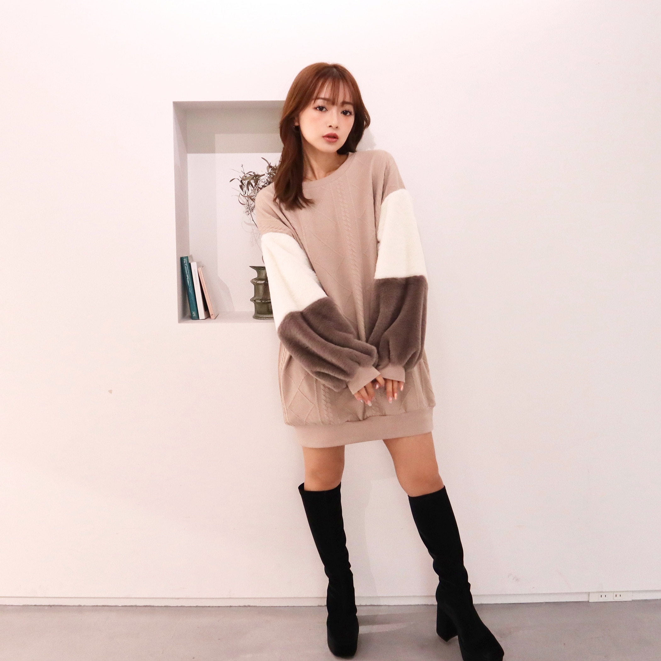 ボリューム感ある袖ファー切り替えが可愛い、裾リブプルオーバー。身頃部分がさりげなくケーブル柄になっており見た目にも暖かみのある1着です。おしりの隠れる丈感で体形カバー効果も◎
