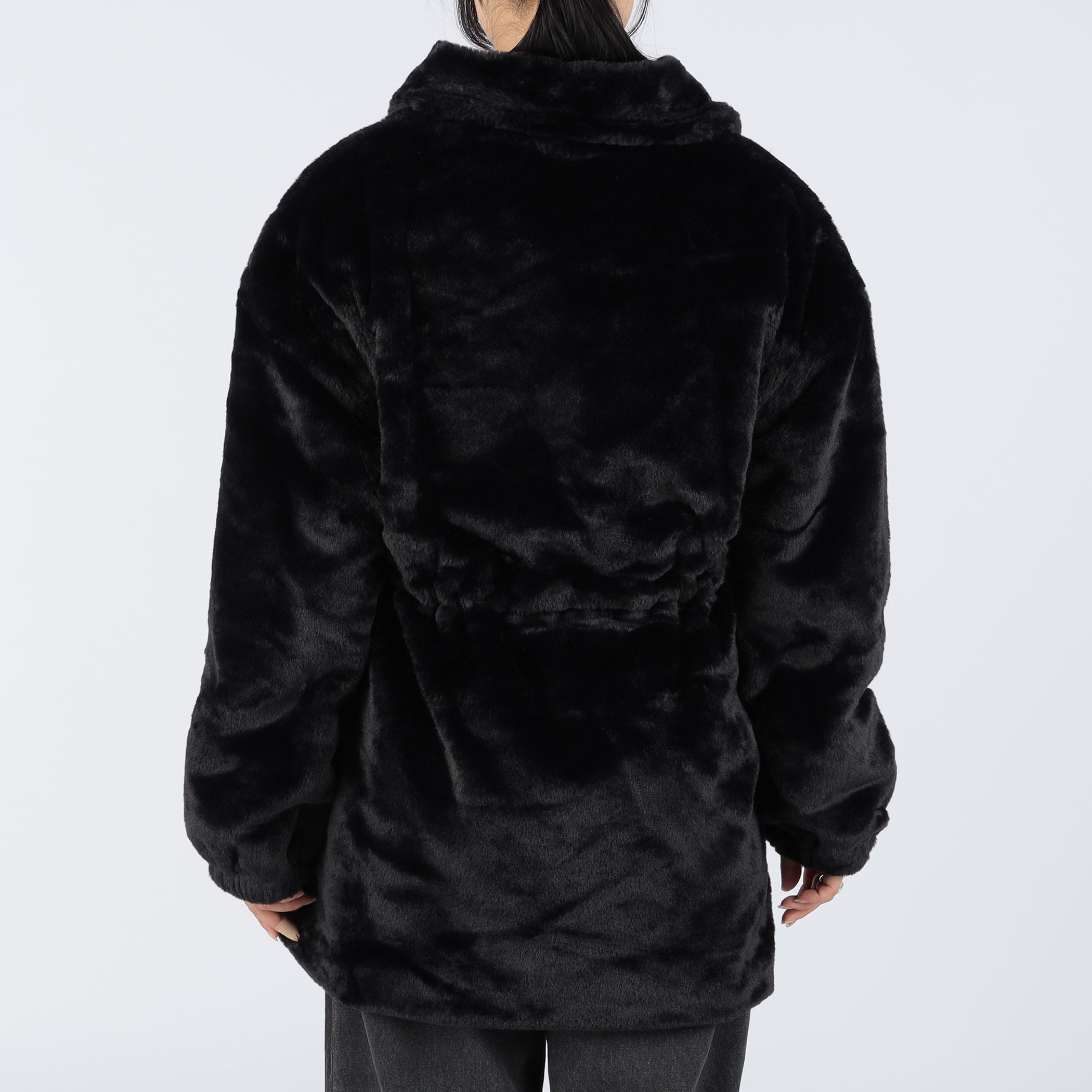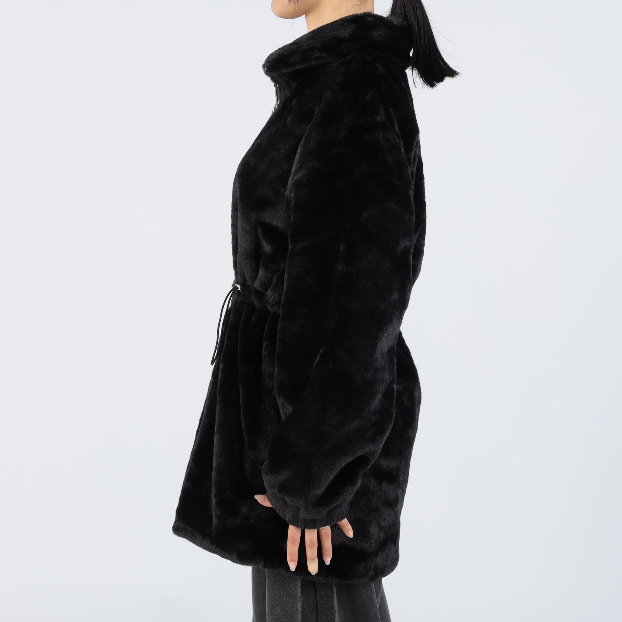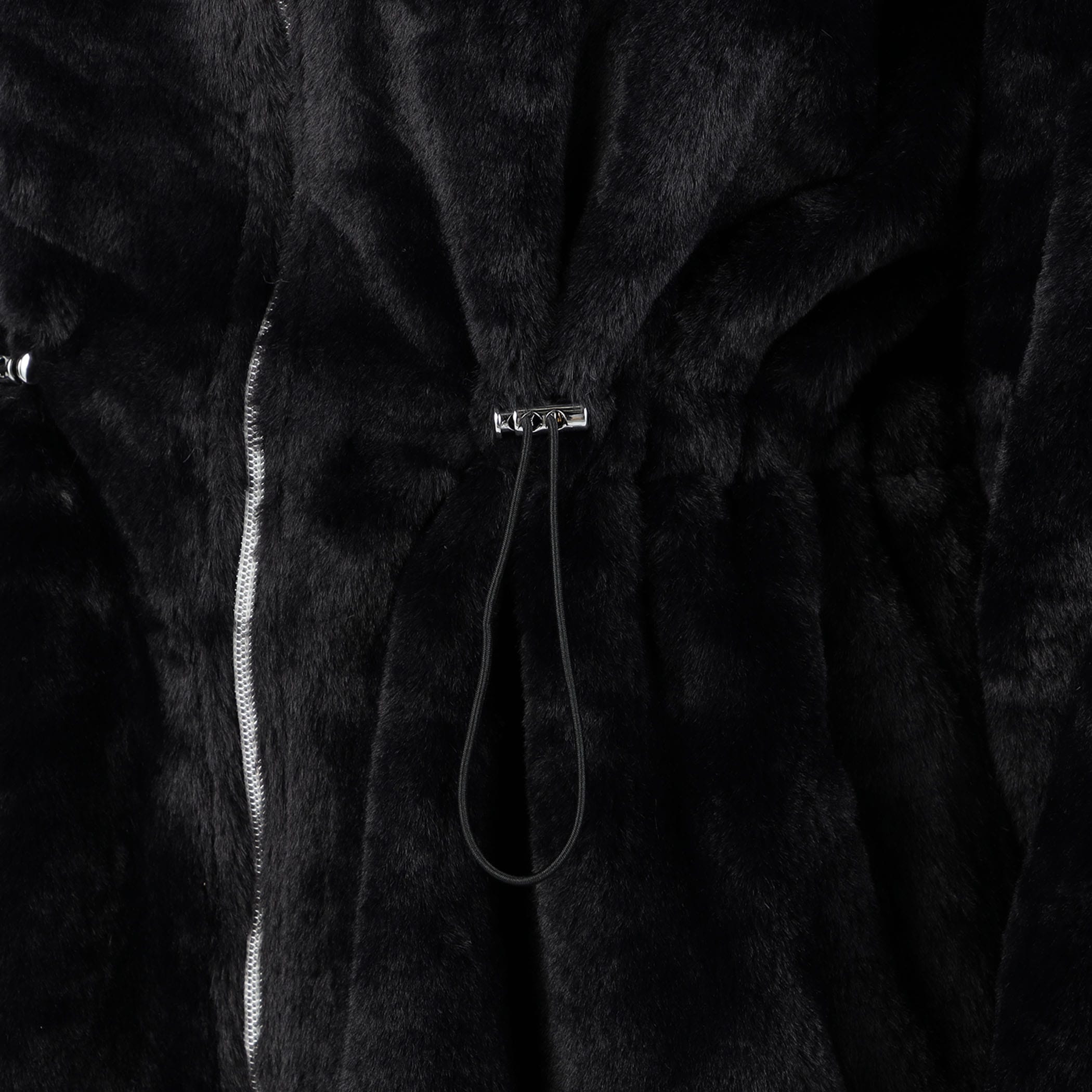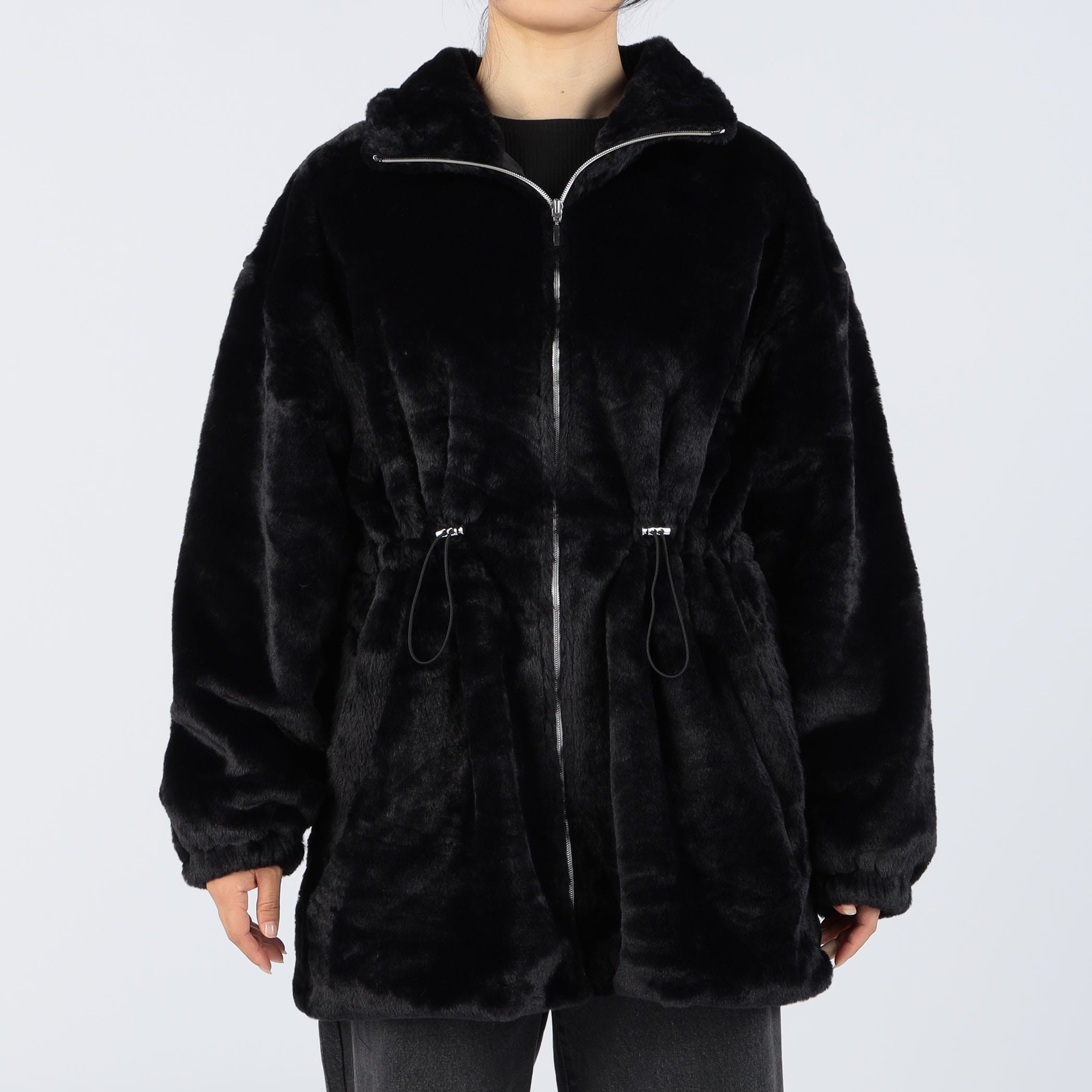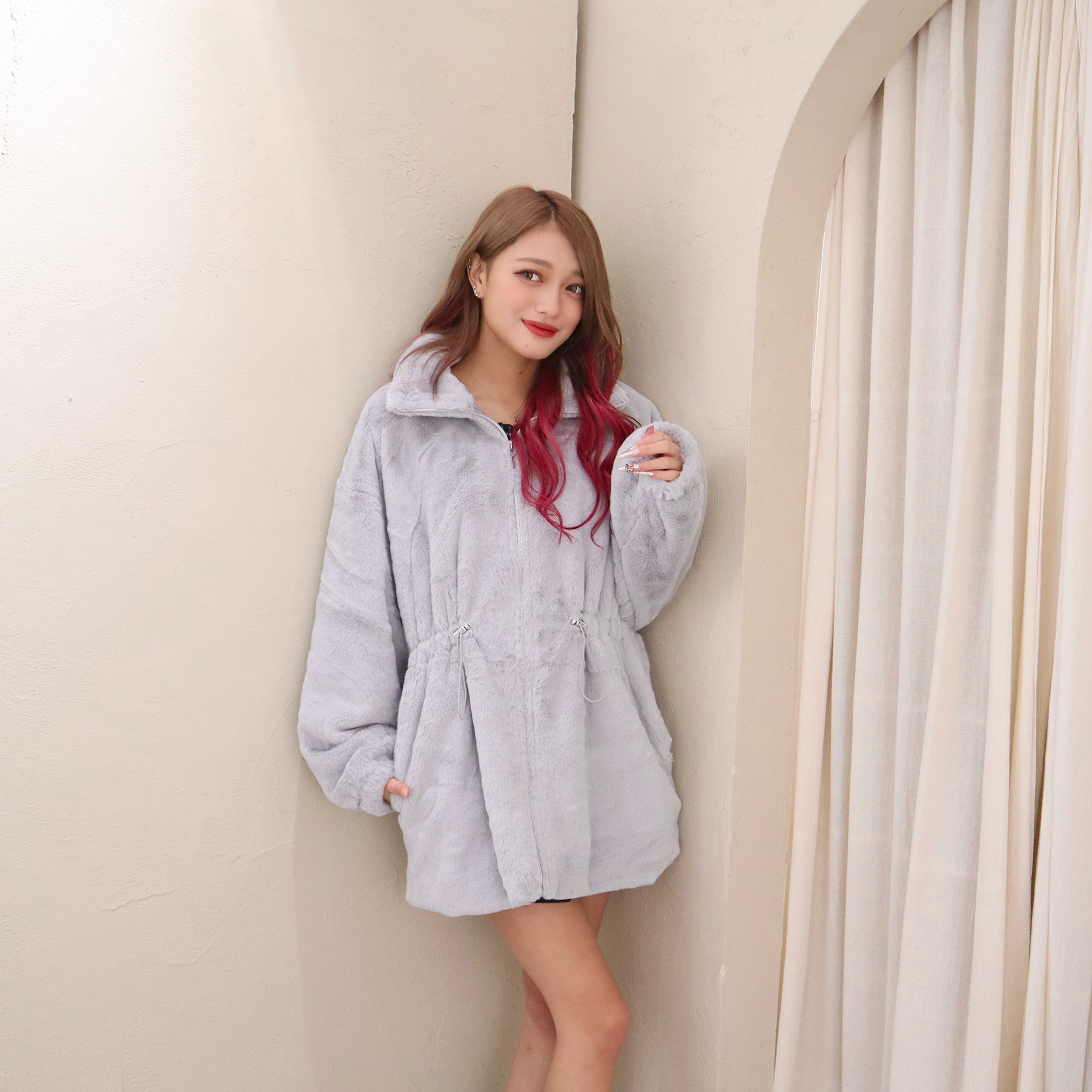 手触りのよいふわふわのフェイクファーに、ウエストにトレンドのドロストデザインを施したファーアウター。ドロストの具合でお好みのシルエットに調整でき、ご自身の体系にも合わせやすく着用しやすいアイテムです。ワイドパンツやロングスカートと合わせると大人っぽく、ミニボトムと合わせるとガーリーな雰囲気を持たせてくれます。この冬活躍間違いなしのアウターです。