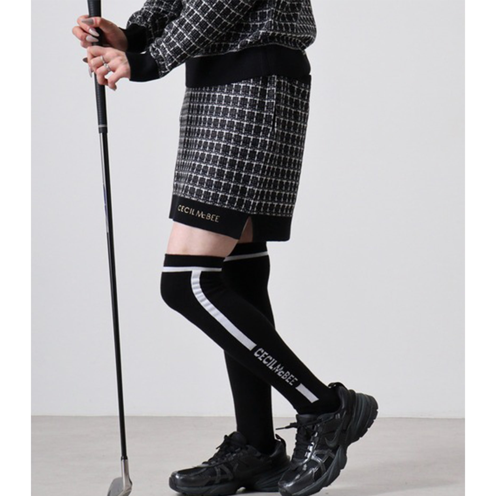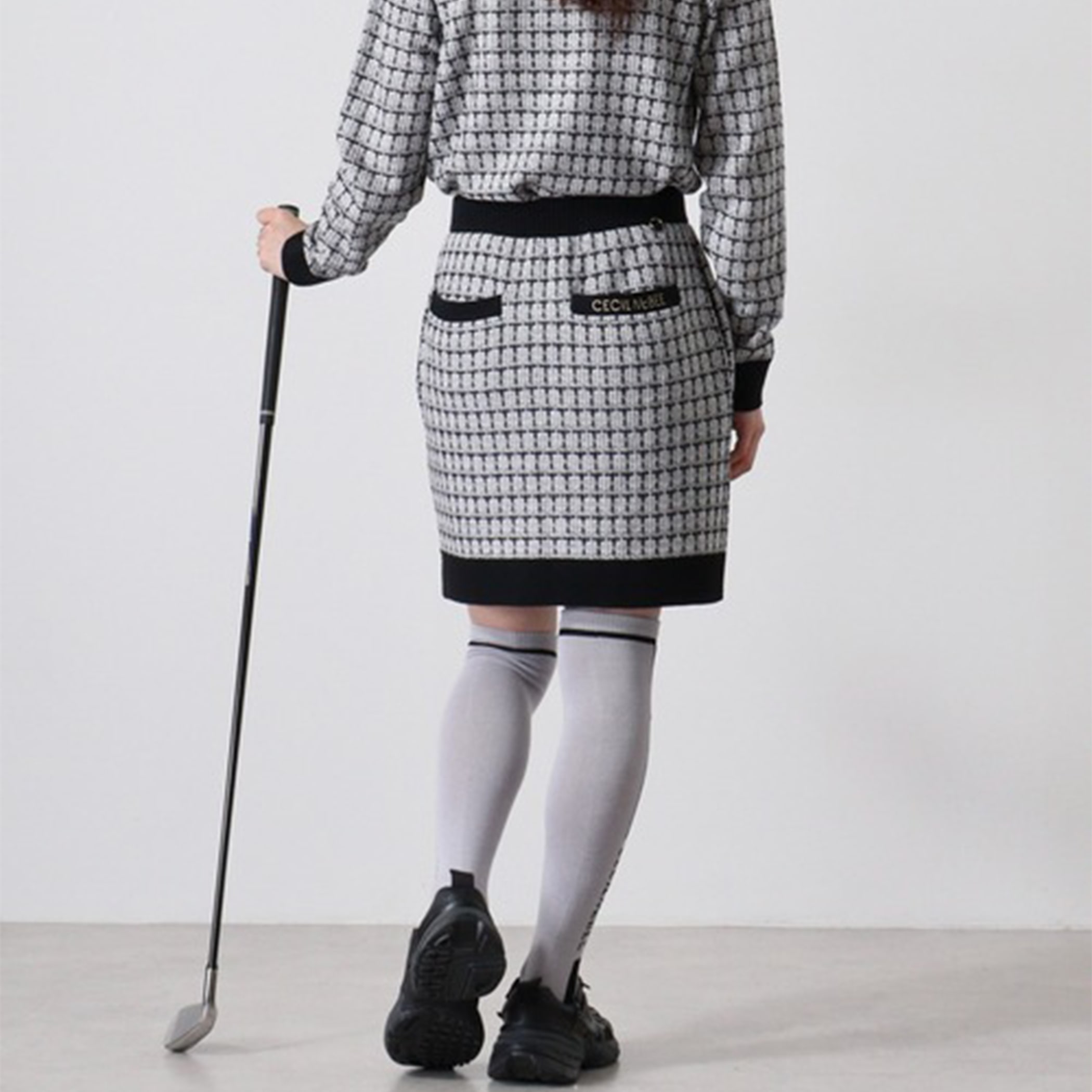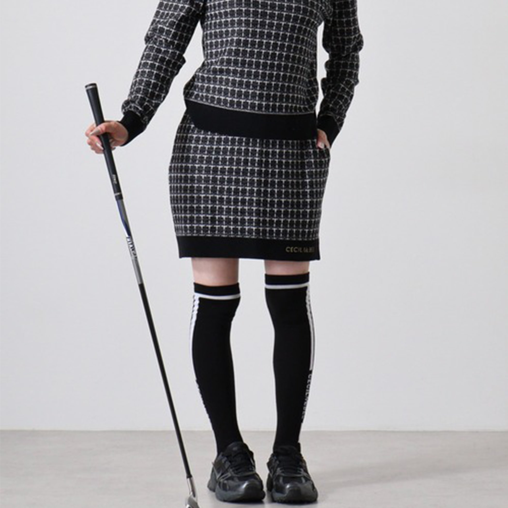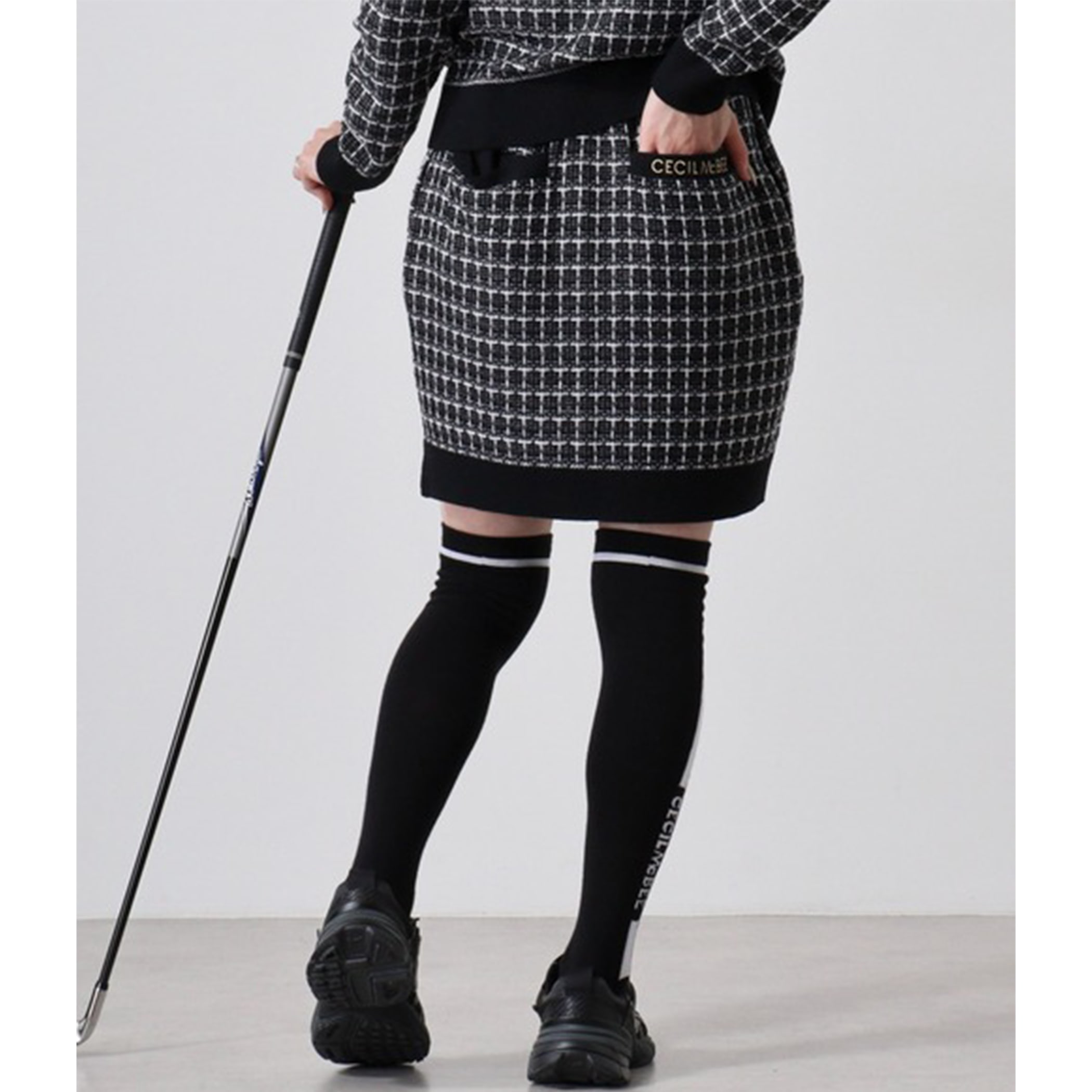 上品でクラシカルな雰囲気漂うツイードニットスカート。ウエスト部分にはゴムが練り込まれており、快適な着心地を提供してくれます。また紐も付いているので、プレー中も安心なのが嬉しい。ゴールドのロゴ刺繍が高級感を演出してくれます。ツイード素材の独特な風合いや編み目の凝ったデザインがおしゃれな大人の女性にぴったりです。