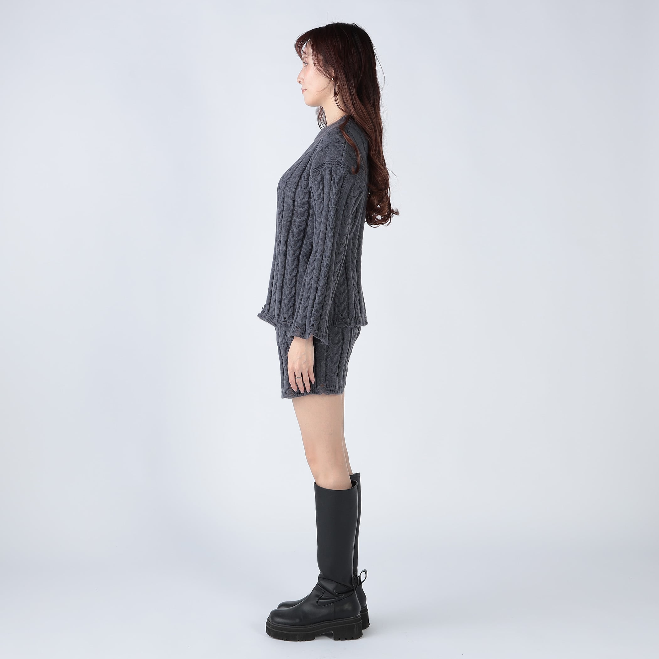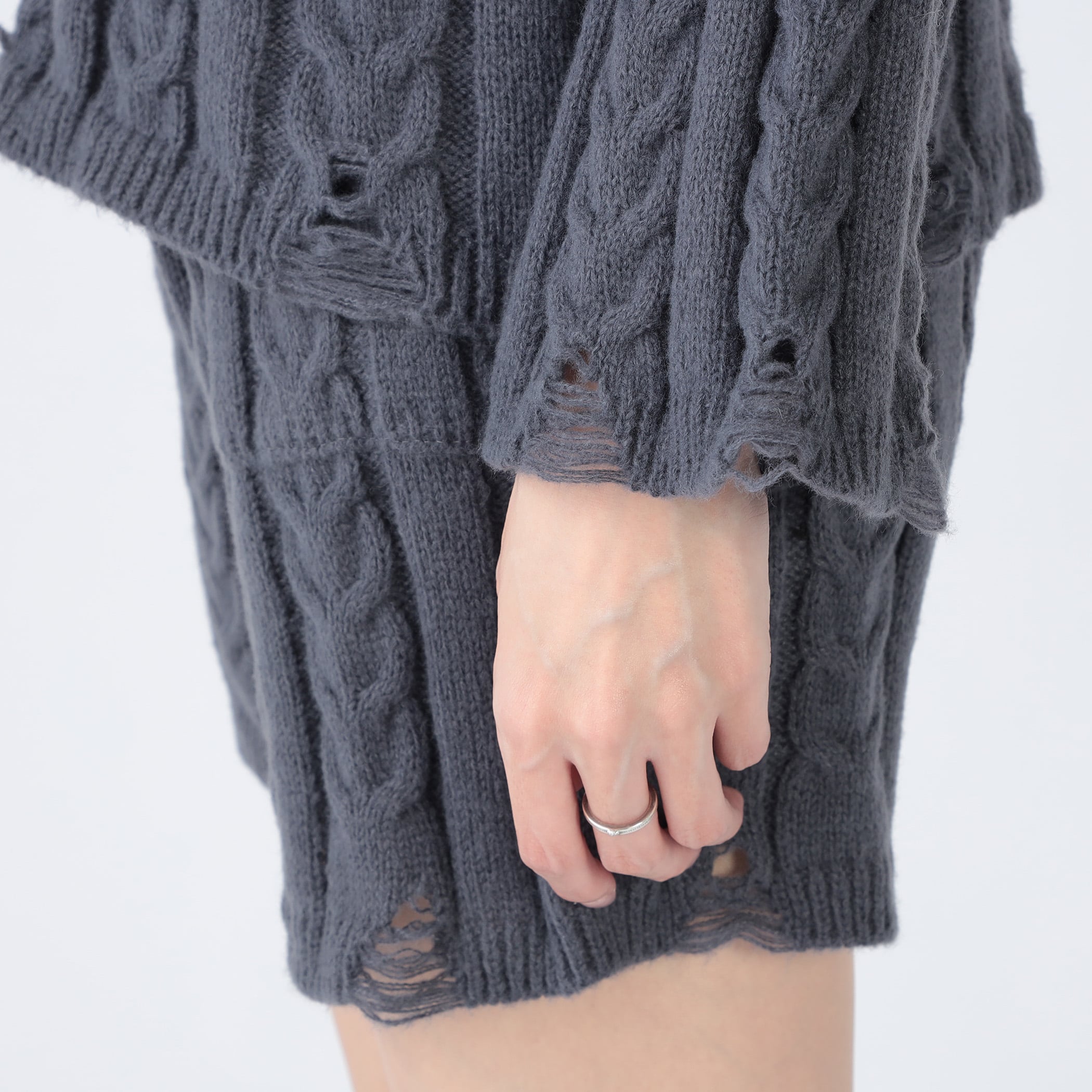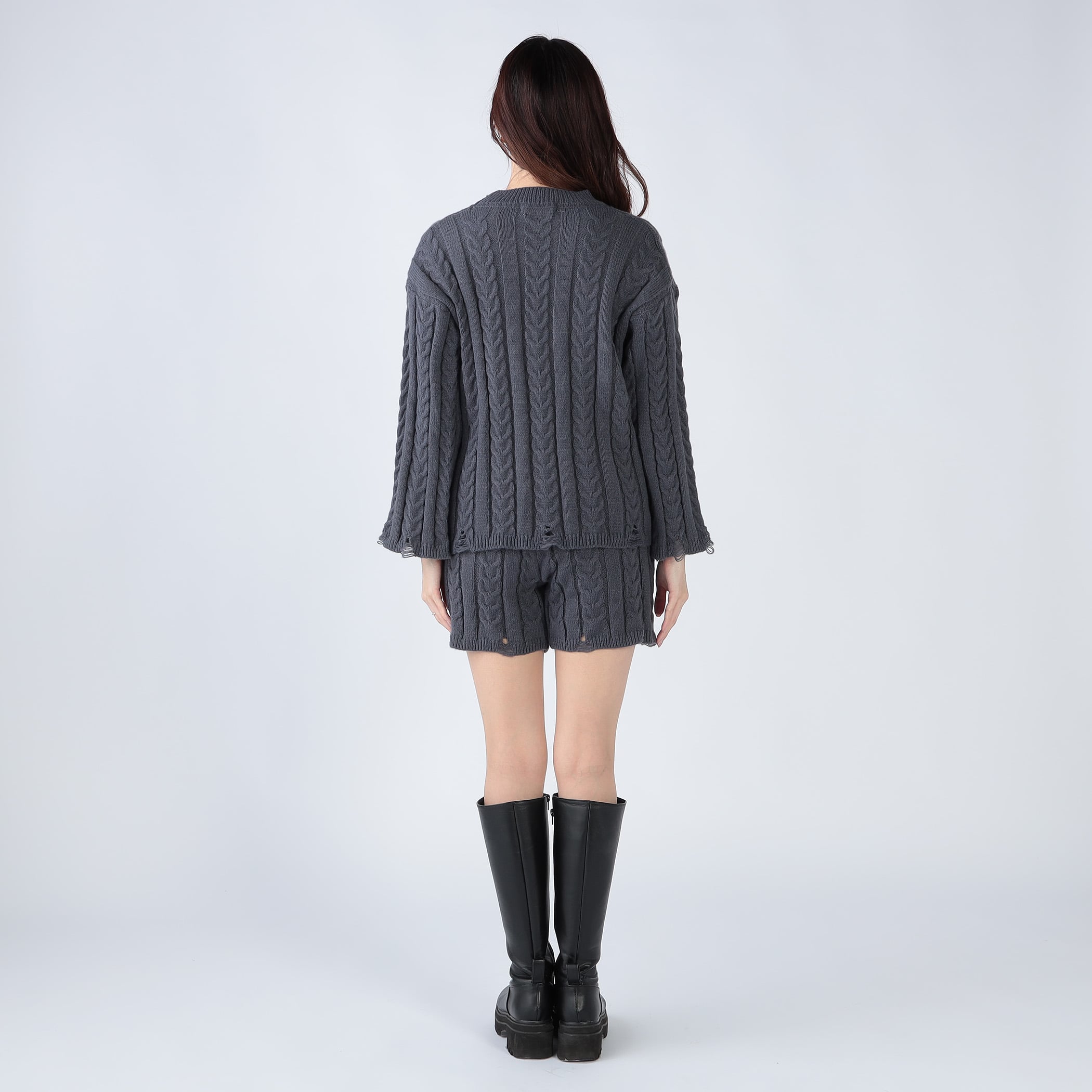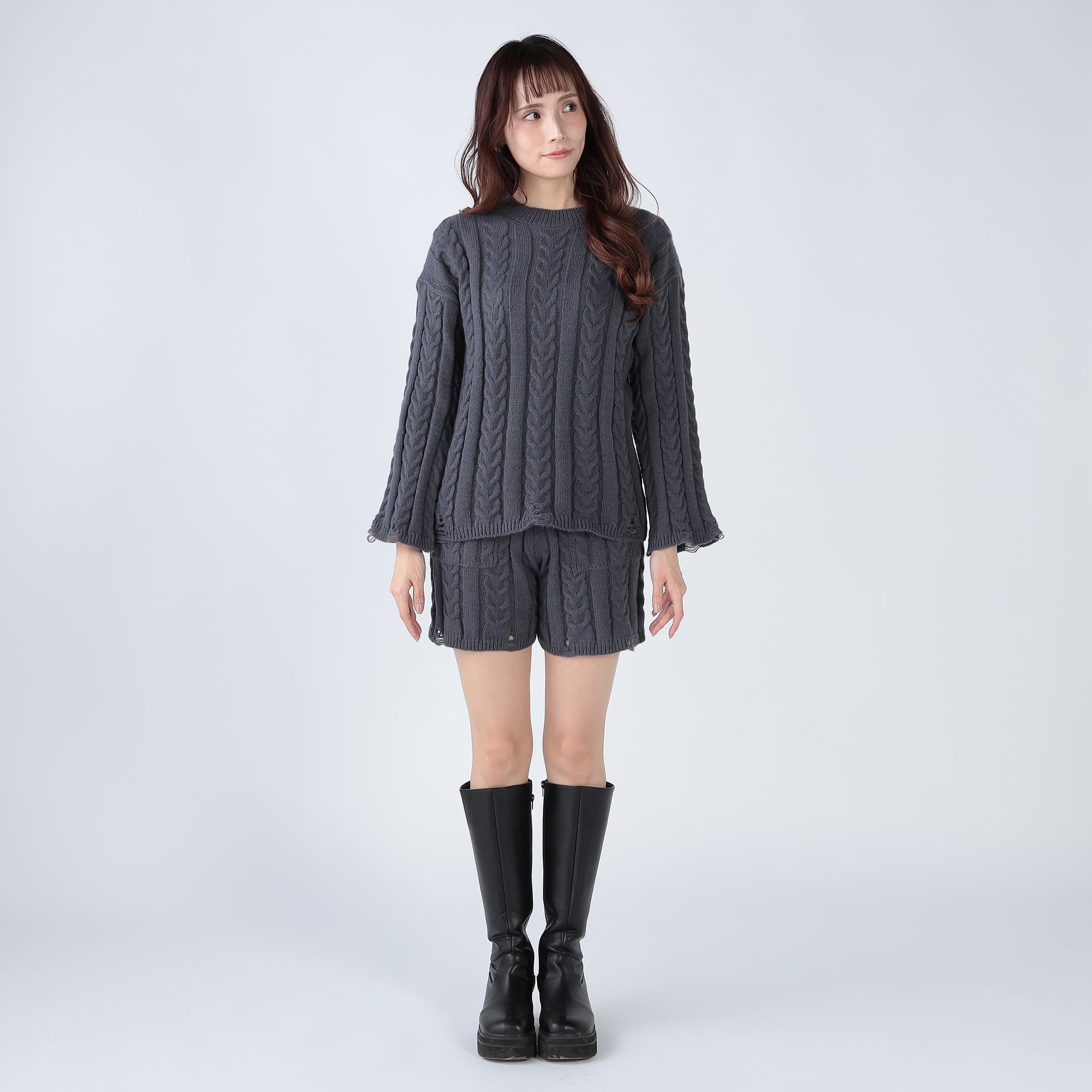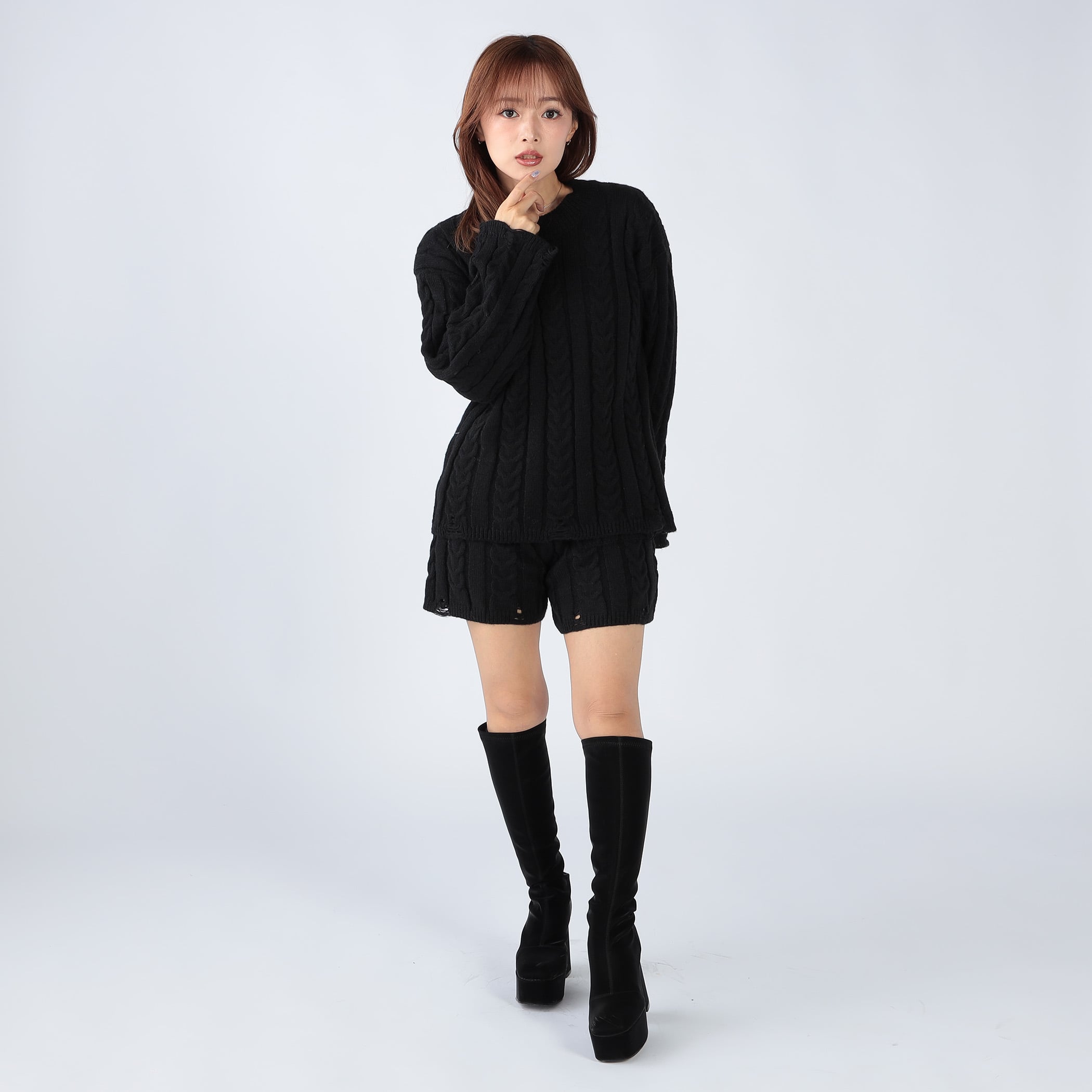 暖かみのあるケーブル編ニットトップス&ショートパンツのセットアップ。