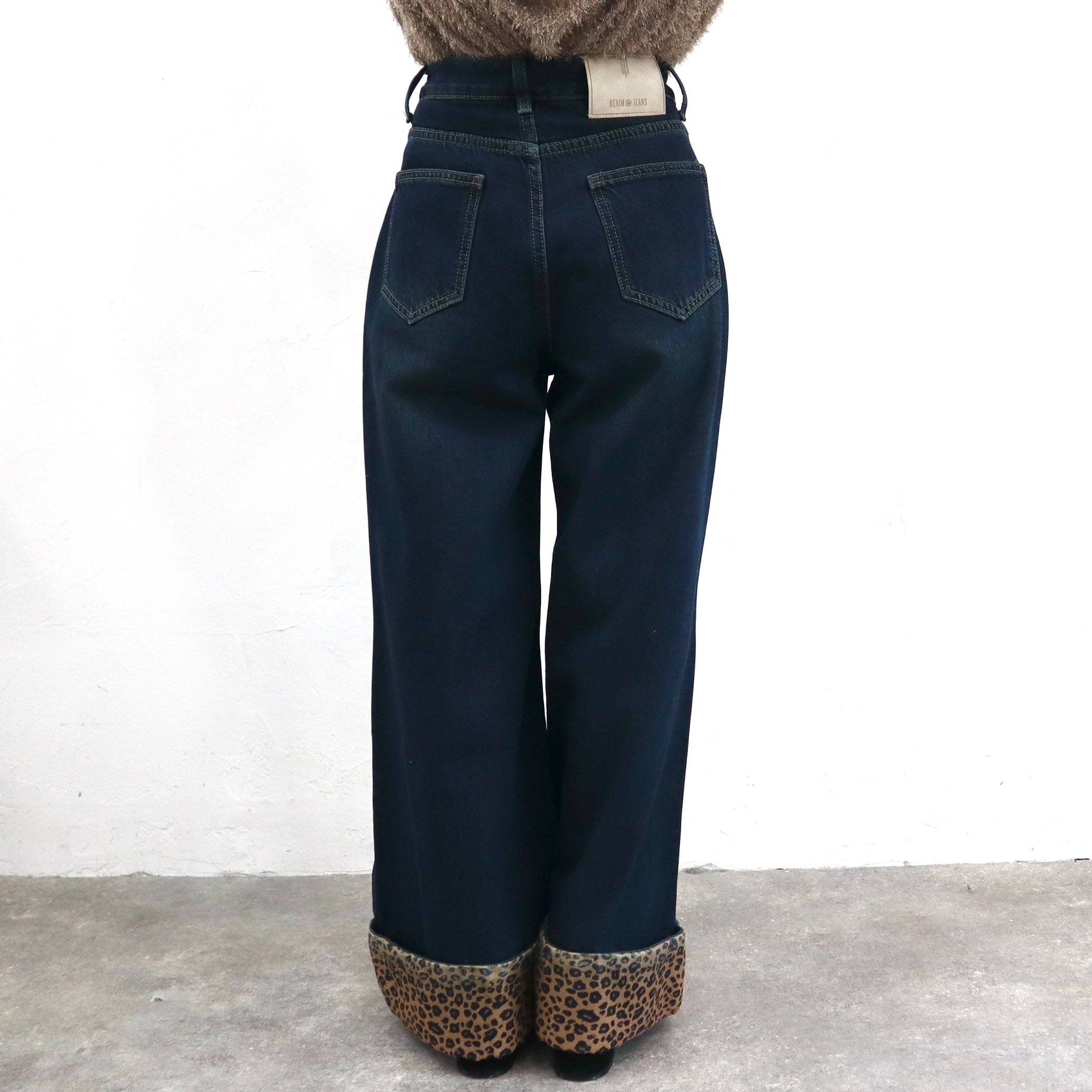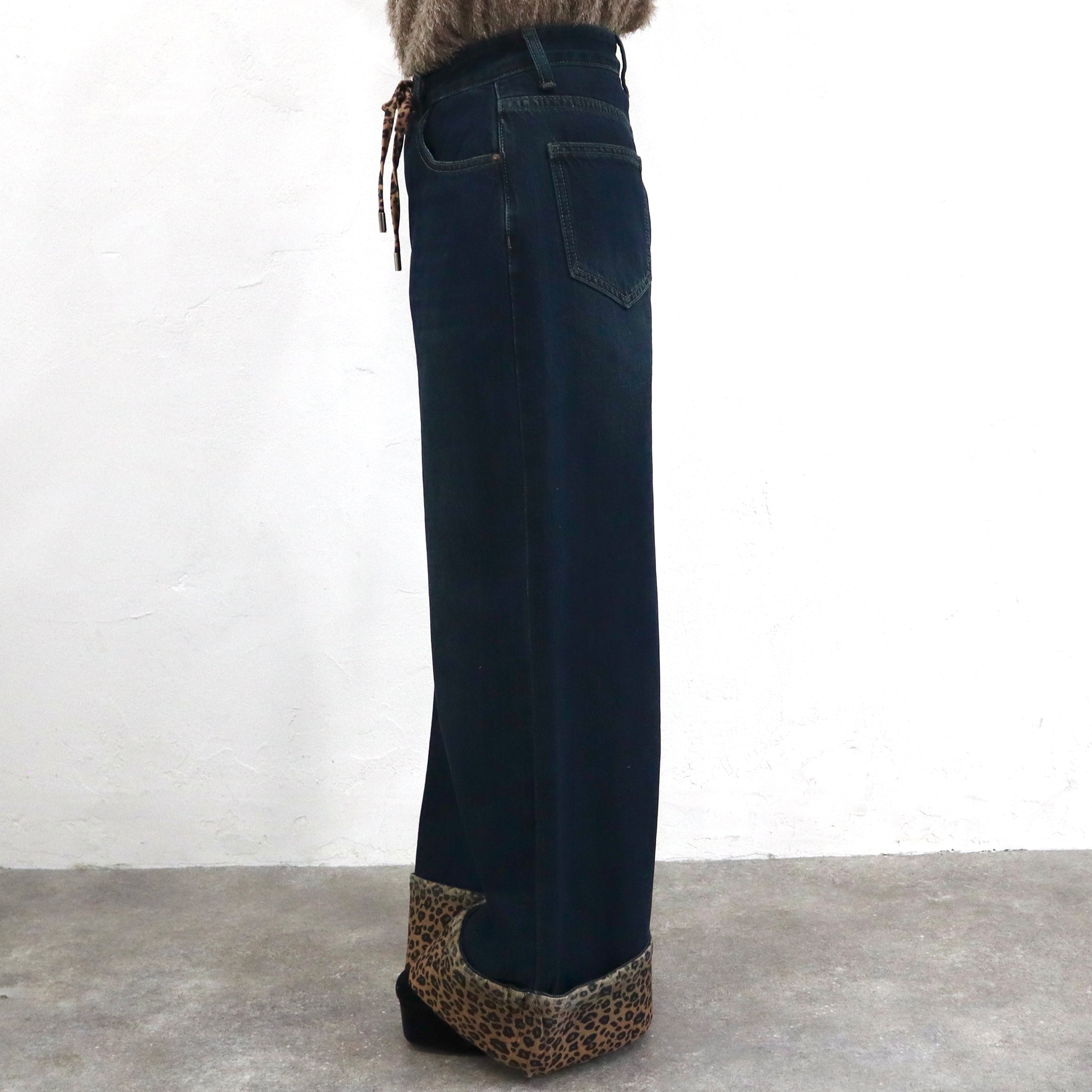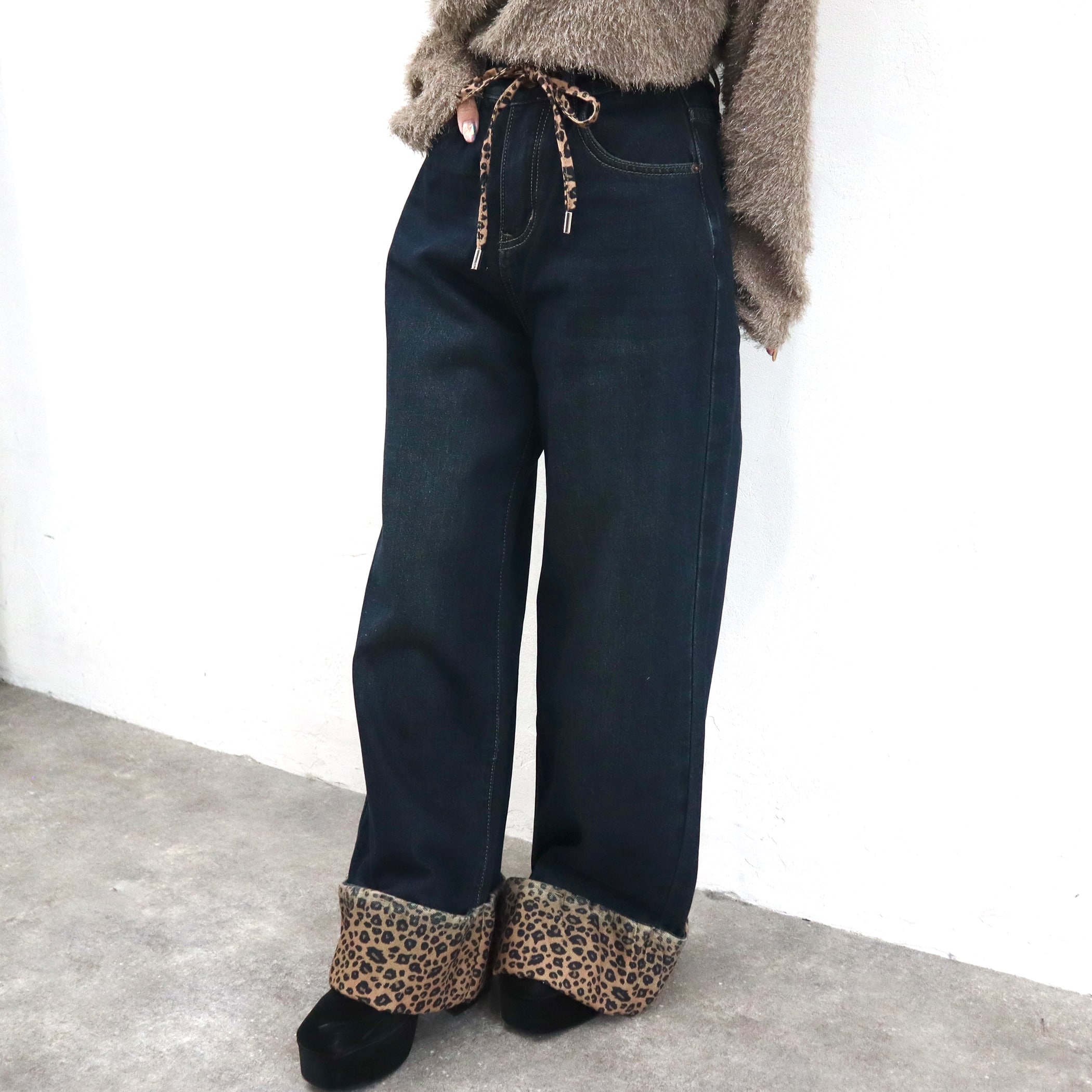 秋冬トレンドのレオパード柄がロールアップ部分に切り替えられたデニムパンツ。一枚持ってるだけでトレンドコーデが完成します。ルーズシルエットとローライズデザインでクロップド丈のトップスはもちろんのことスウェットやビッグTなどとも相性抜群。Y2Kファッション、ストリートコーデカジュアルスタイルなど様々なファッションジャンルで活躍します。