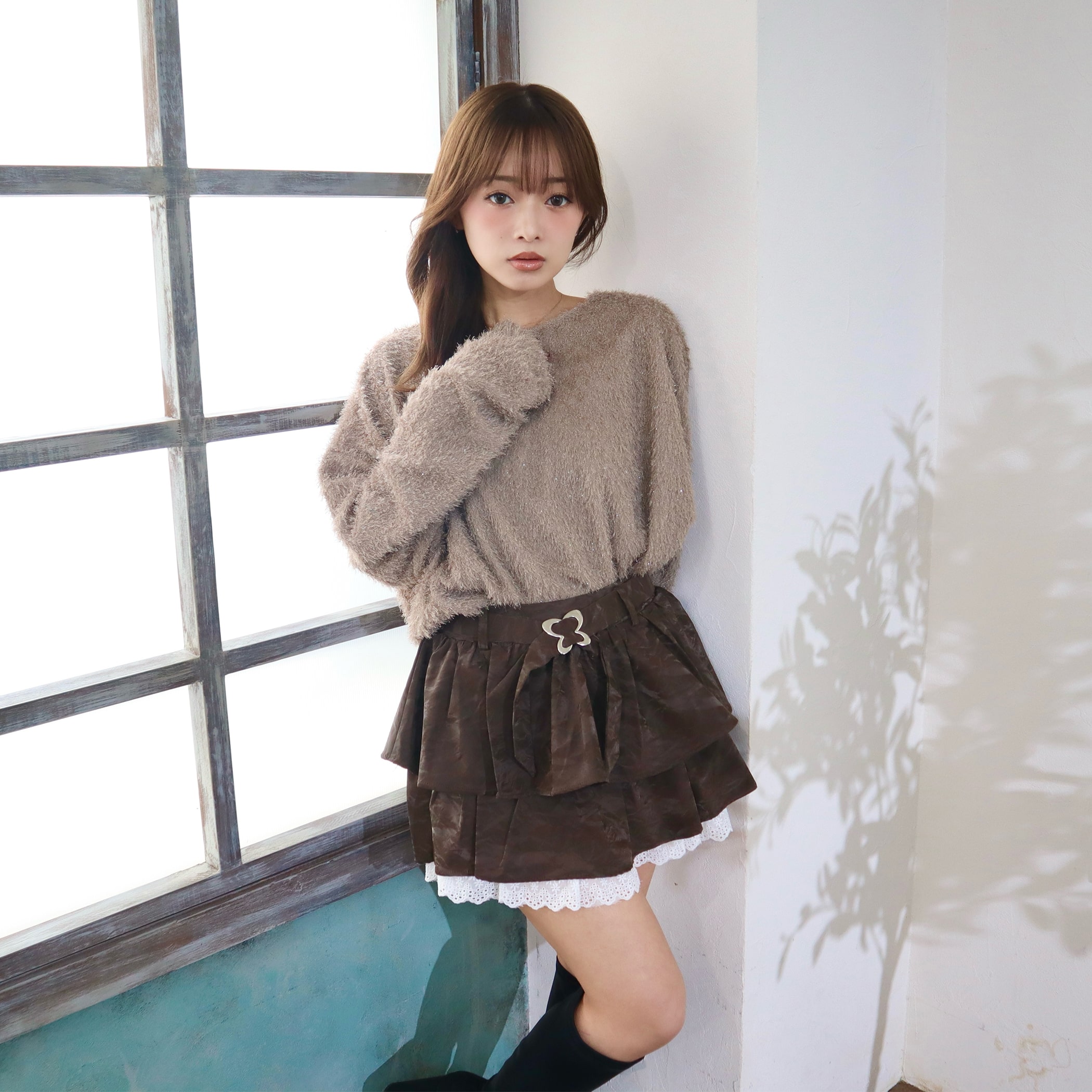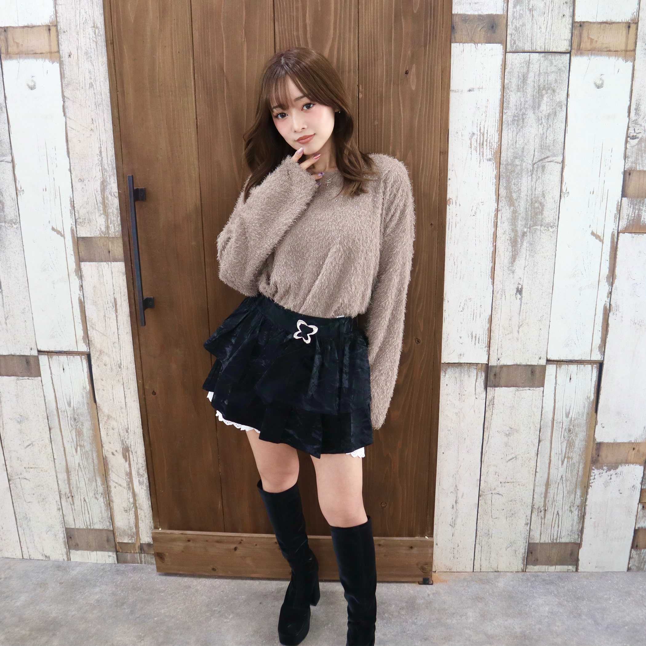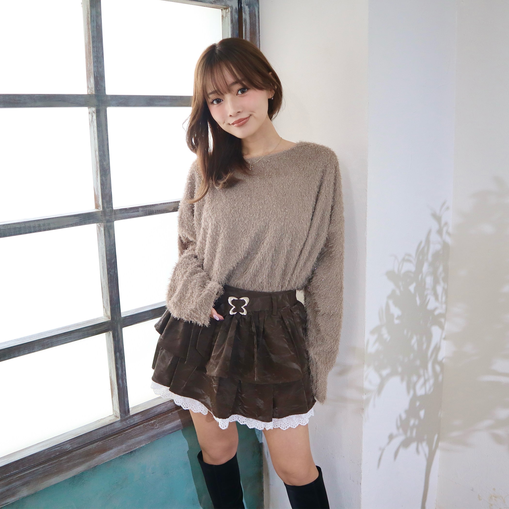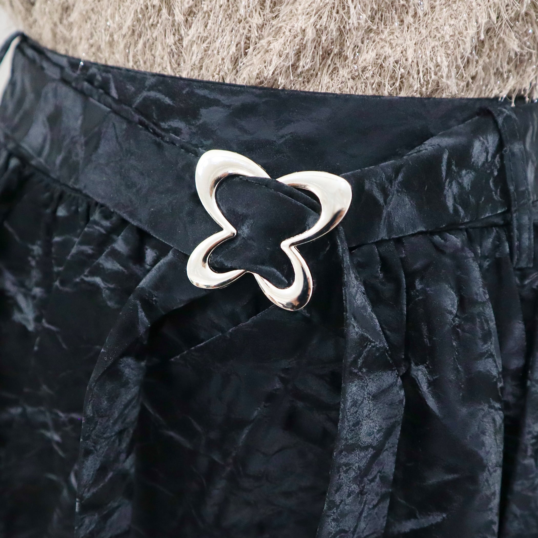 スカパンデザインでミニ丈でも安心◎ティアード広がりすぎずすっきりしたシルエットで履いていただけます。脚が綺麗に見える絶妙な丈感も嬉しいポイント。バタフライデザインのバックルが目を惹く1枚。