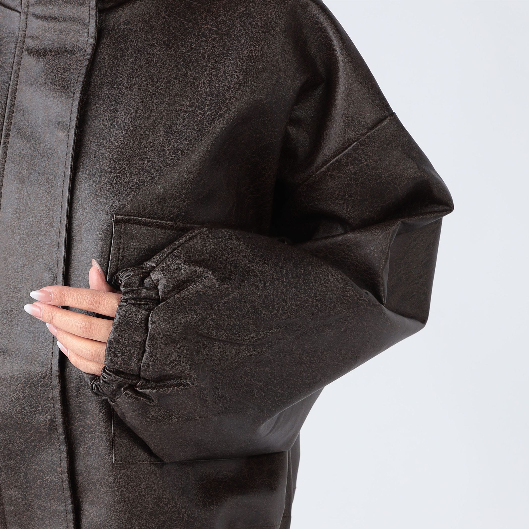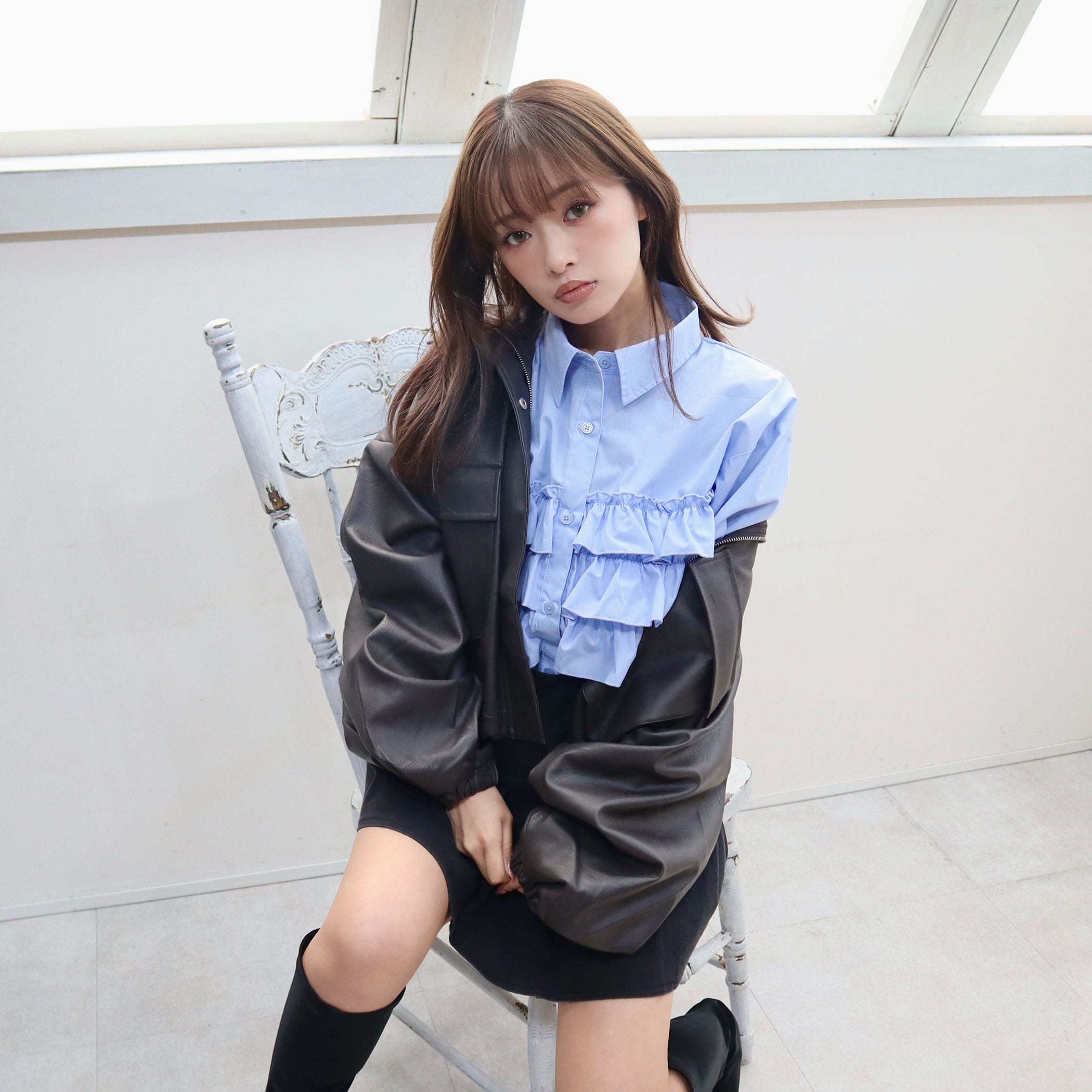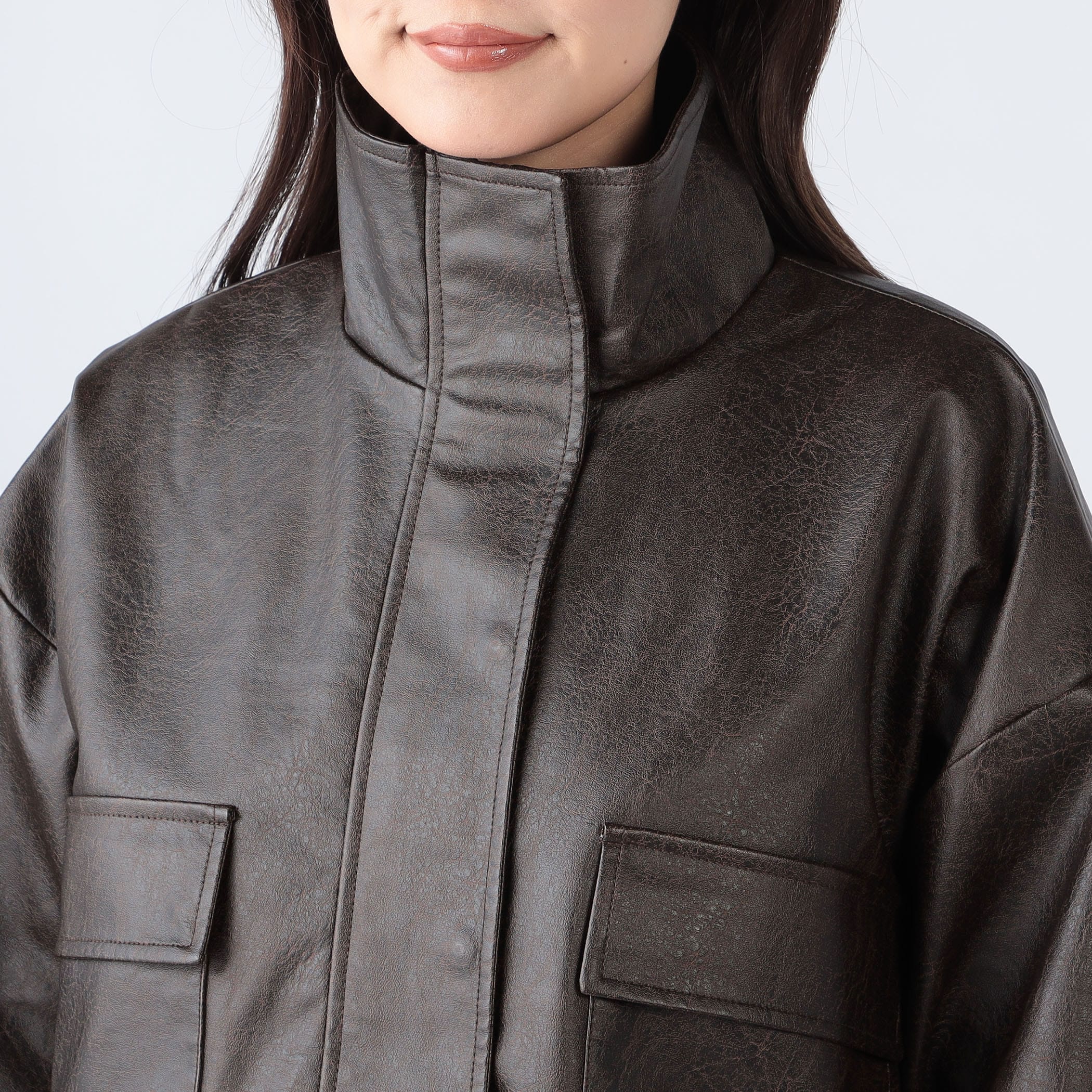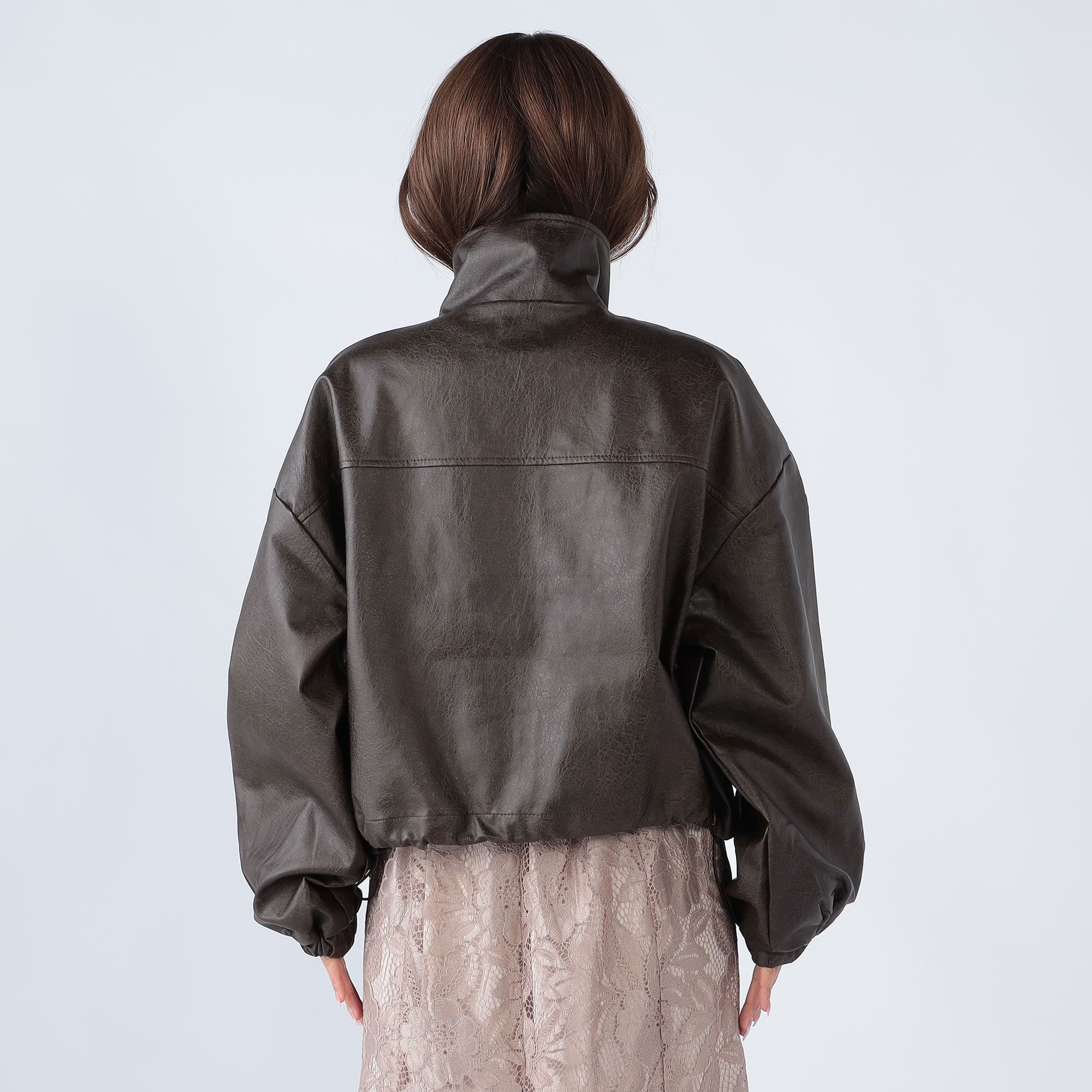トレンドのスタンドカラーがポイントのフェイクレザーブルゾン。裾は裾巾を調節出来るドロストデザイン。裏地もついているのでしっかり防寒対策も出来ます。カッコいいイメージのフェイクレザーですが、ボトムにスカートを合わせた可愛いスタイリングにも使える1着です★