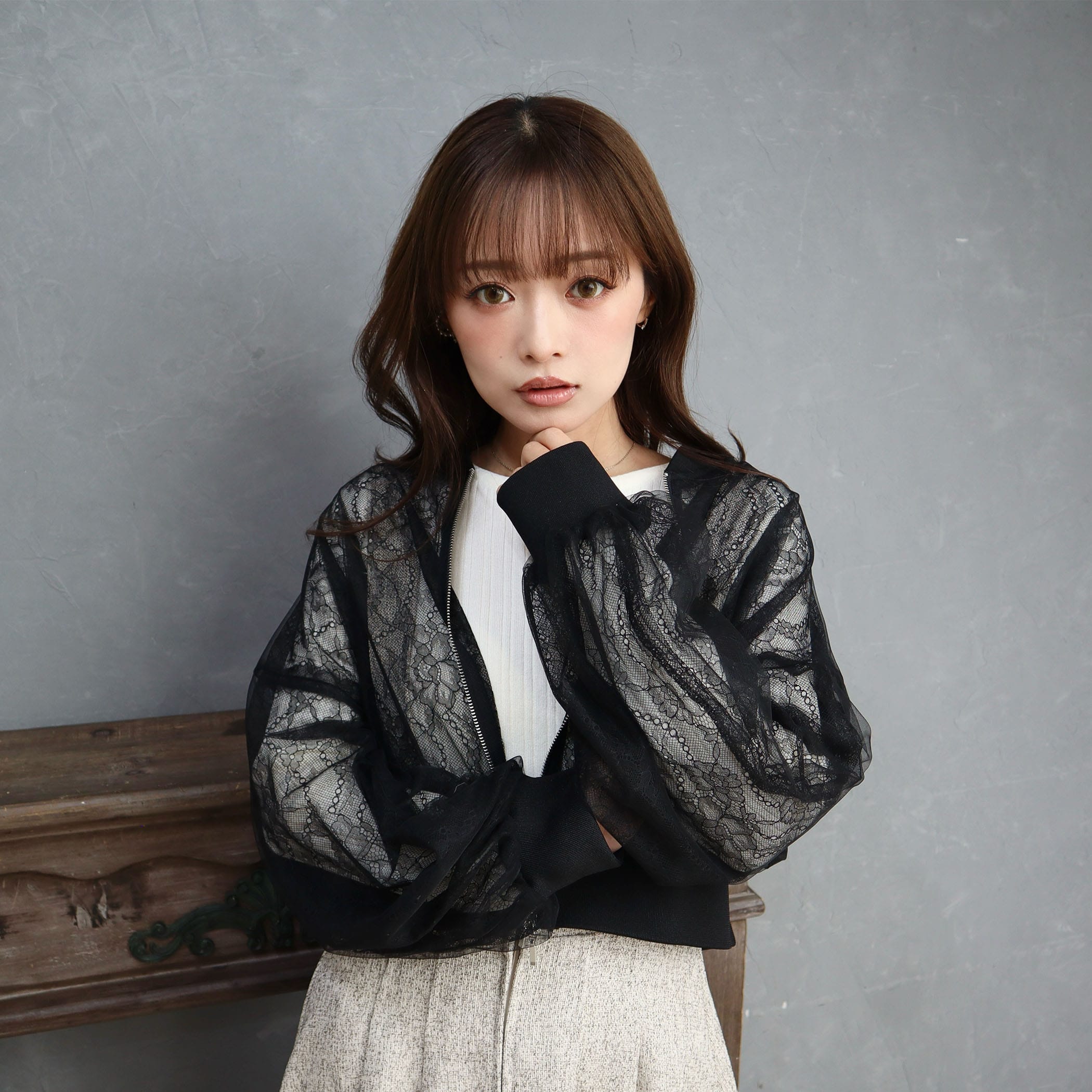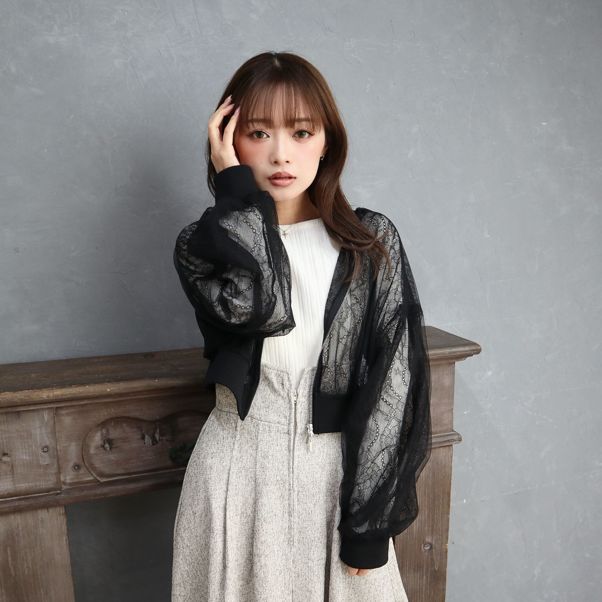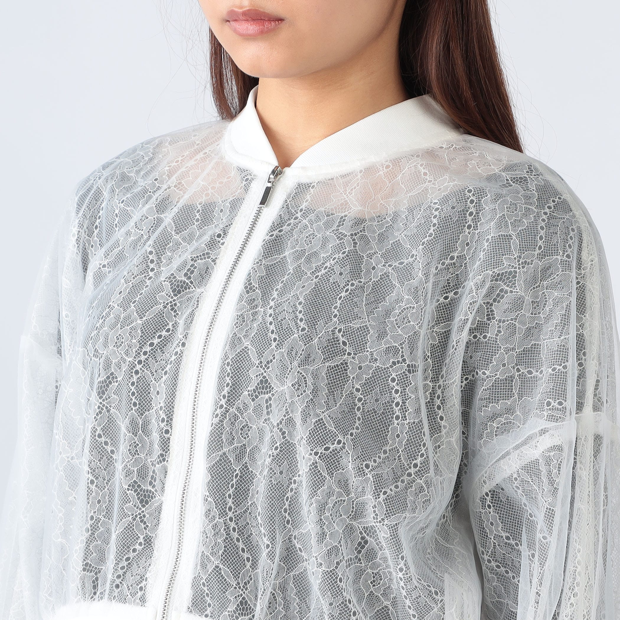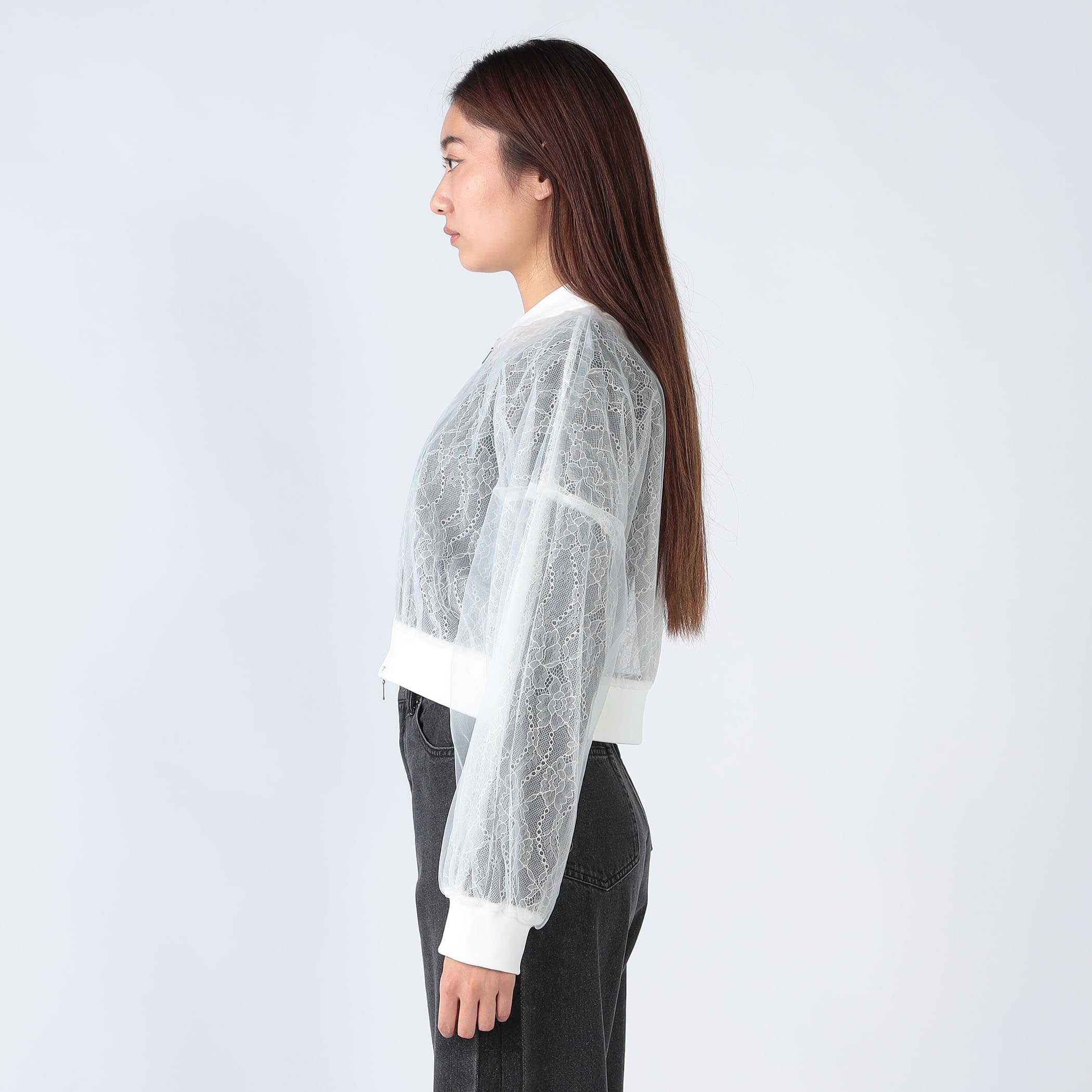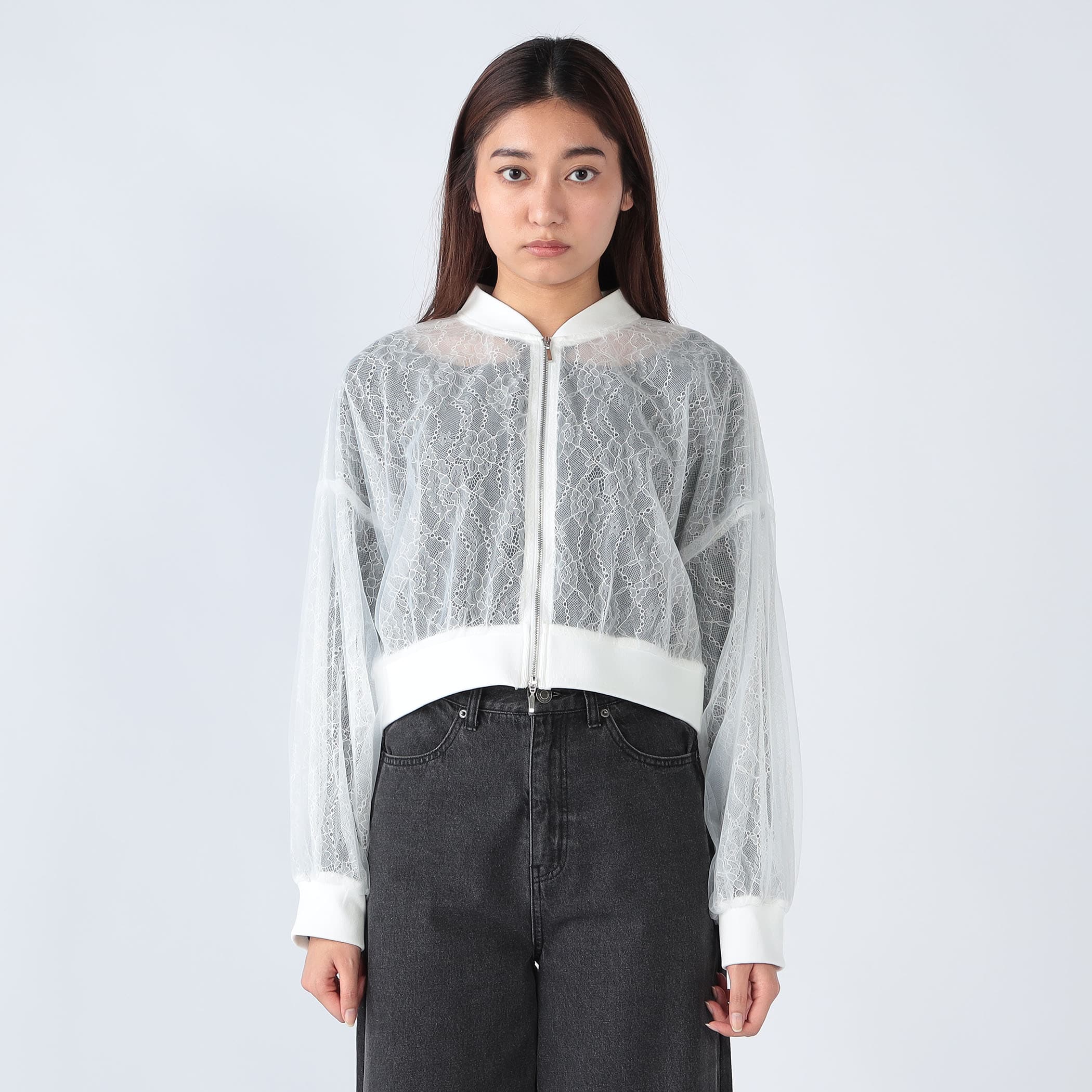 レースとチュールの重ねが可愛いジップアップブルゾン。この1枚羽織るだけでトレンドのレースコーデのポイントに!ボリューム感あるシルエットですが、袖口・裾がリブ仕様になっており、短めの着丈なのでスタイルアップ効果も◎可愛らしいデザインなので、ボトムにパンツを合わせてカジュアルダウンしたスタイリングにも合う1着です★