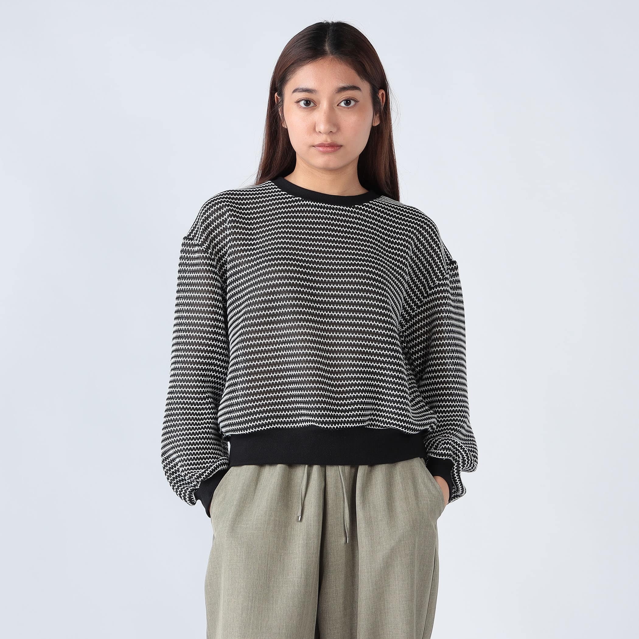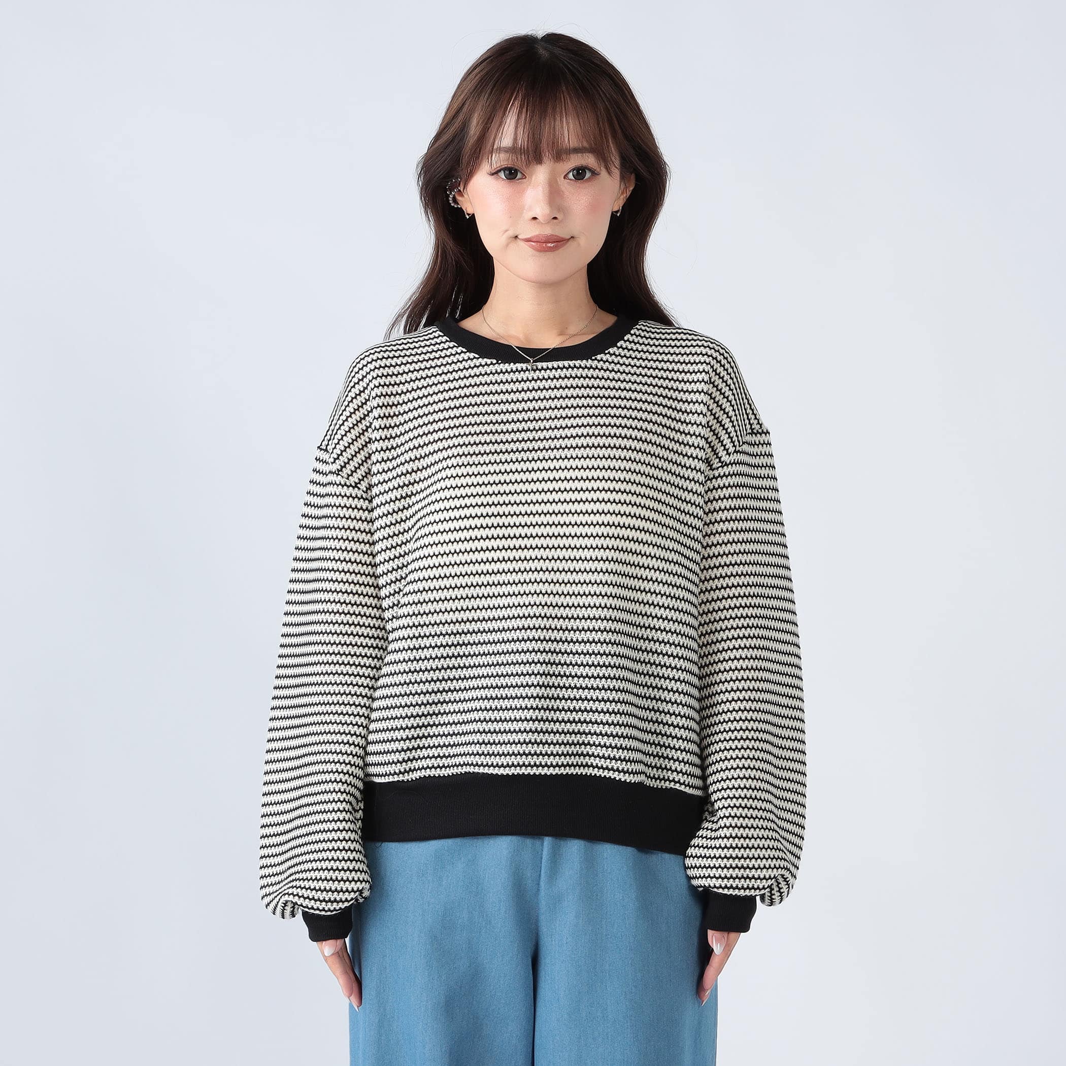 ボーダー柄のかぎ針風素材が可愛い長袖プルオーバー。ゆったりした身幅感ですが、袖口・裾がリブ仕様なのでスッキリした印象に。パンツにもスカートにも合う、コーディネートしやすい1着です。