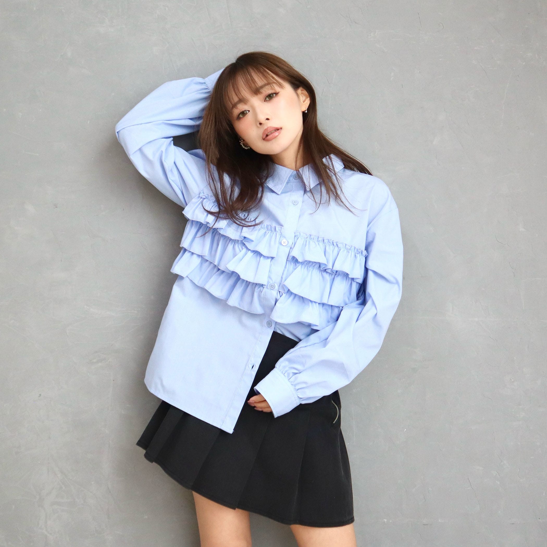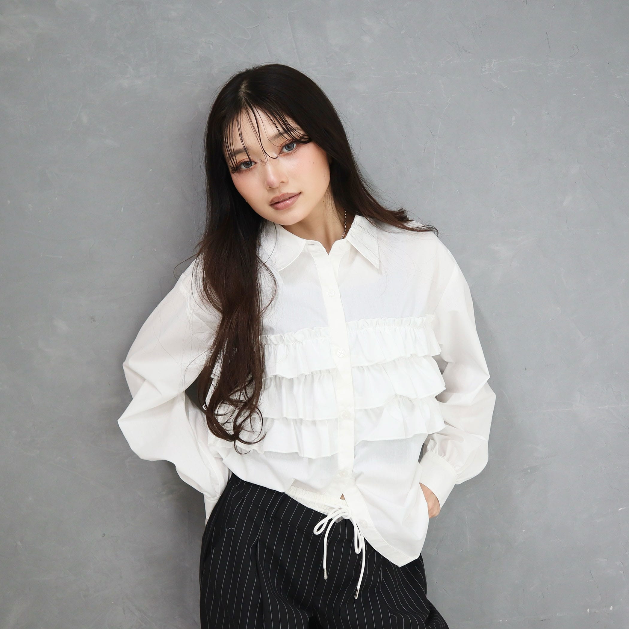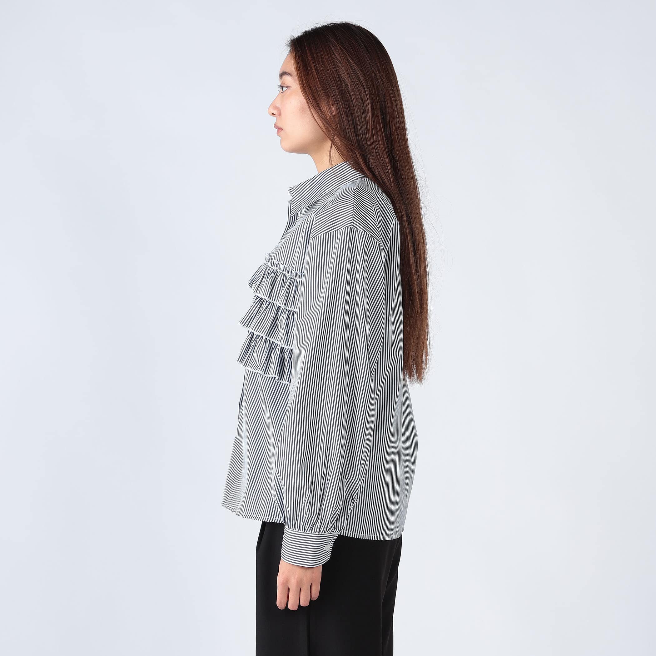胸元のフリルが目を惹くブロードシャツ。春先に着やすい、さらっとした着心地です。ゆったりした身巾感なので前を開けて羽織ったり、釦を閉じて着用したりコーディネートの幅が広がる1着★