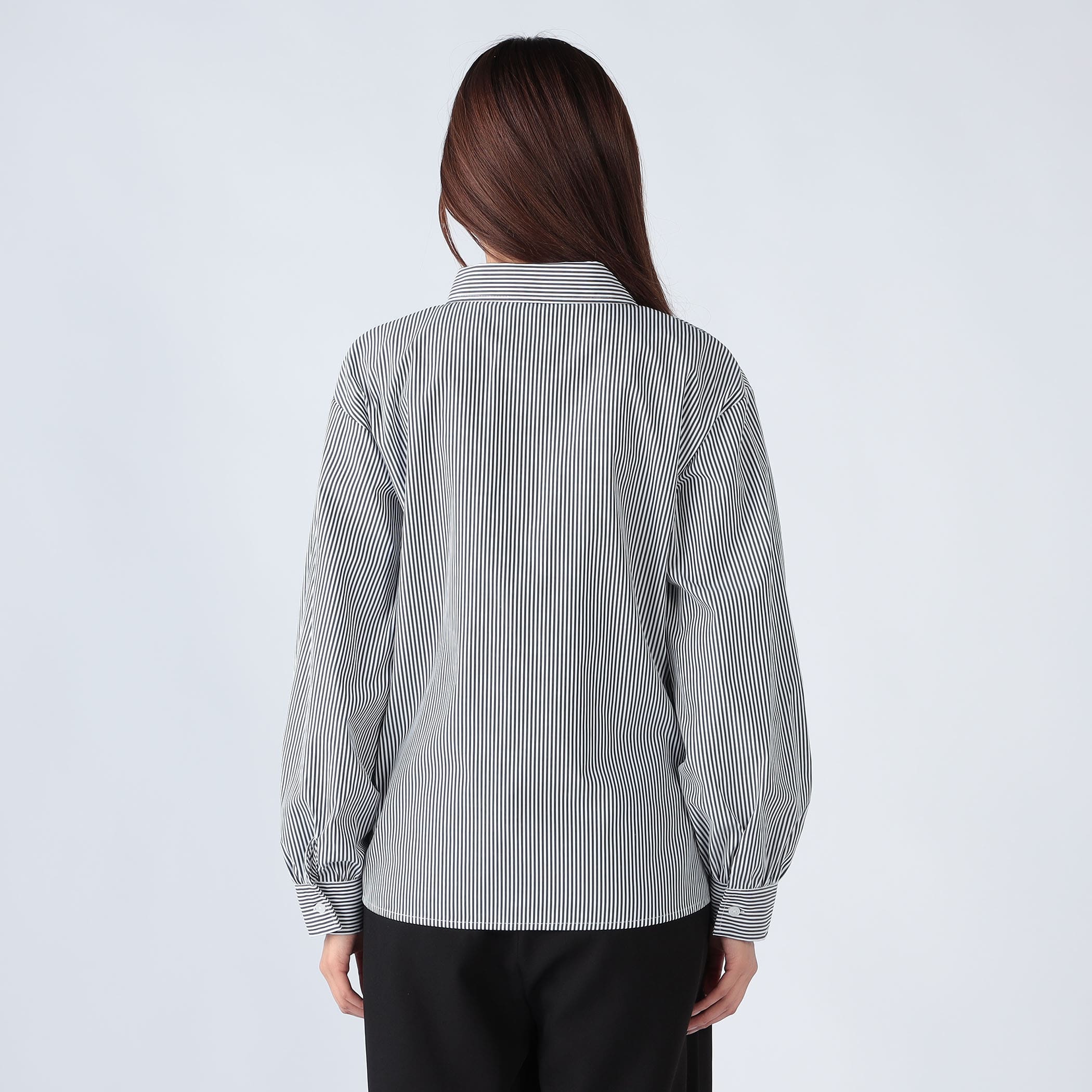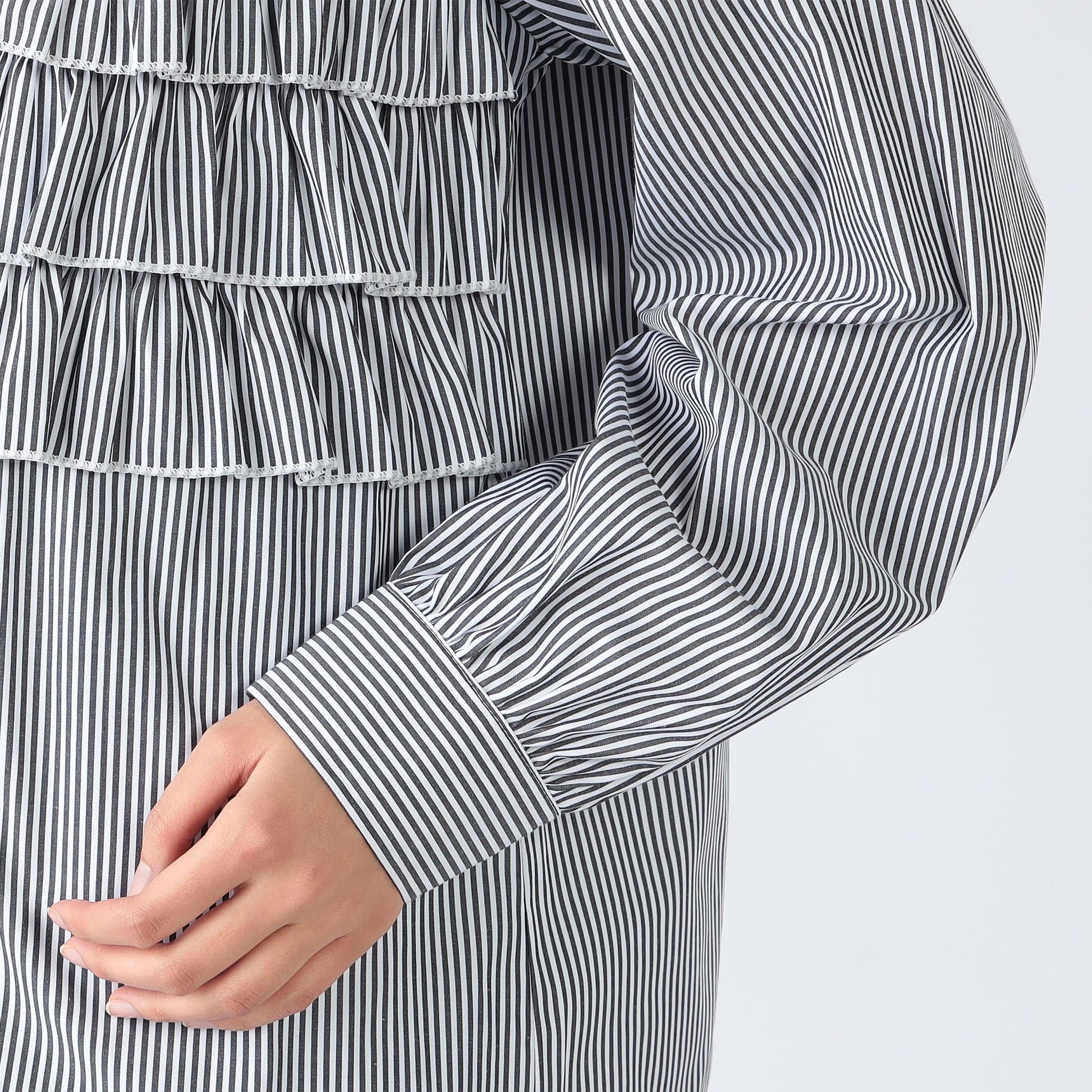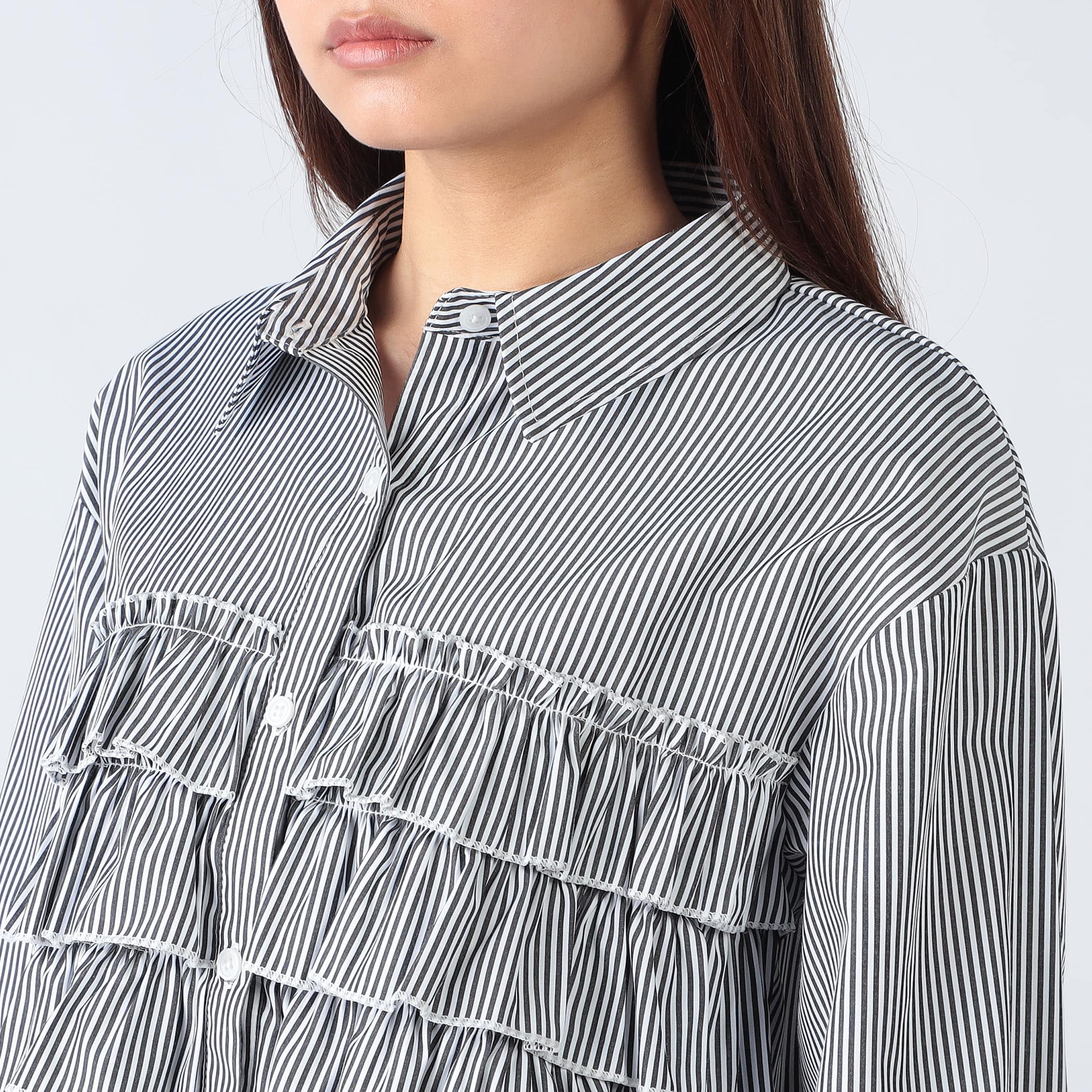 胸元のフリルが目を惹くブロードシャツ。春先に着やすい、さらっとした着心地です。ゆったりした身巾感なので前を開けて羽織ったり、釦を閉じて着用したりコーディネートの幅が広がる1着★
