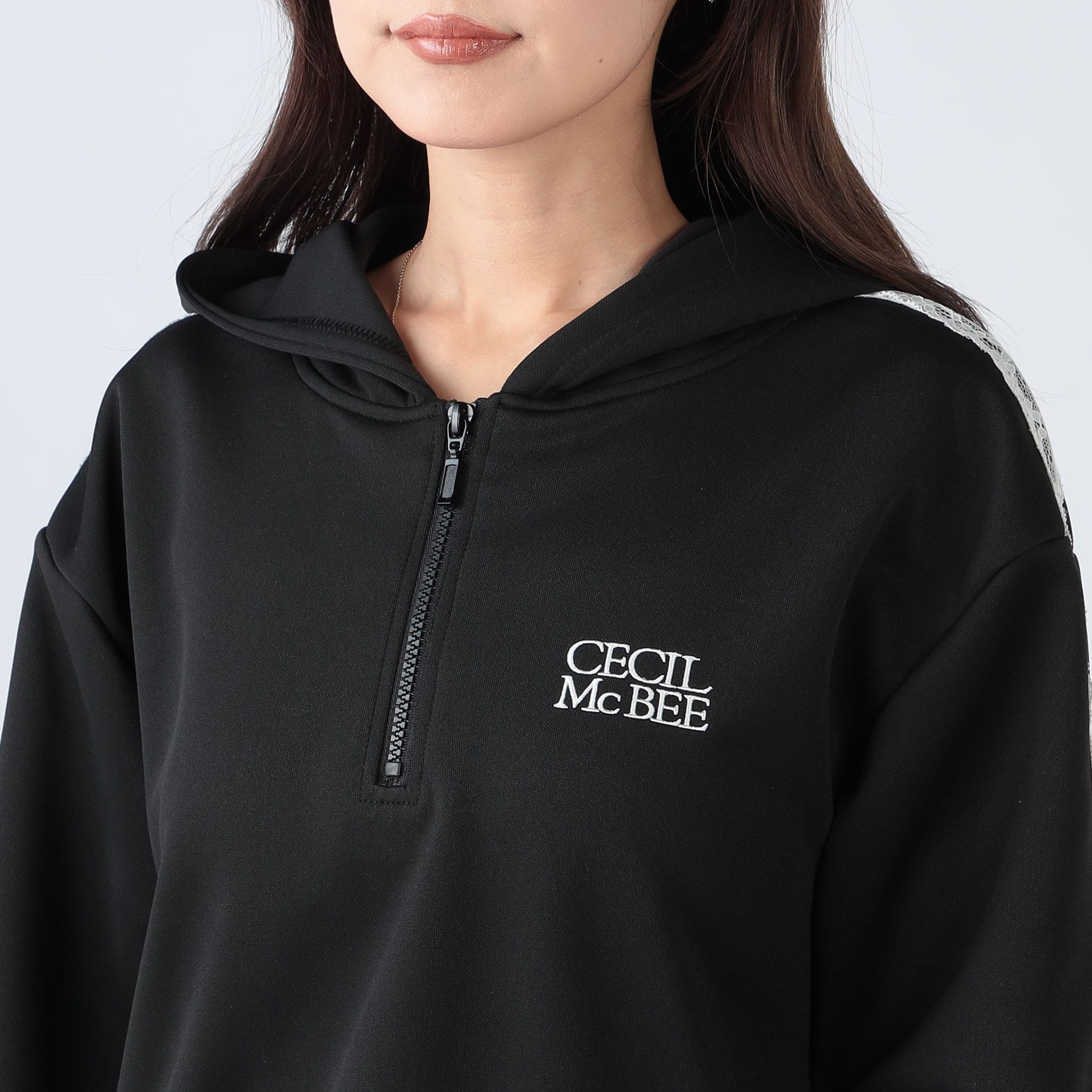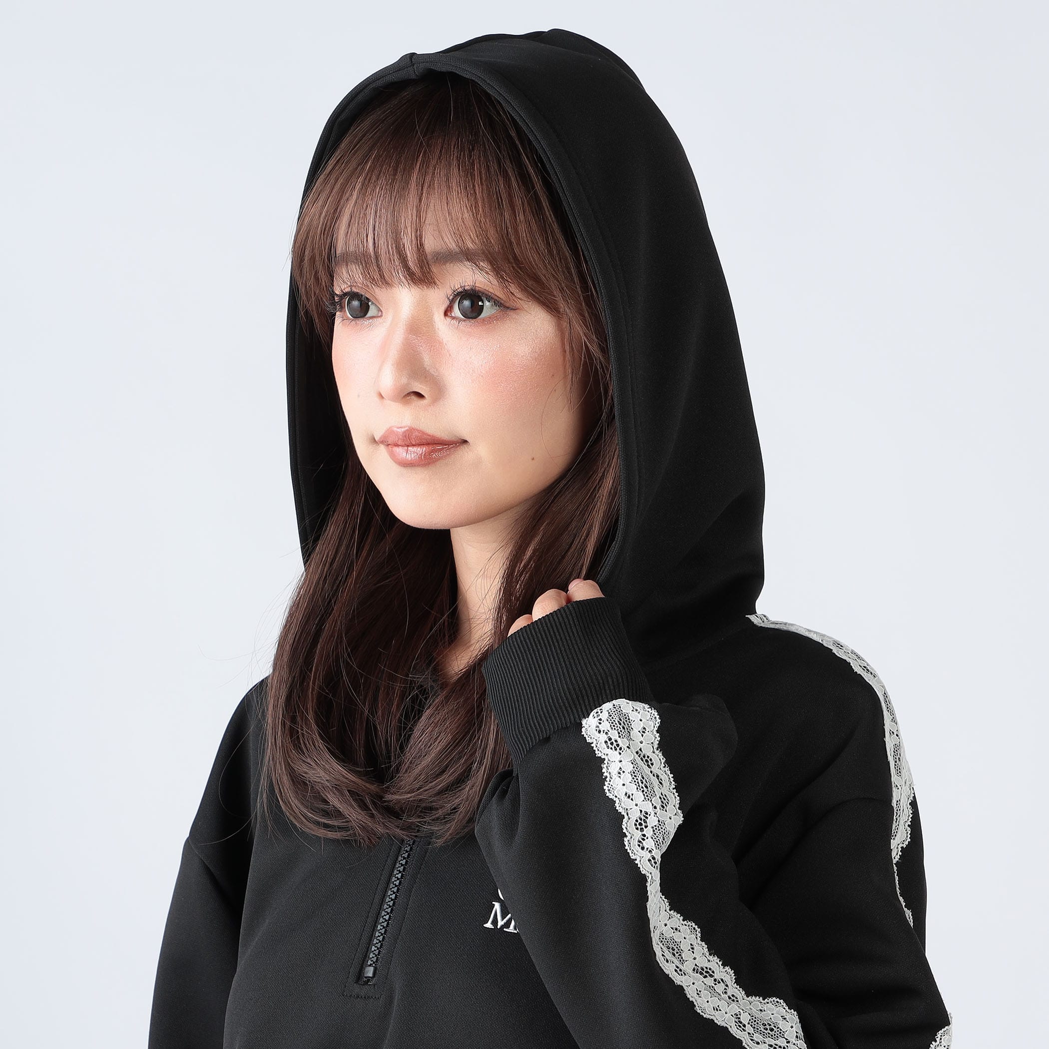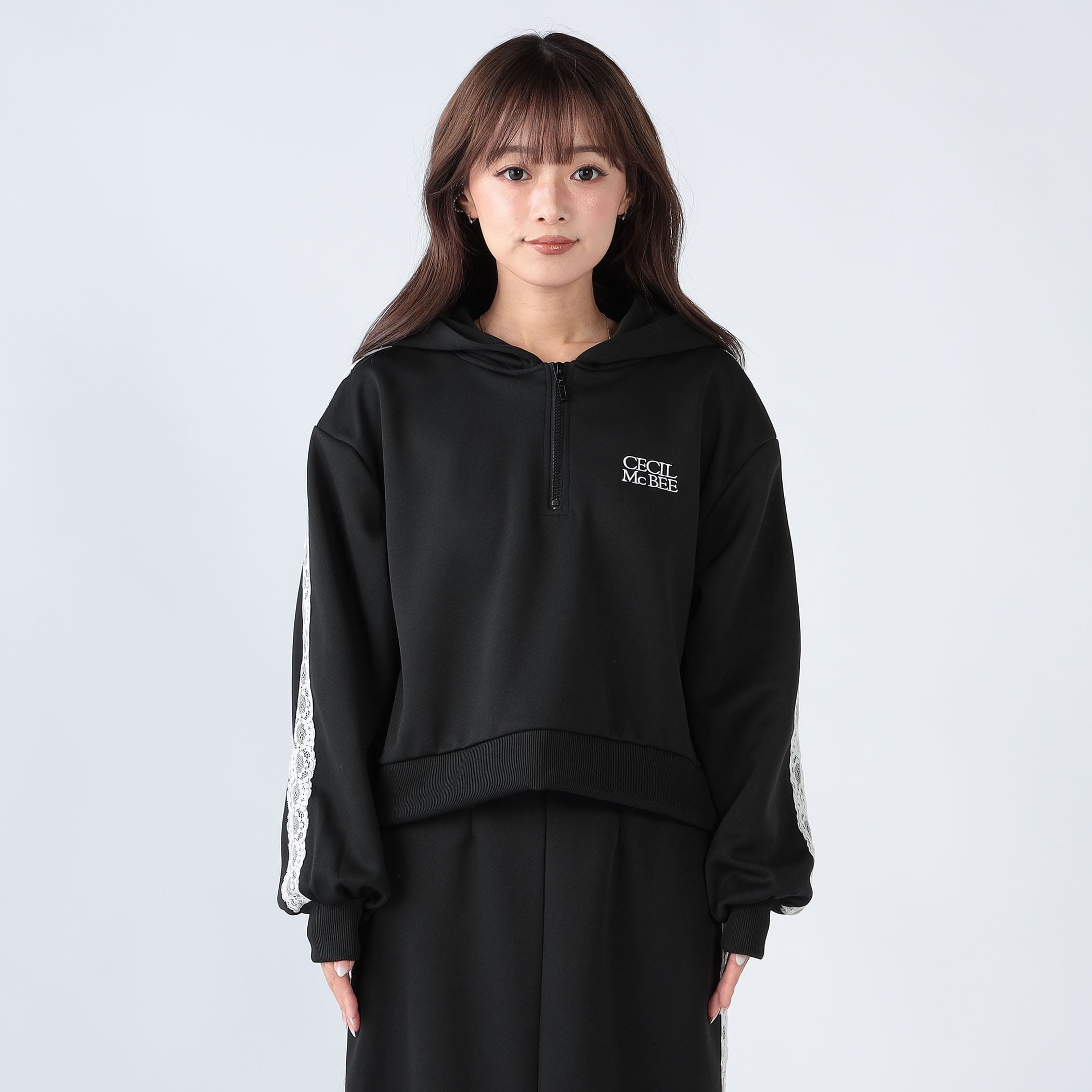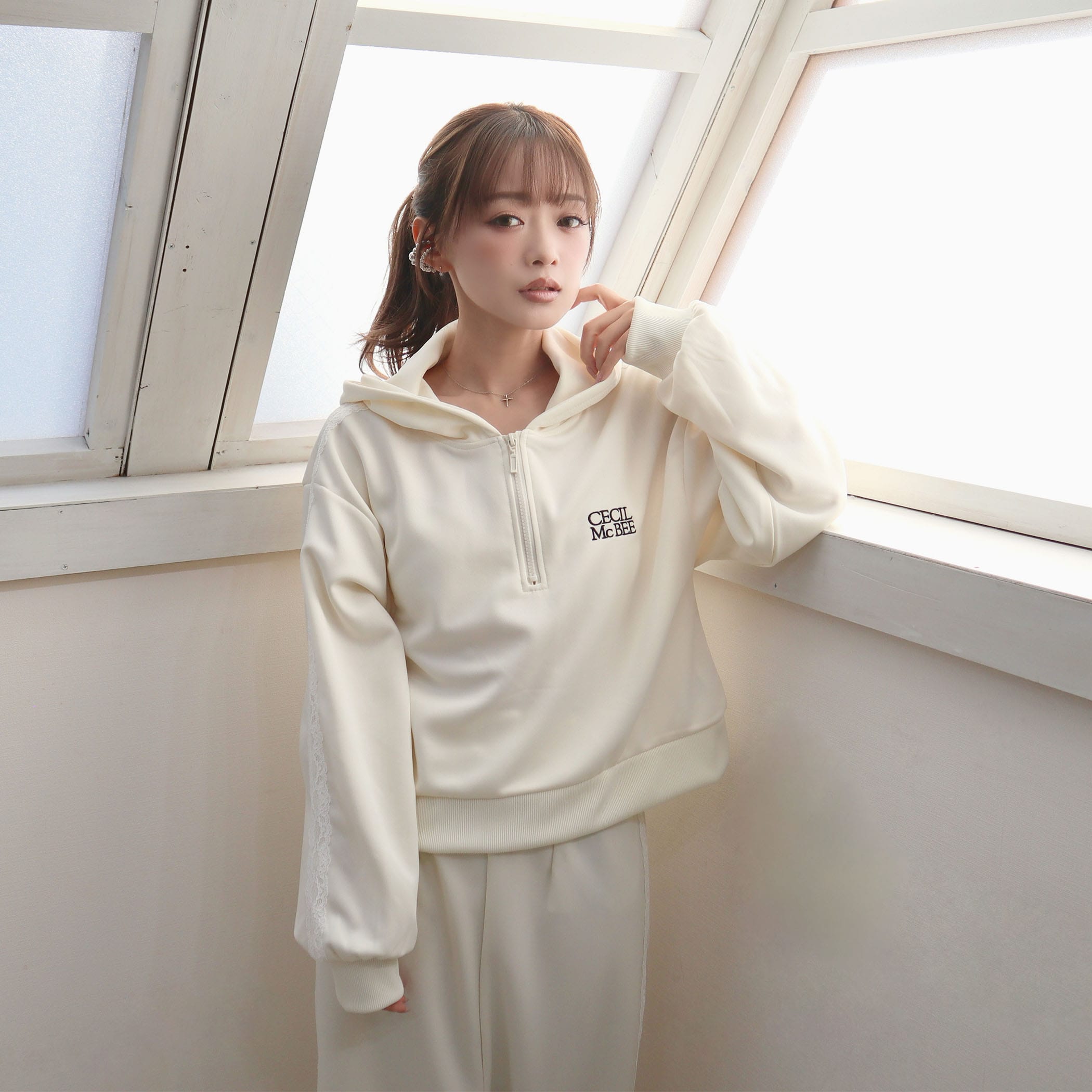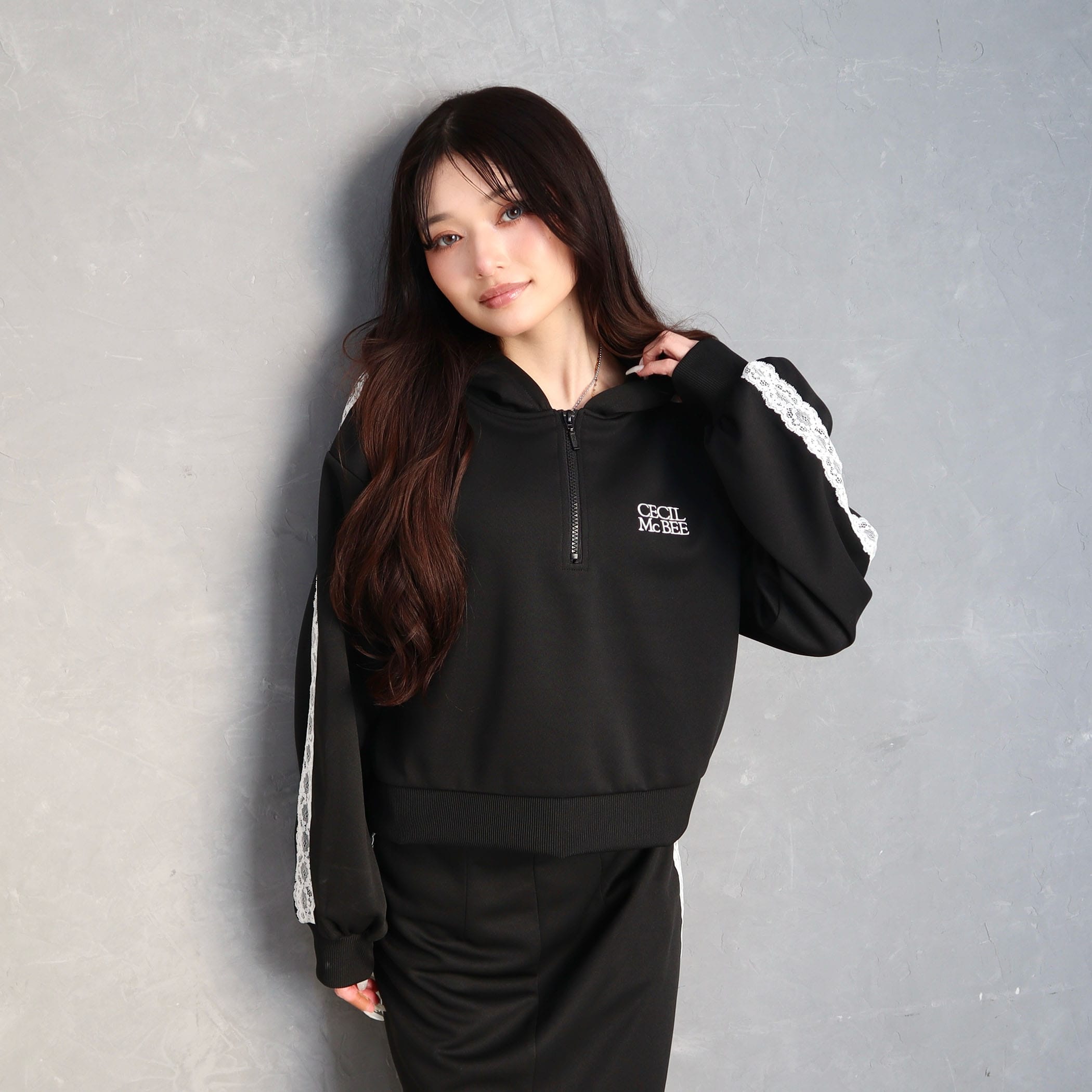 袖のレーステープが可愛いハーフジッププルオーバー。ジャージ素材なので伸縮性があり着心地抜群です★左胸のブランドロゴ刺繍がコーディネートのアクセントに◎短めの身丈でスタイルアップ効果も…!