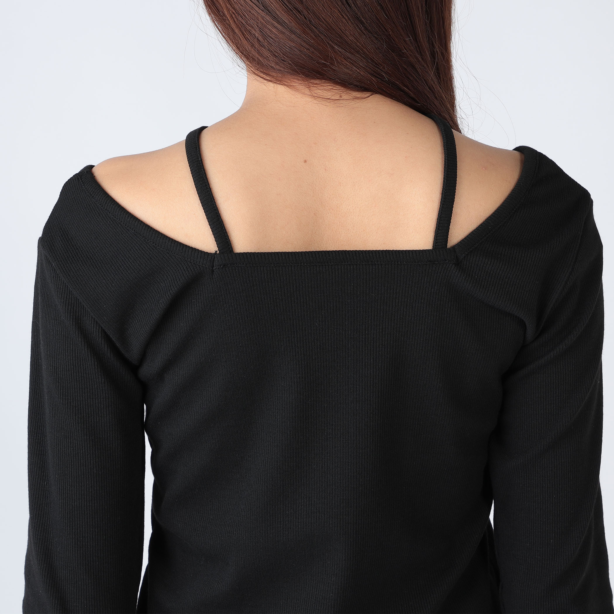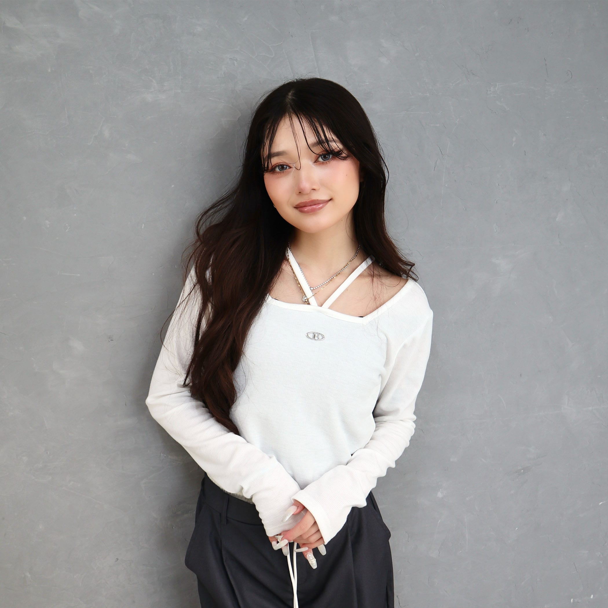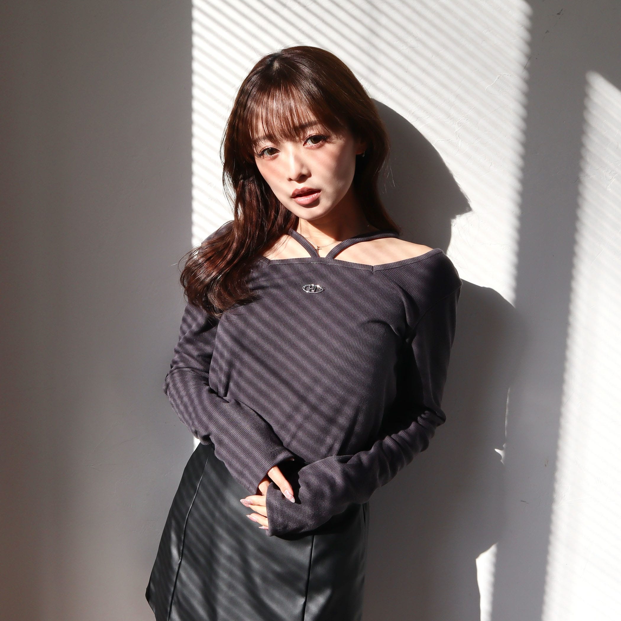 トレンドのスクエアネックのリブトップス。胸元のメタルパーツがアクセントとなり、よりおしゃれな印象に。肩紐がついているので華奢見え効果ありなのも嬉しいポイントです◎コンパクトなシルエットですが、伸縮性のあるリブ素材なので着心地抜群です。前後2WAYデザインなのでその日の気分で着方を変えられ、コーディネートの幅も広がります。