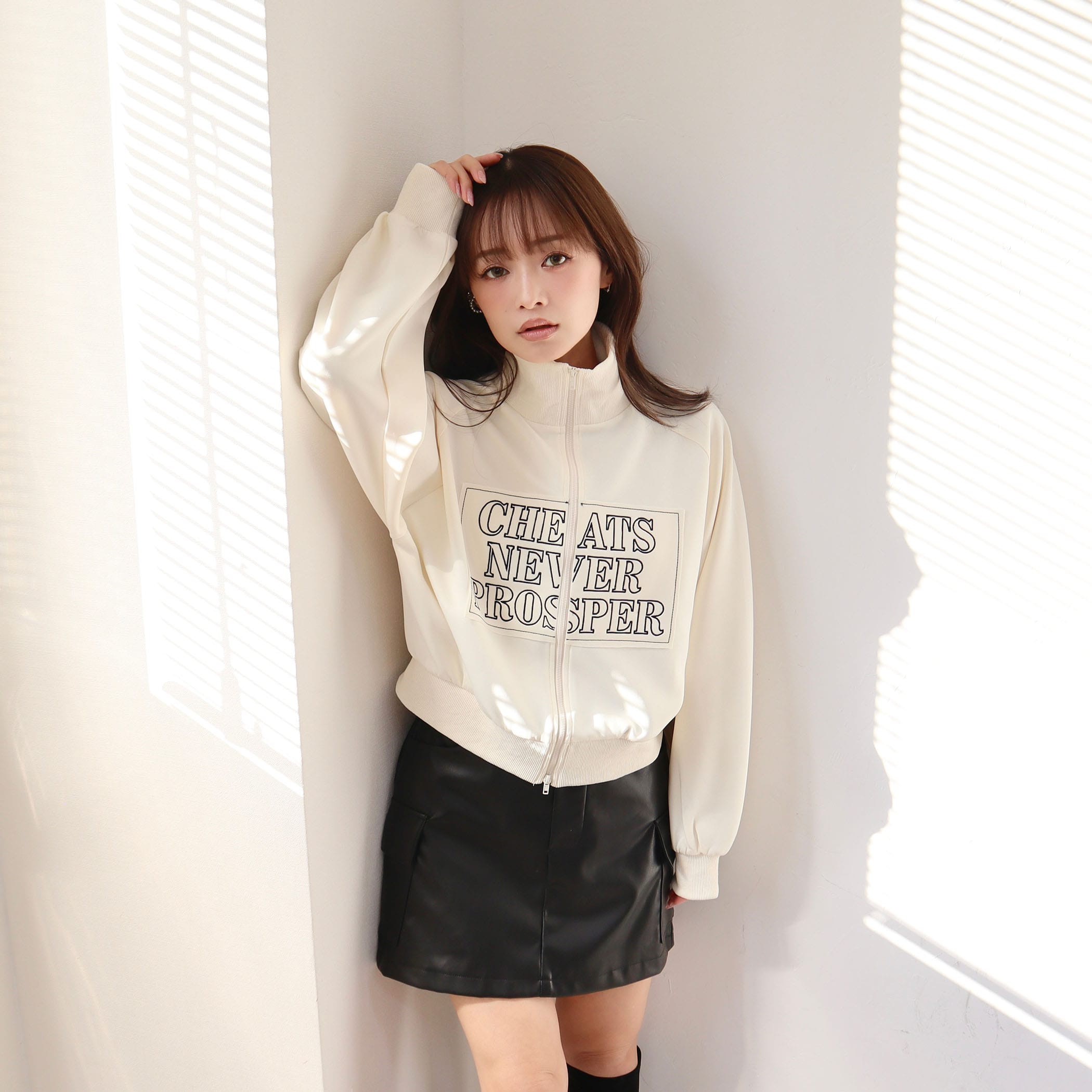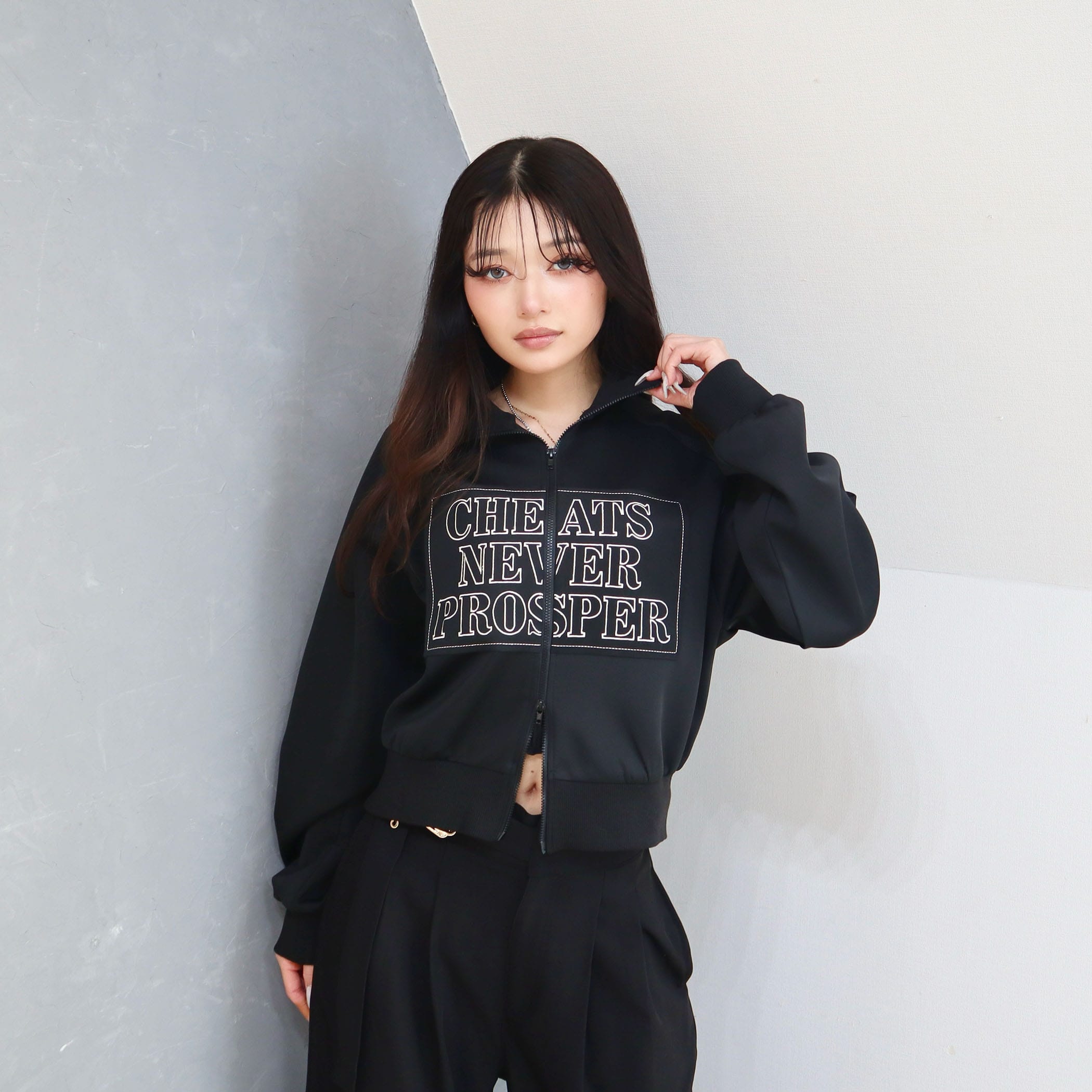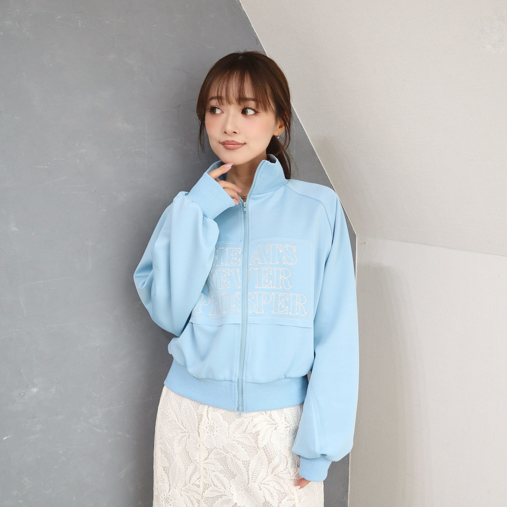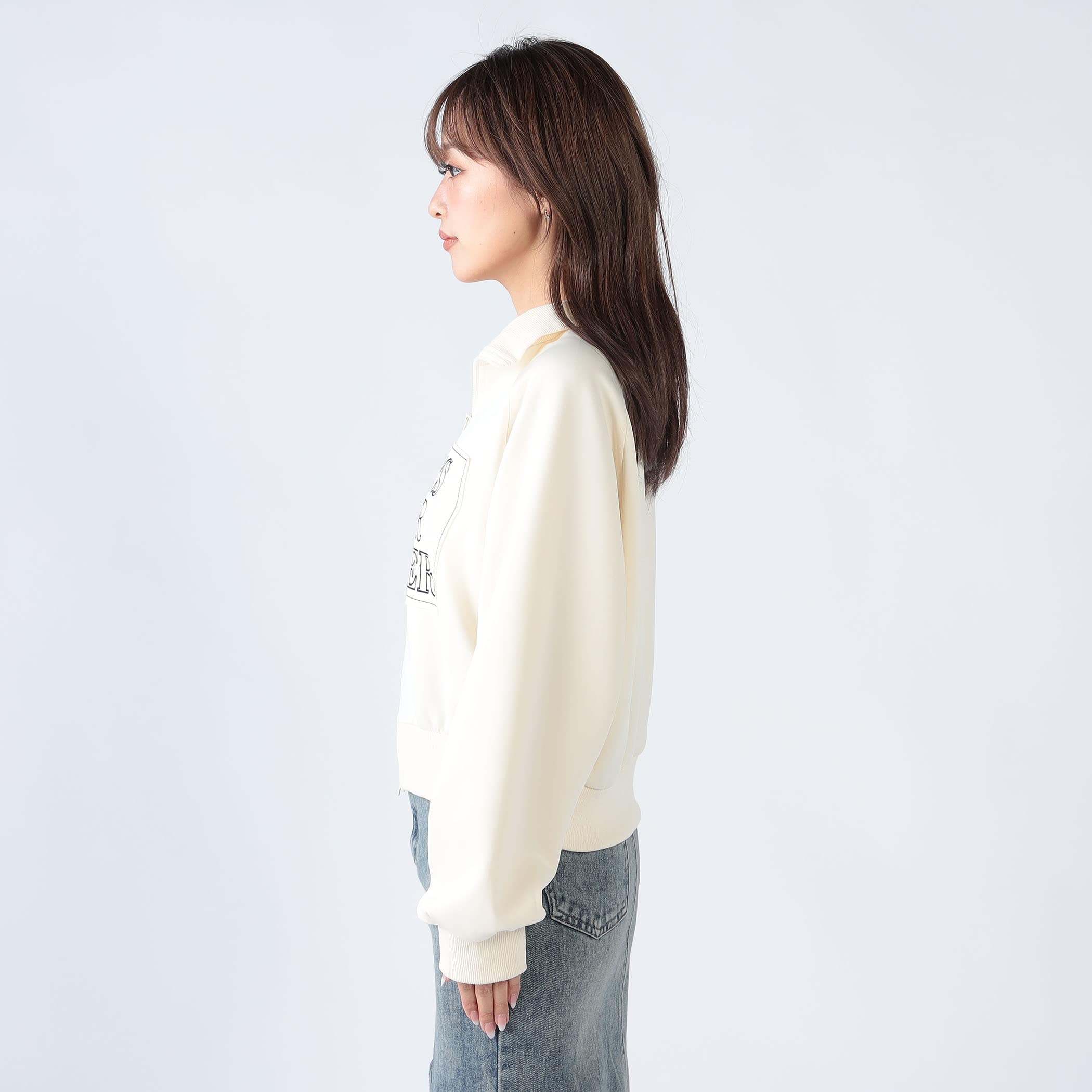 スタンドカラーで顔周りも華やかに演出するZIPブルゾン。フロントの刺繍もポイント◎ダブルジップで裾を少し開いて抜け感をプラスするのがおすすめです。コンパクトめな着丈なので、パンツにもスカートにも合わせやすく重宝するアイテムです。
