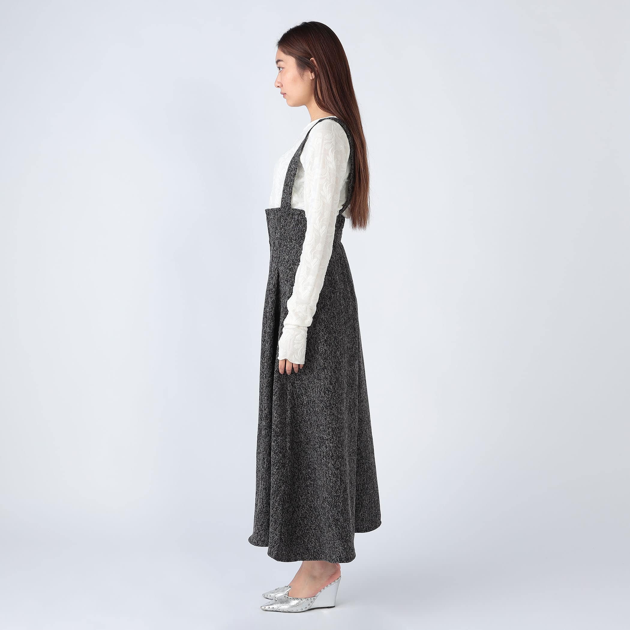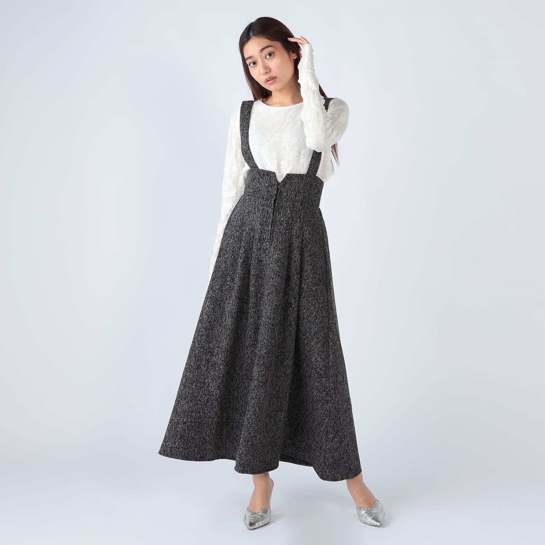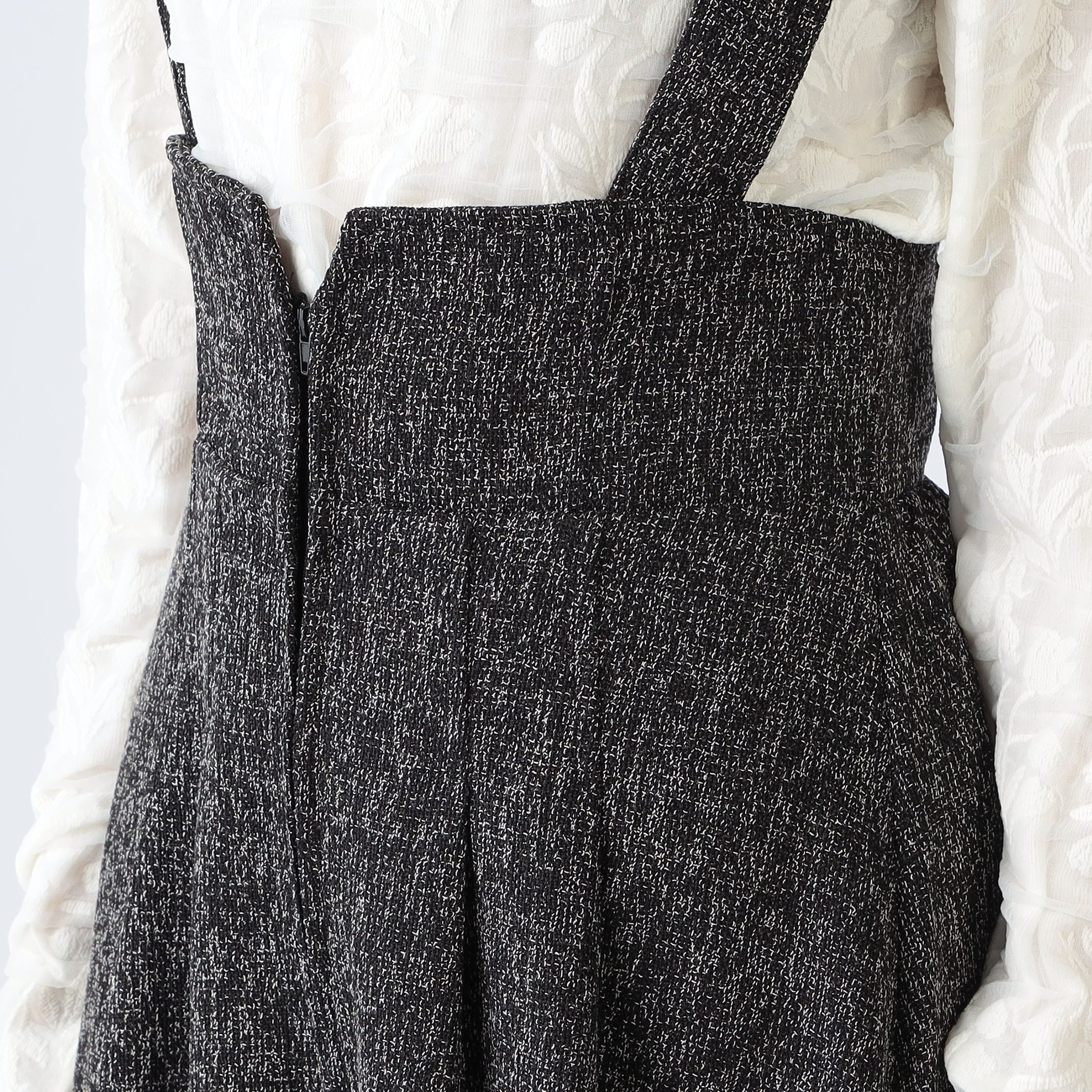 ツイード見え生地が大人可愛いジャンスカ。裾に向かって広がるフレアシルエットは身体のラインを拾わず、メリハリのあるハイウエストデザインは細見えするバランスに仕上げました。たっぷりとしたボリューム感やロングレングスな着丈・ショルダーストラップが、大人っぽく女性らしさを引き立ててくれます。さらりとした肌触りが心地良く、落ち感のいい素材なので着ぶくれする心配もありません◎