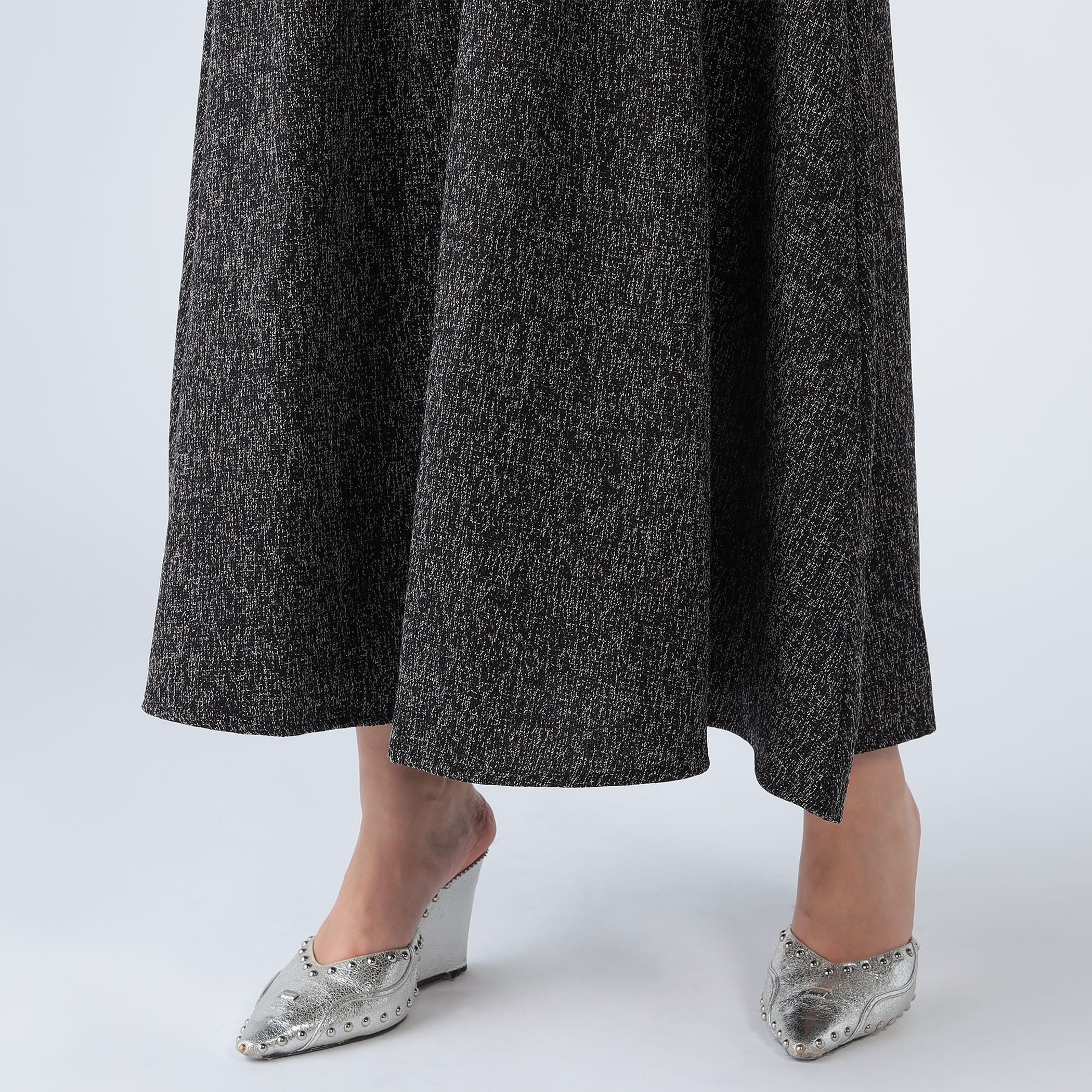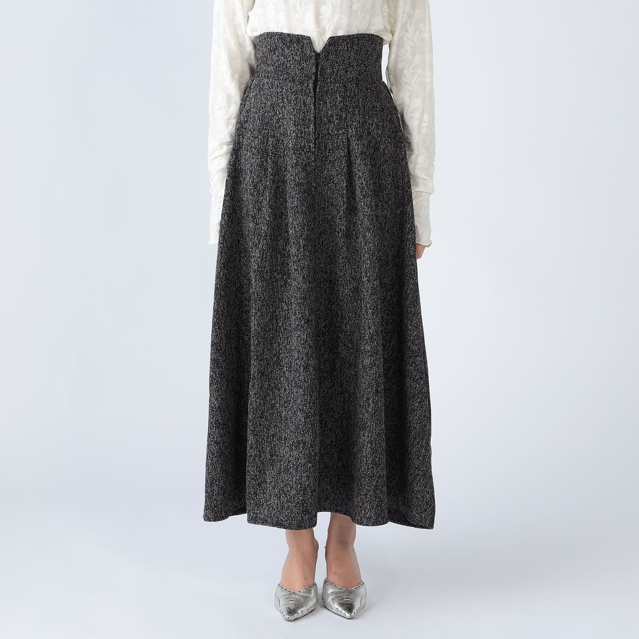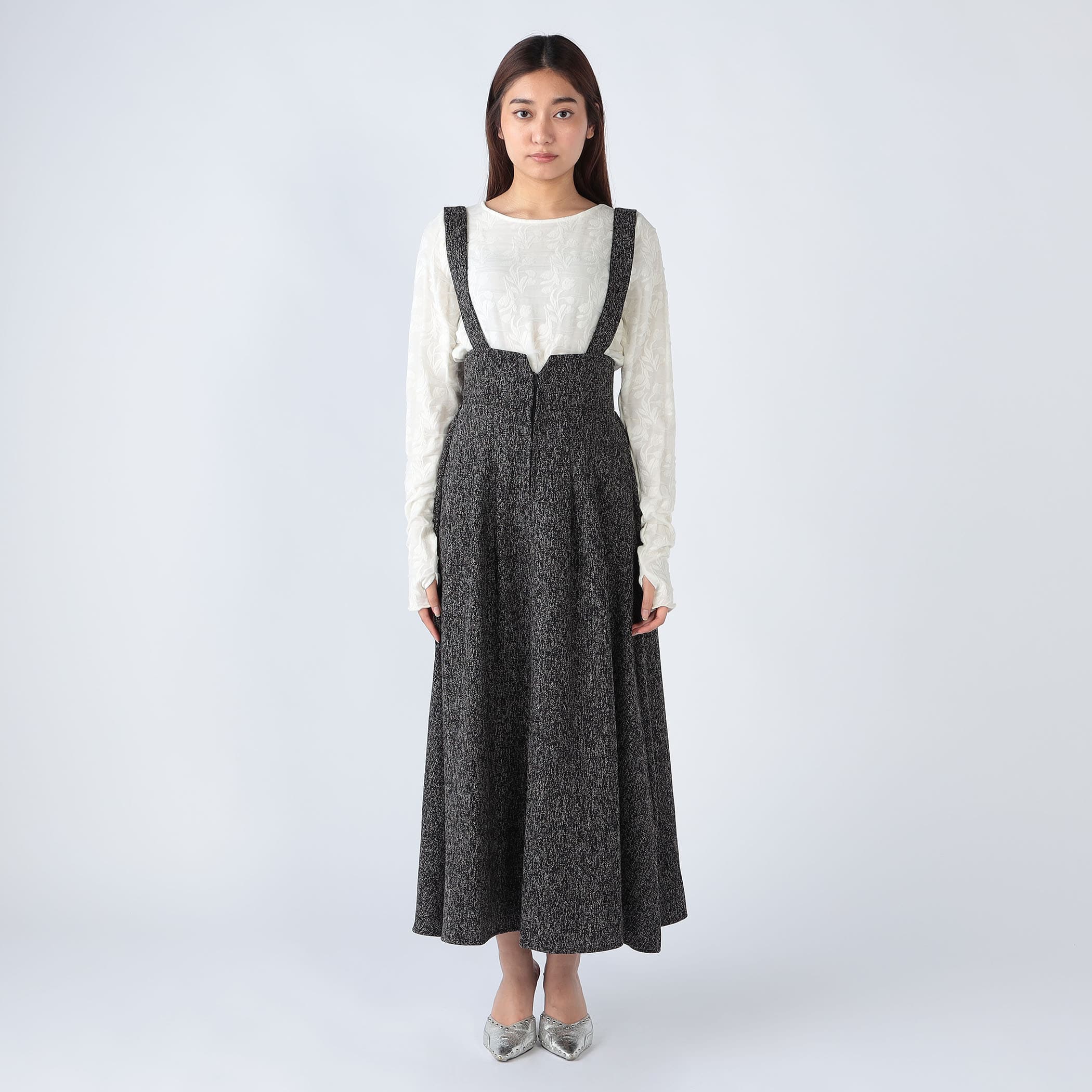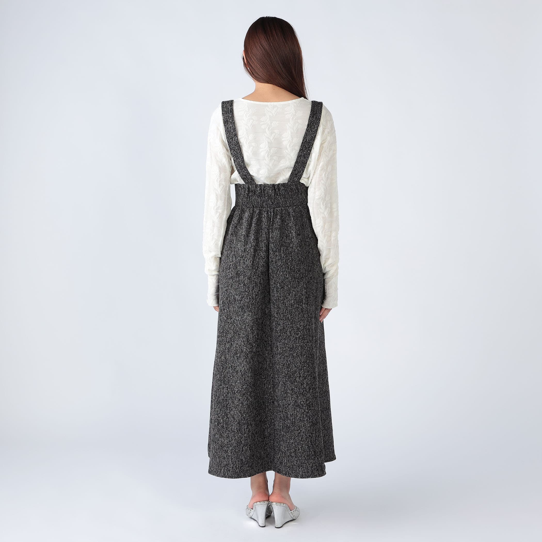 ツイード見え生地が大人可愛いジャンスカ。裾に向かって広がるフレアシルエットは身体のラインを拾わず、メリハリのあるハイウエストデザインは細見えするバランスに仕上げました。たっぷりとしたボリューム感やロングレングスな着丈・ショルダーストラップが、大人っぽく女性らしさを引き立ててくれます。さらりとした肌触りが心地良く、落ち感のいい素材なので着ぶくれする心配もありません◎