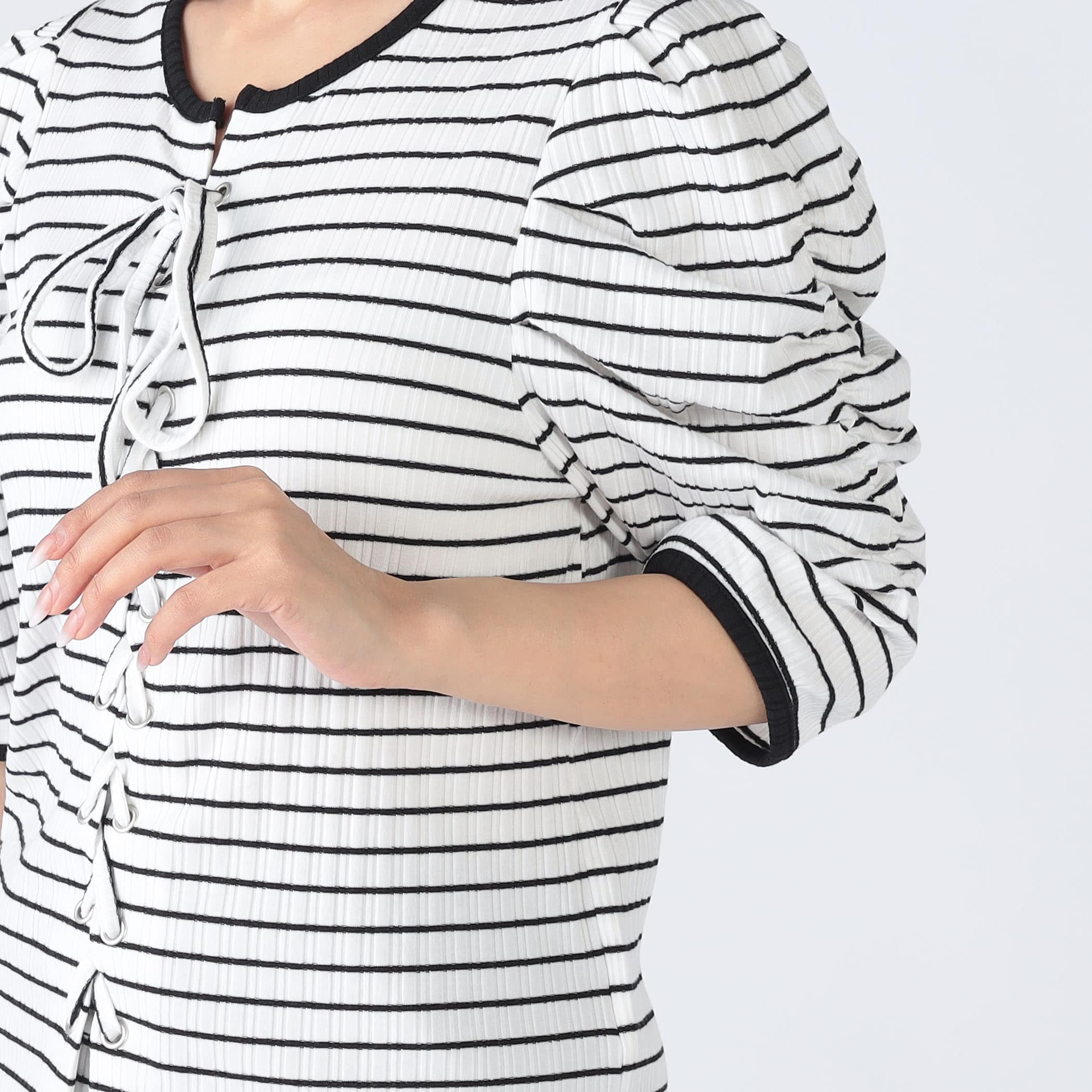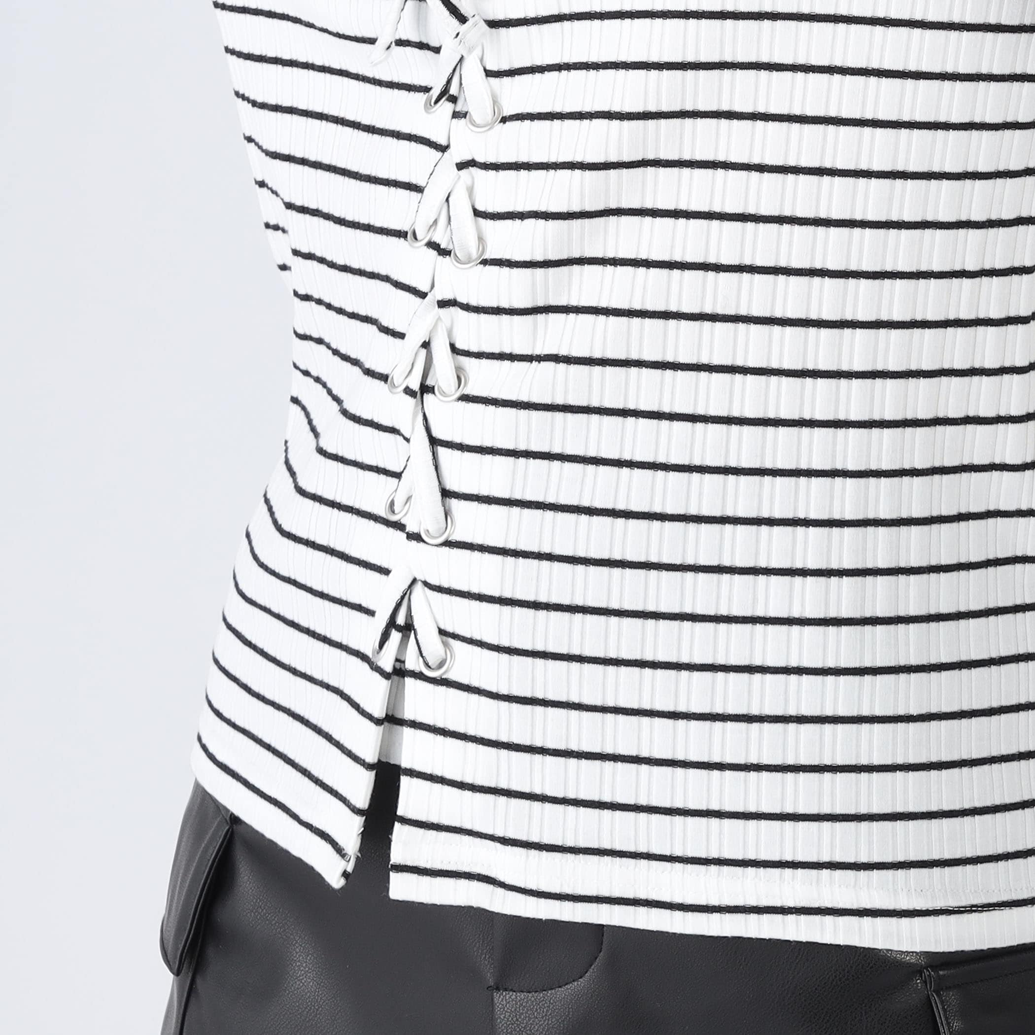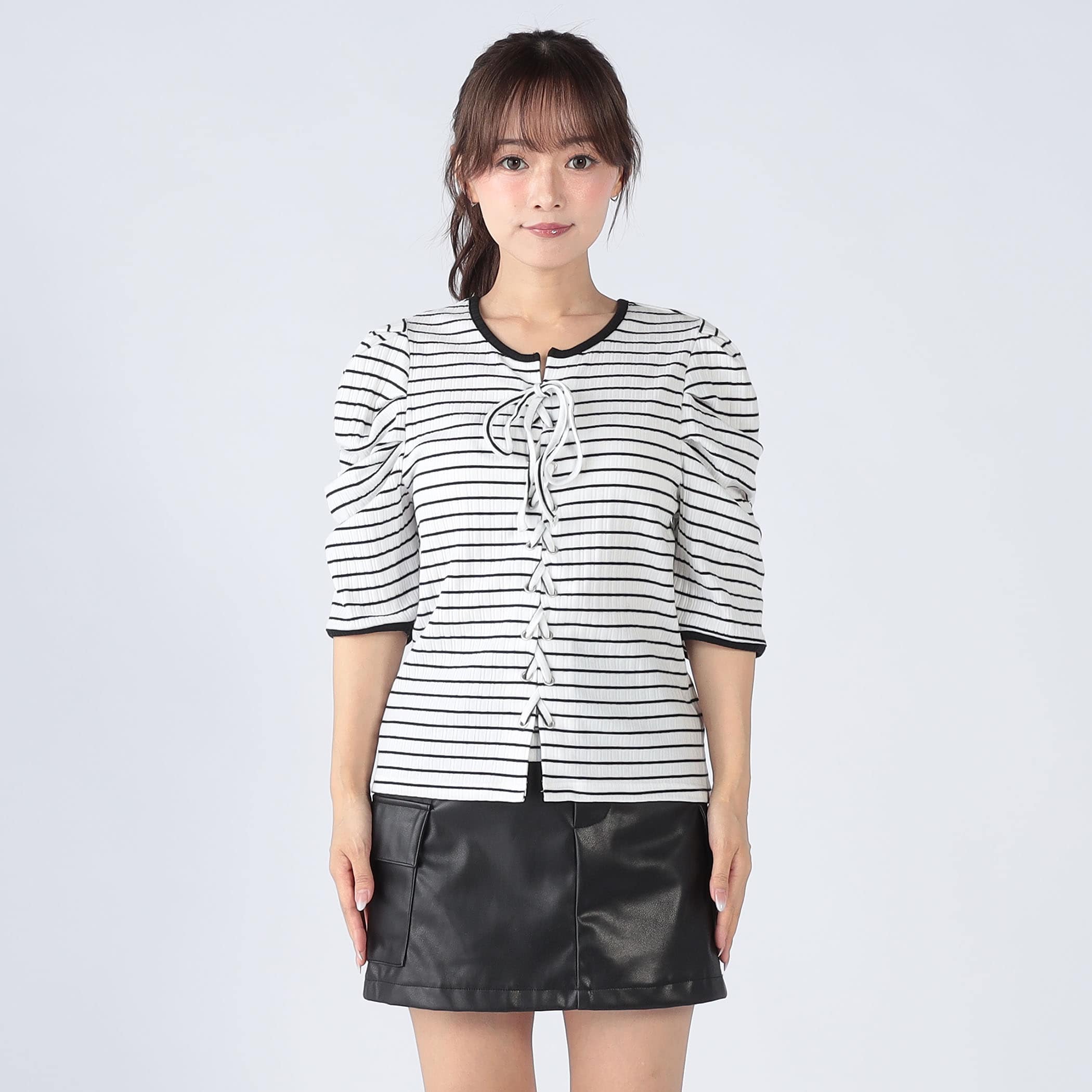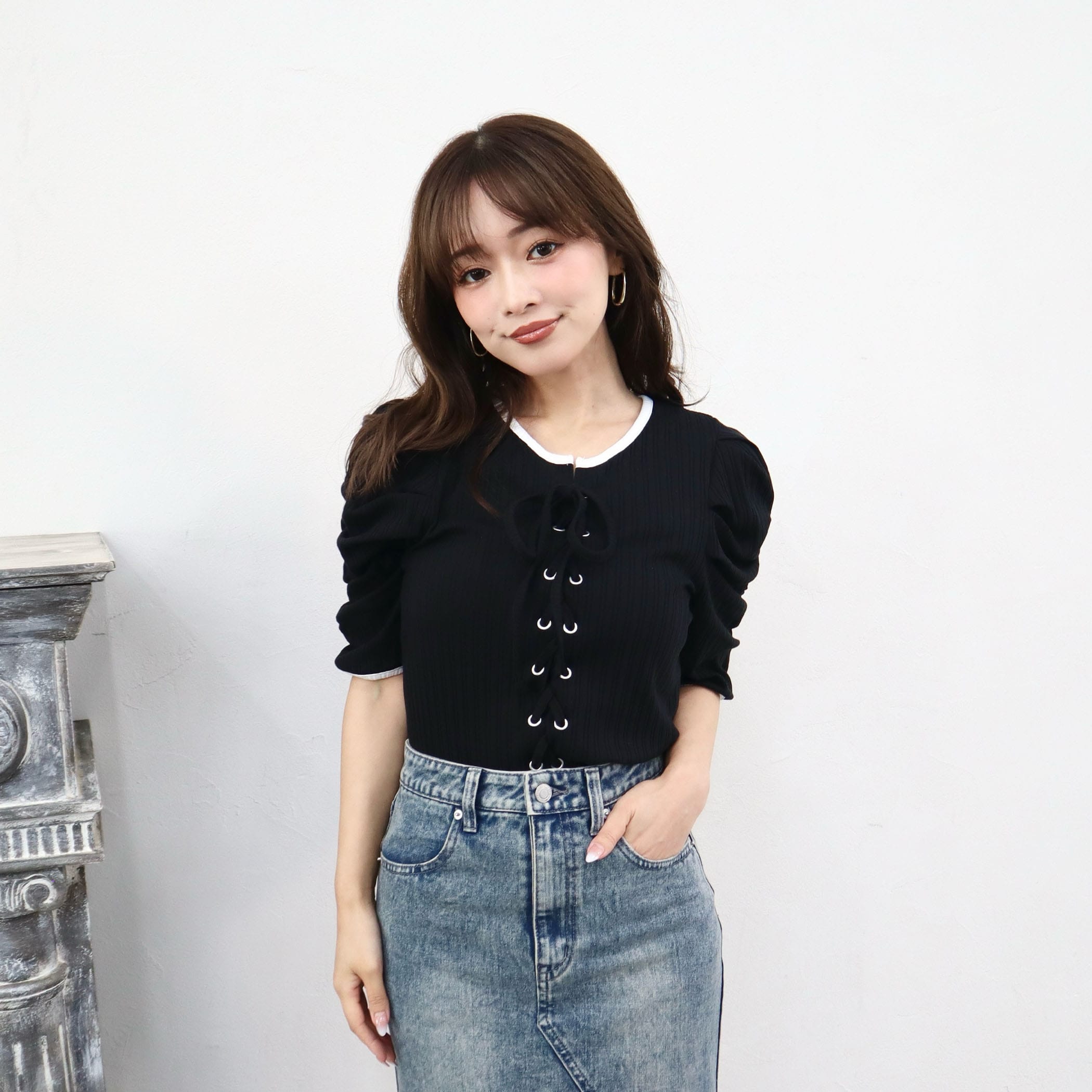 フロントのレースアップデザインでデコルテ周りを綺麗に魅せてくれる一枚。ネックデザインで小顔効果も◎