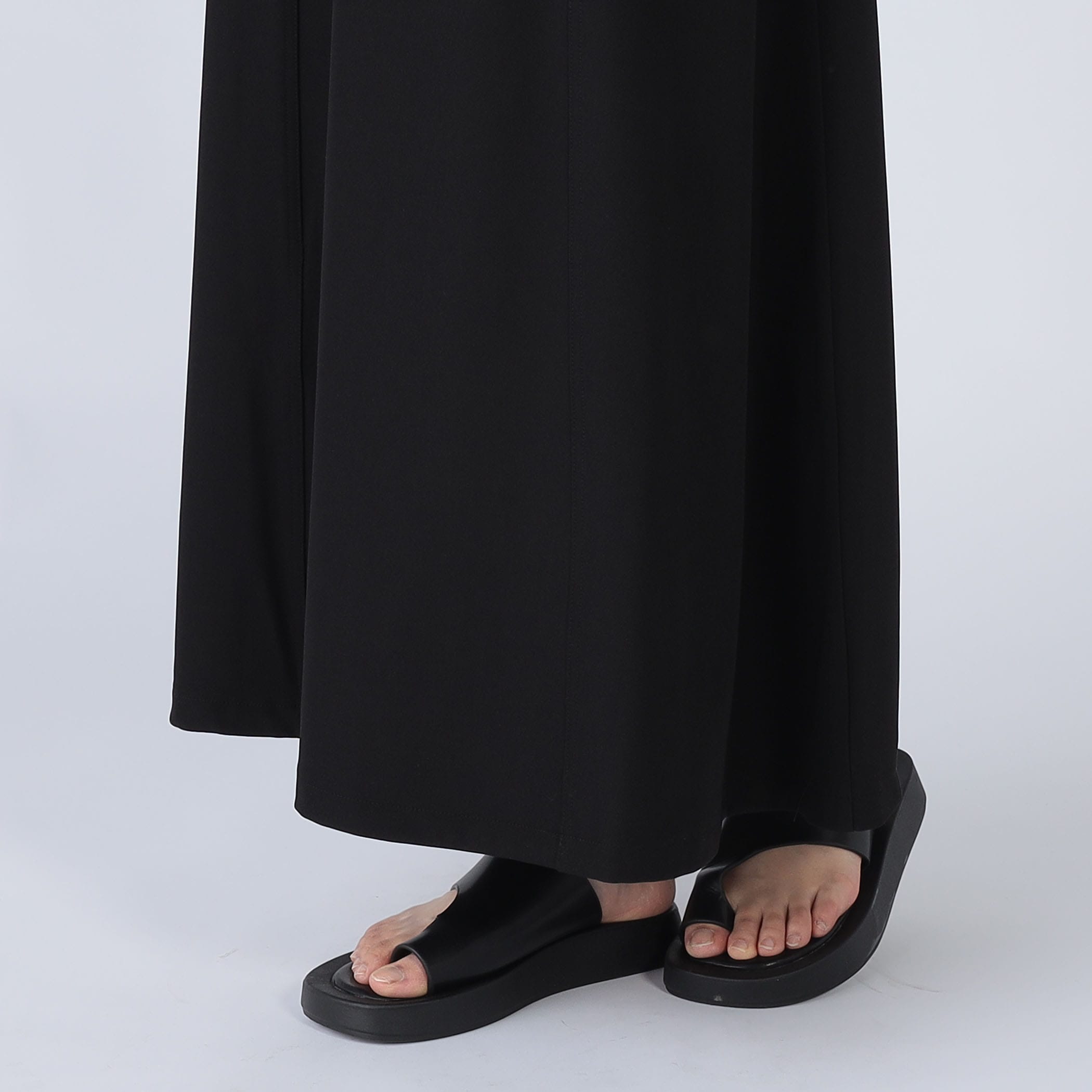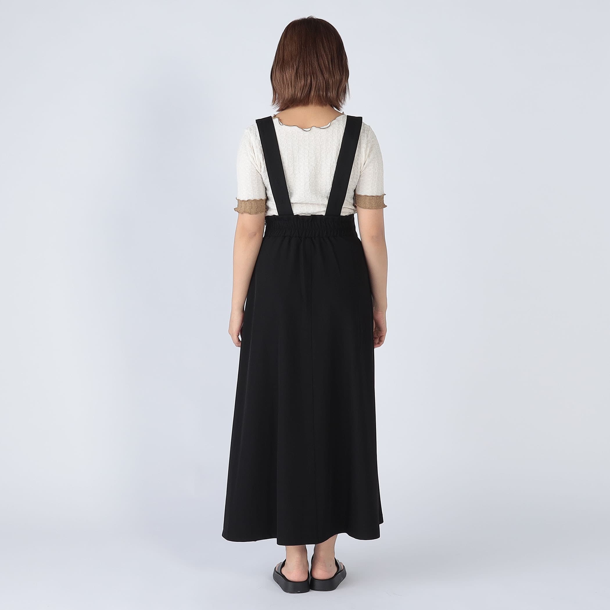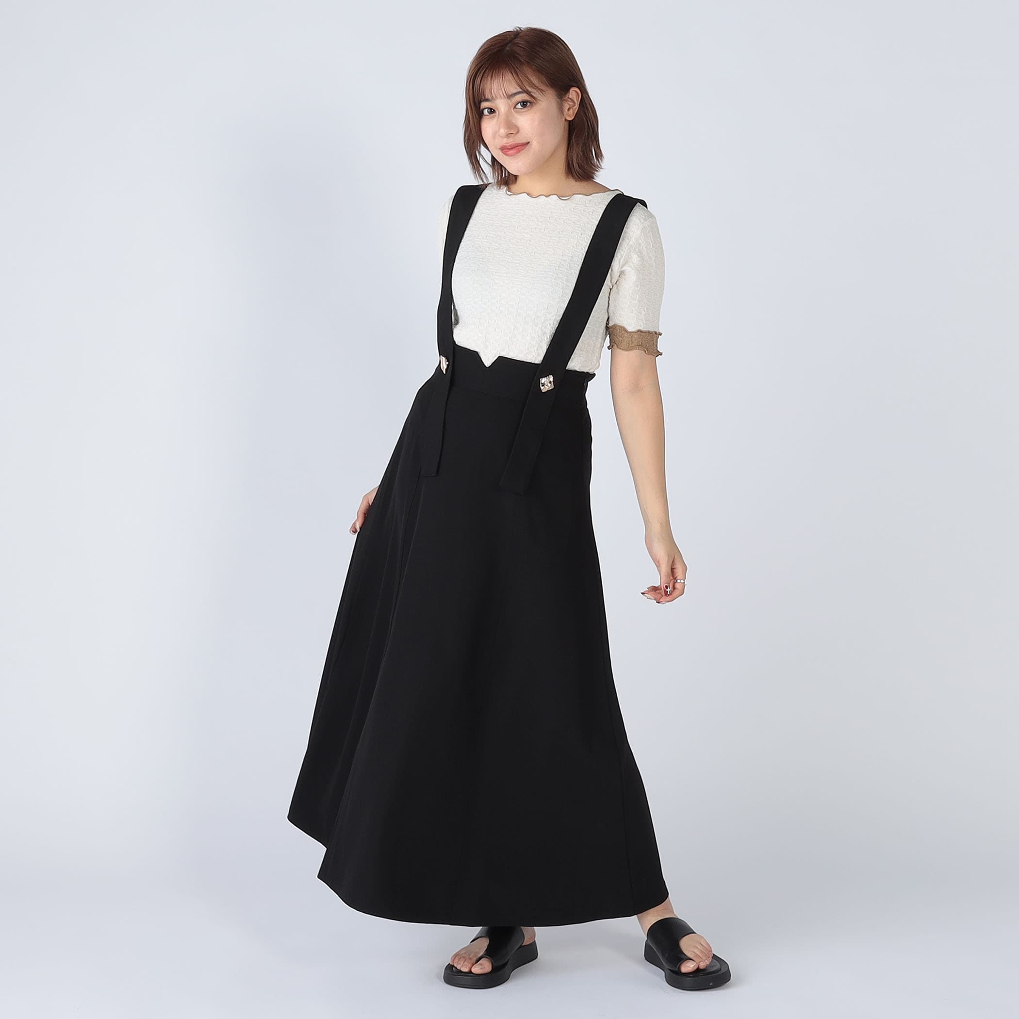 裾に向かって広がるフレアシルエットは身体のラインを拾わず、メリハリのあるハイウエストデザインは細見えするバランスに仕上げました。