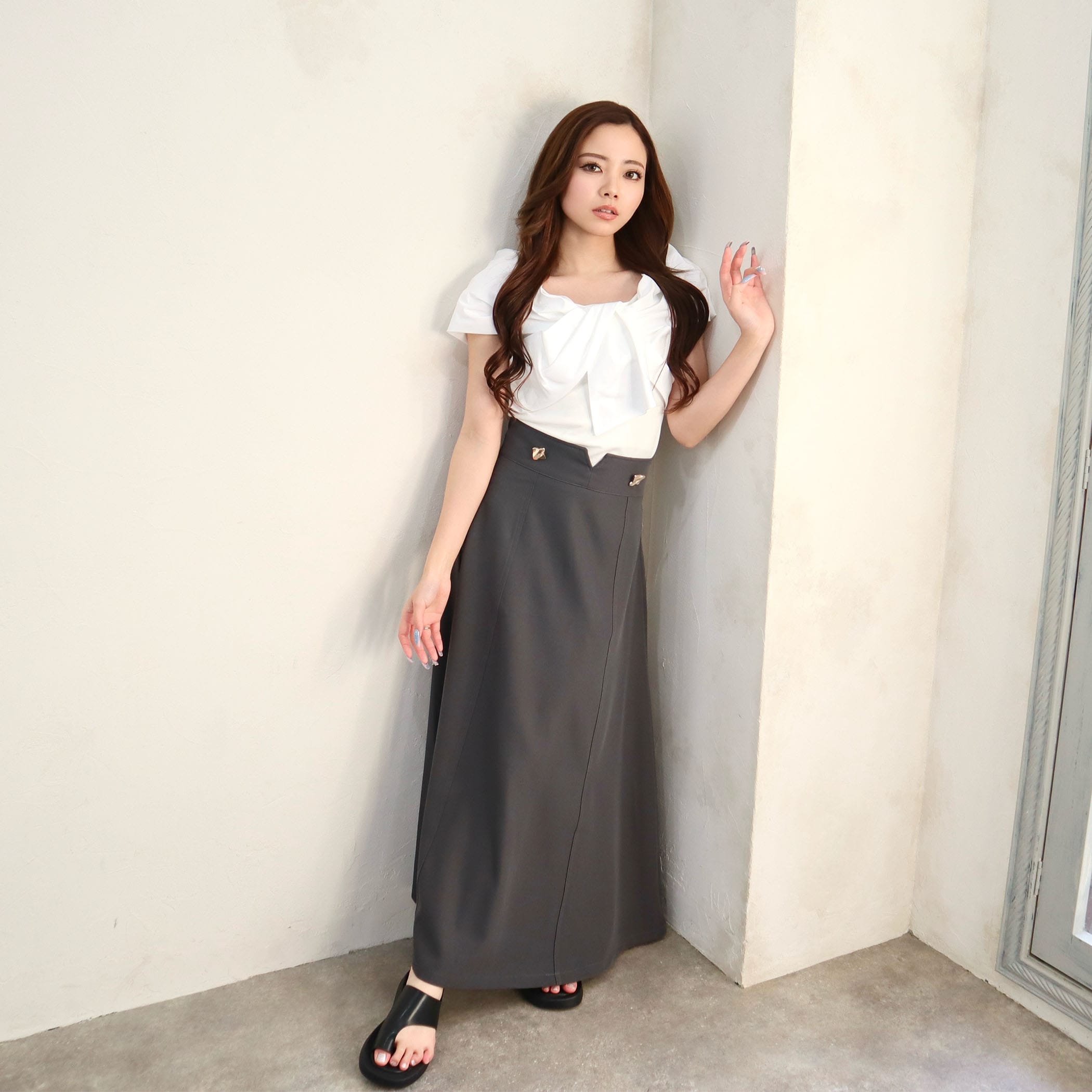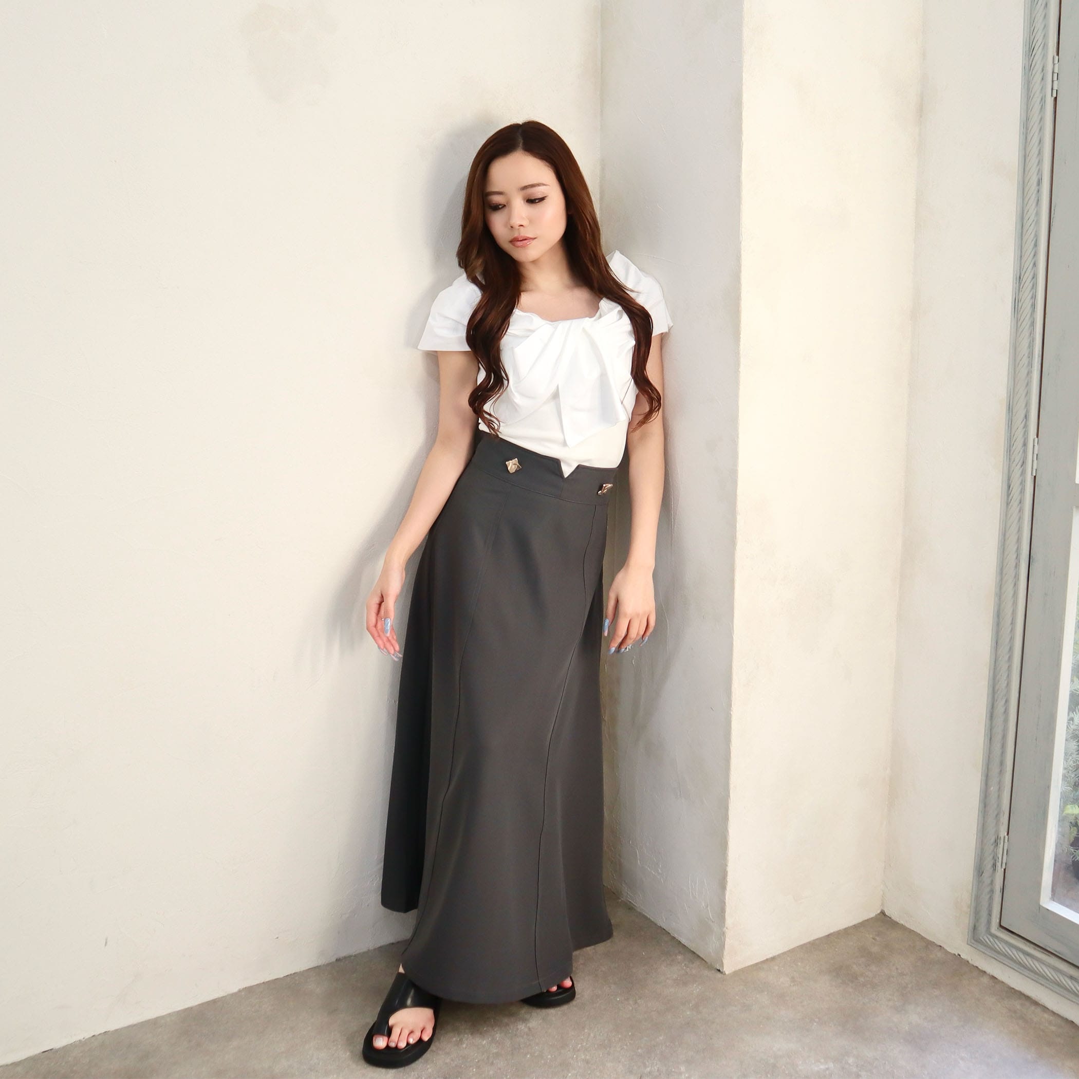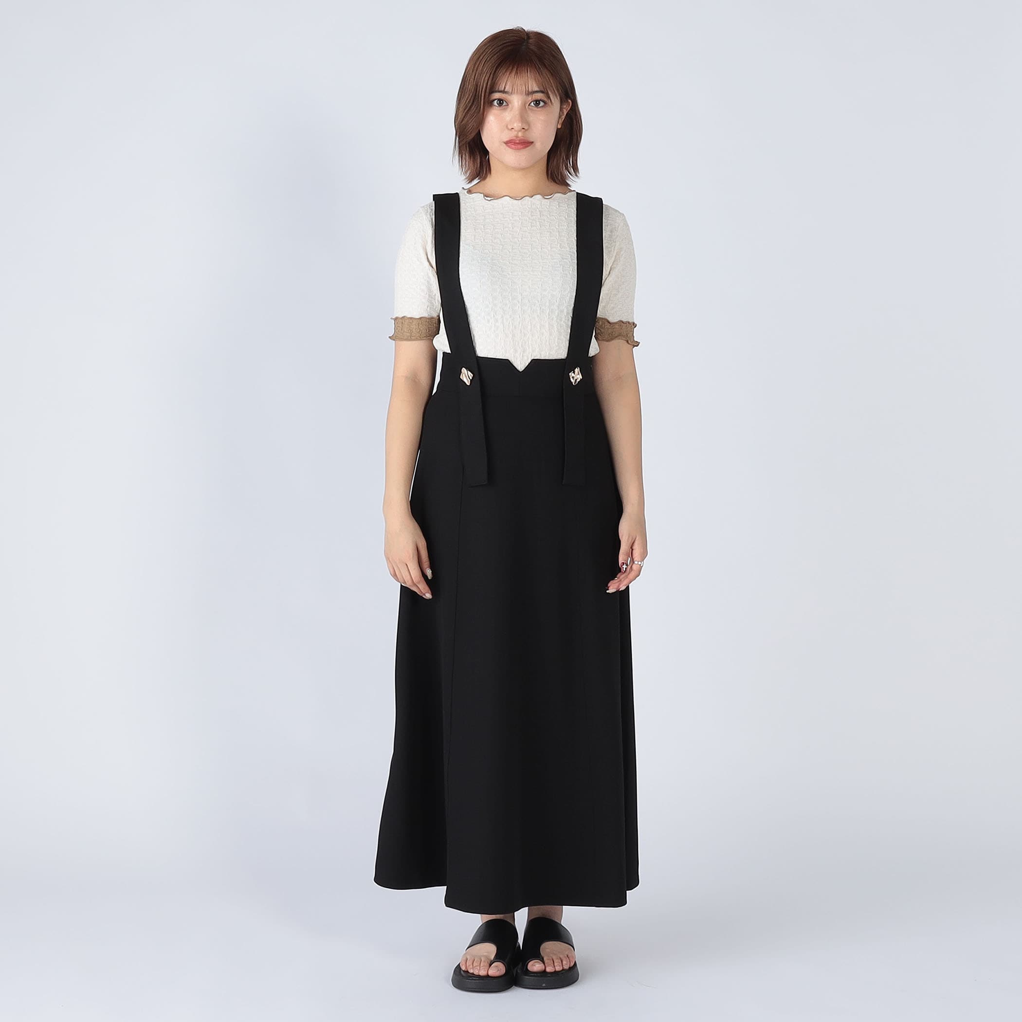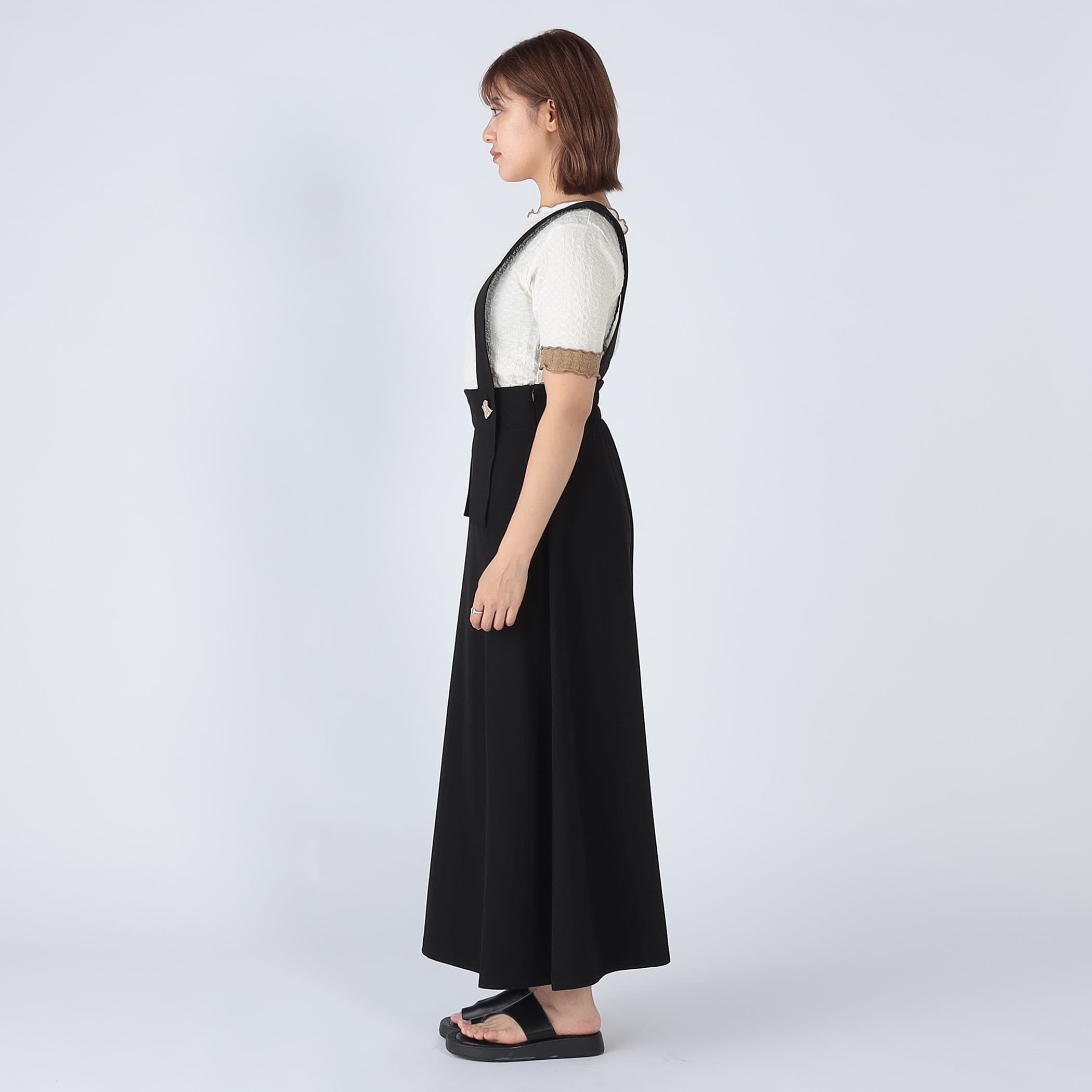 裾に向かって広がるフレアシルエットは身体のラインを拾わず、メリハリのあるハイウエストデザインは細見えするバランスに仕上げました。