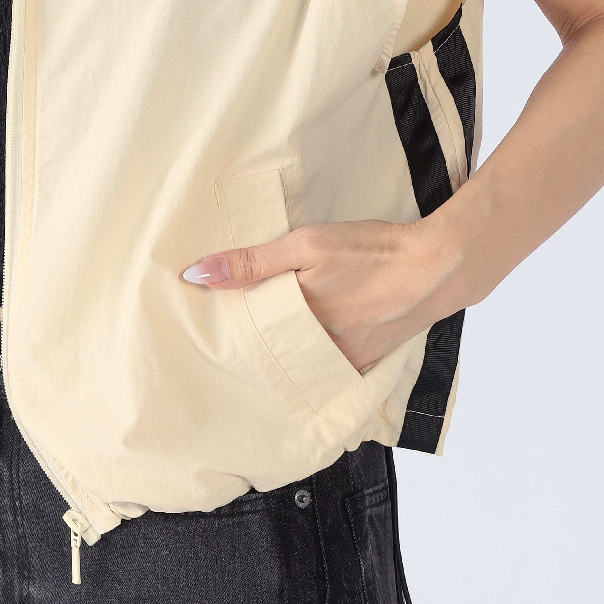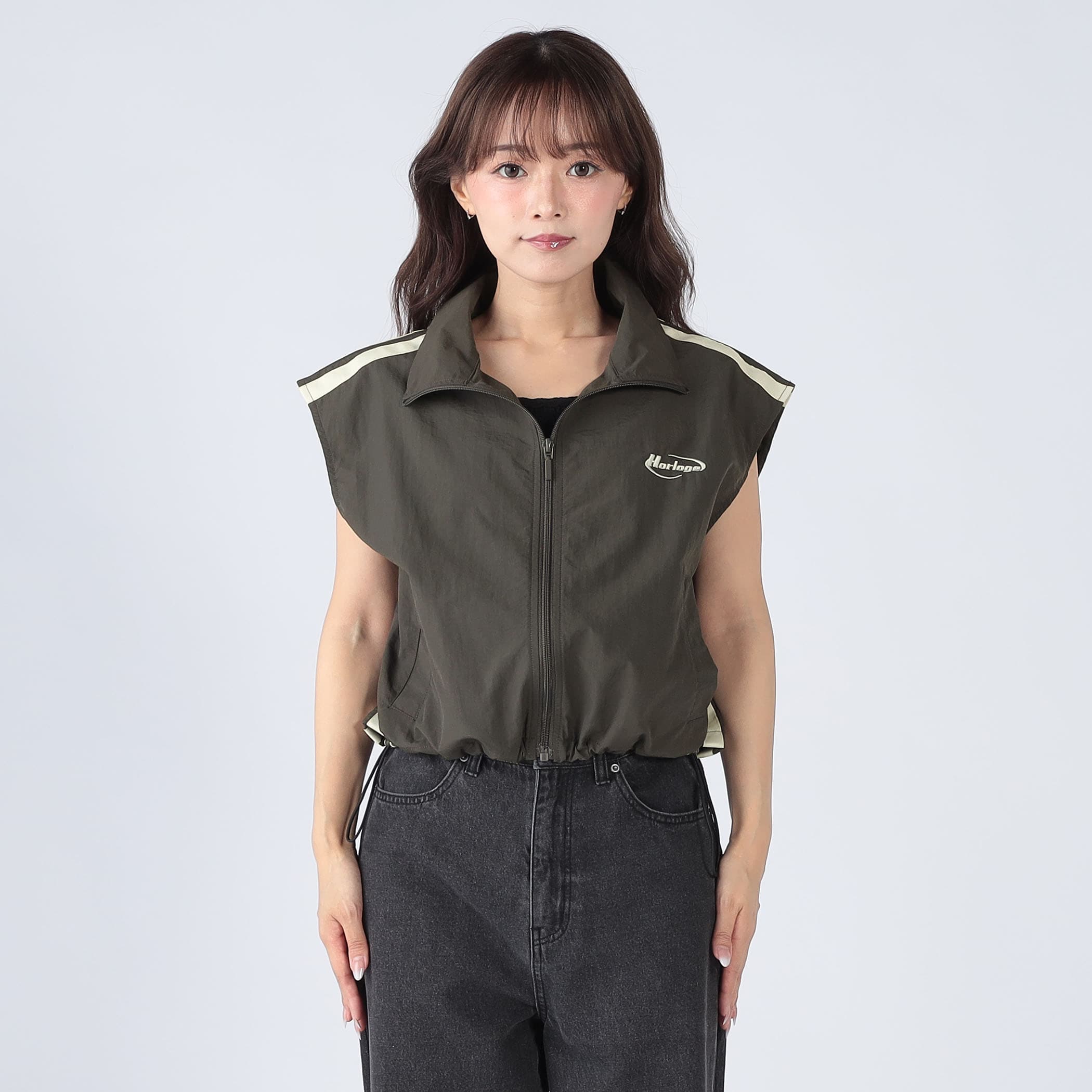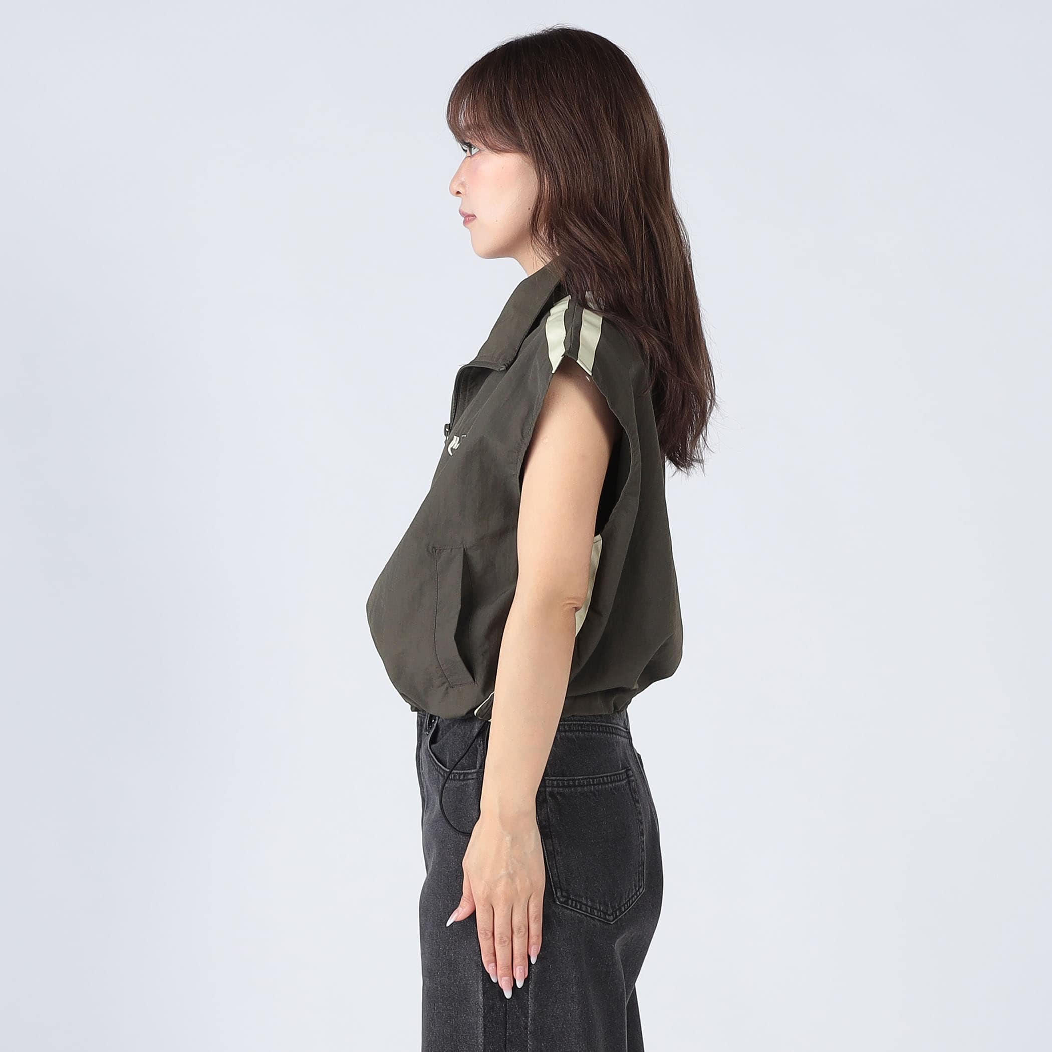 ライン使いがスポーティでオシャレなノースリーブブルゾン。裾がドロストになっていて、お好みのシルエットでサイズ感を調整できます。パンツスタイルはもちろん、スカートと合わせでも程よくガーリーに着用できるのでオススメです。