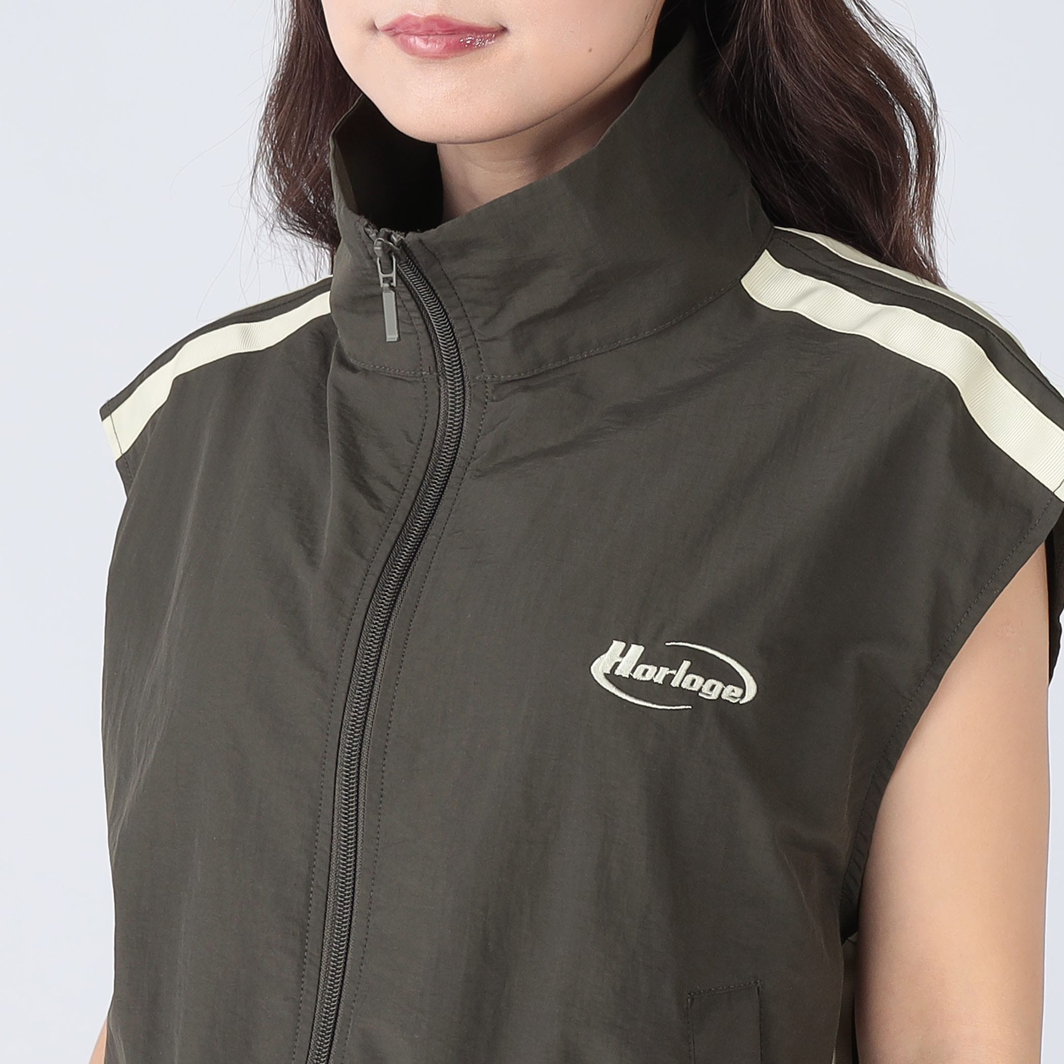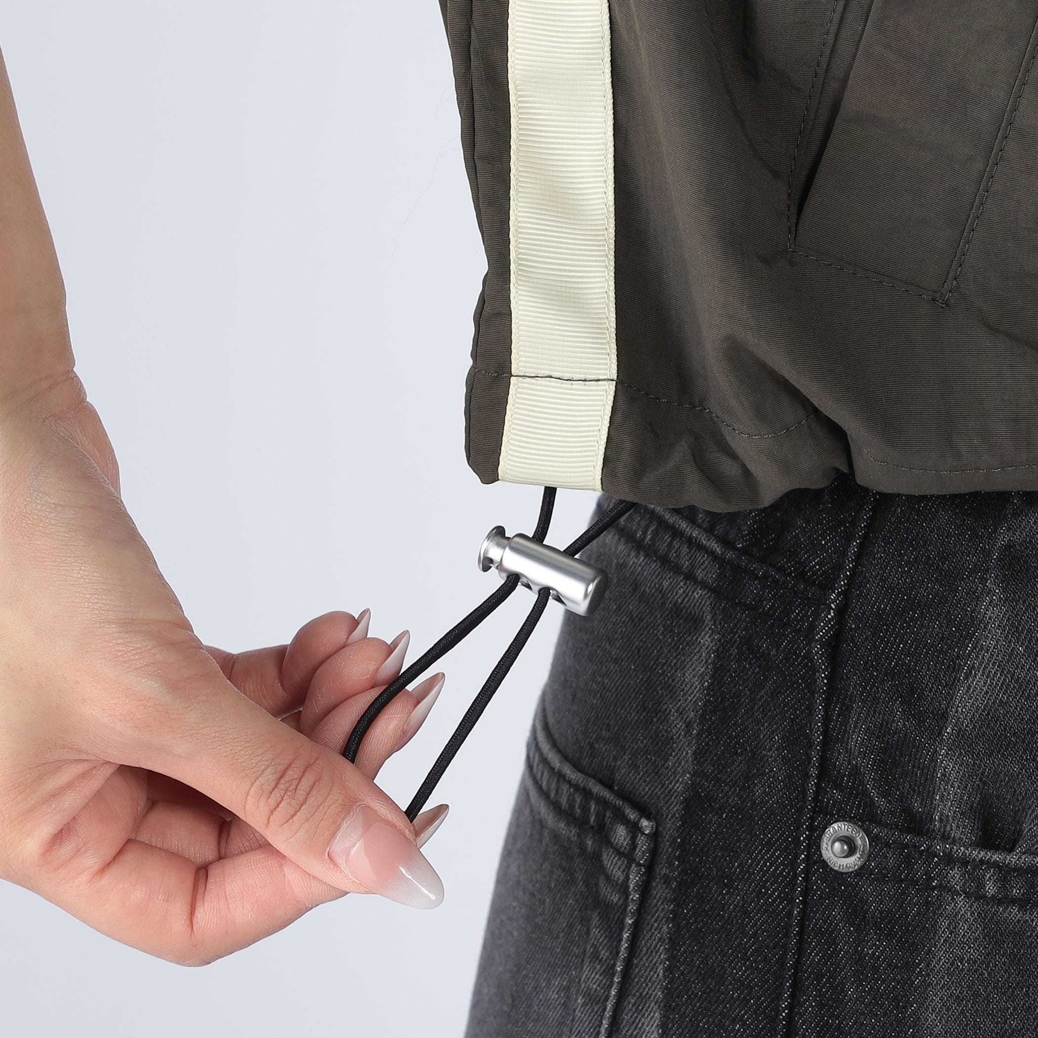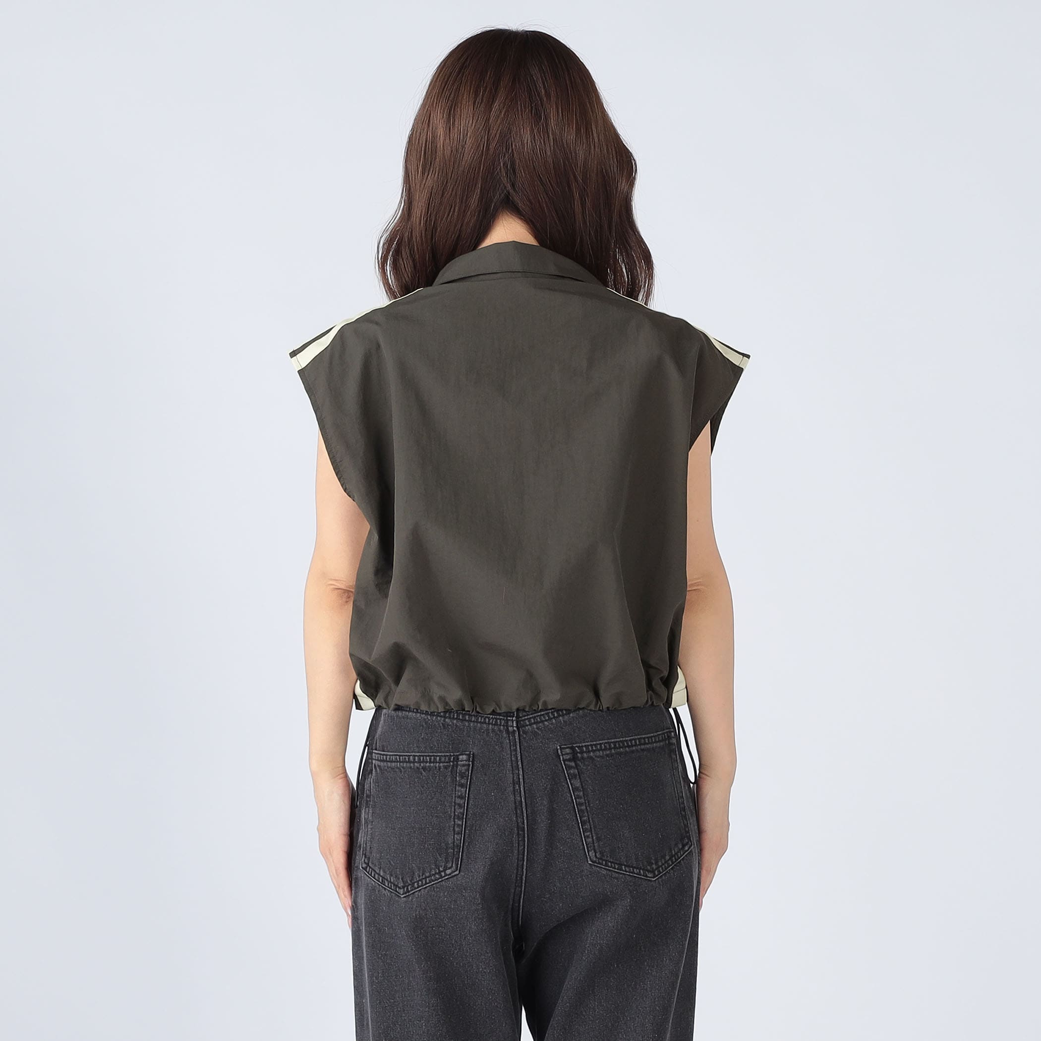 ライン使いがスポーティでオシャレなノースリーブブルゾン。裾がドロストになっていて、お好みのシルエットでサイズ感を調整できます。パンツスタイルはもちろん、スカートと合わせでも程よくガーリーに着用できるのでオススメです。