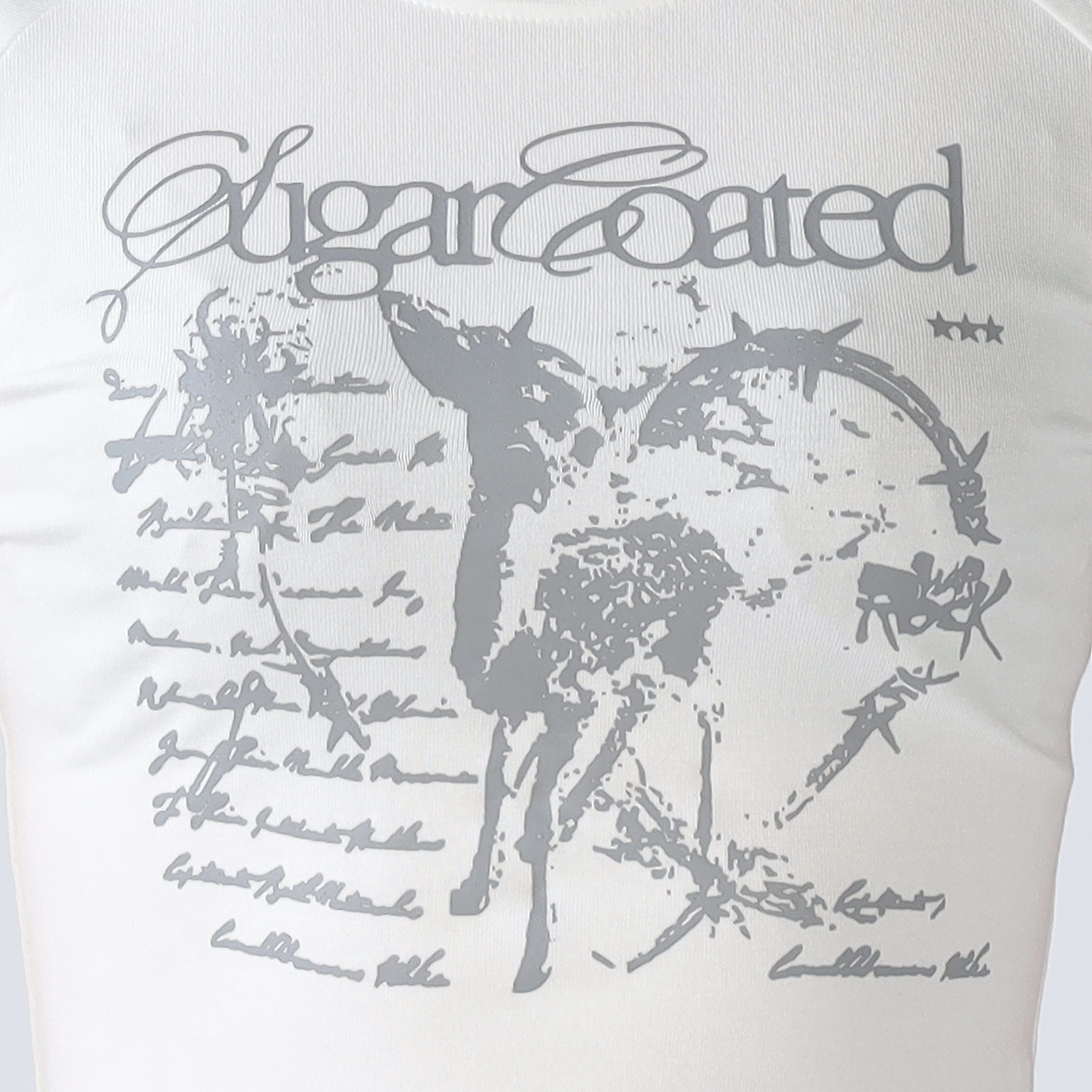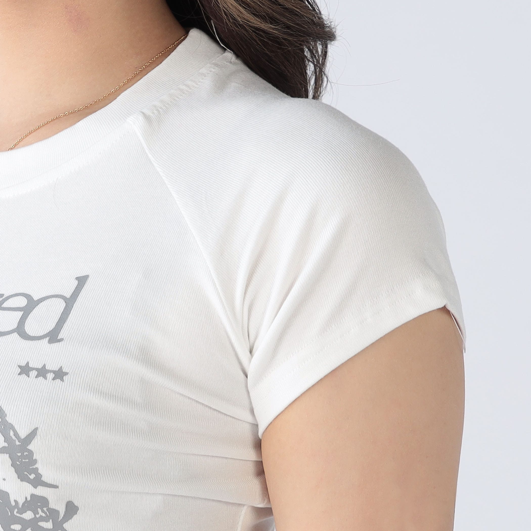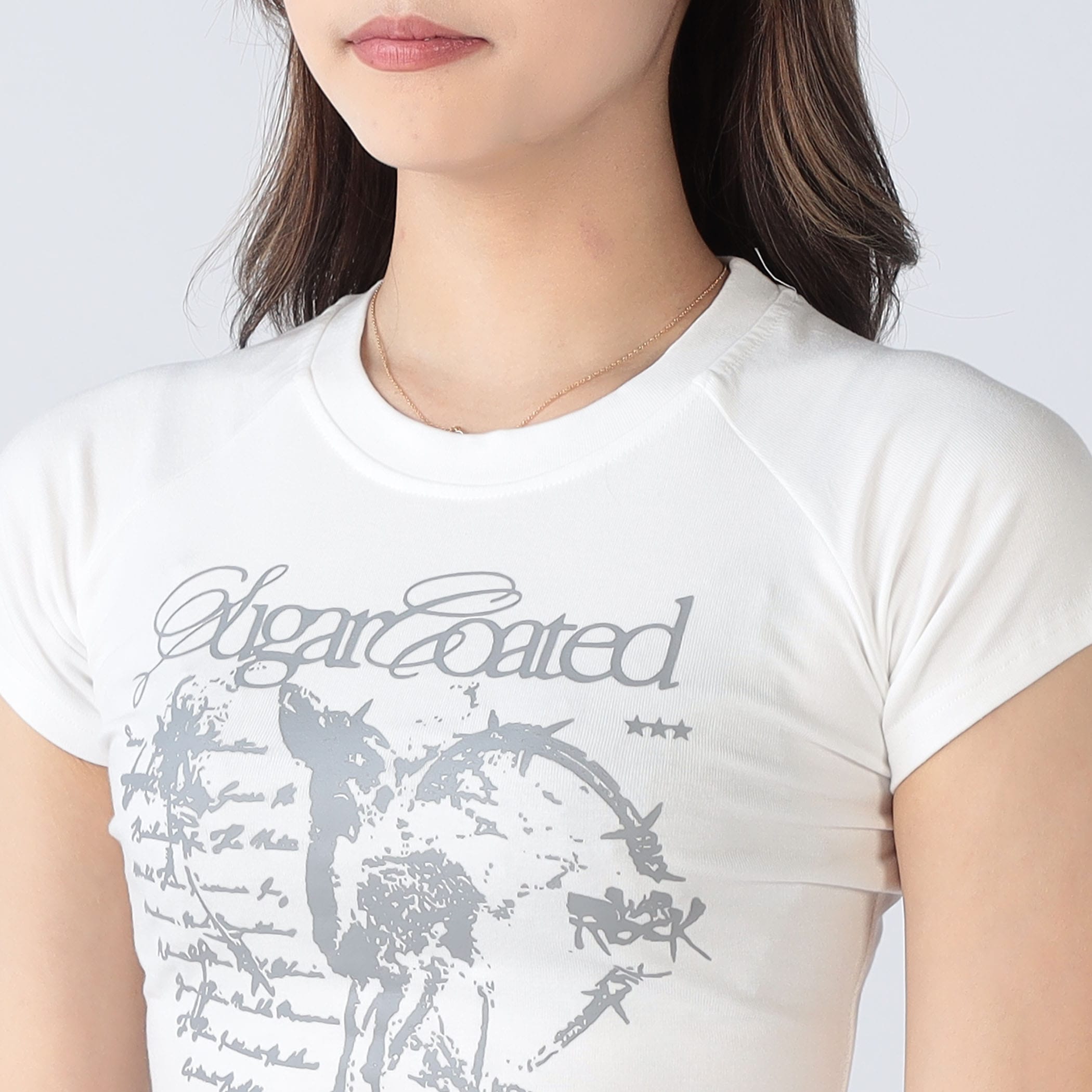 コンパクトなシルエットに映えるロゴがアクセント。裾のフリルで、さりげないガーリー感もプラス。デニムやカーゴパンツと合わせて、抜け感のあるY2Kスタイルに。
