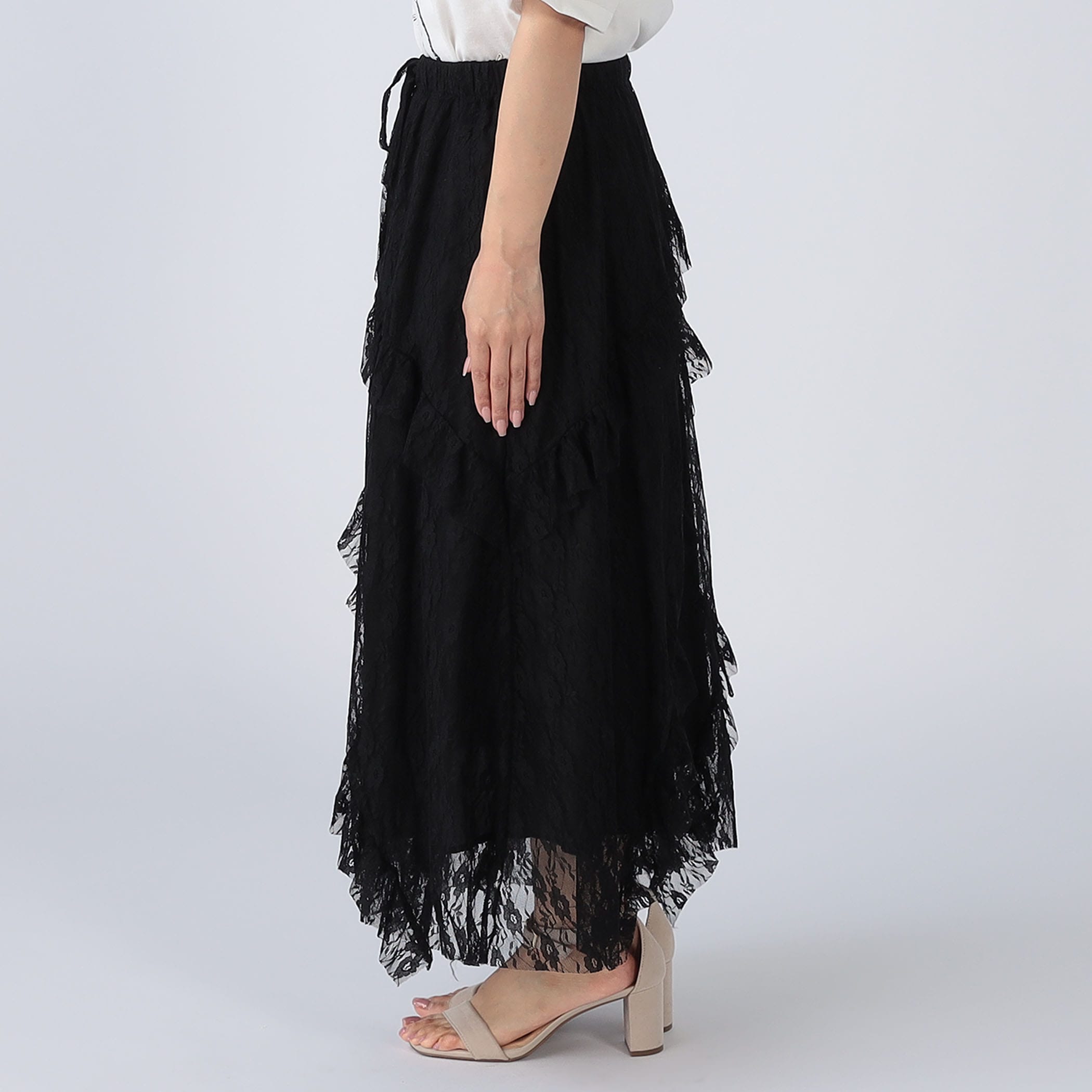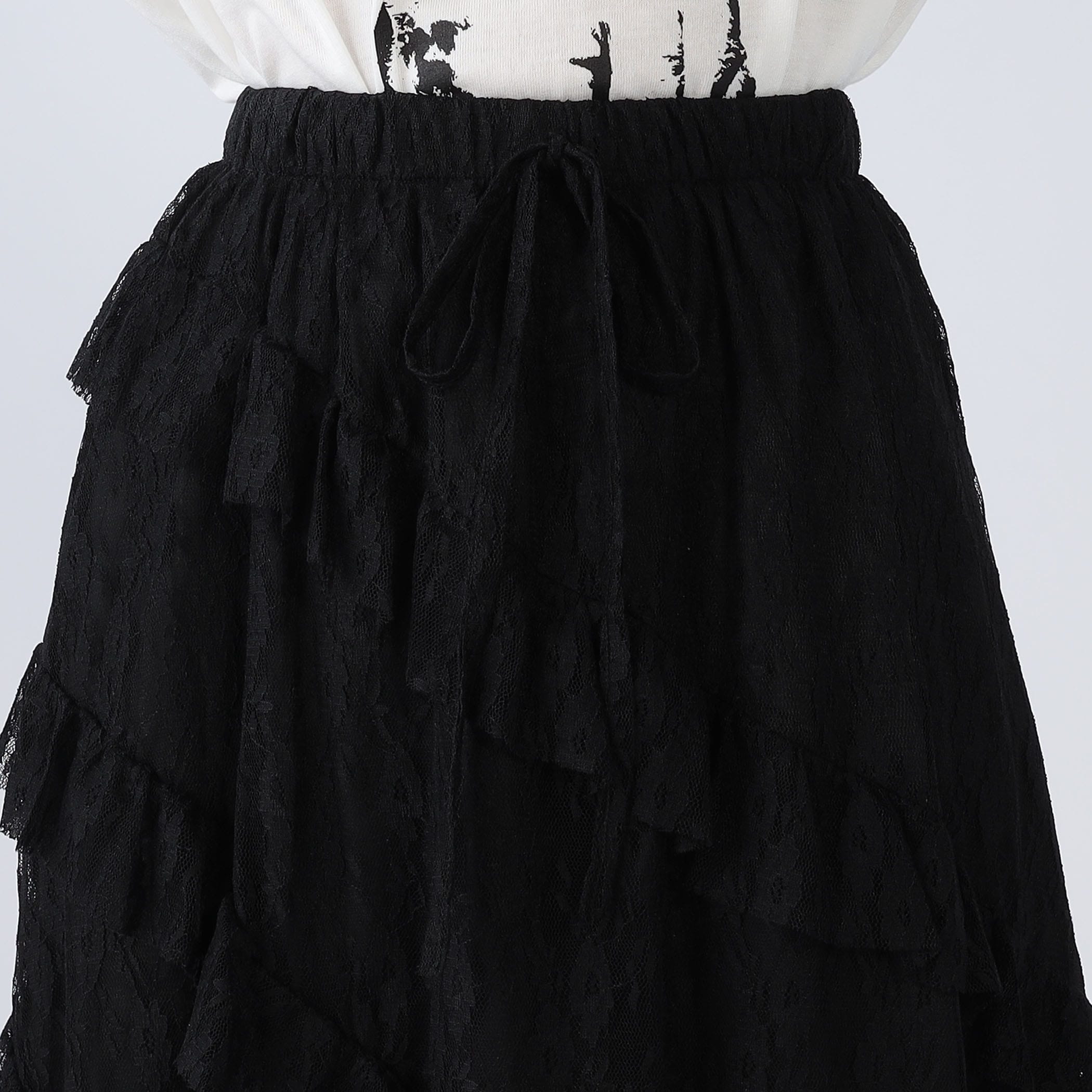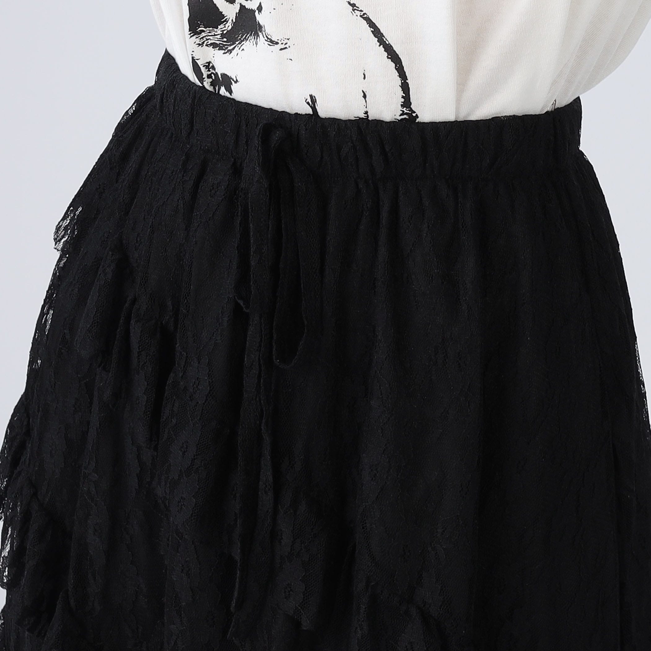動きのあるフリルデザインと総レースのコンビが、カジュアルにもフェミニンにもマッチ。Tシャツやスウェットと合わせて、抜け感ある大人コーデに。