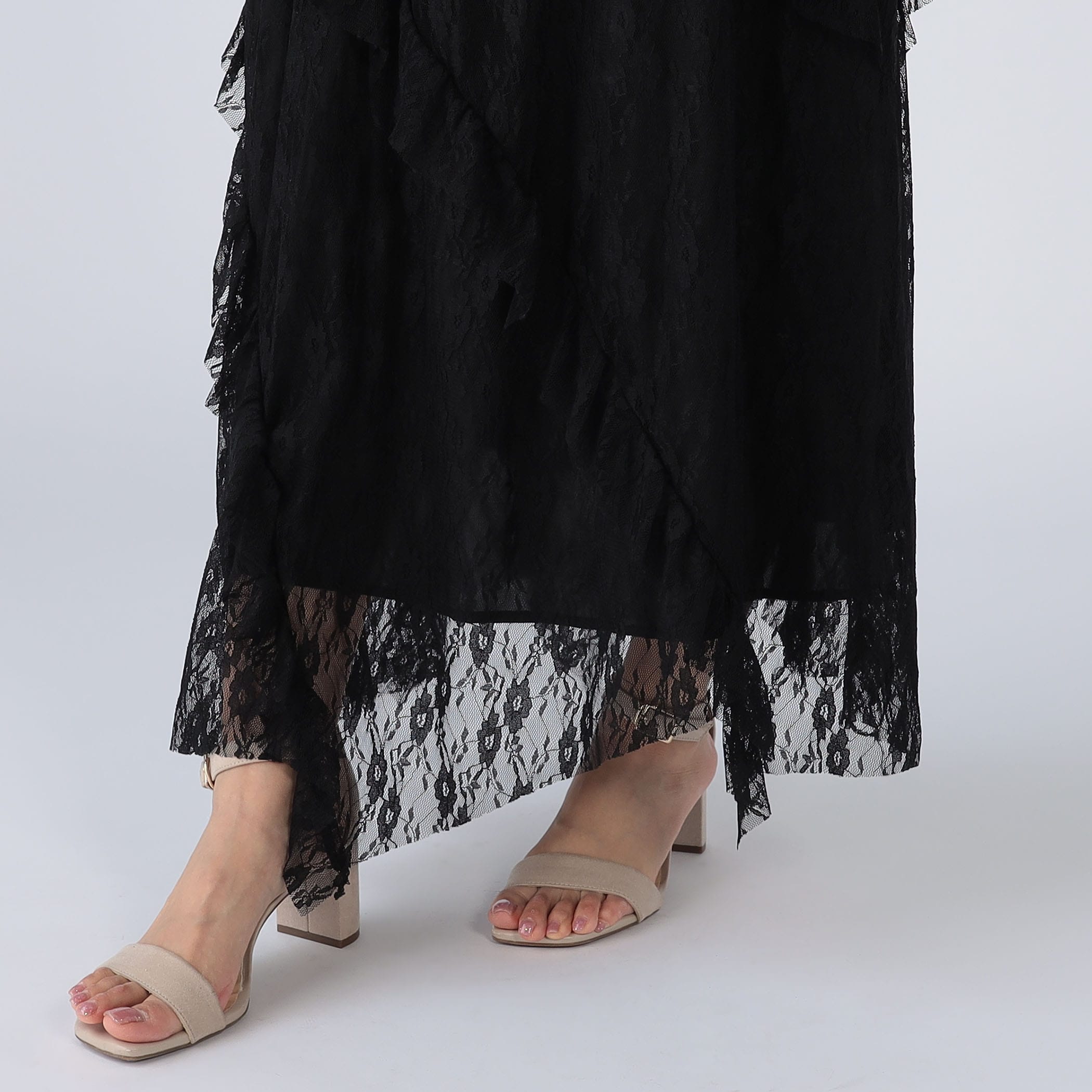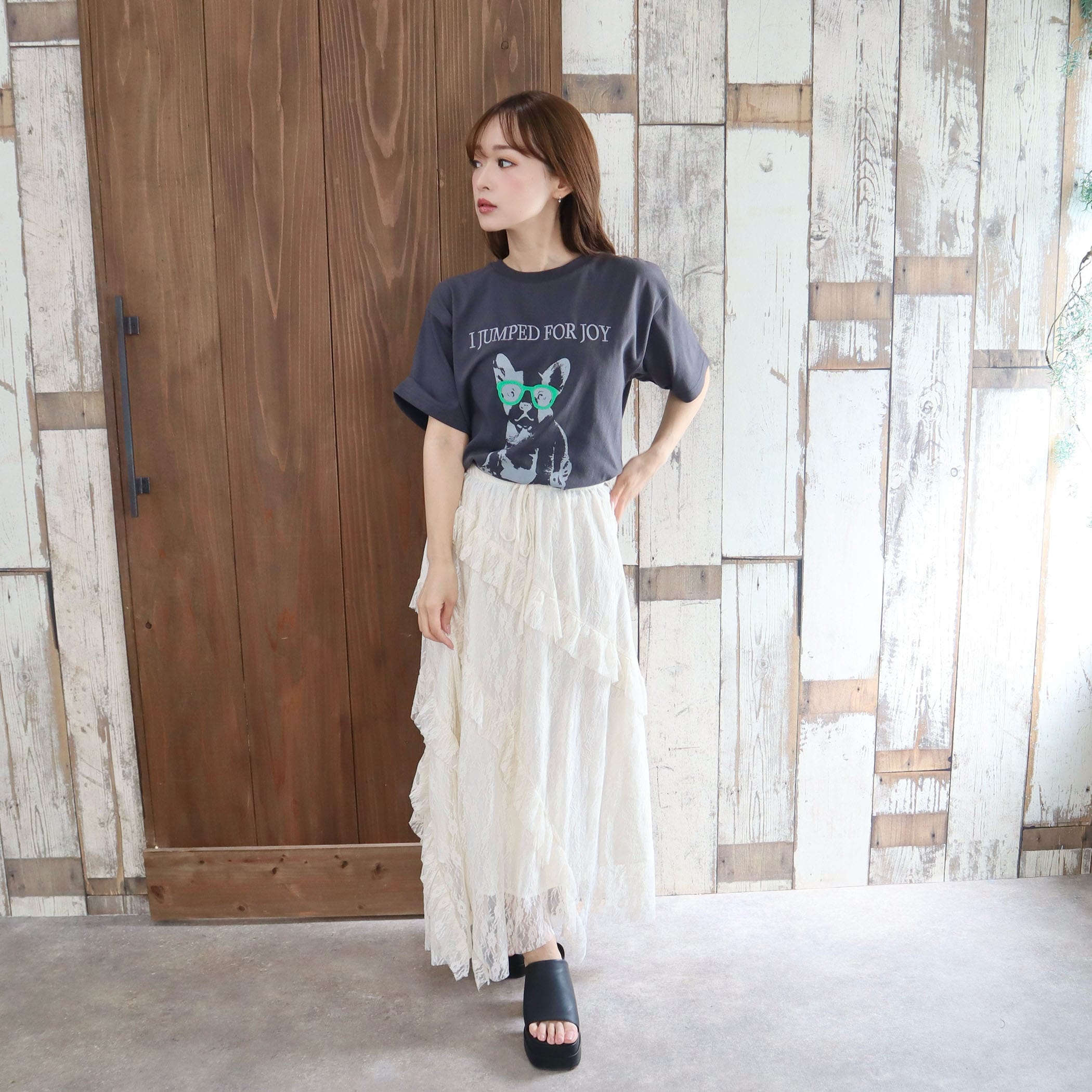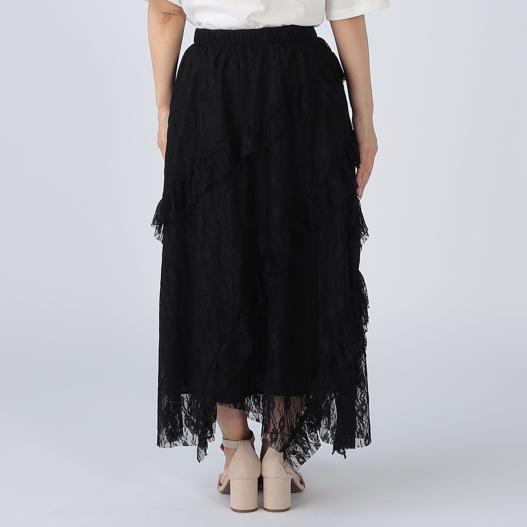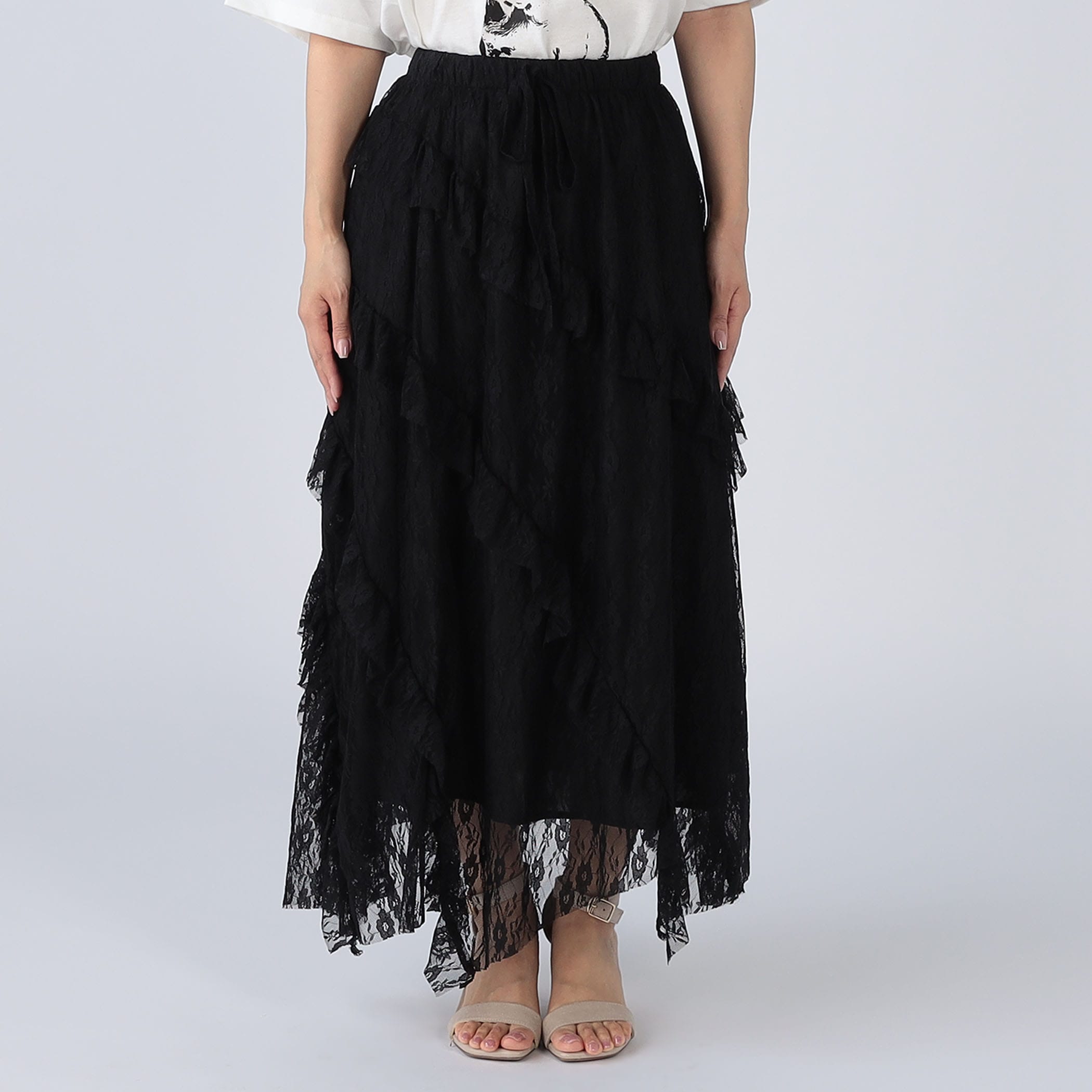 動きのあるフリルデザインと総レースのコンビが、カジュアルにもフェミニンにもマッチ。Tシャツやスウェットと合わせて、抜け感ある大人コーデに。