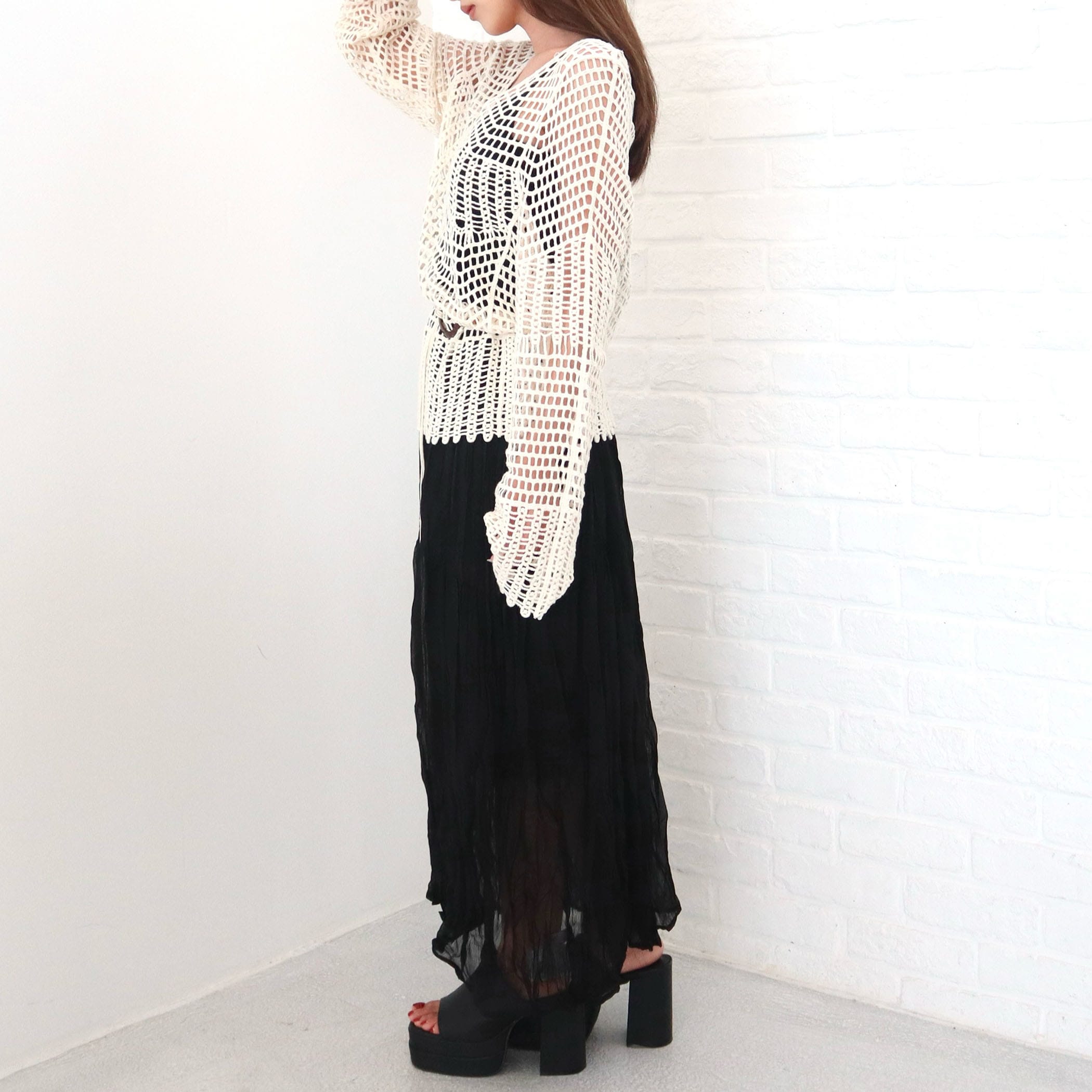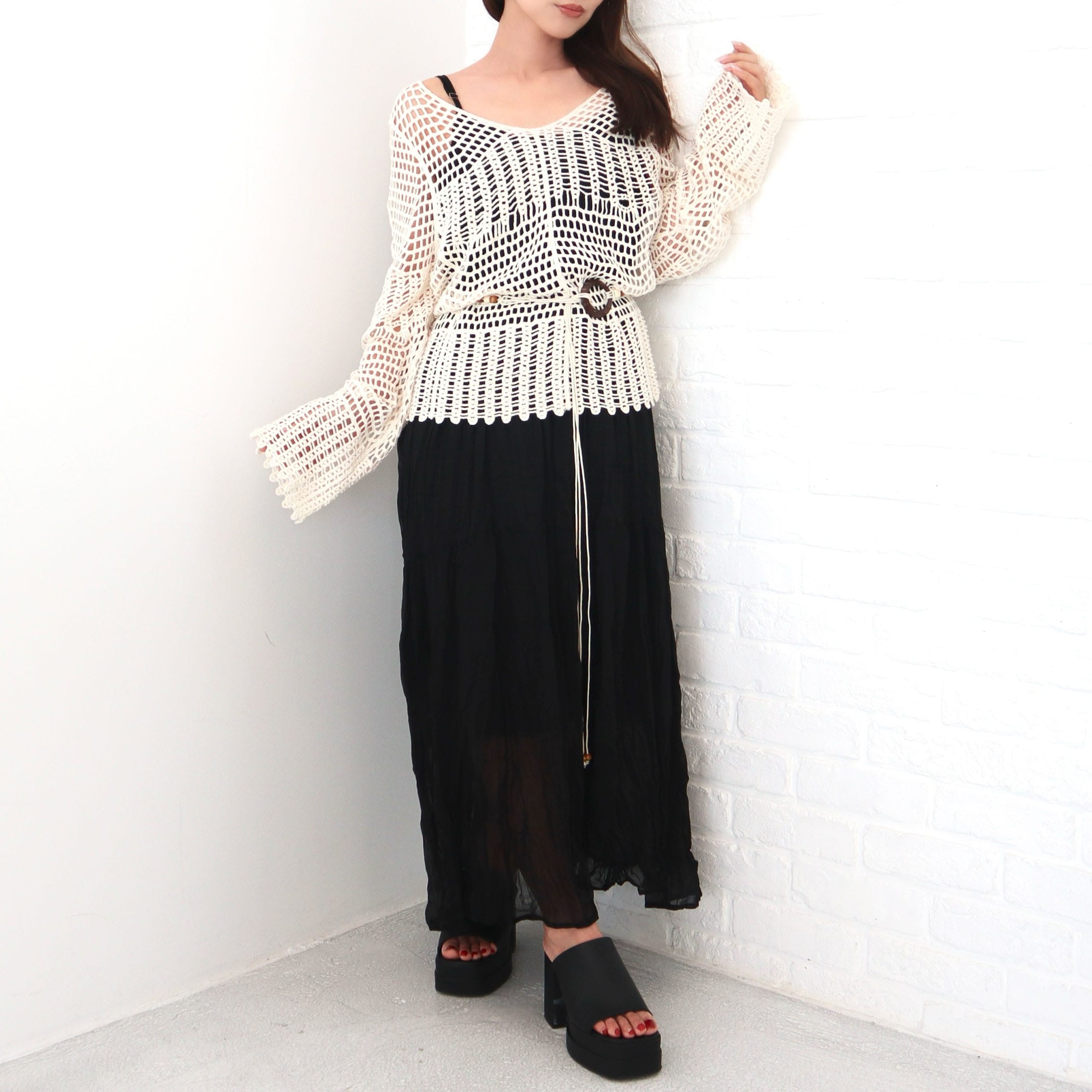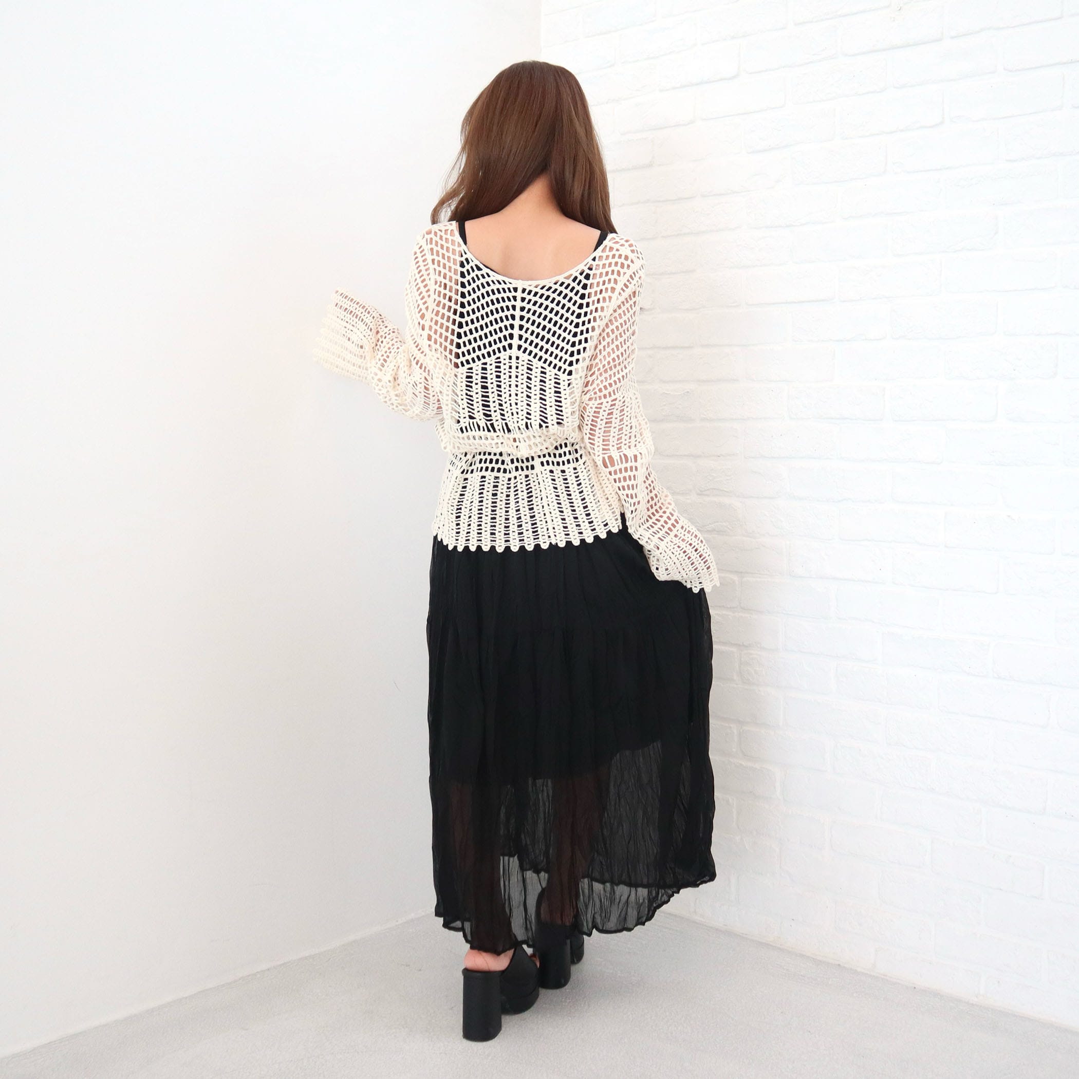 揺れ感が美しいロングキャミワンピ―スと、ナチュラルな透け感のクロシェ編みのニットが絶妙なバランス。リラックス感と女性らしさを両立した、今っぽスタイルがこれ1枚で完成。