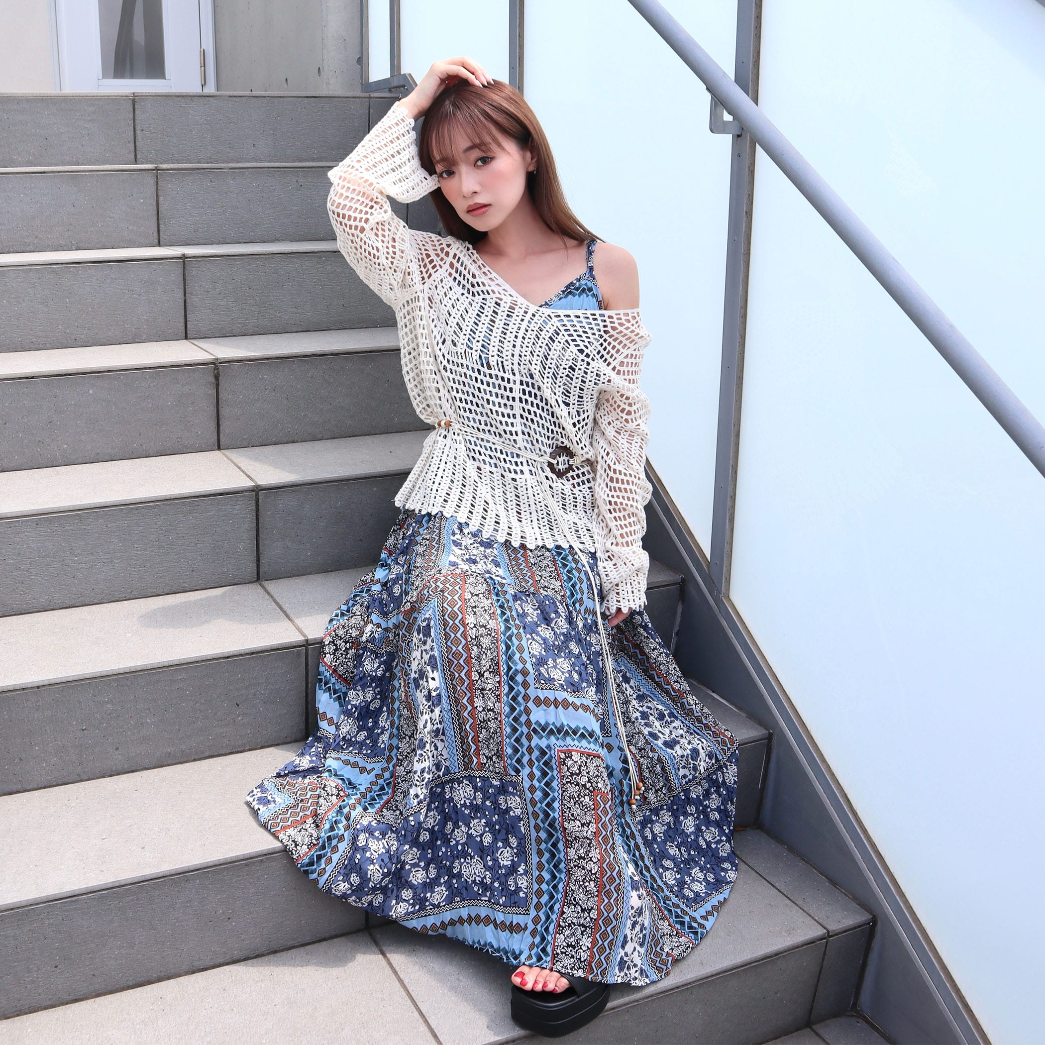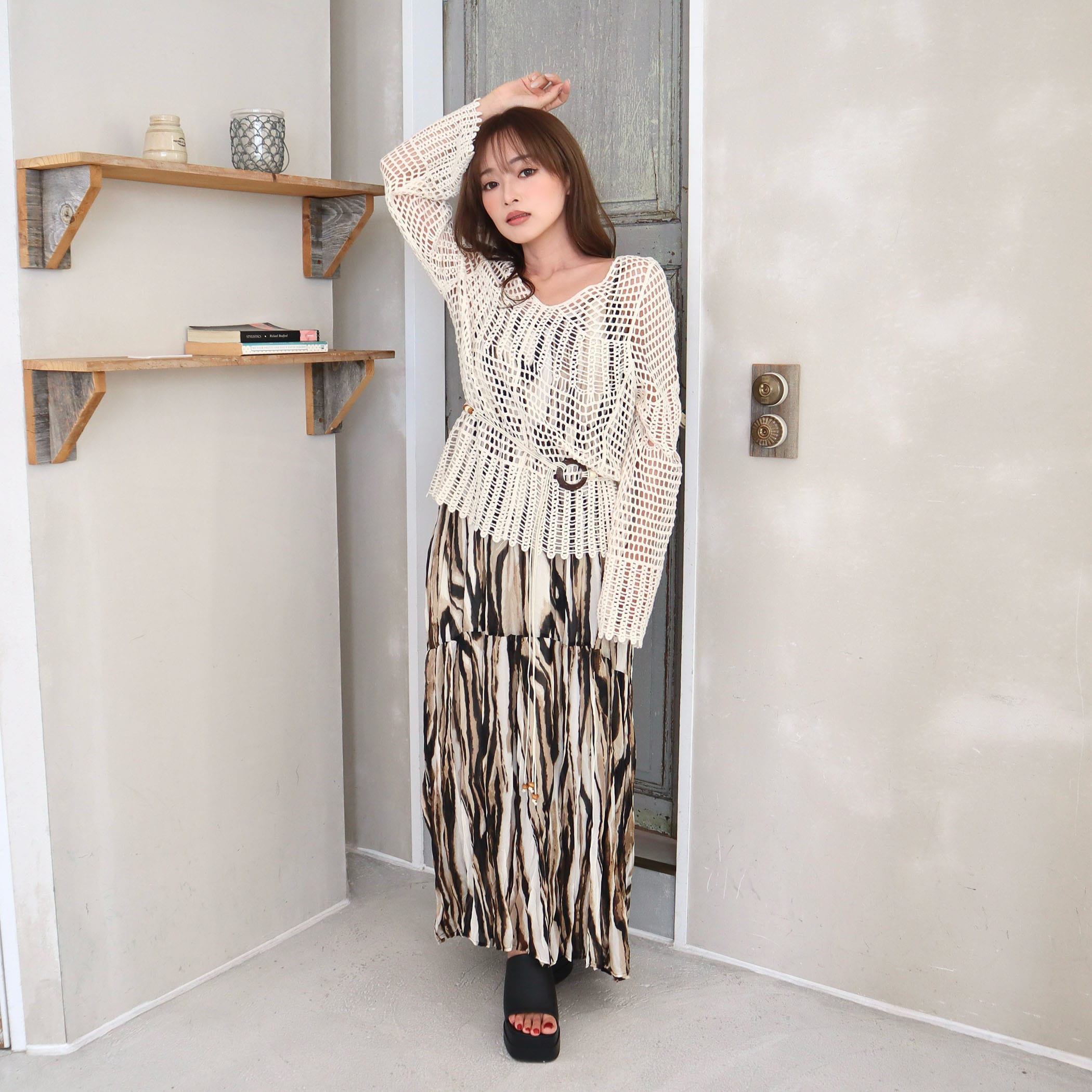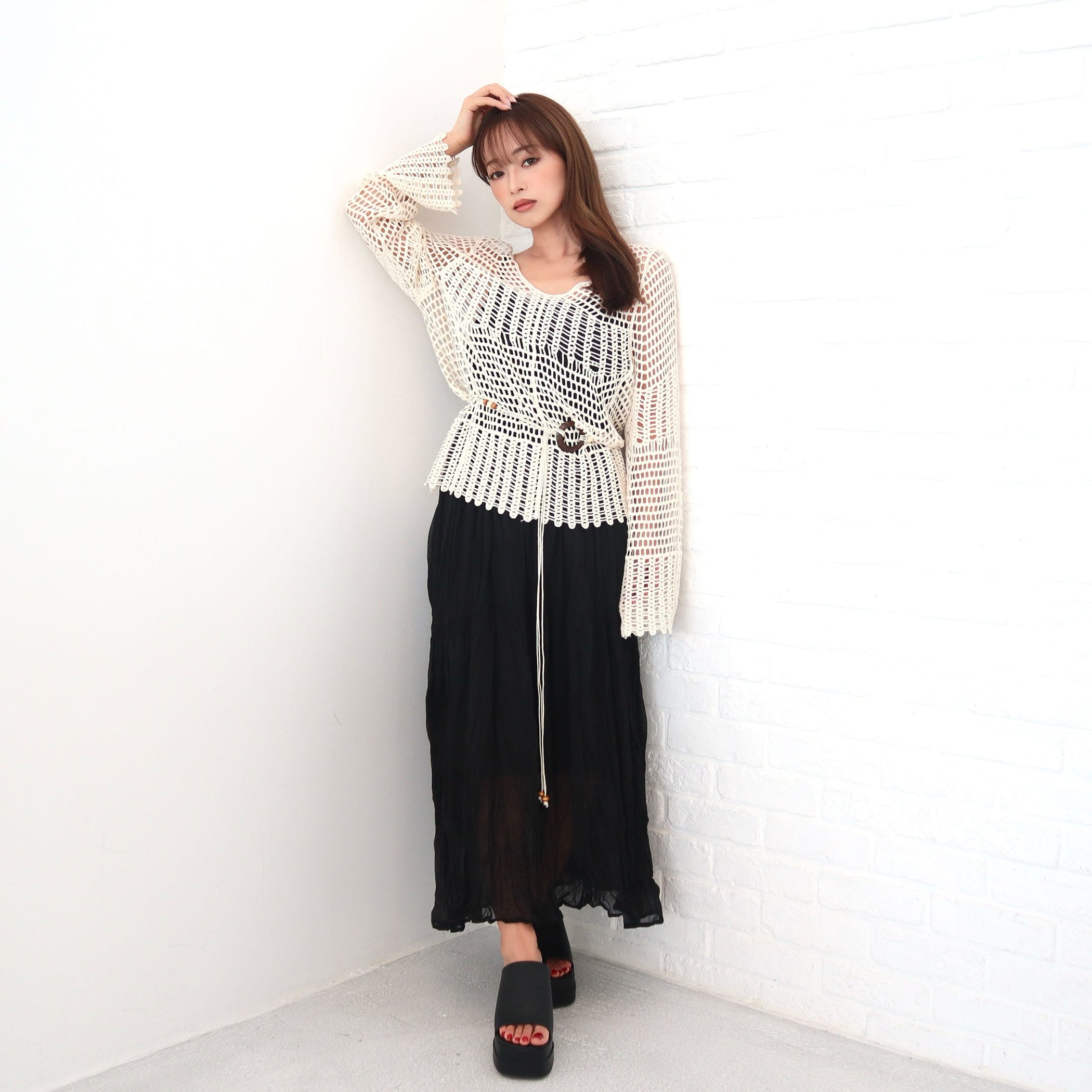 揺れ感が美しいロングキャミワンピ―スと、ナチュラルな透け感のクロシェ編みのニットが絶妙なバランス。リラックス感と女性らしさを両立した、今っぽスタイルがこれ1枚で完成。