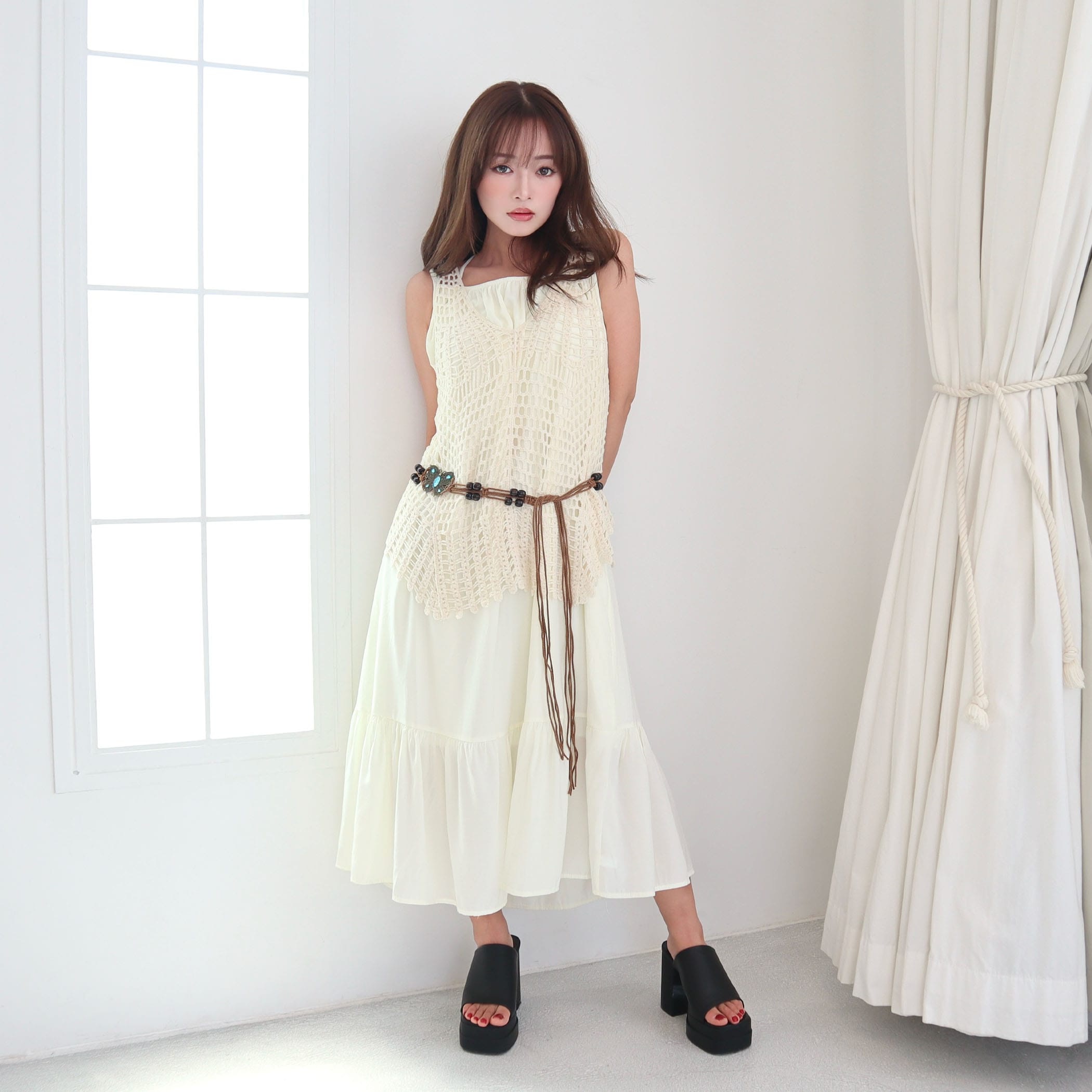 ふんわり広がるティアードフレアが大人可愛いワンピピースにナチュラルな透け感が魅力のクロシェニットをレイヤード。軽やかで季節感たっぷりの着こなしが、これ一組で完成。単品使いもでき着回し力も抜群です。