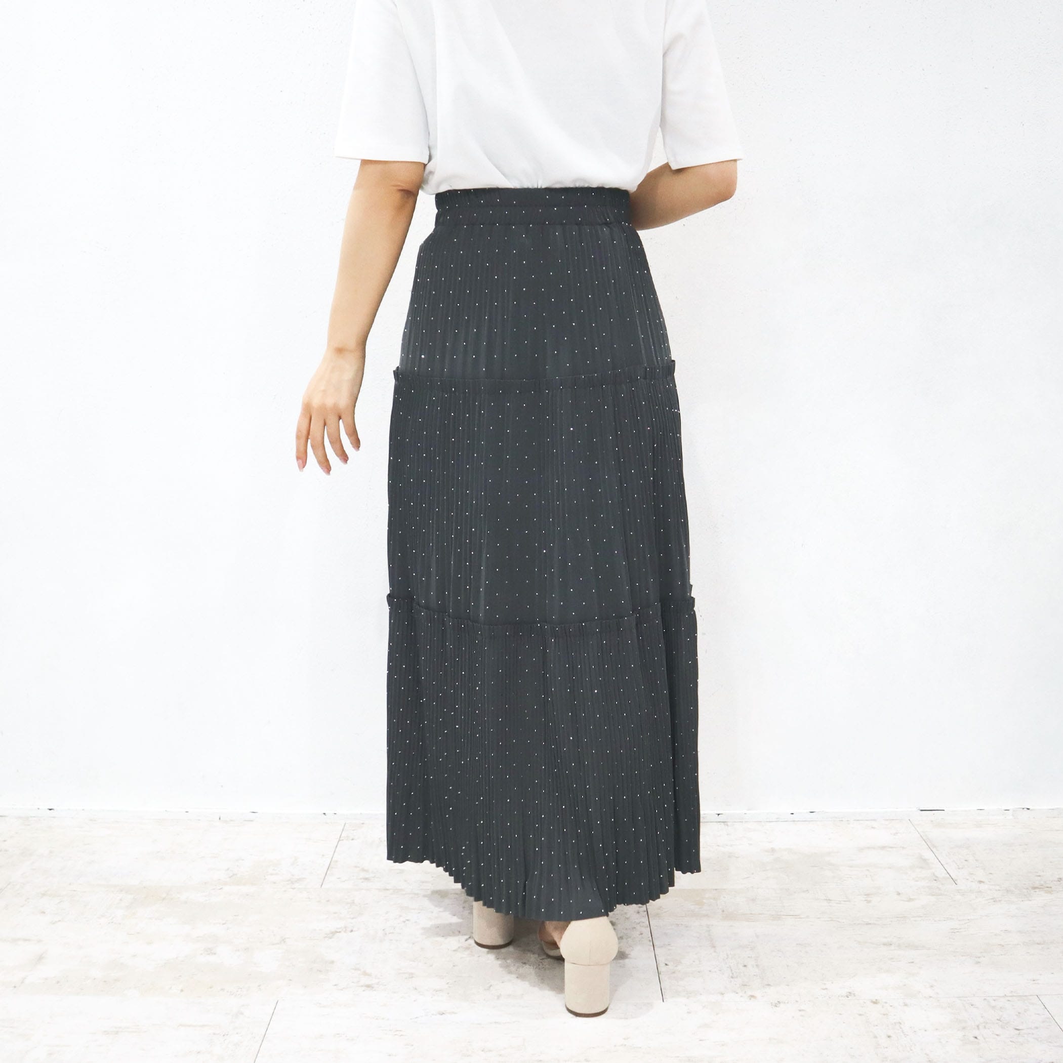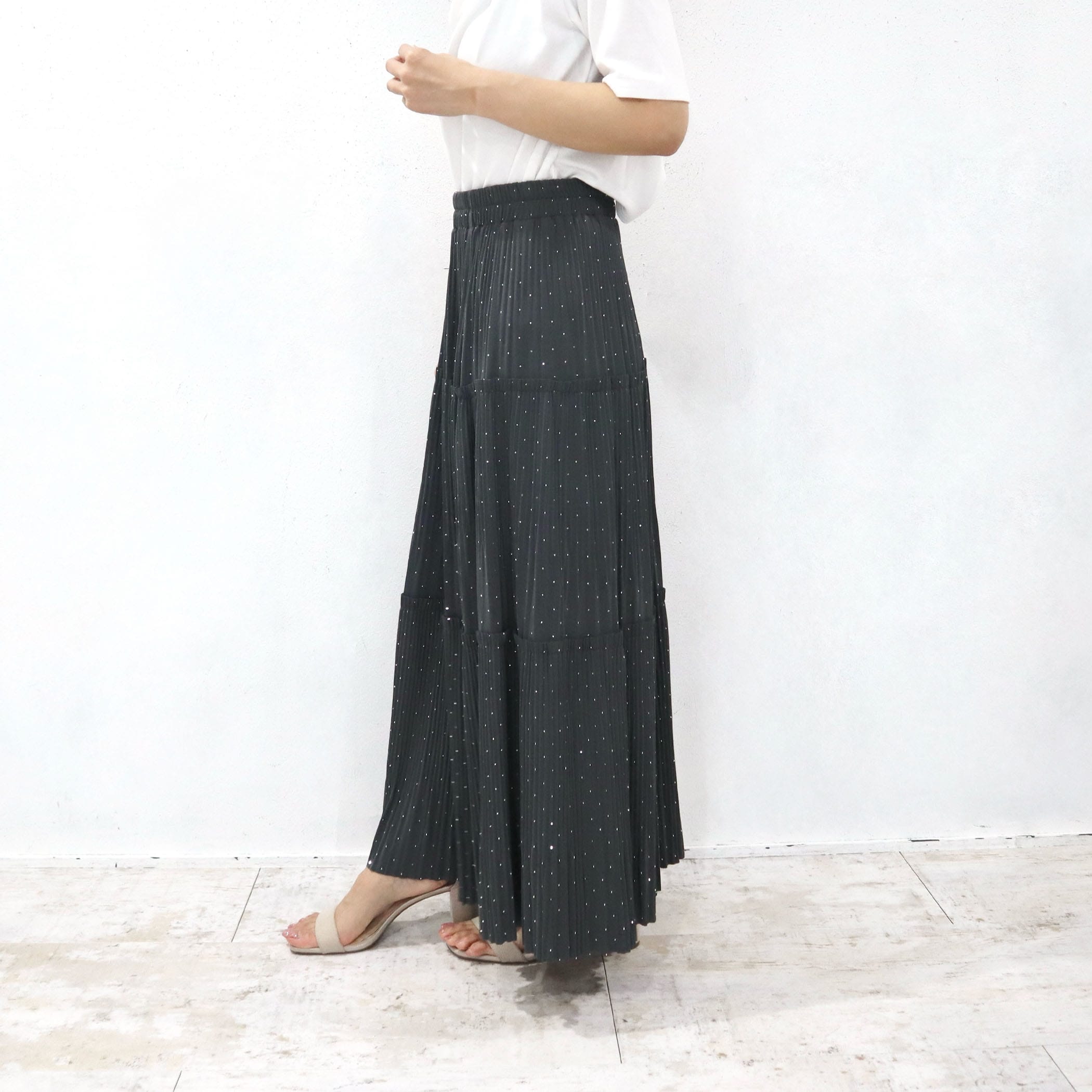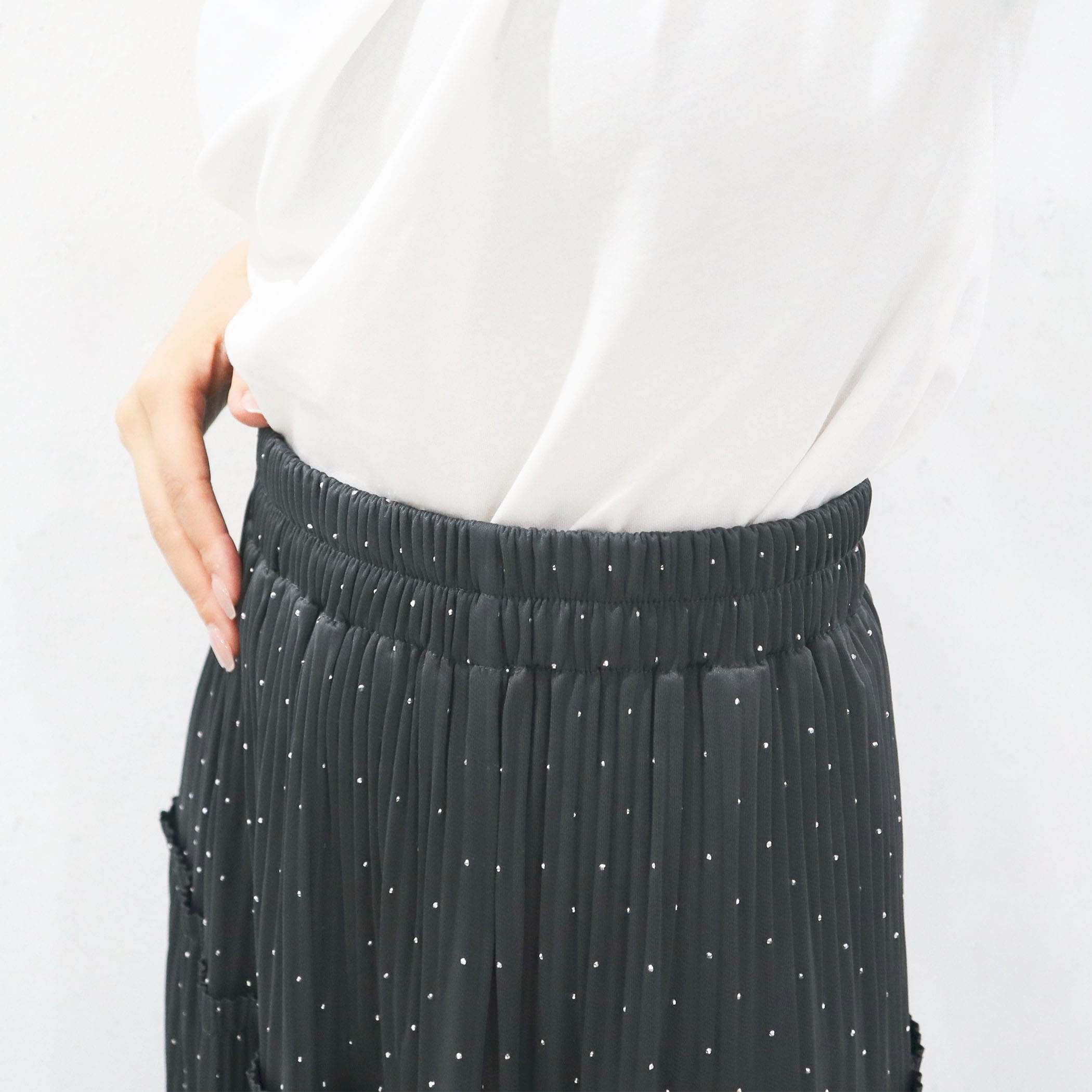 キラキラ輝くジルコンが華やぐスカート。着用するだけでコーディネートの主役になるアイテムです。シンプルなデザインのトップスやパンプスなどと合わせれば、オフィスカジュアルコーデに。オーバーサイズのスウェットなど大きめサイズのトップスと合わせればガーリーカジュアルなコーデに◎ボリュームのあるシューズと合わせれば韓国ファッション風にと合わせるアイテム次第で雰囲気がガラリと変わり、遊び心のあるスカートです。合わせるアイテム次第で