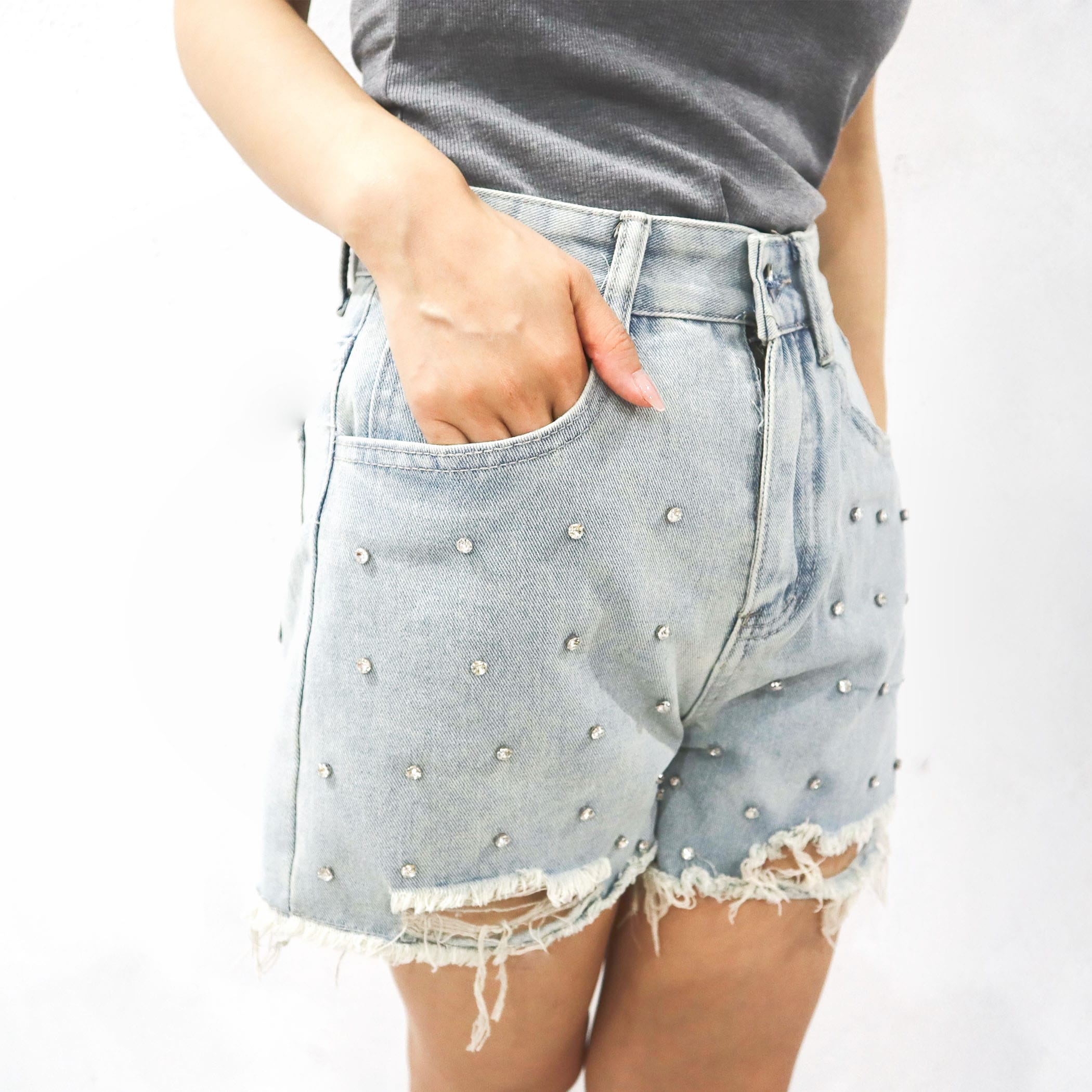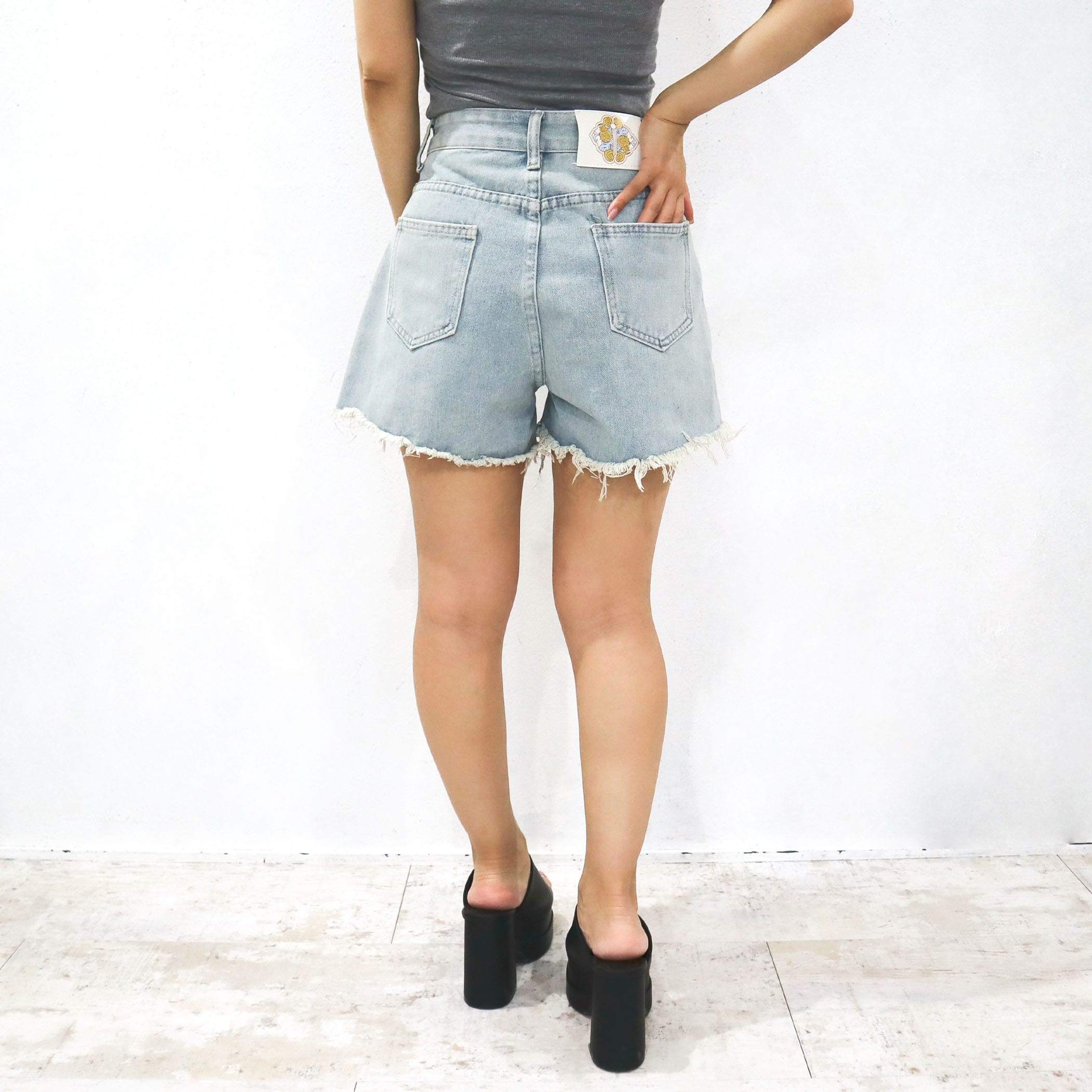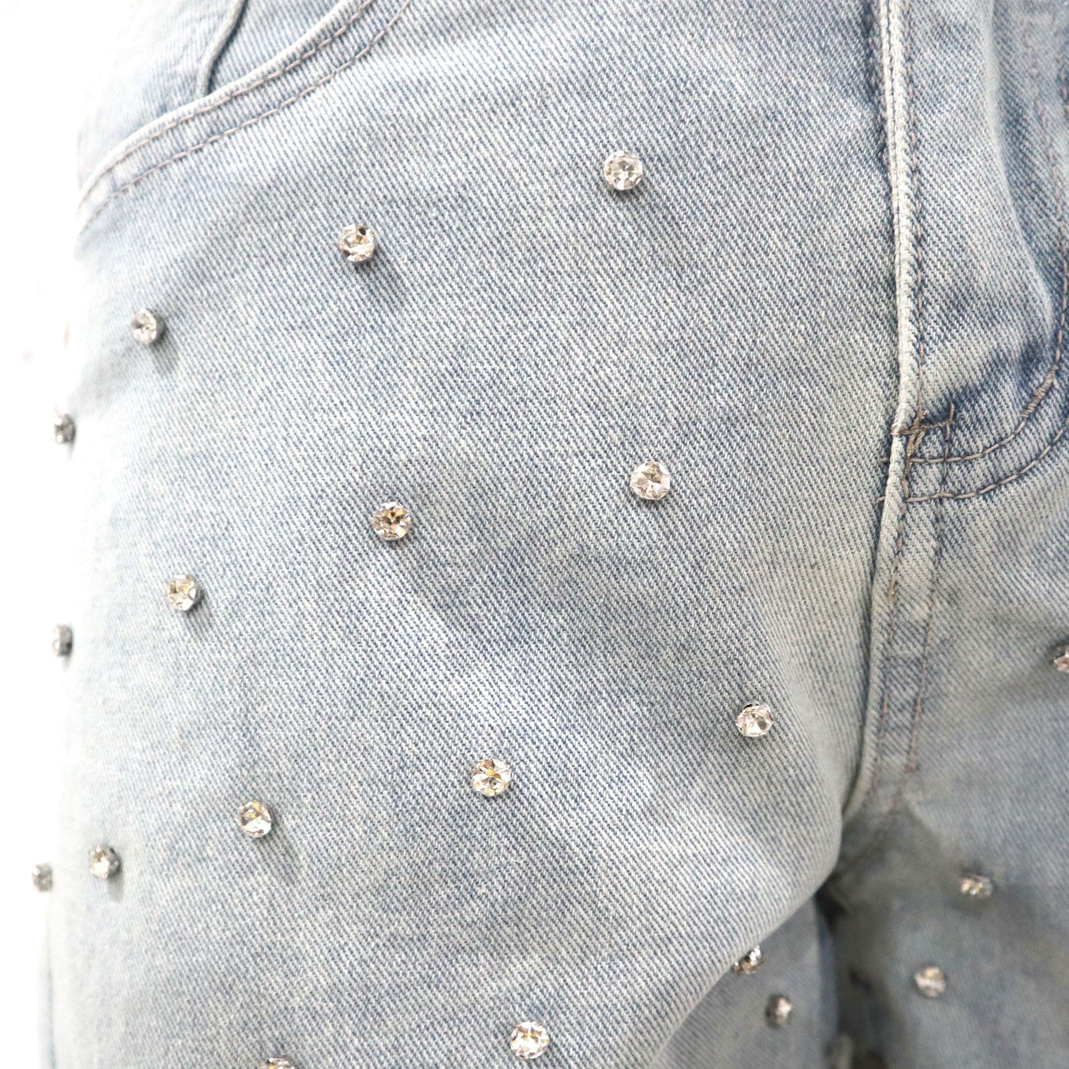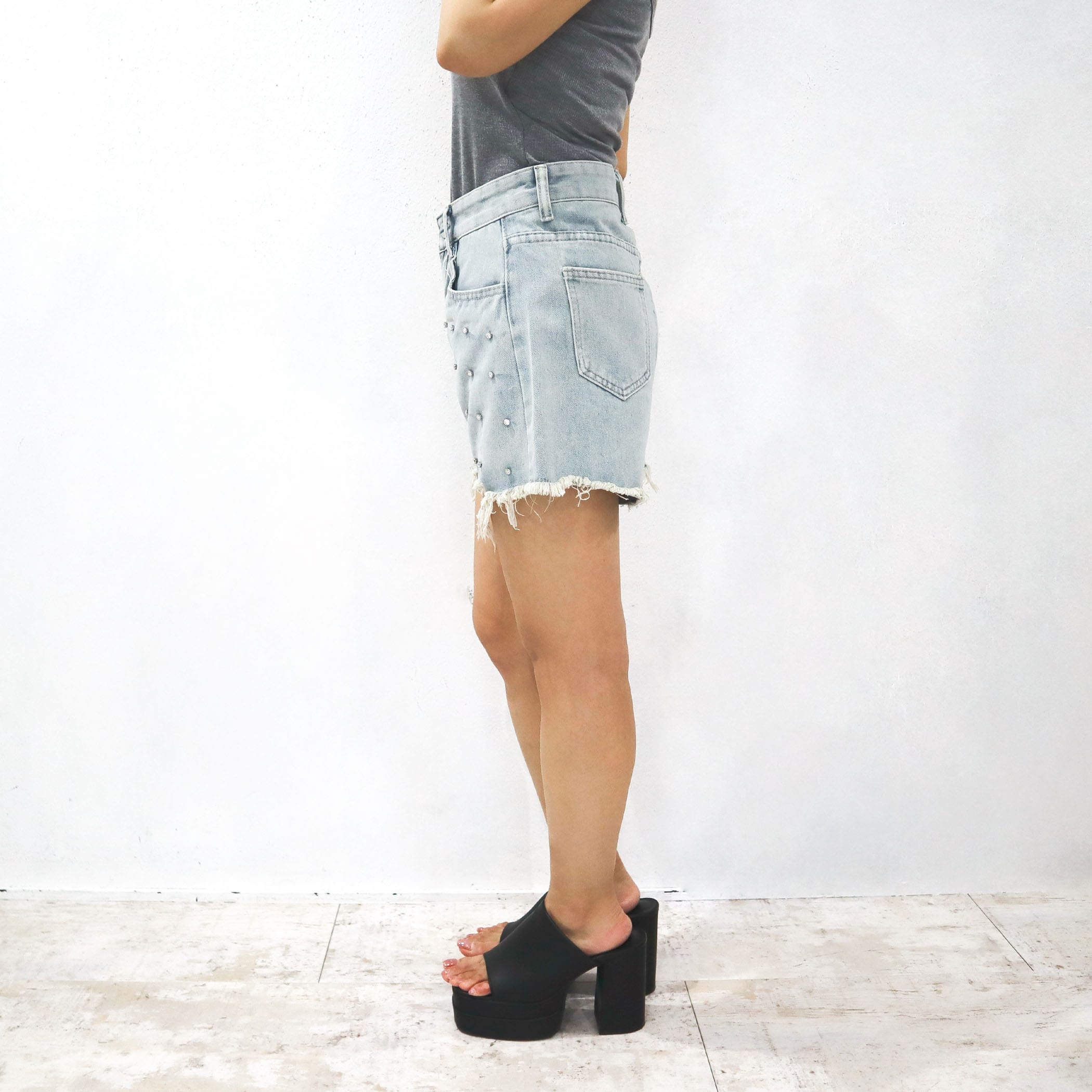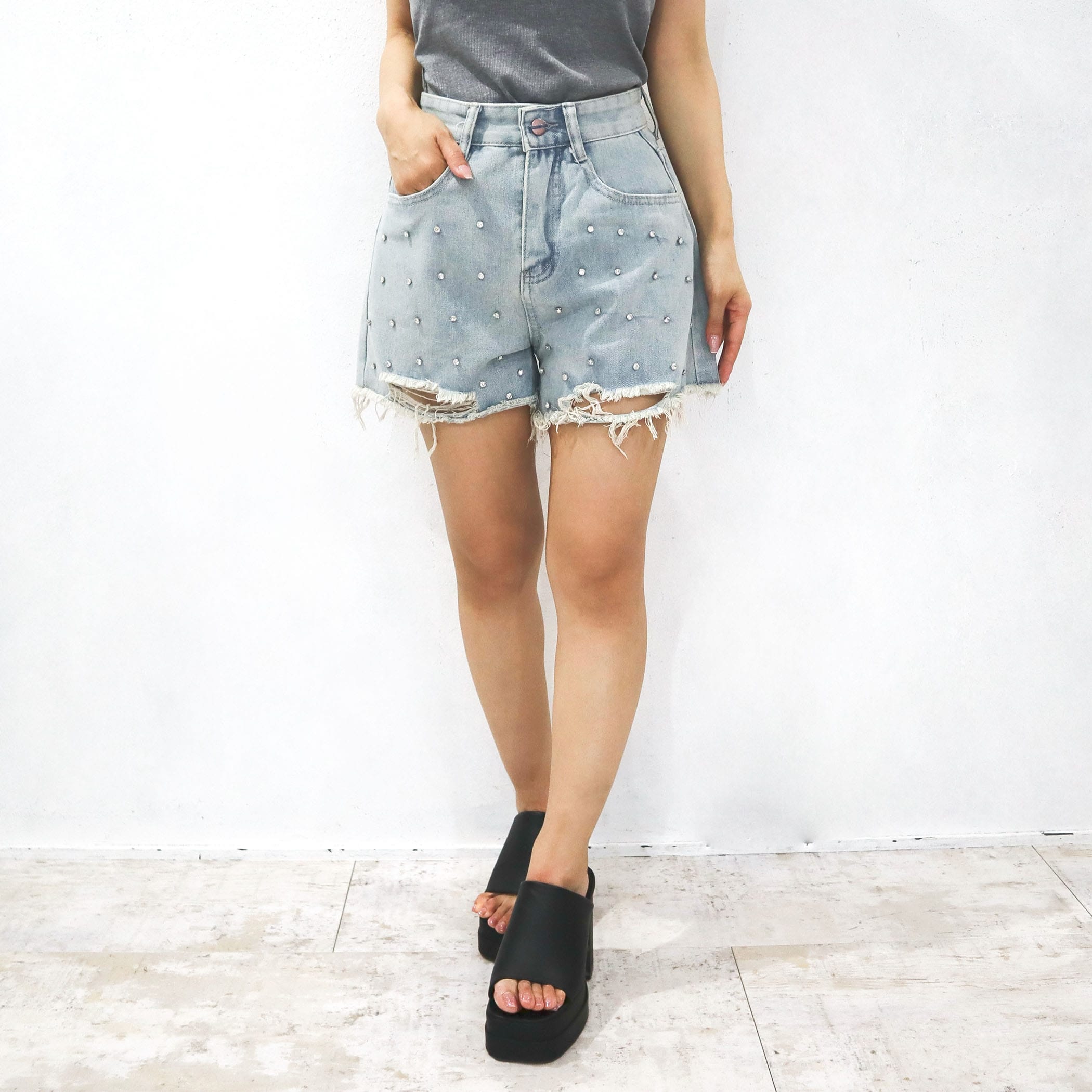 ビジューを散りばめたトレンドのデニムショートパンツ。カジュアルなデニムにエレガントさをプラスしたショートパンツです。裾のダメージや加工風合いにも拘った1着。どんなアイテムとも合わせやすい万能アイテムなので、カーディガンや羽織りと合わせたカジュアルスタイルや、スウェットやパーカーと合わせたストリートスタイルもおススメです◎足元はブーツやボリューム感のあるソックスと合わせるとバランスよく着用いただけます。