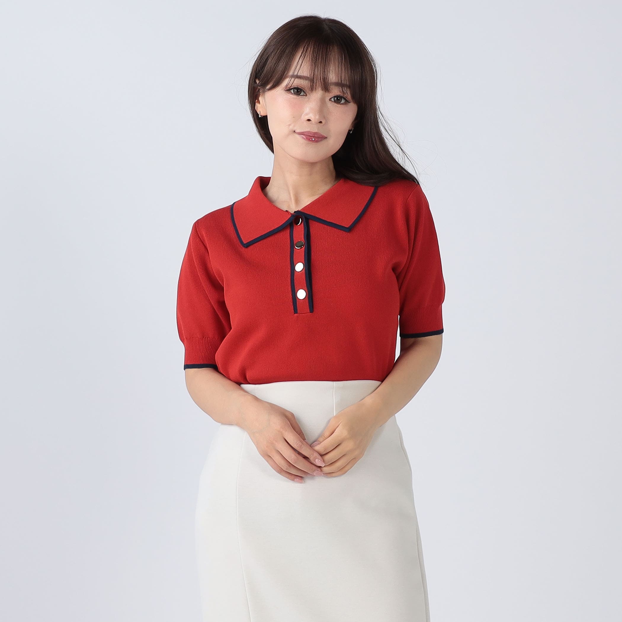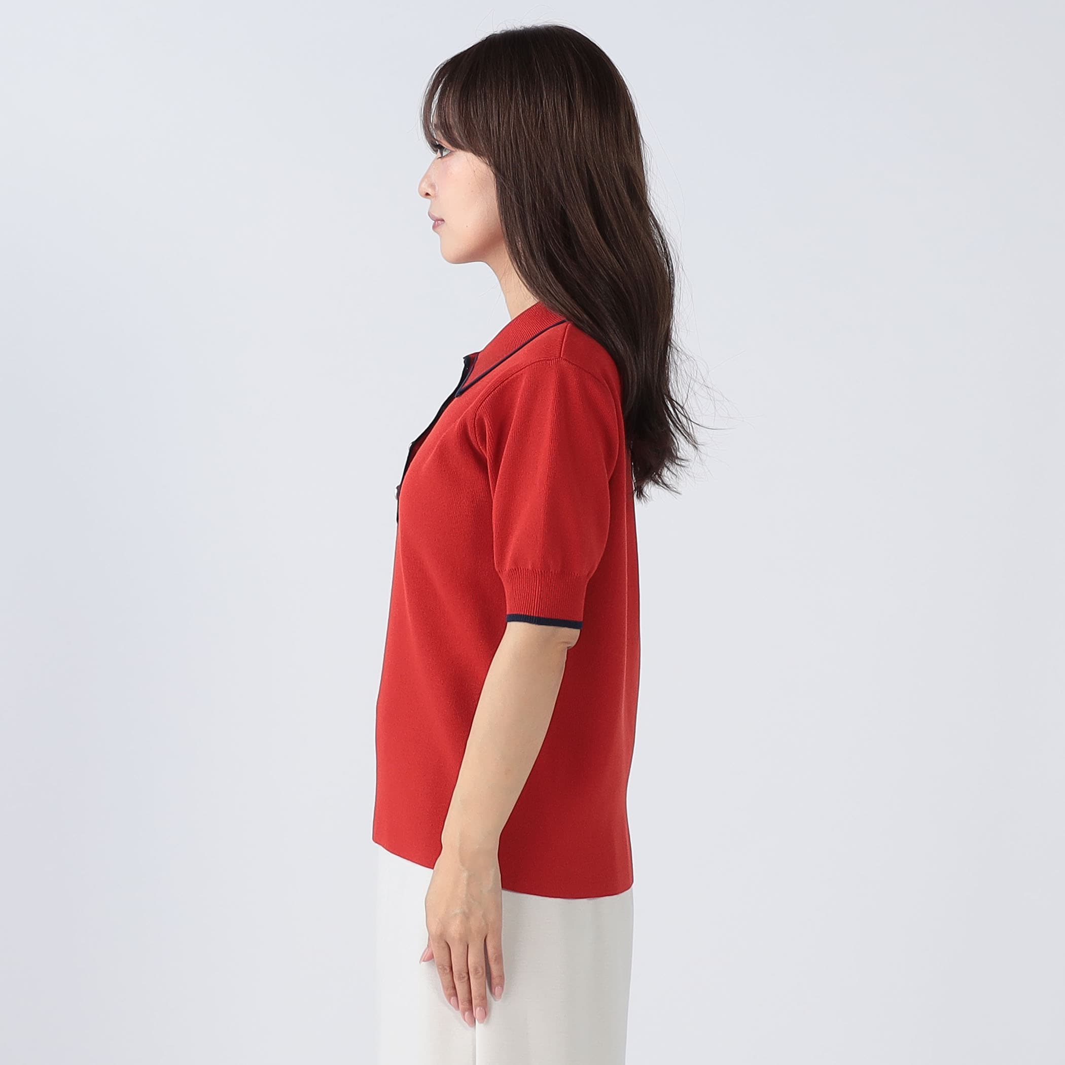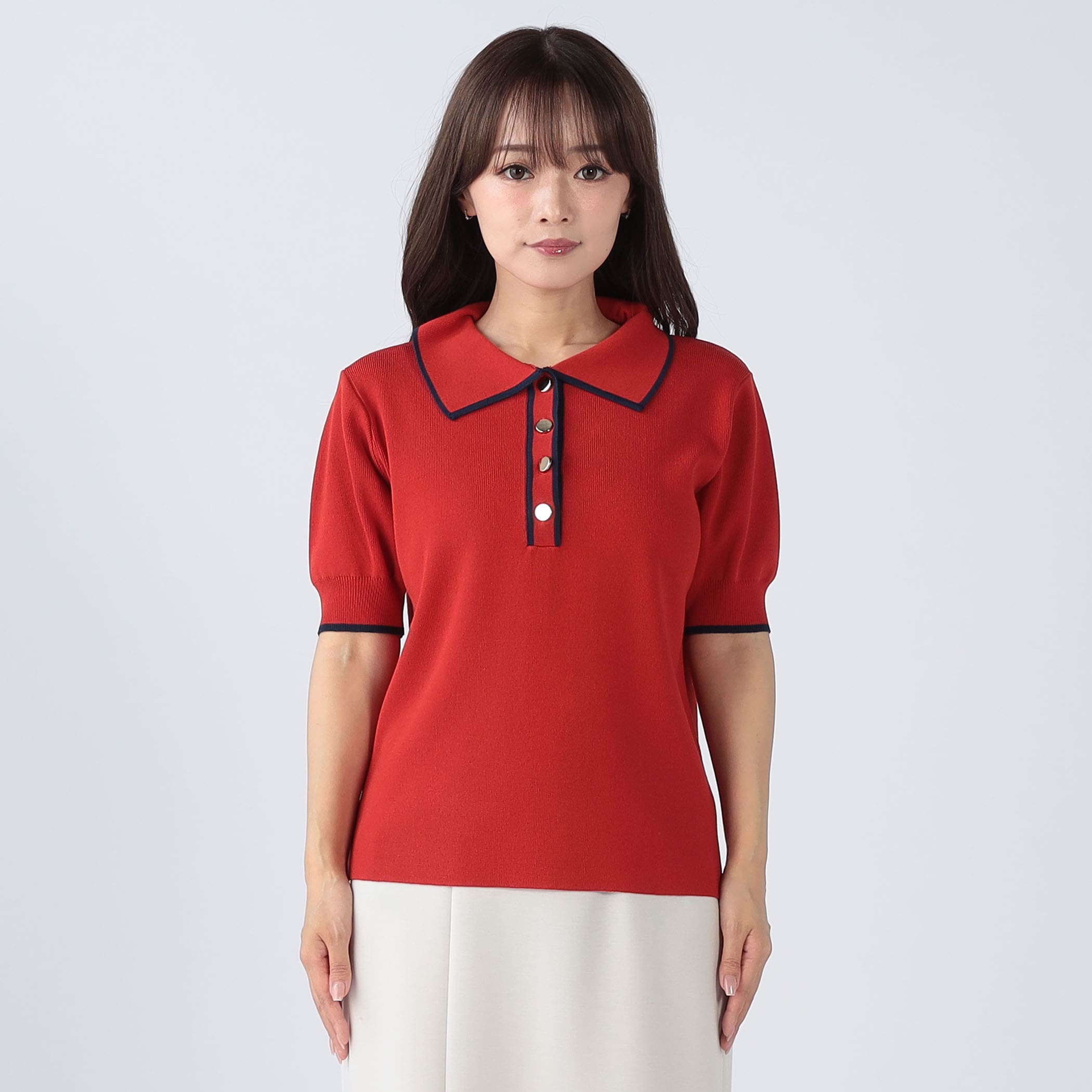 接触冷感ウォッシャブル配色ライン入りポロ衿ニット