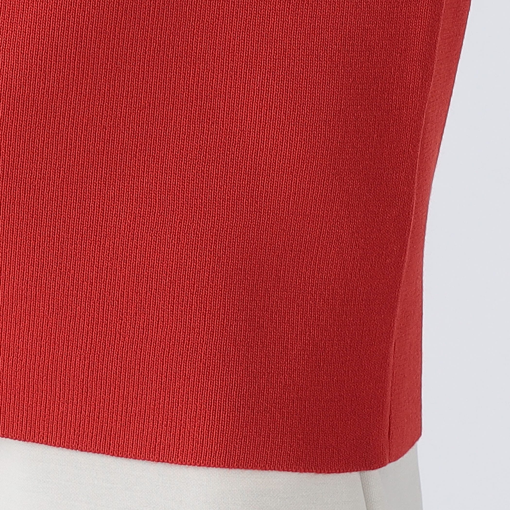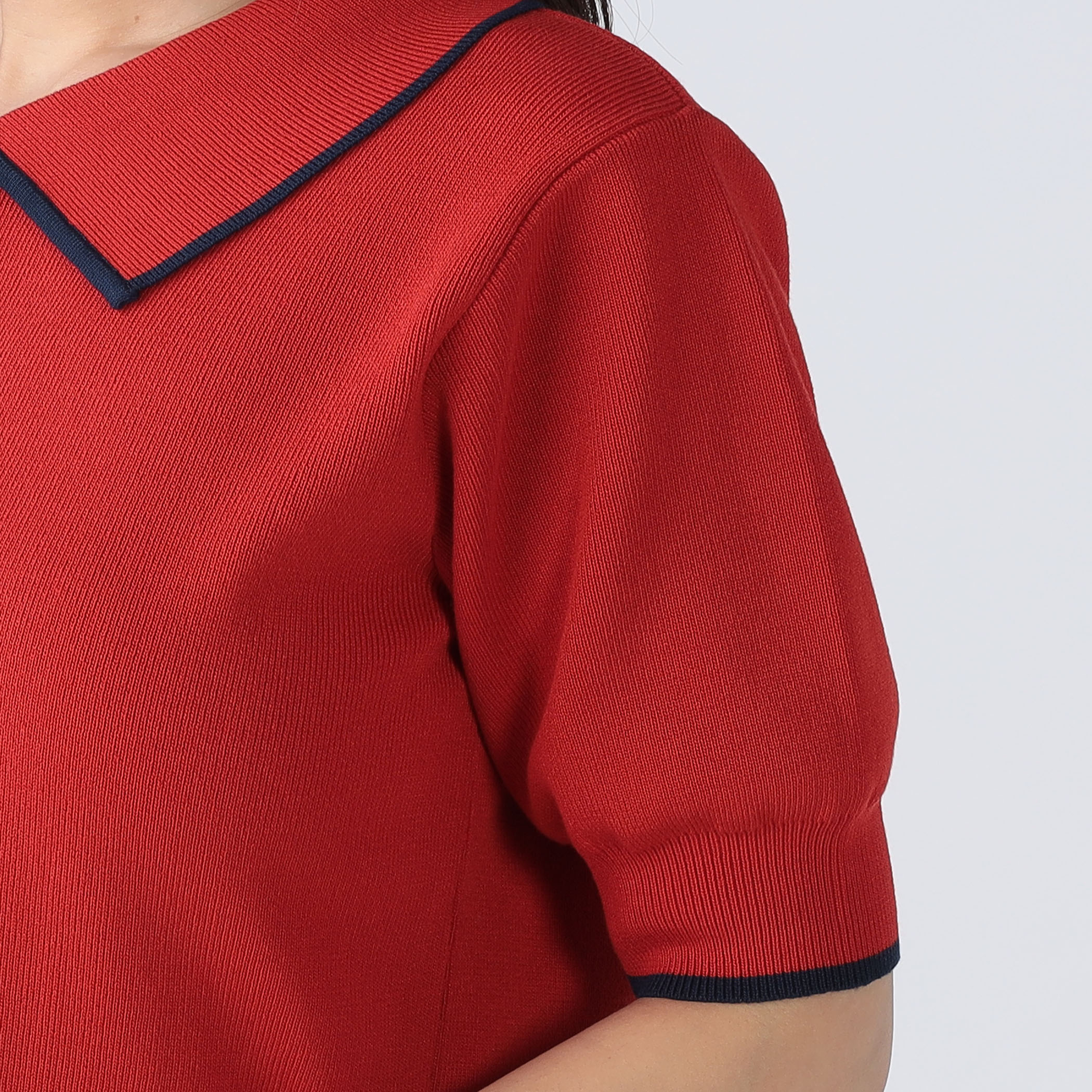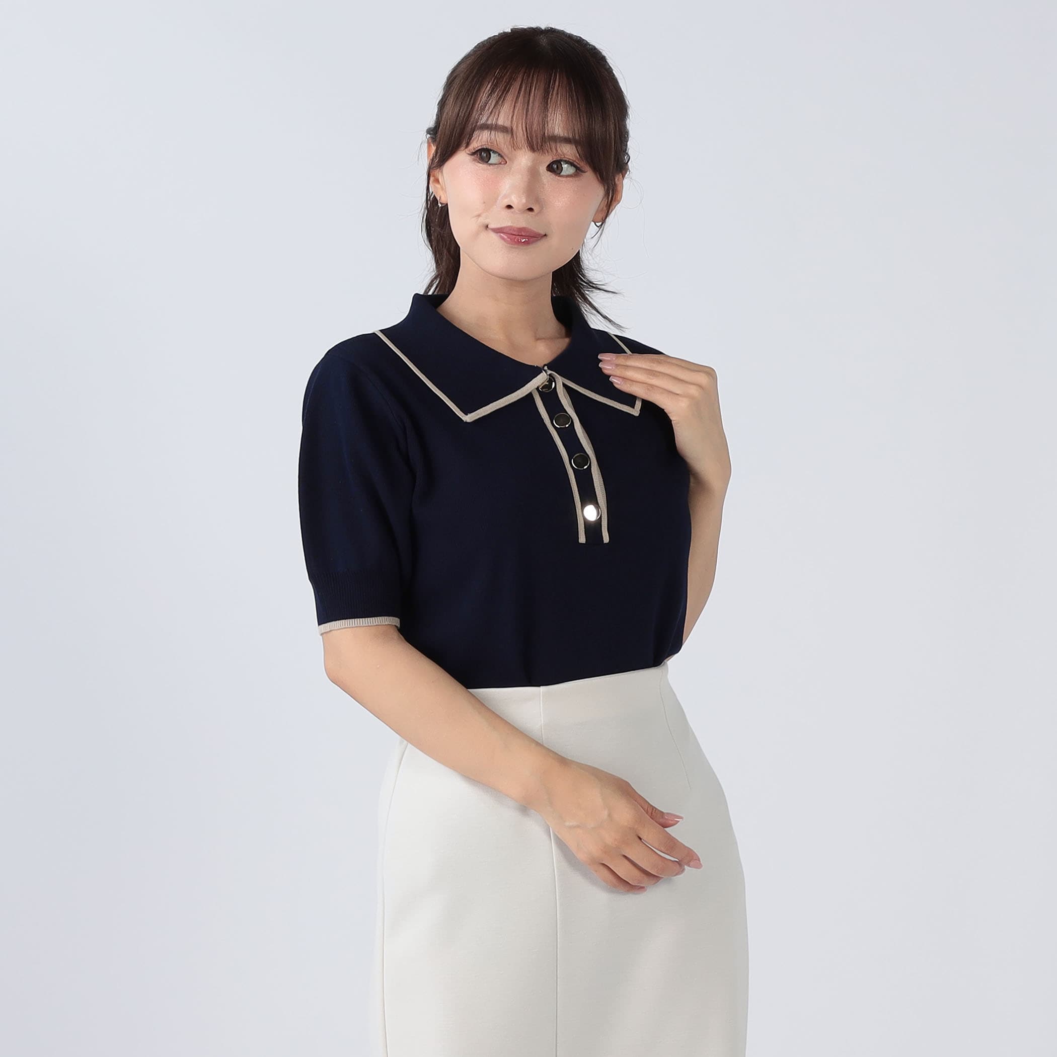 女性らしさを演出するポロ襟ニット。さらっとした風合いで清涼感があり、接触冷感機能付きで夏でも着心地の良いニット素材◎カジュアルになりすぎないようにサイズ感はややコンパクトに仕上げ、女性らしい印象へ導きます。