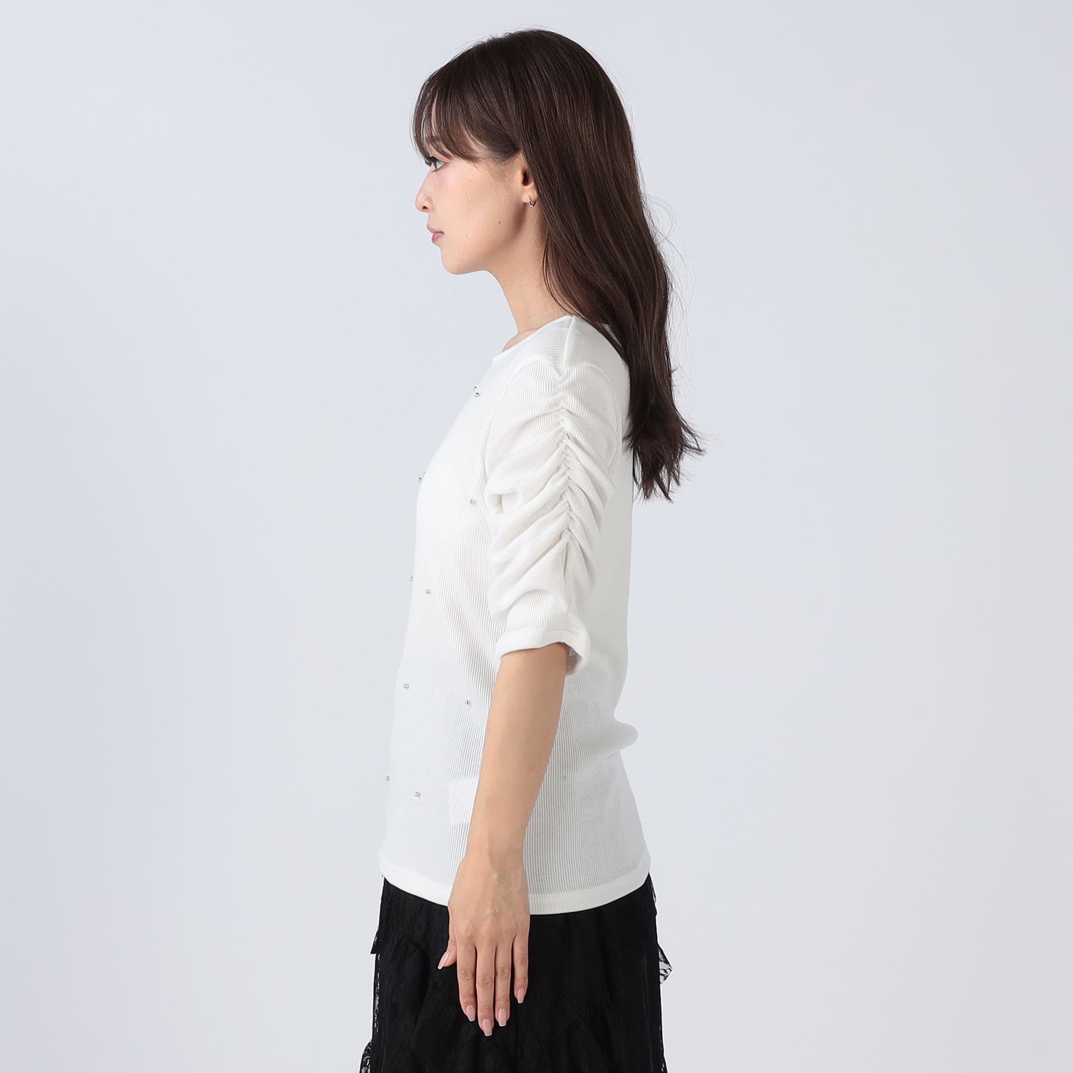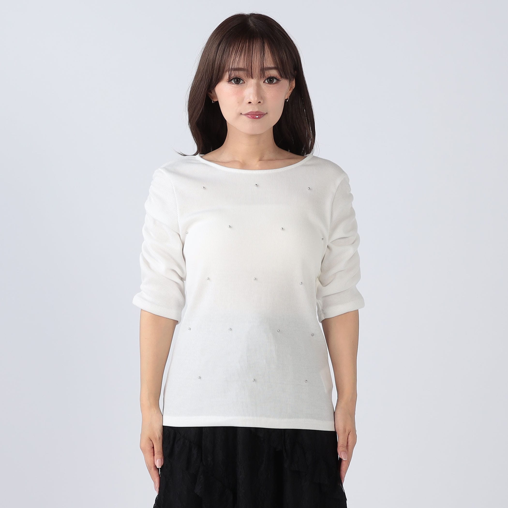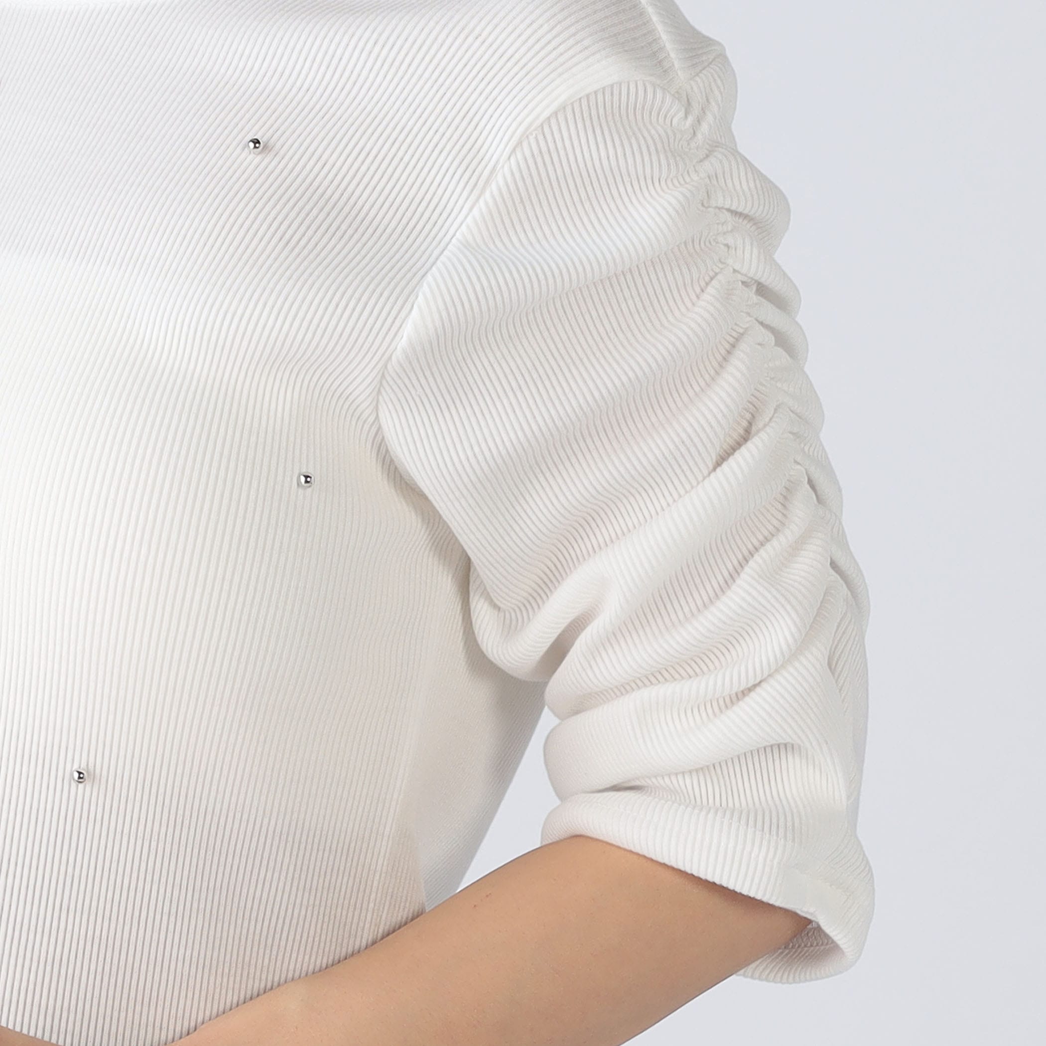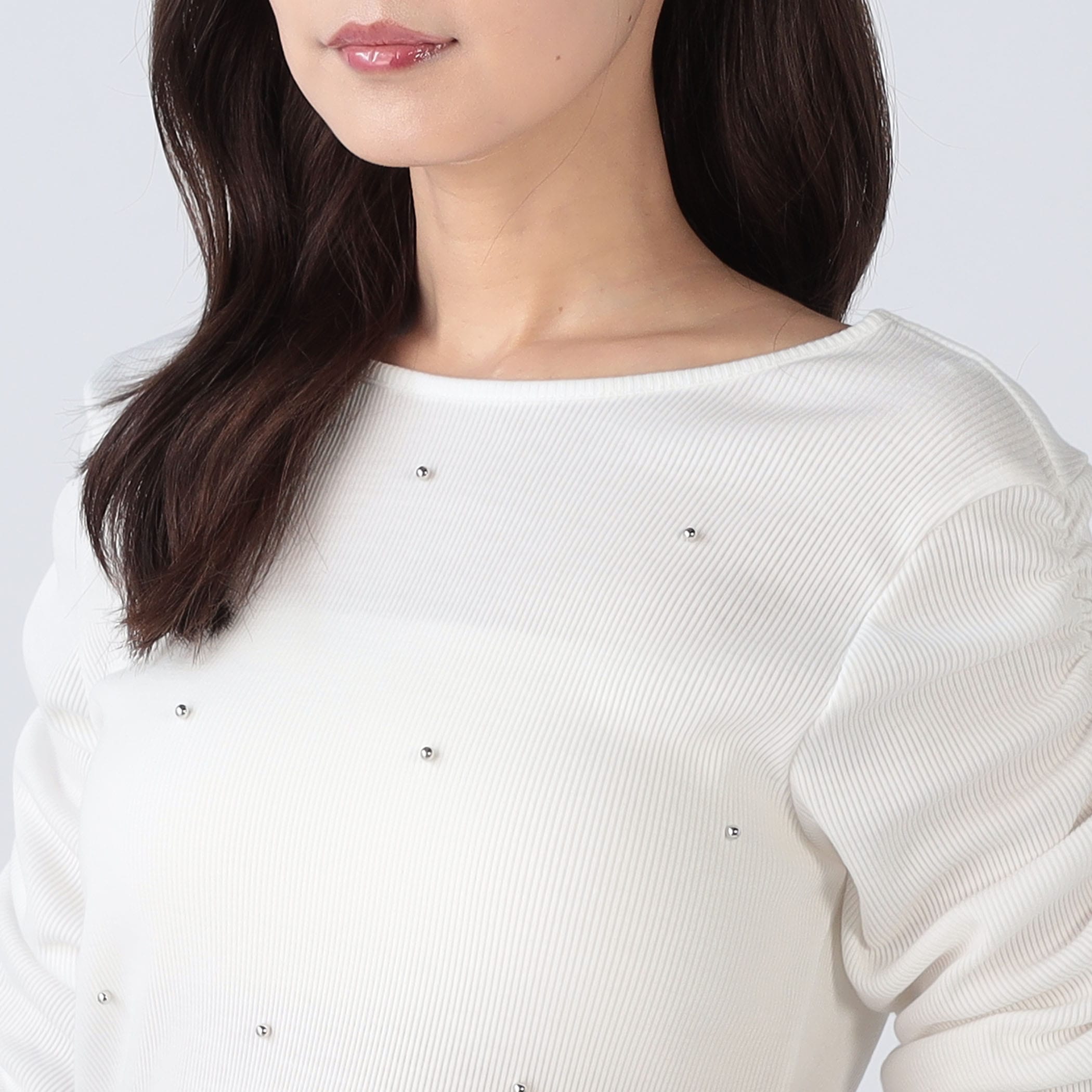 ビジュー使いが目を惹くリブトップス。袖部分にギャザーが入ったパワショル仕様になっているので細みえ効果も嬉しいポイント◎この1枚でも、アウターやシアーシャツ等を羽織ればロングシーズン楽しんで頂ける商品です。