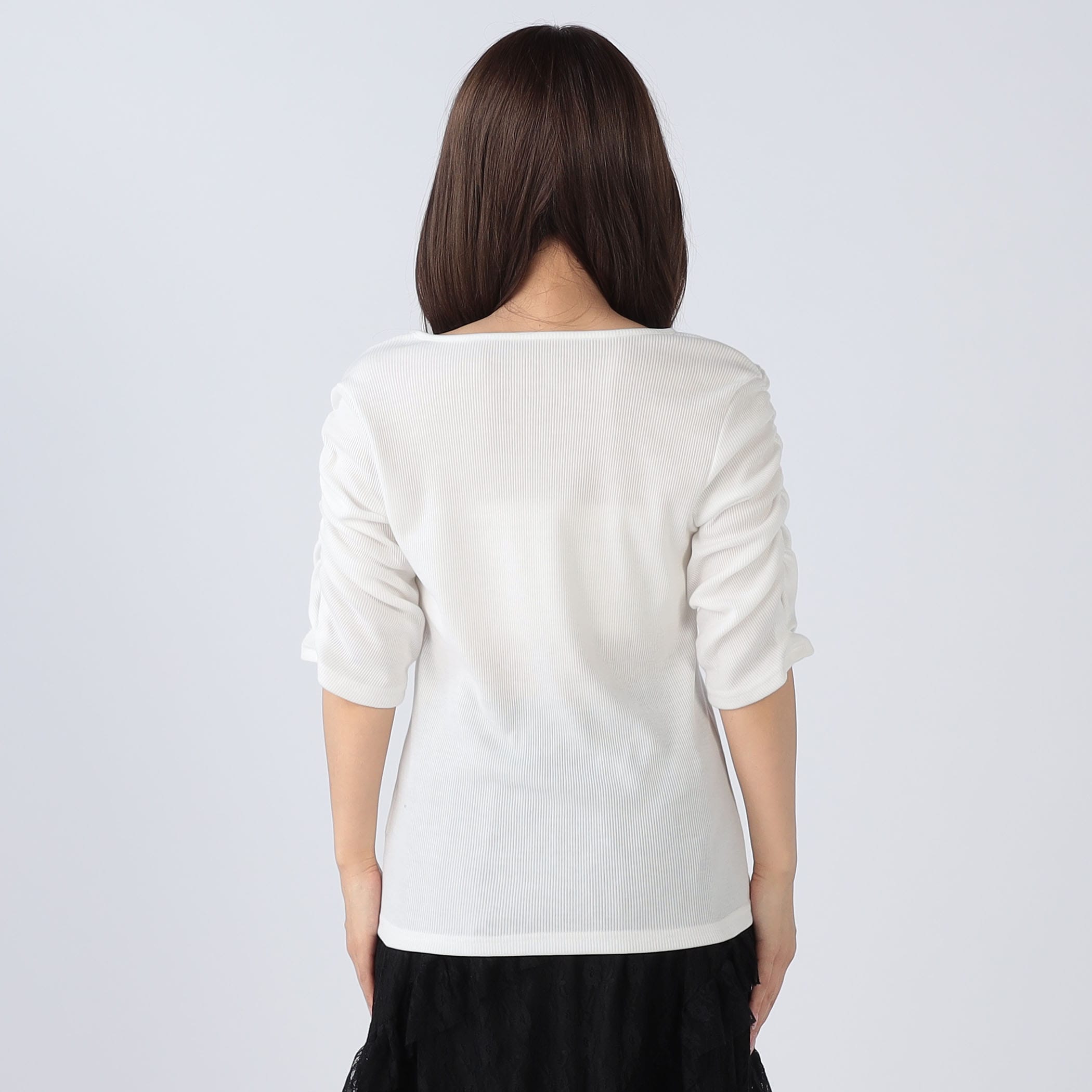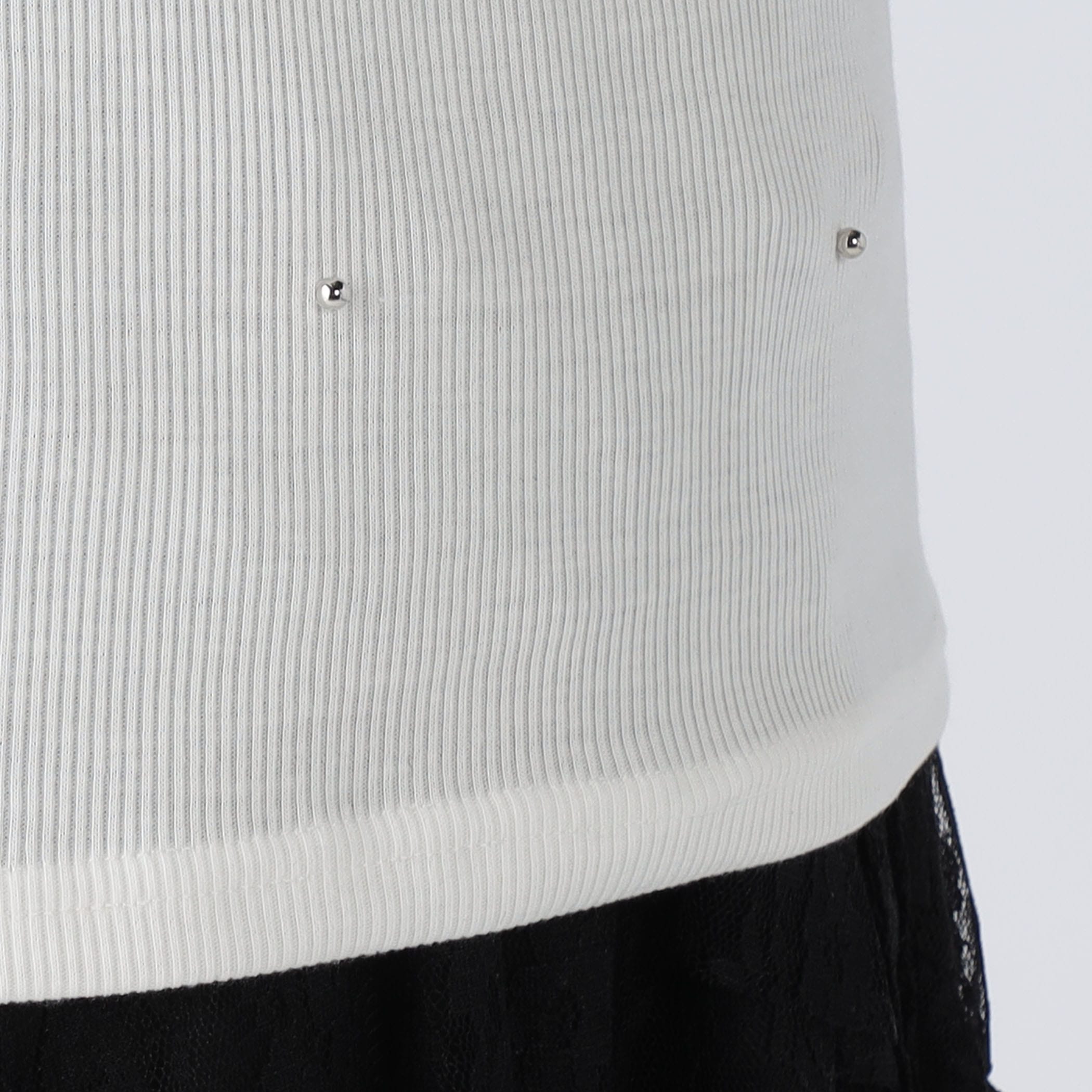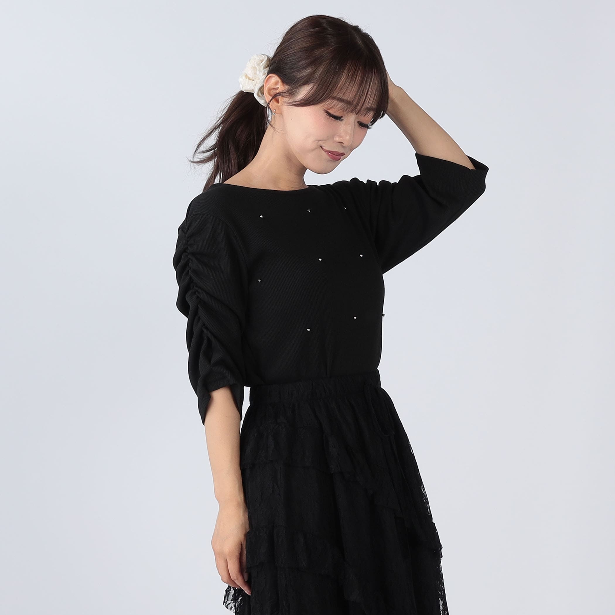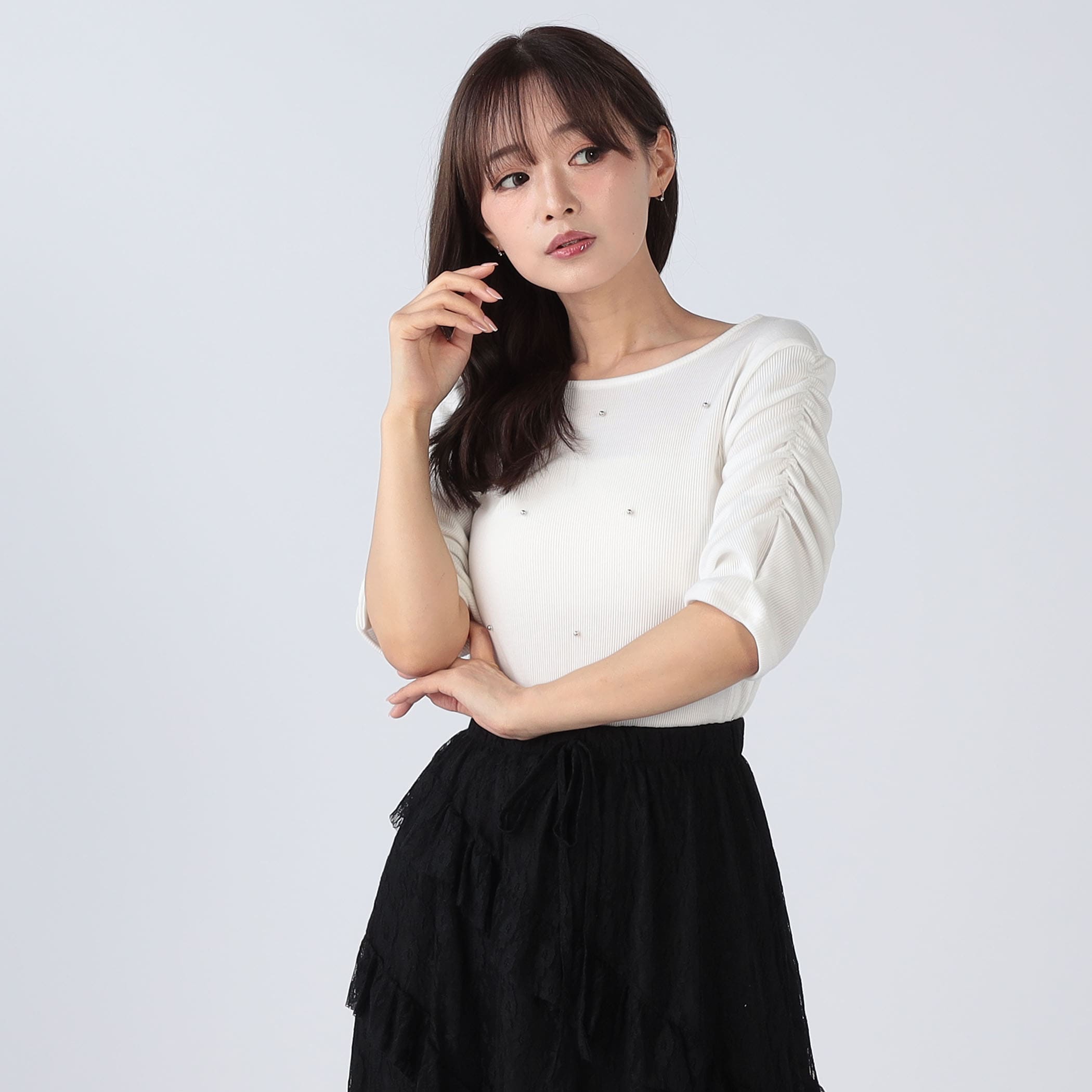 ビジュー使いが目を惹くリブトップス。袖部分にギャザーが入ったパワショル仕様になっているので細みえ効果も嬉しいポイント◎この1枚でも、アウターやシアーシャツ等を羽織ればロングシーズン楽しんで頂ける商品です。